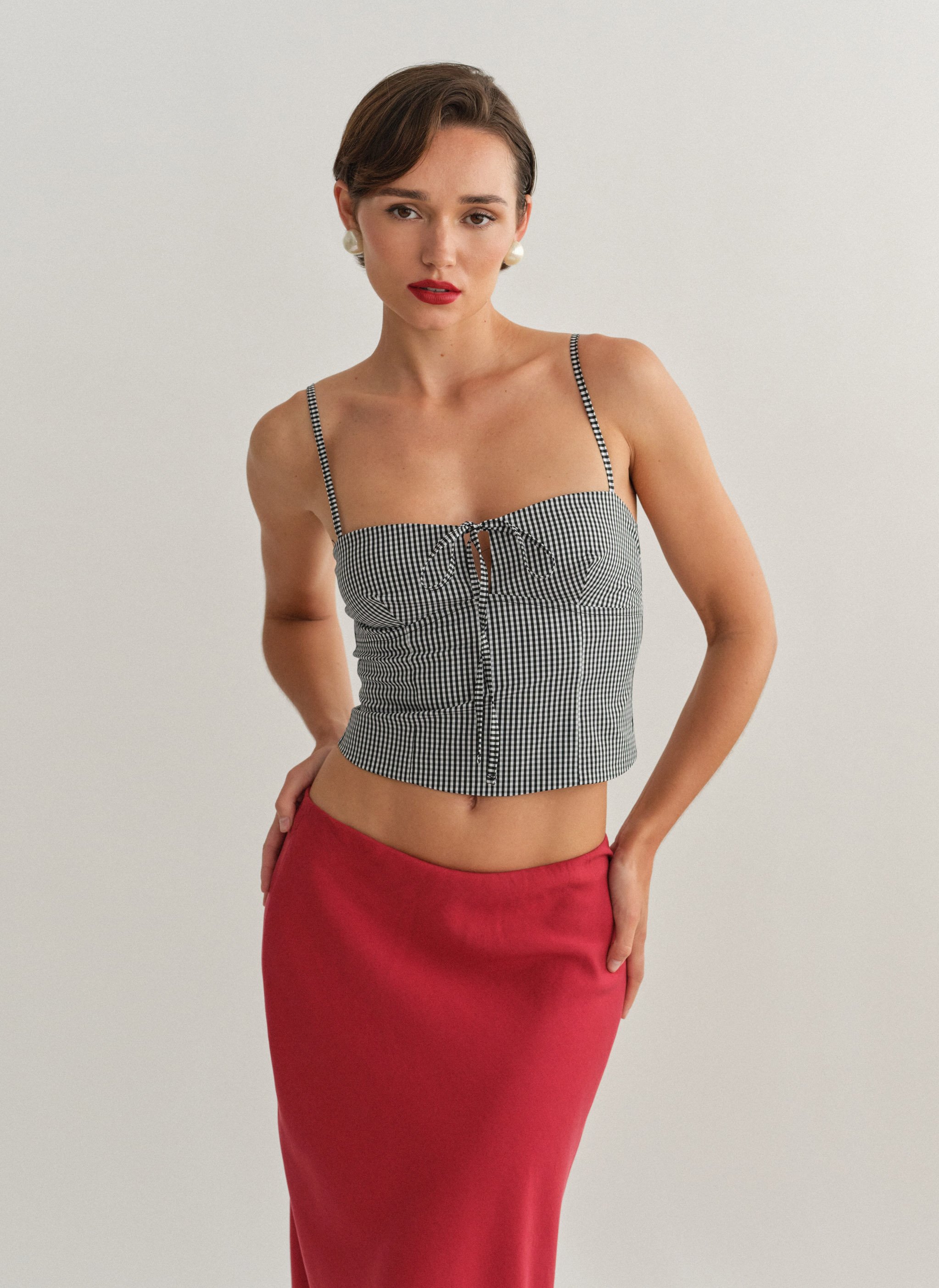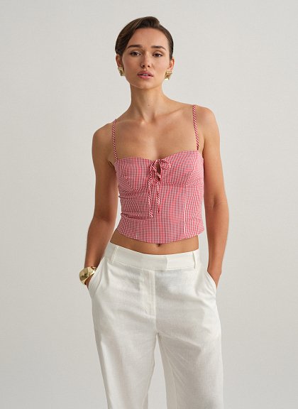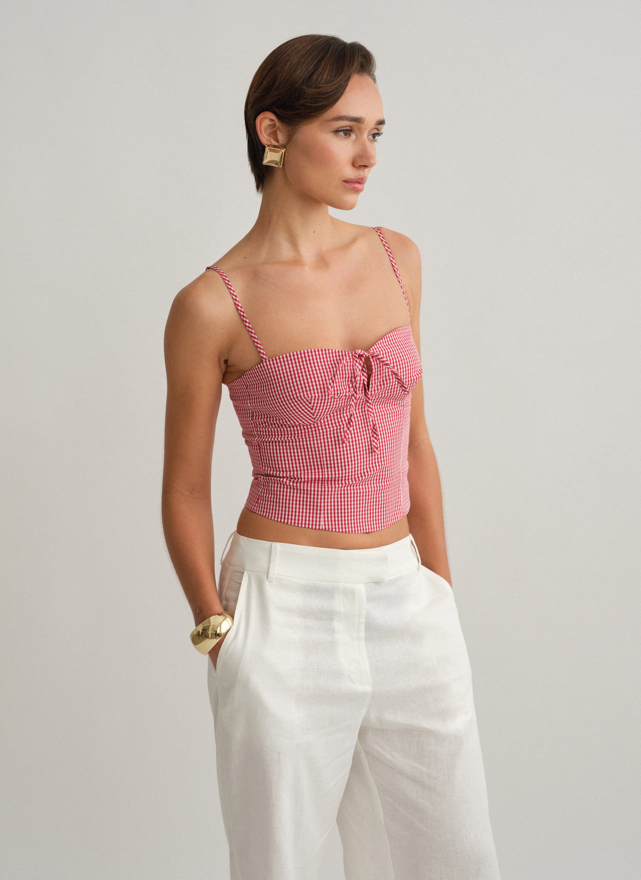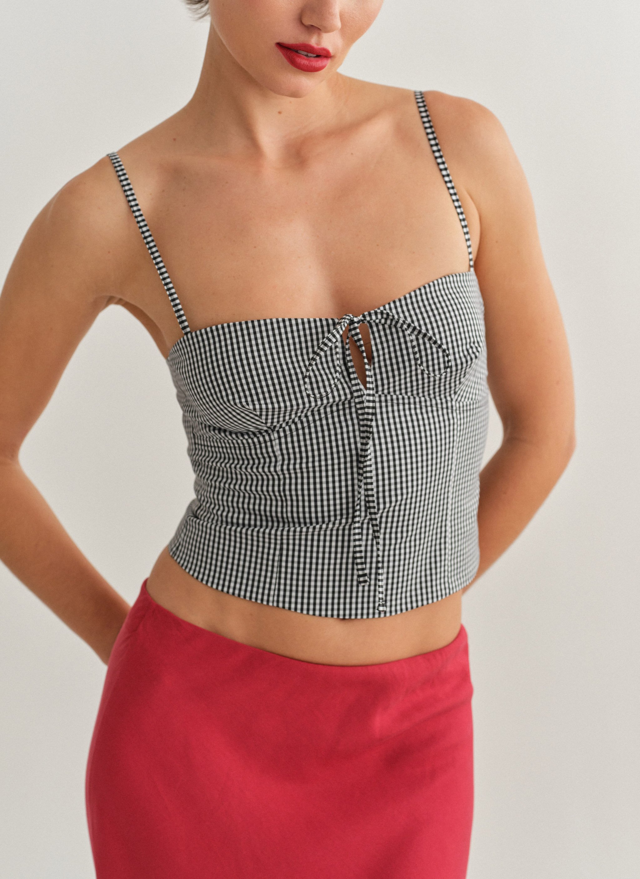 Καρό τοπ με ρυθμιζόμενες τιράντες και δέσιμο στο ντεκολτέ.