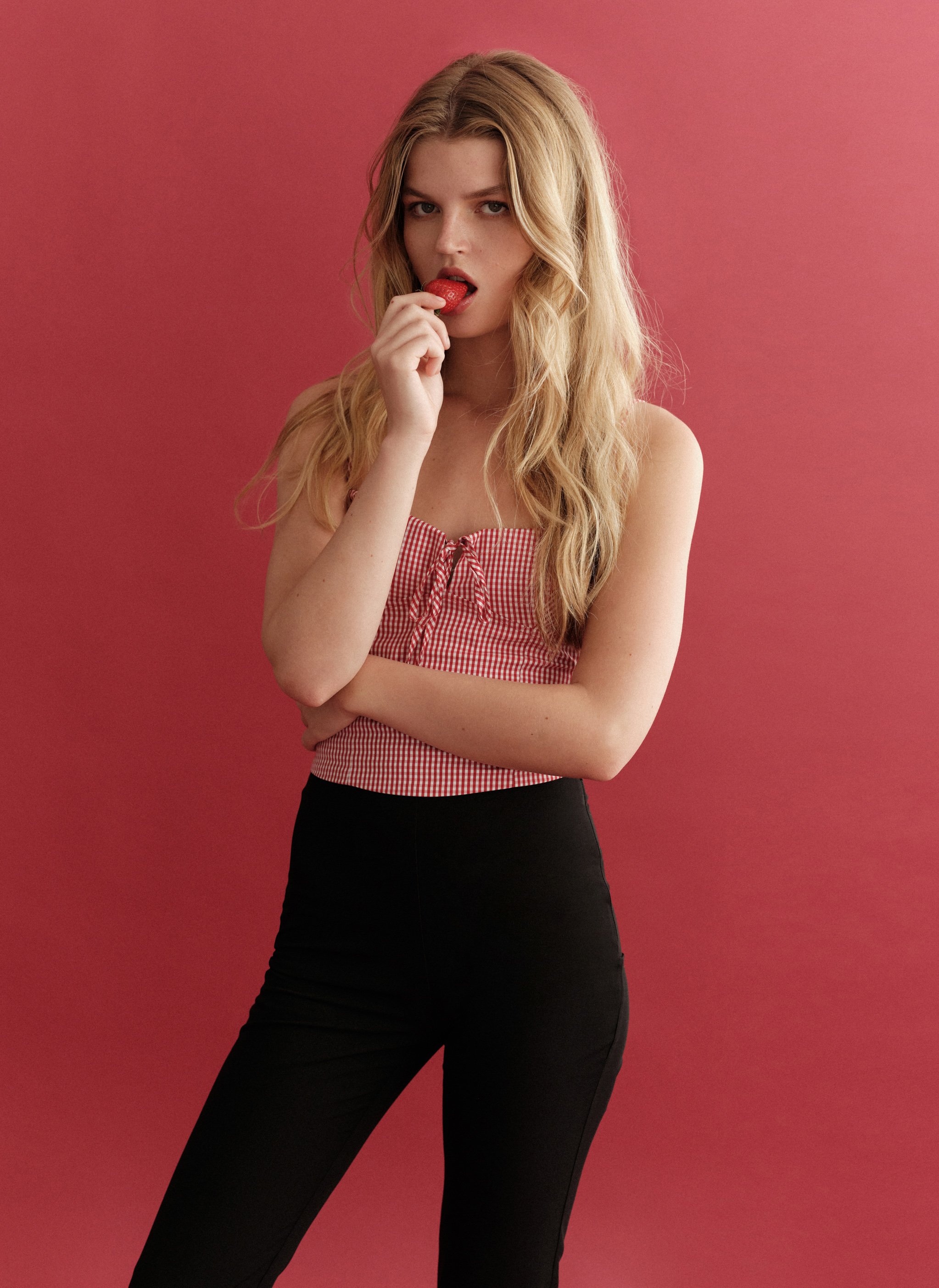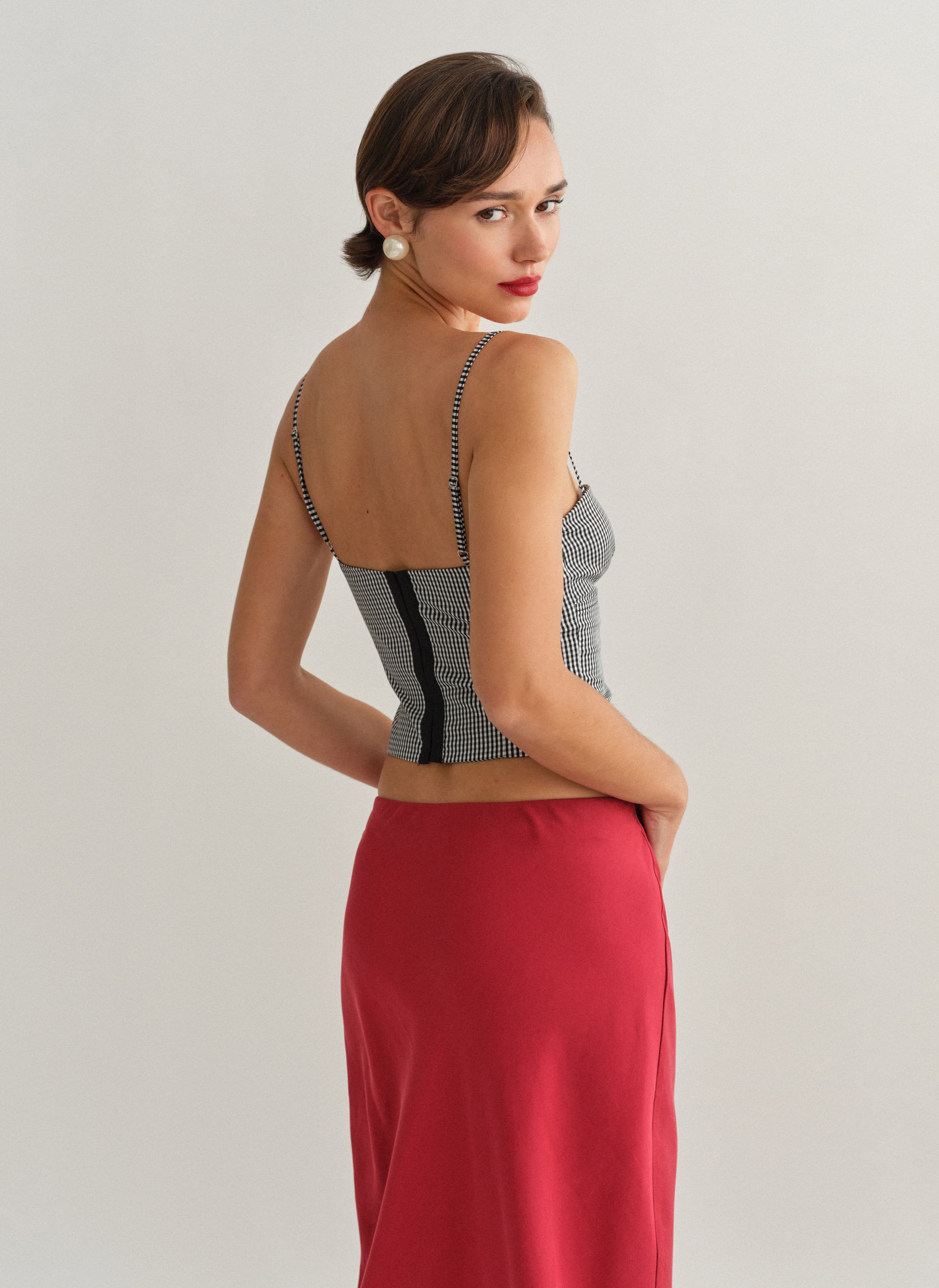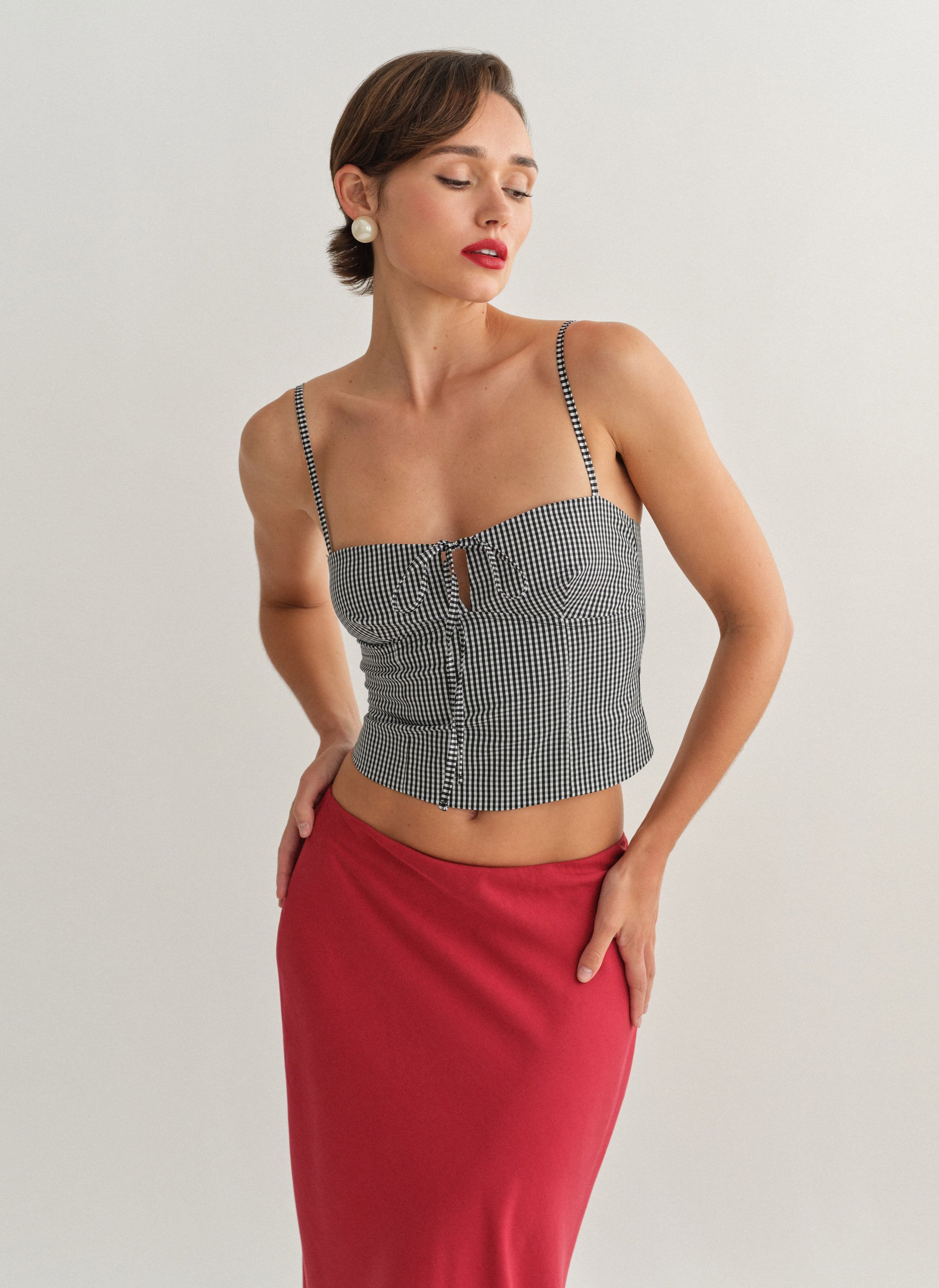 Καρό τοπ με ρυθμιζόμενες τιράντες και δέσιμο στο ντεκολτέ.