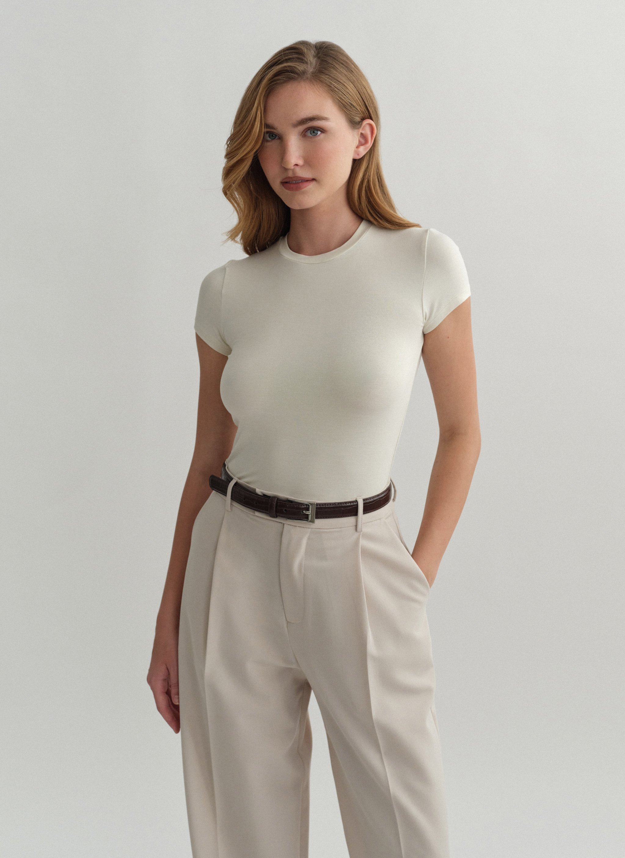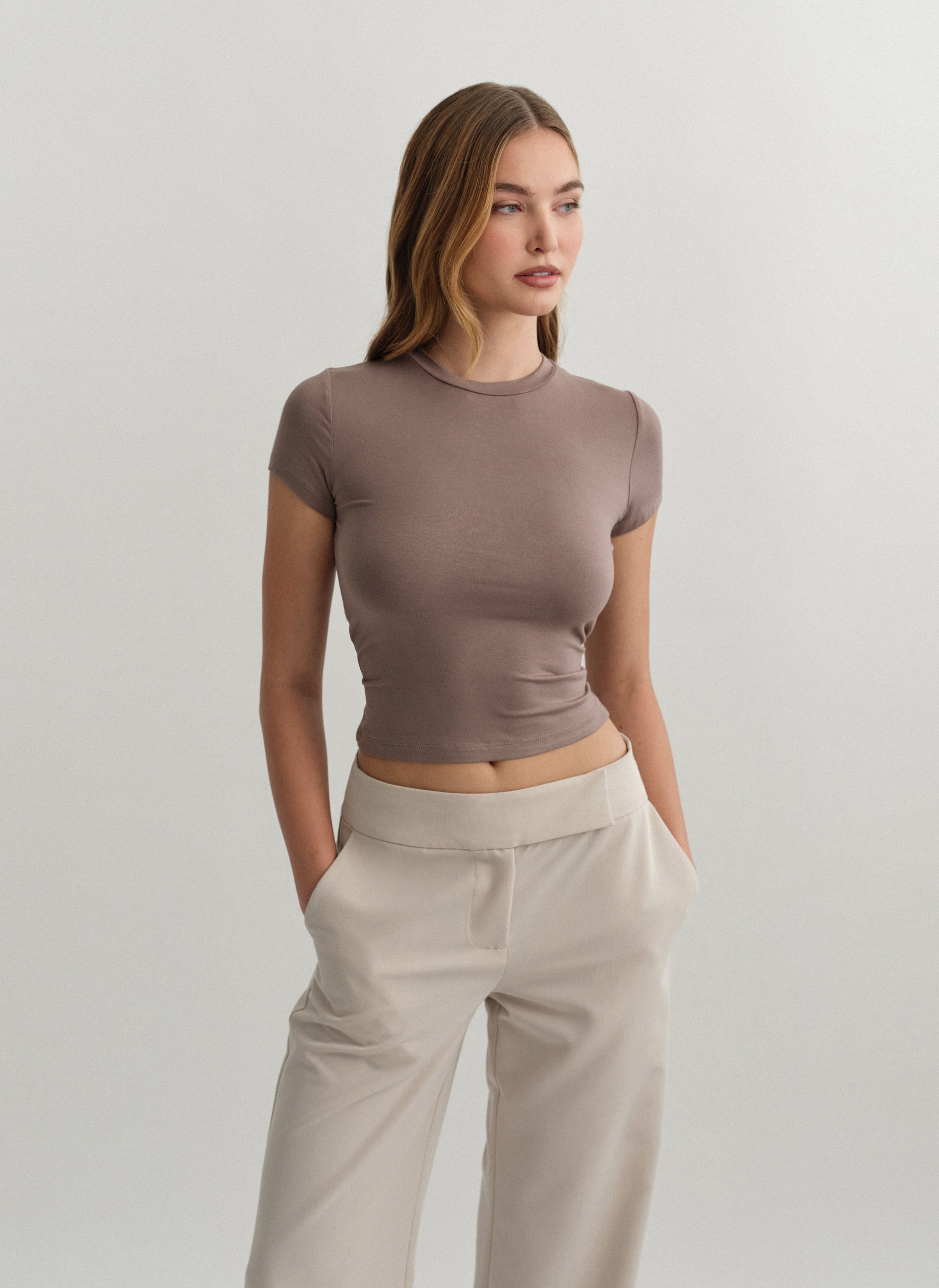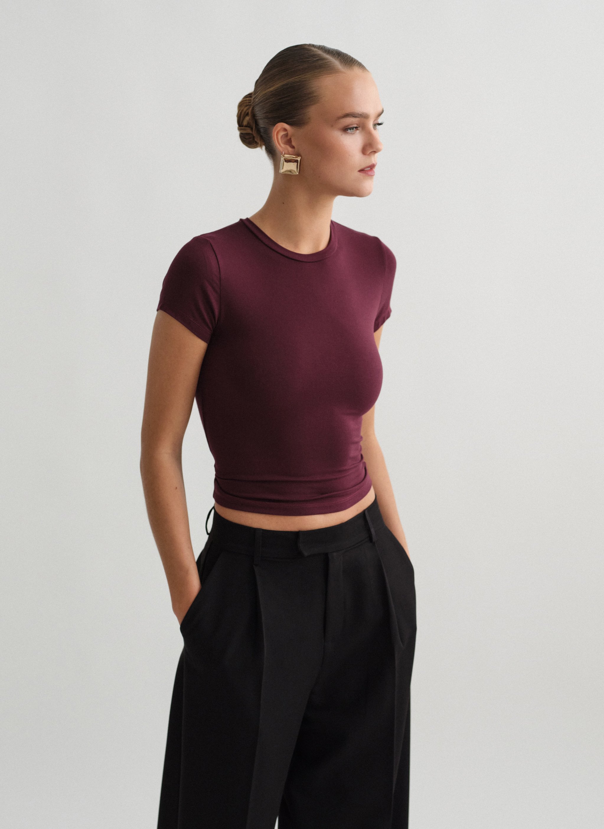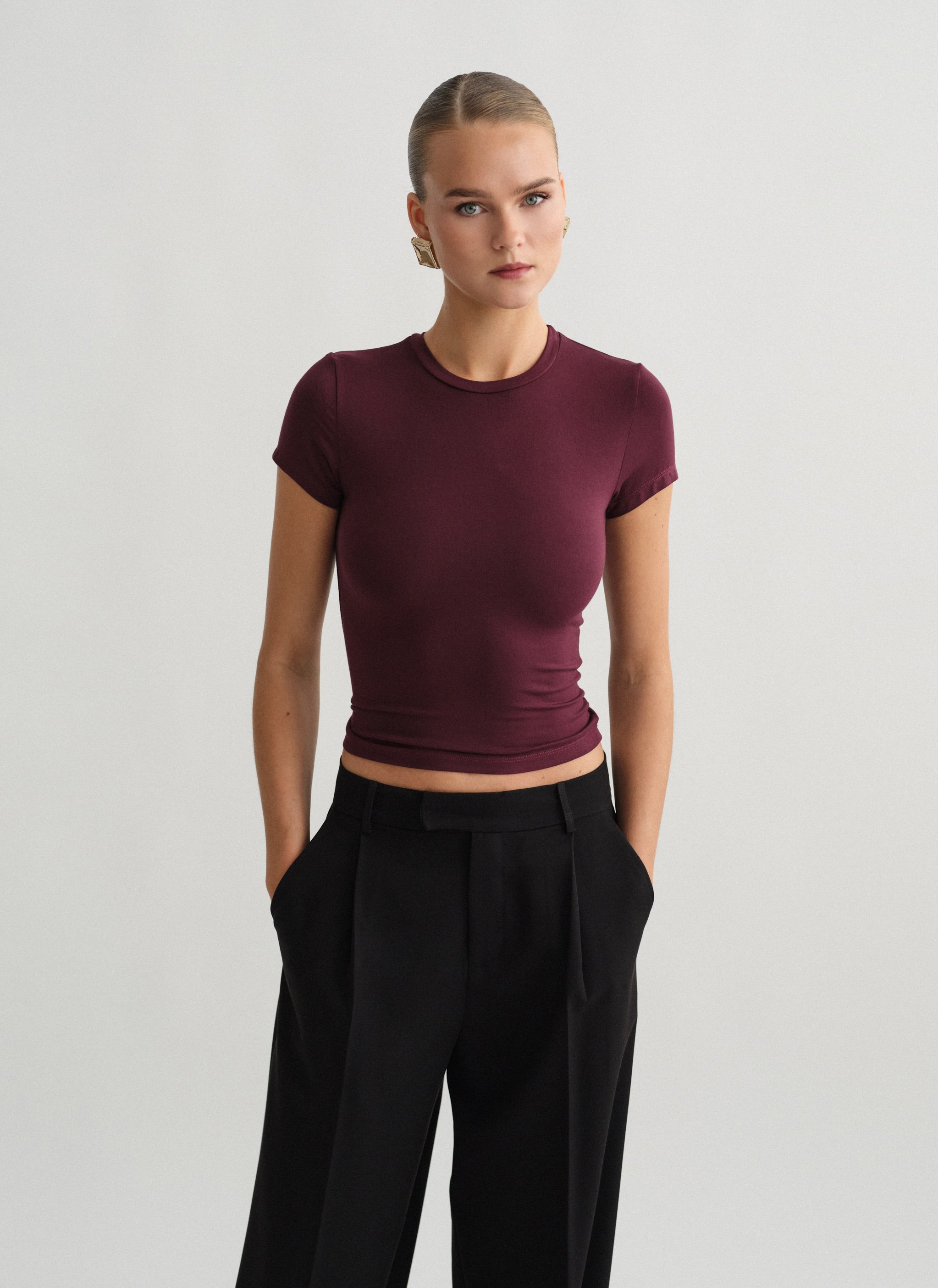 Ελαστικό κοντομάνικο basic τοπ bamboo με στρογγυλή λαιμόκοψη.