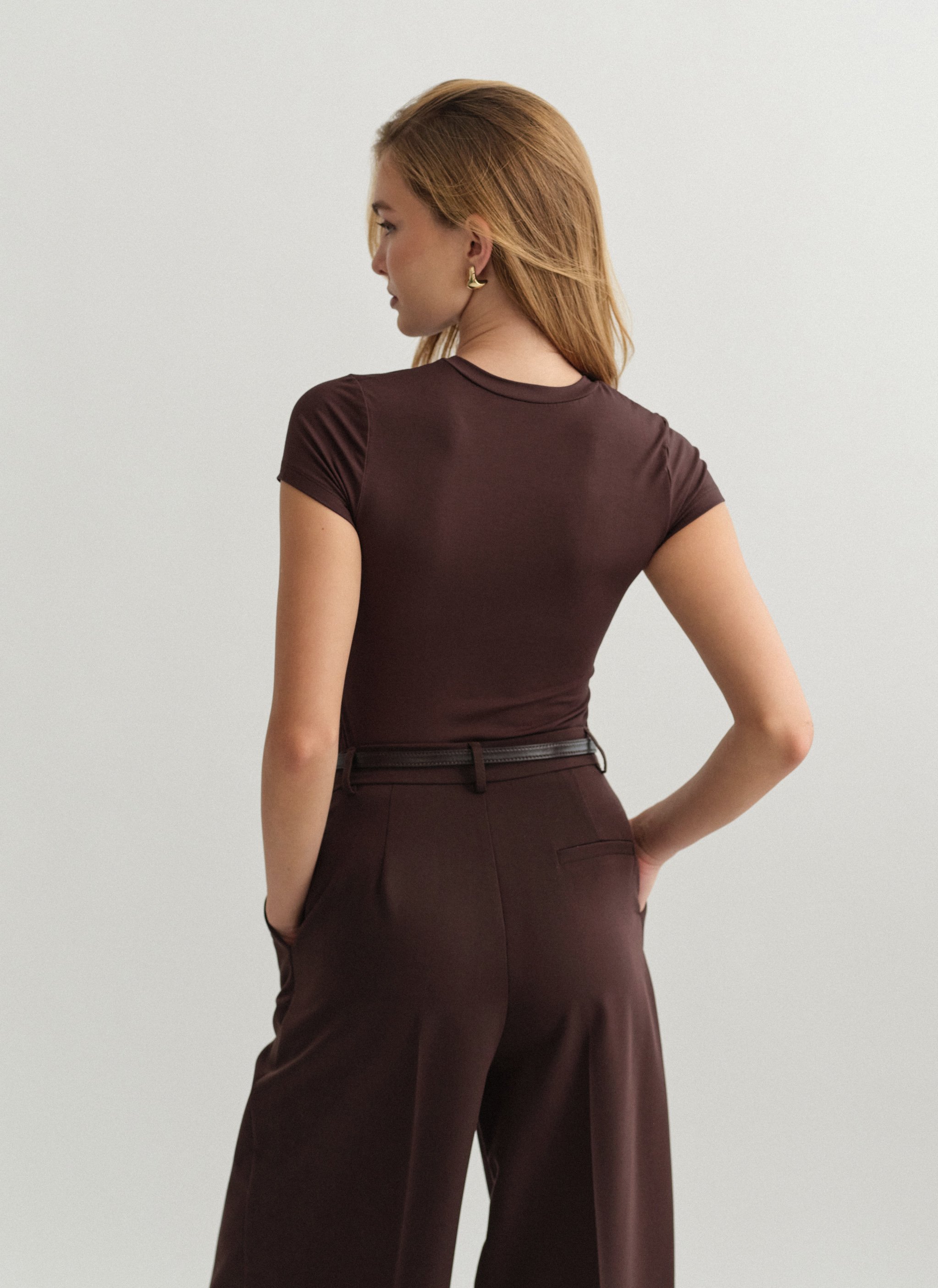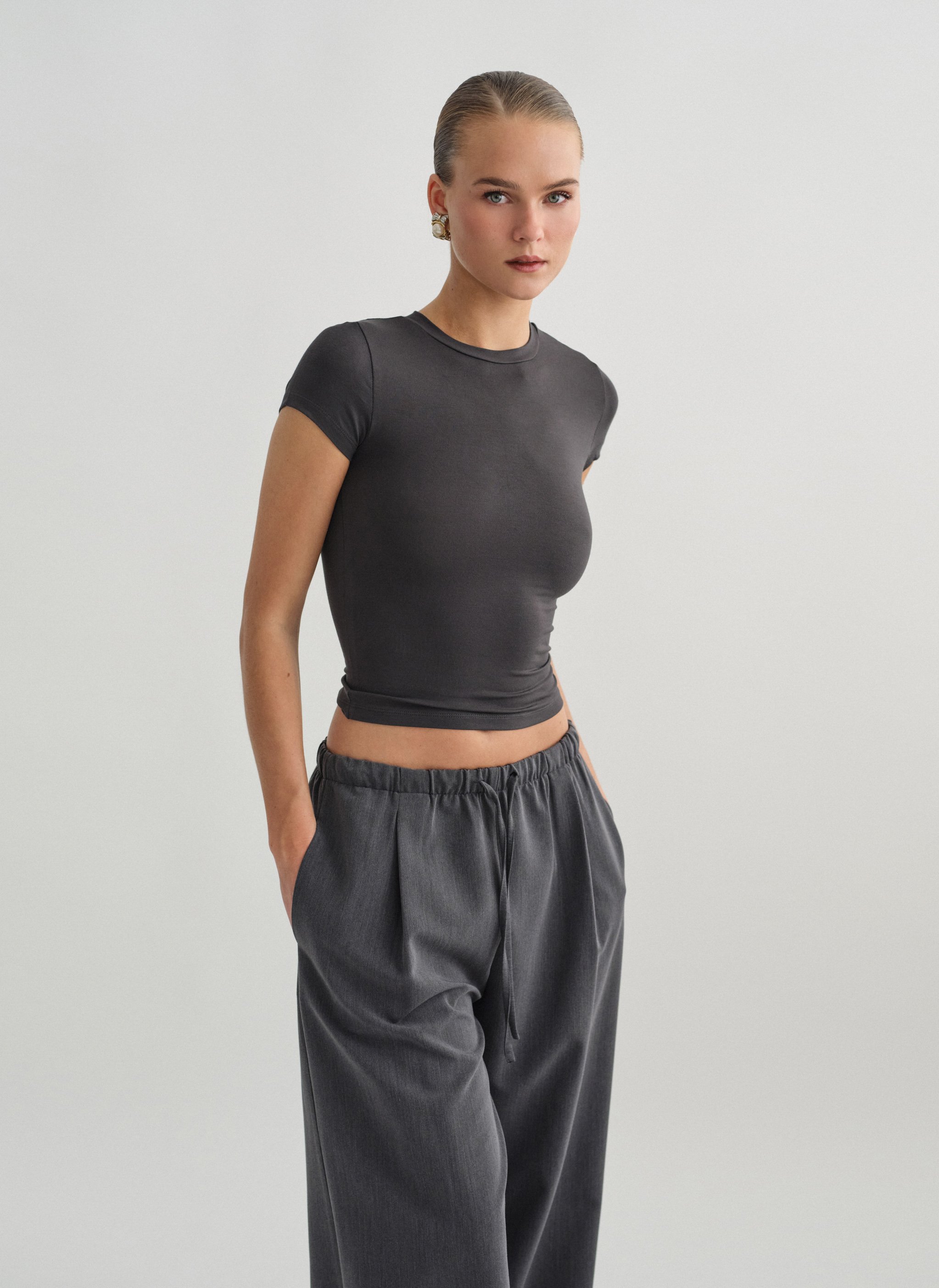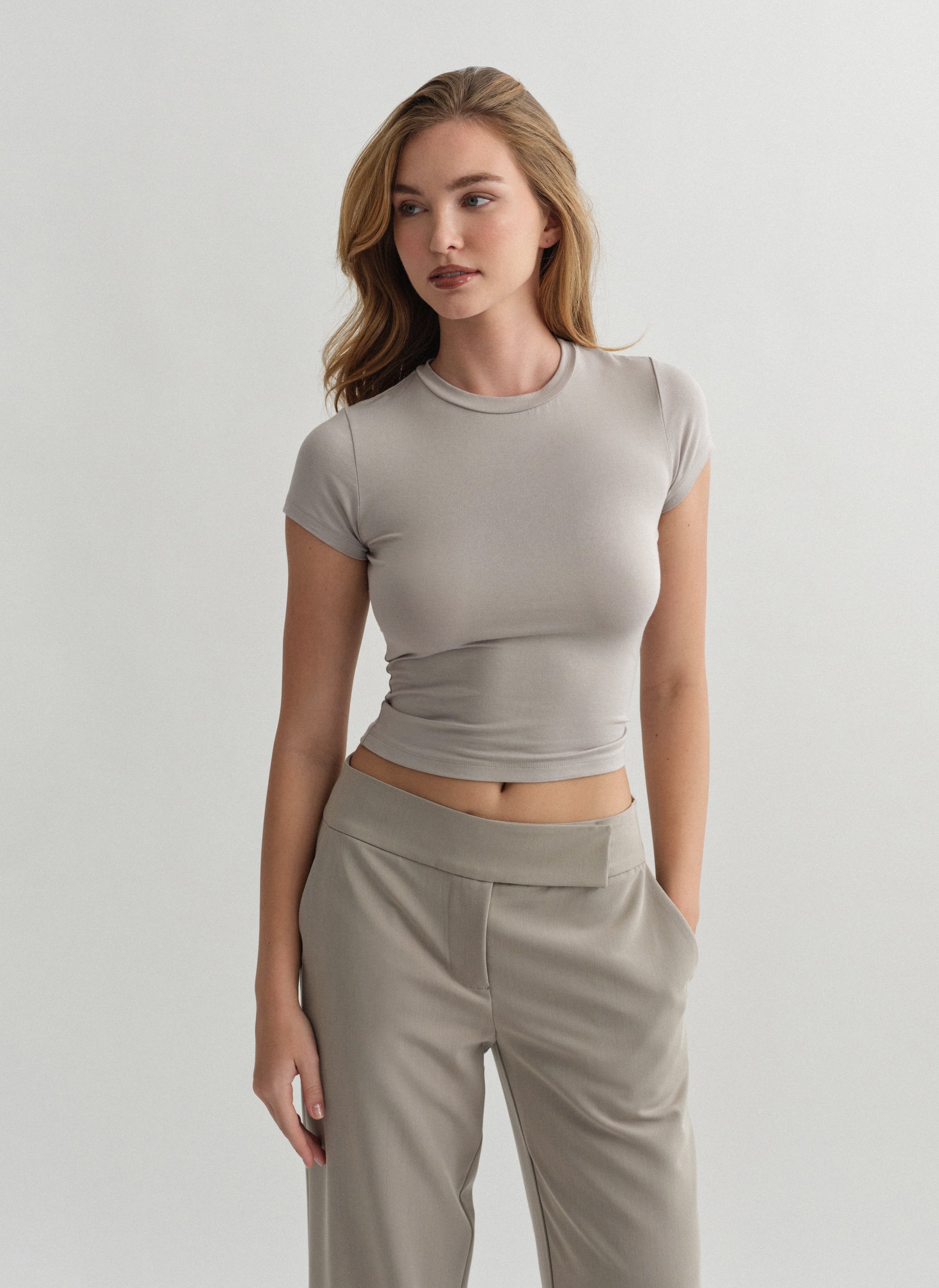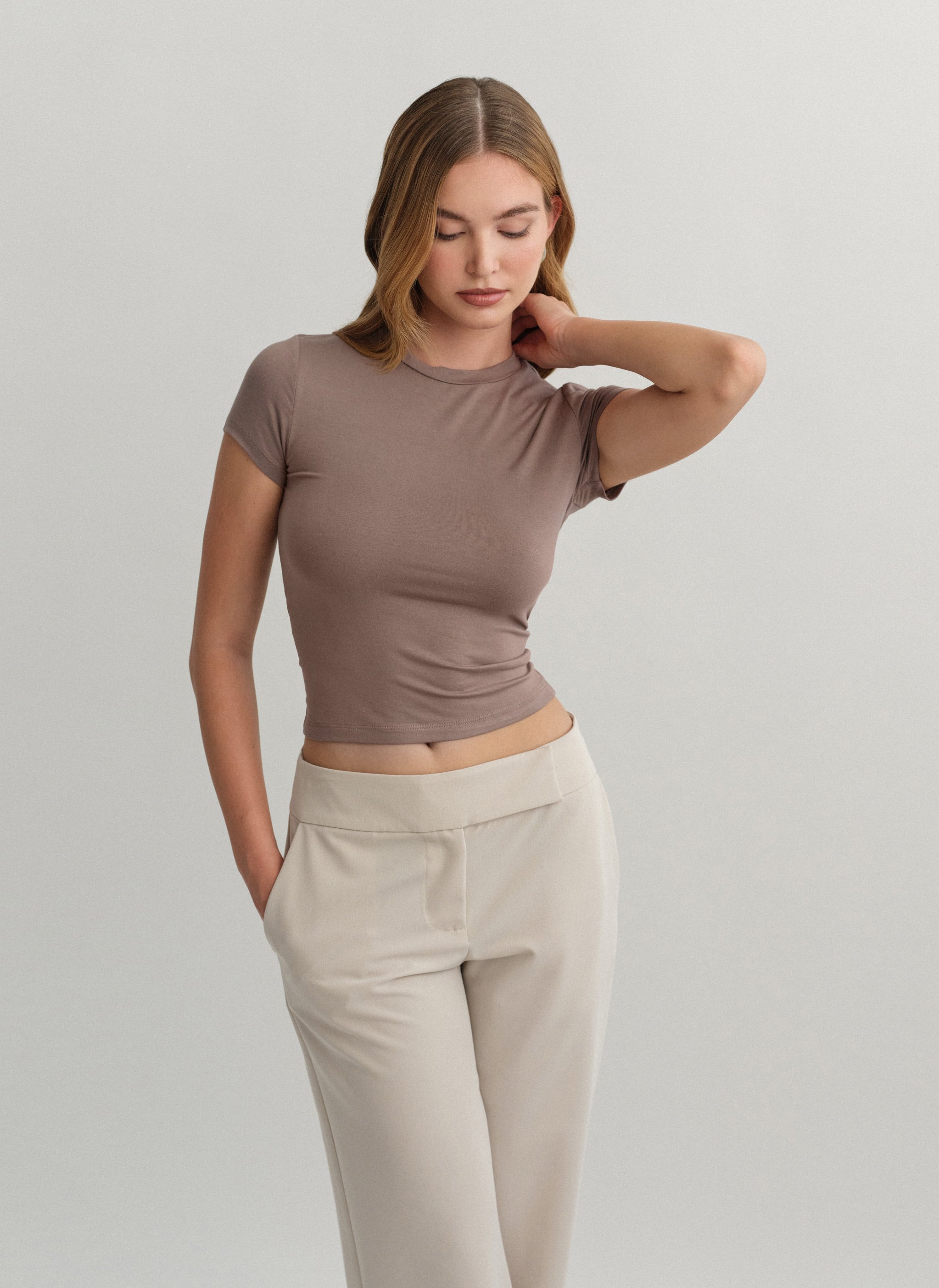 Ελαστικό κοντομάνικο basic τοπ bamboo με στρογγυλή λαιμόκοψη.