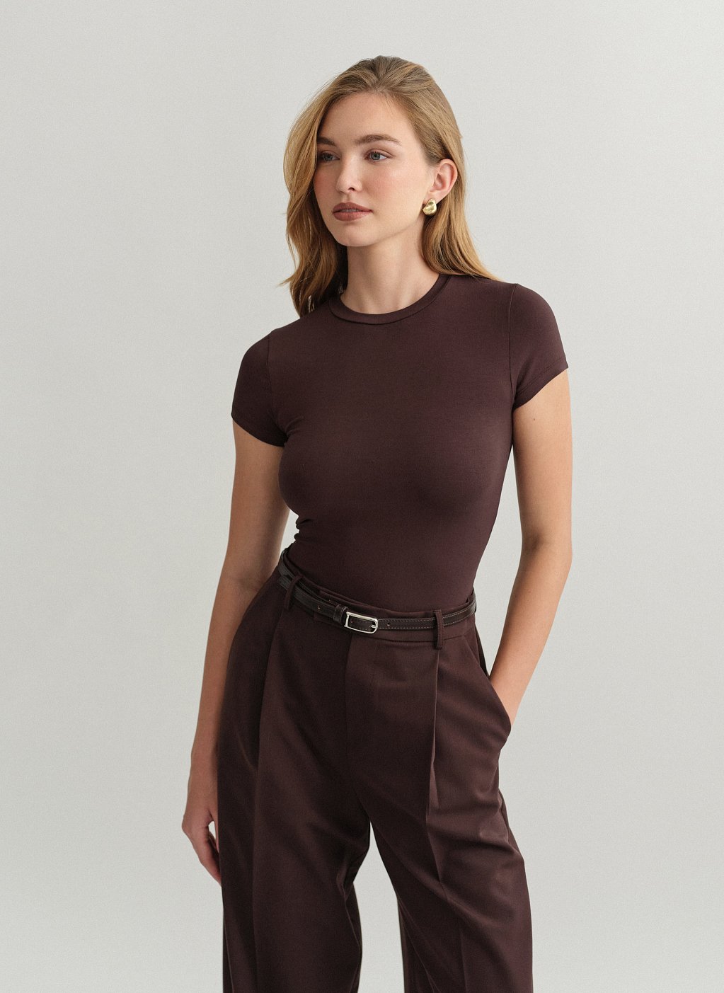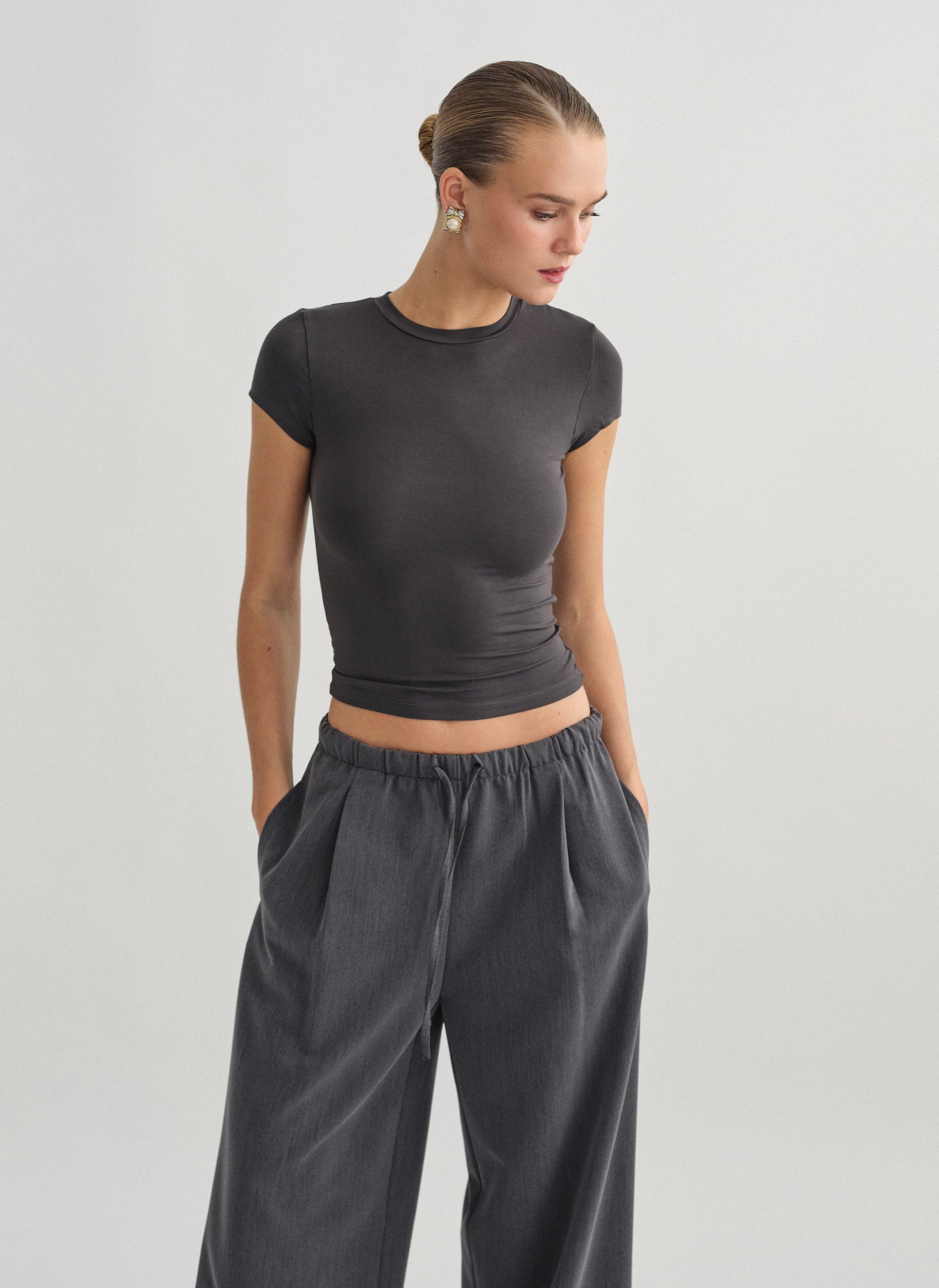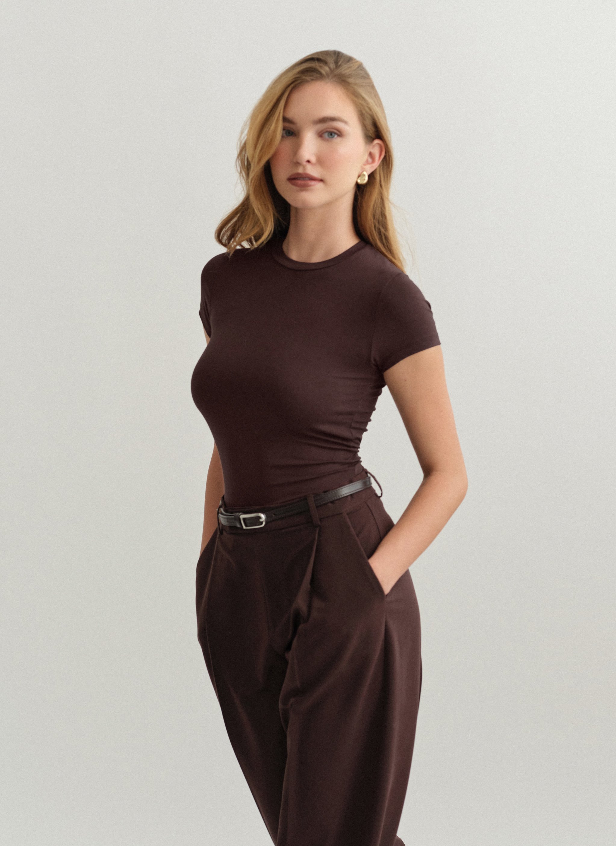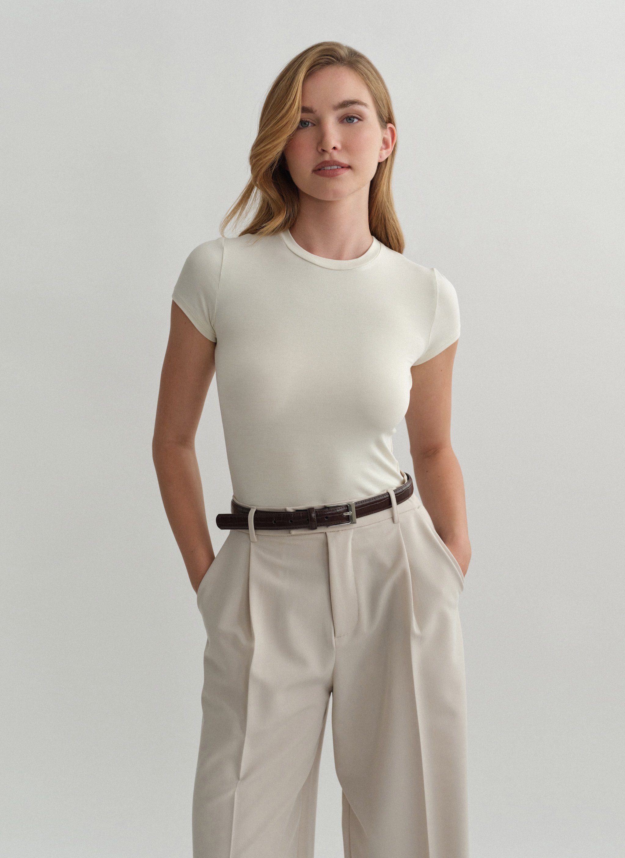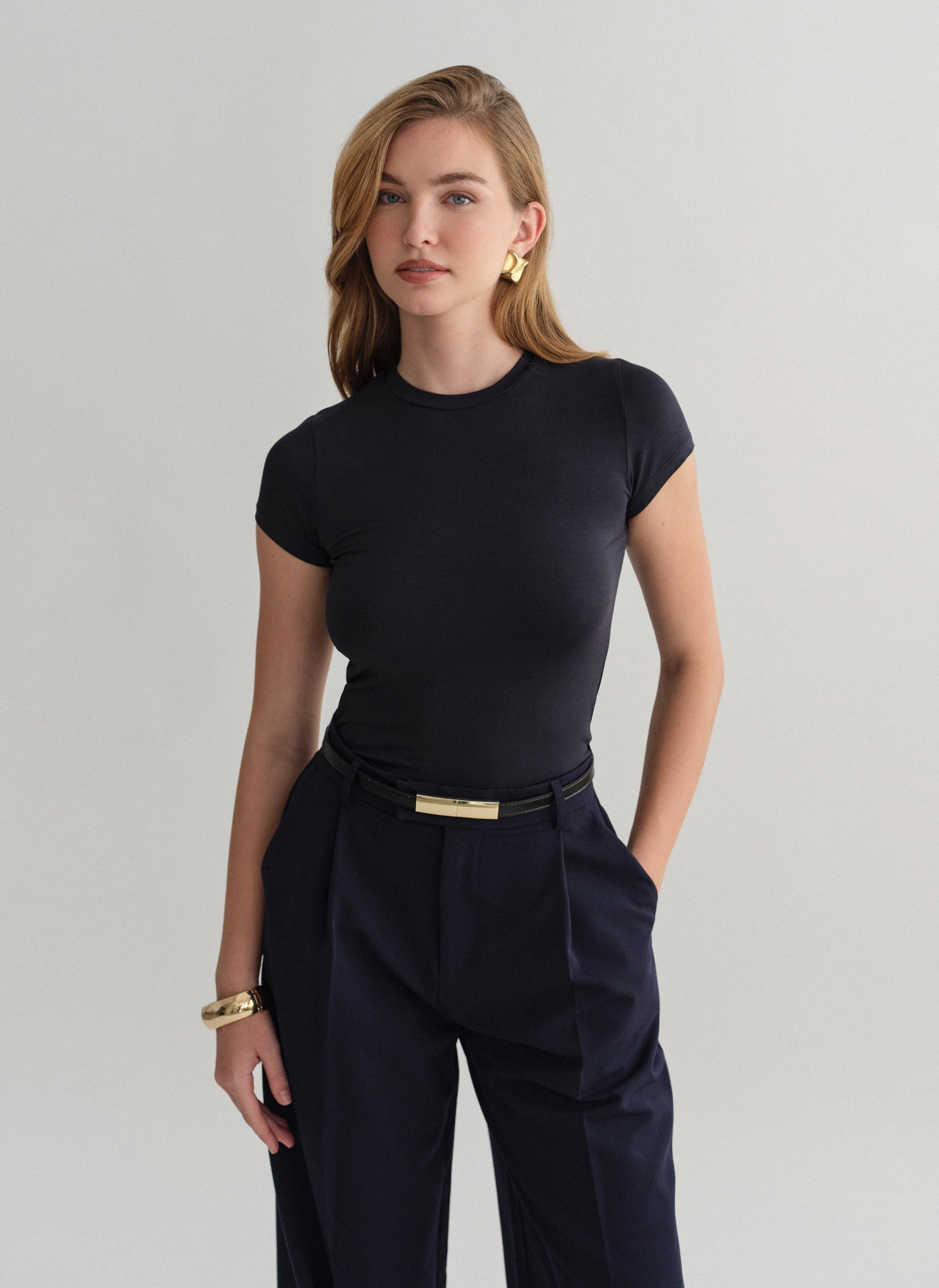 Ελαστικό κοντομάνικο basic τοπ bamboo με στρογγυλή λαιμόκοψη.