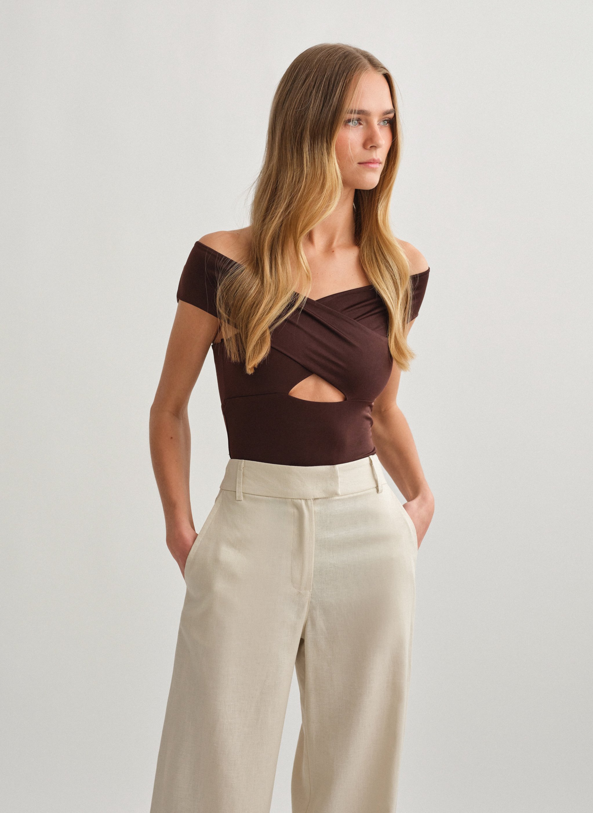 Ελαστικό off-shoulder κορμάκι με χιαστί ντεκολτέ.
