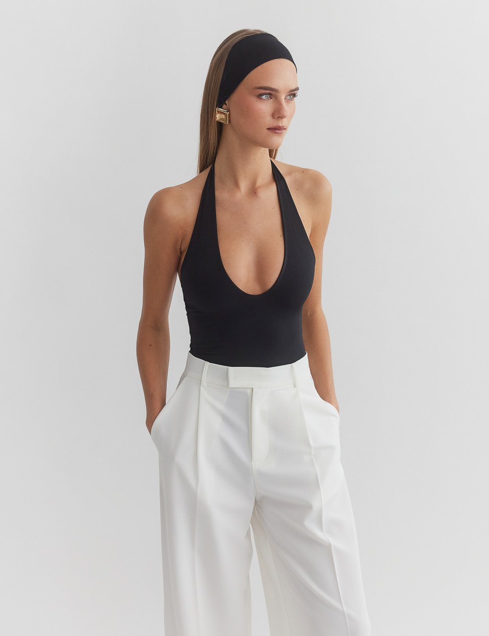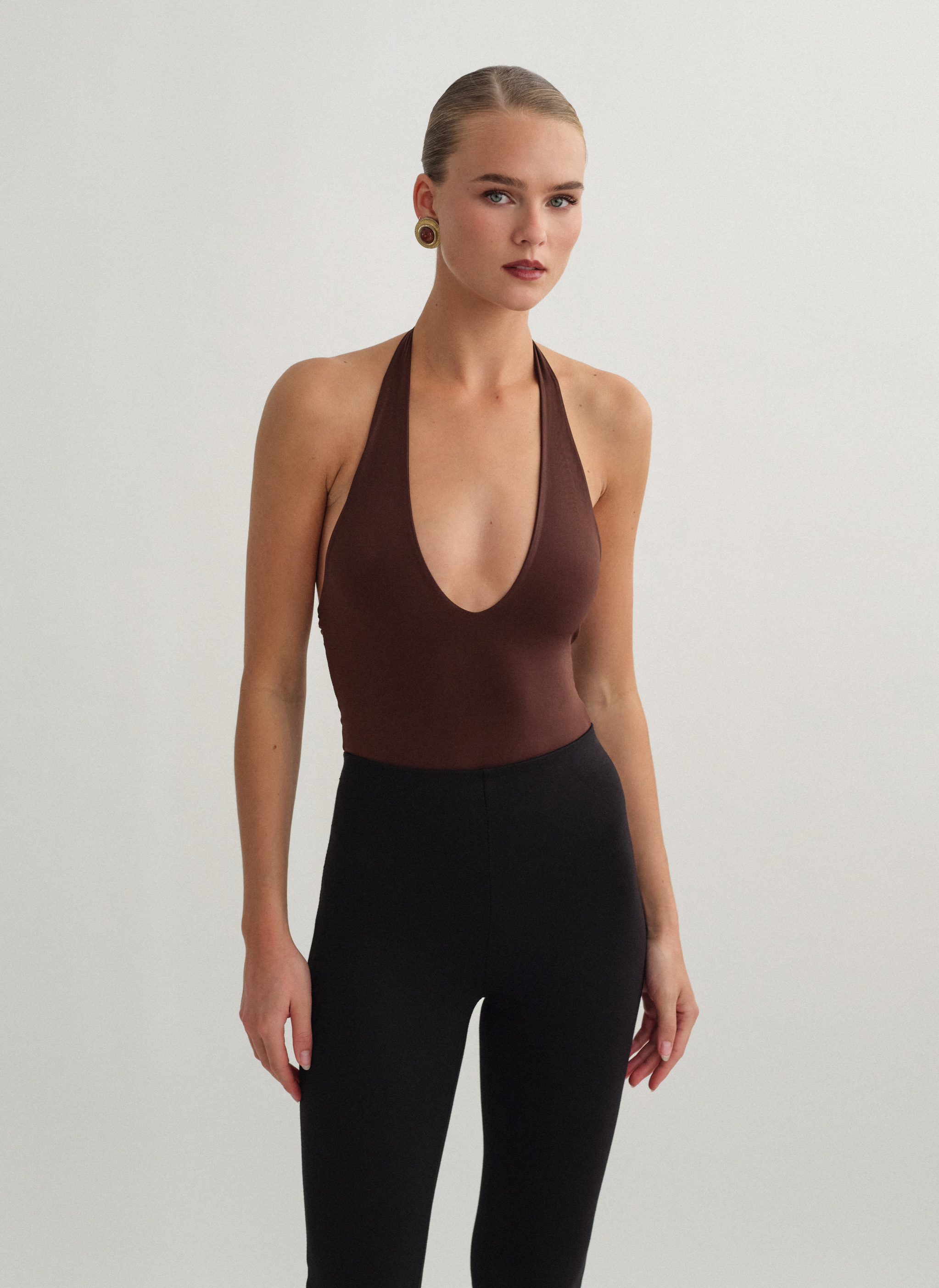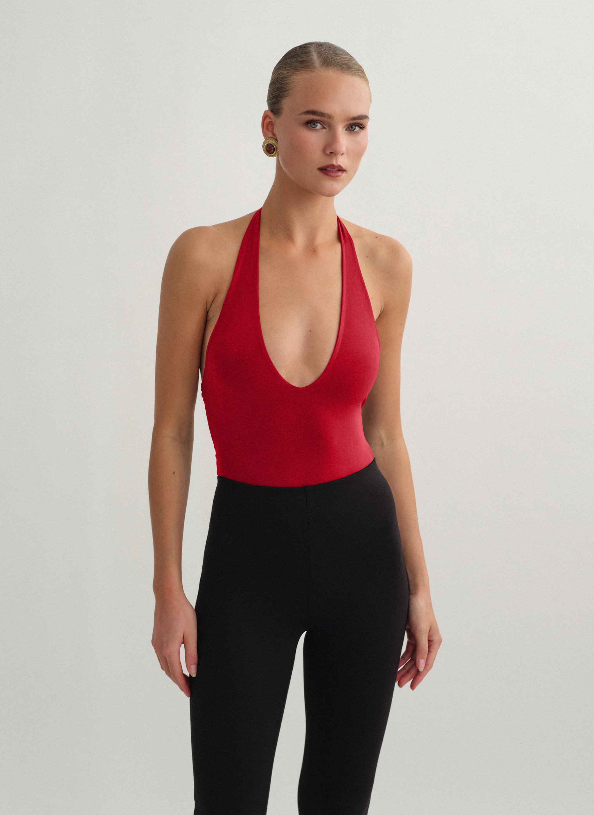 Ελαστικό κορμάκι με λαιμόκοψη halter με βαθύ ντεκολτέ.