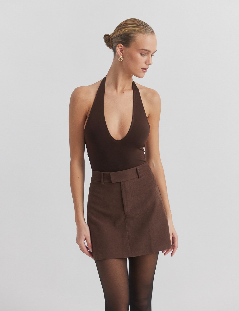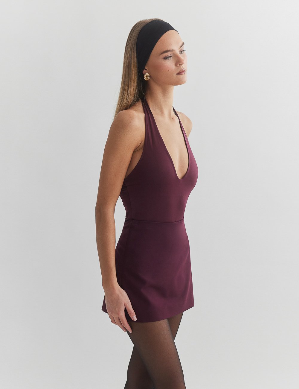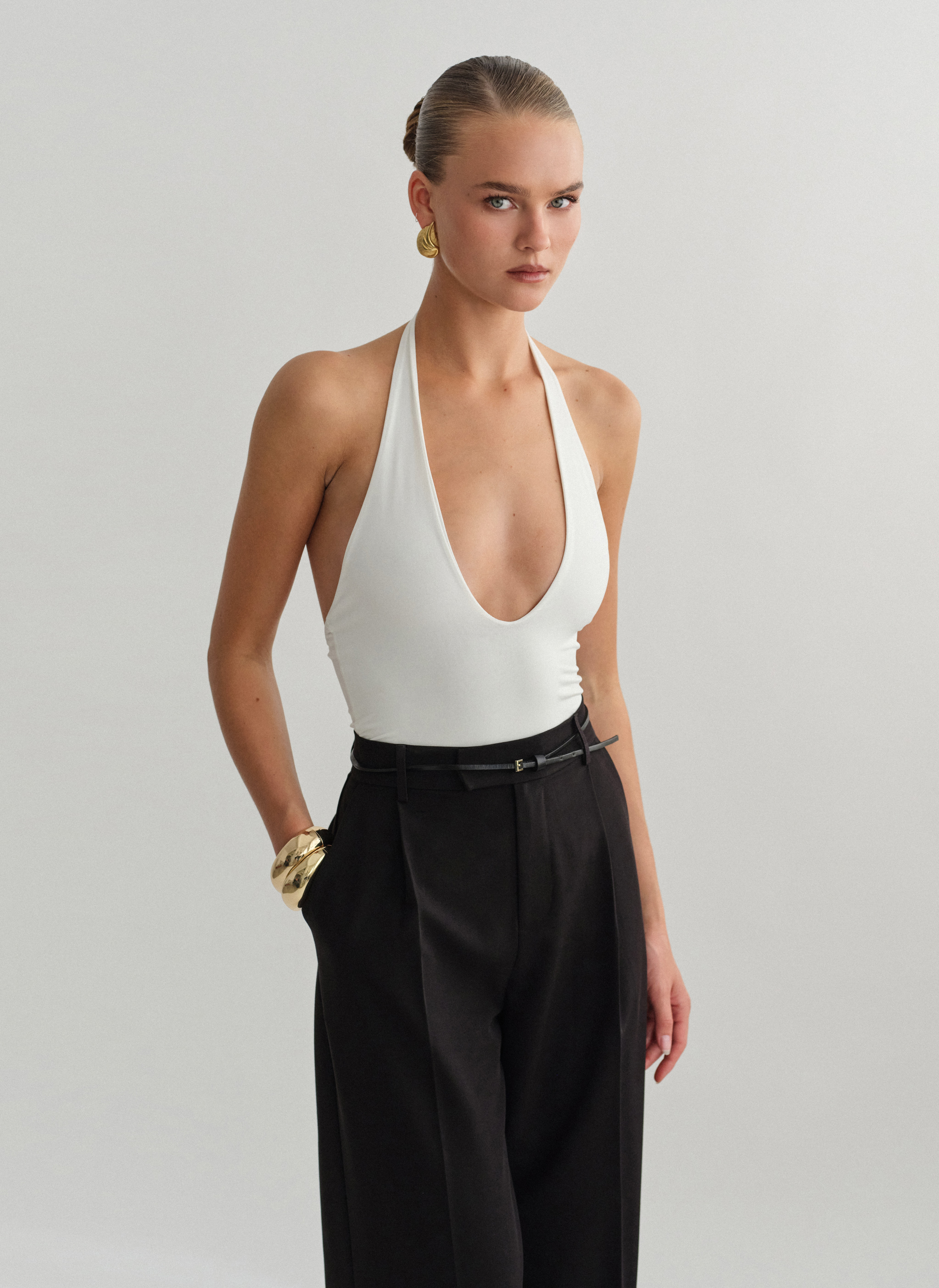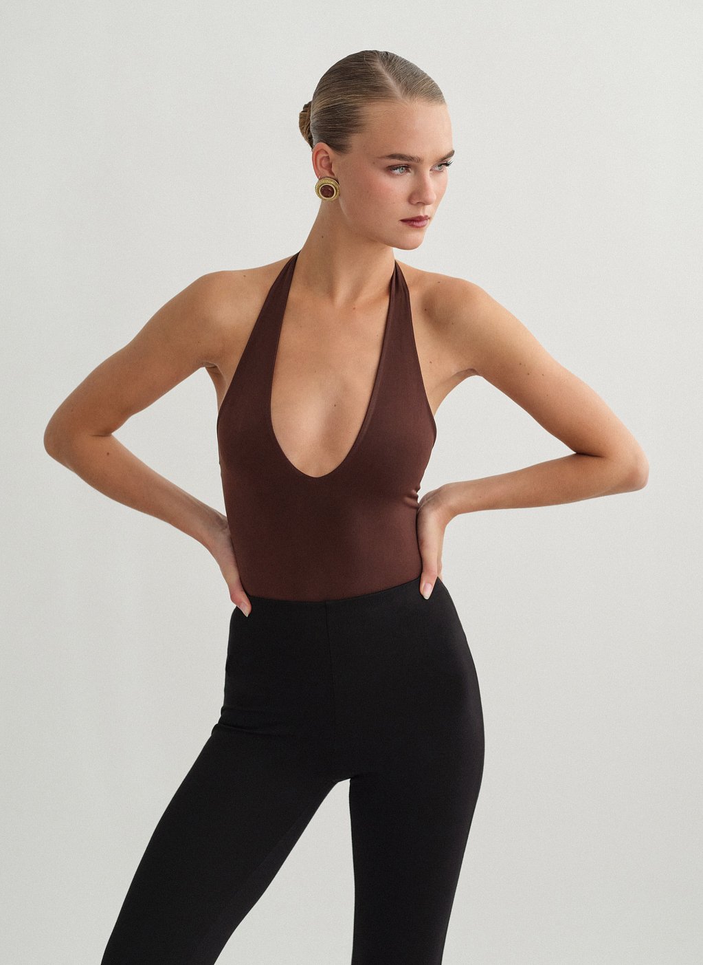 Ελαστικό κορμάκι με λαιμόκοψη halter με βαθύ ντεκολτέ.