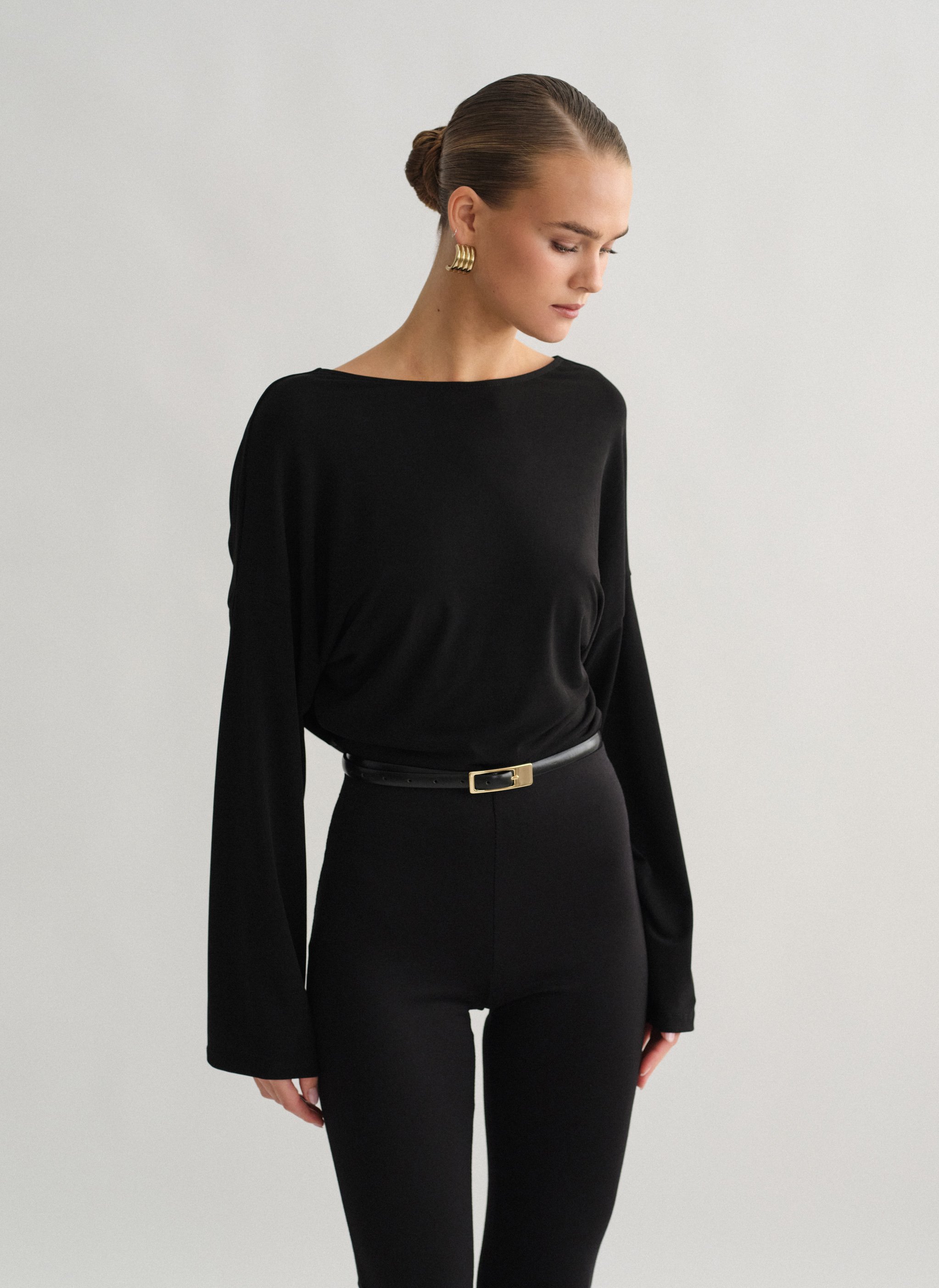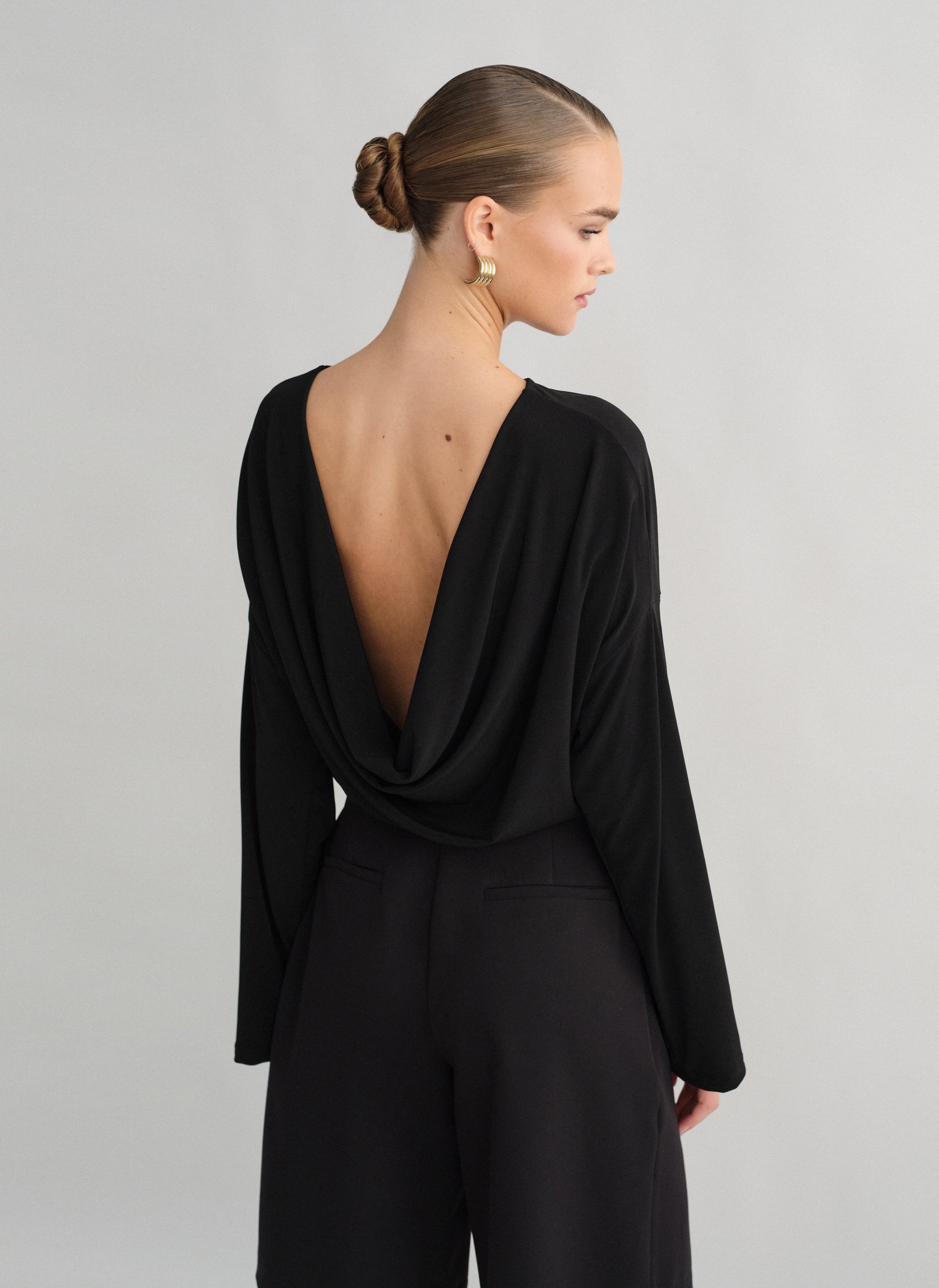 Ελαστικό μακρυμάνικο κορμάκι με ντραπέ πλάτη και φαρδύ μανίκι.