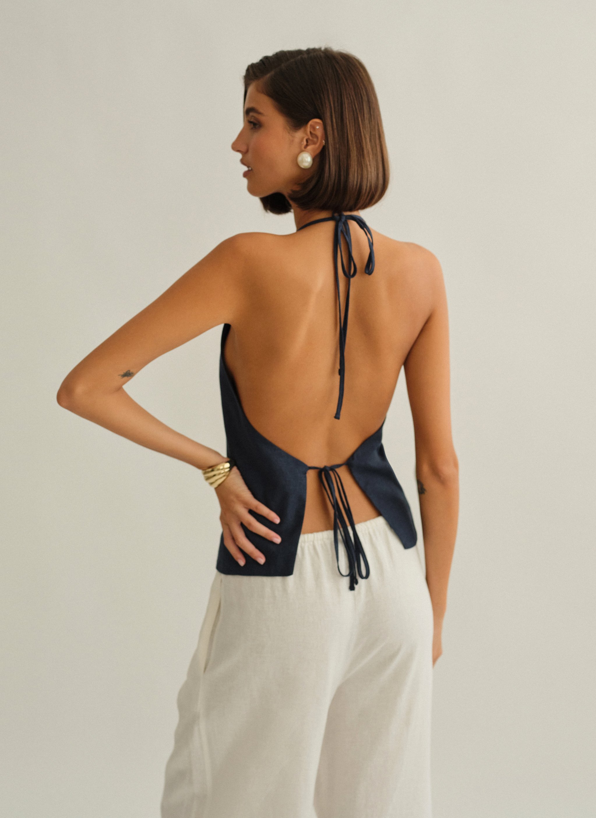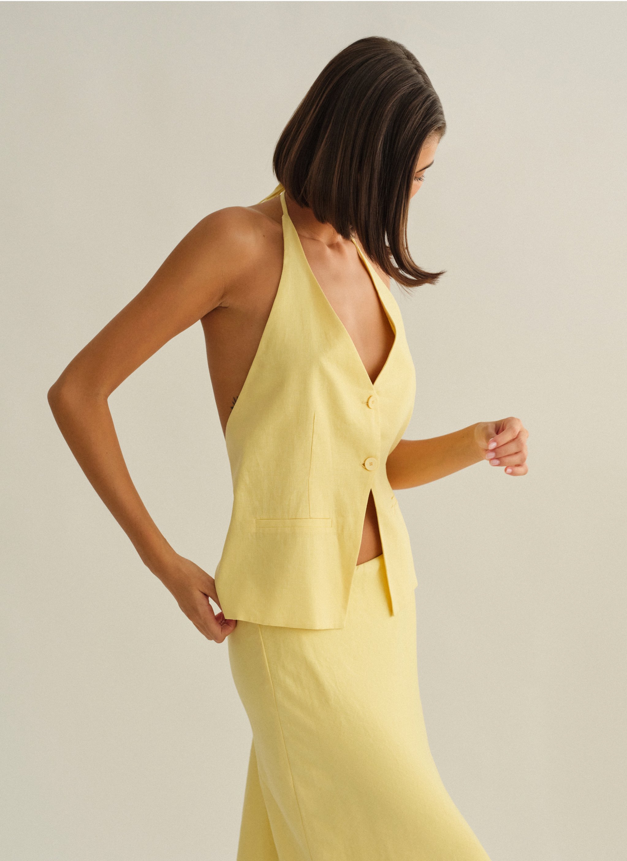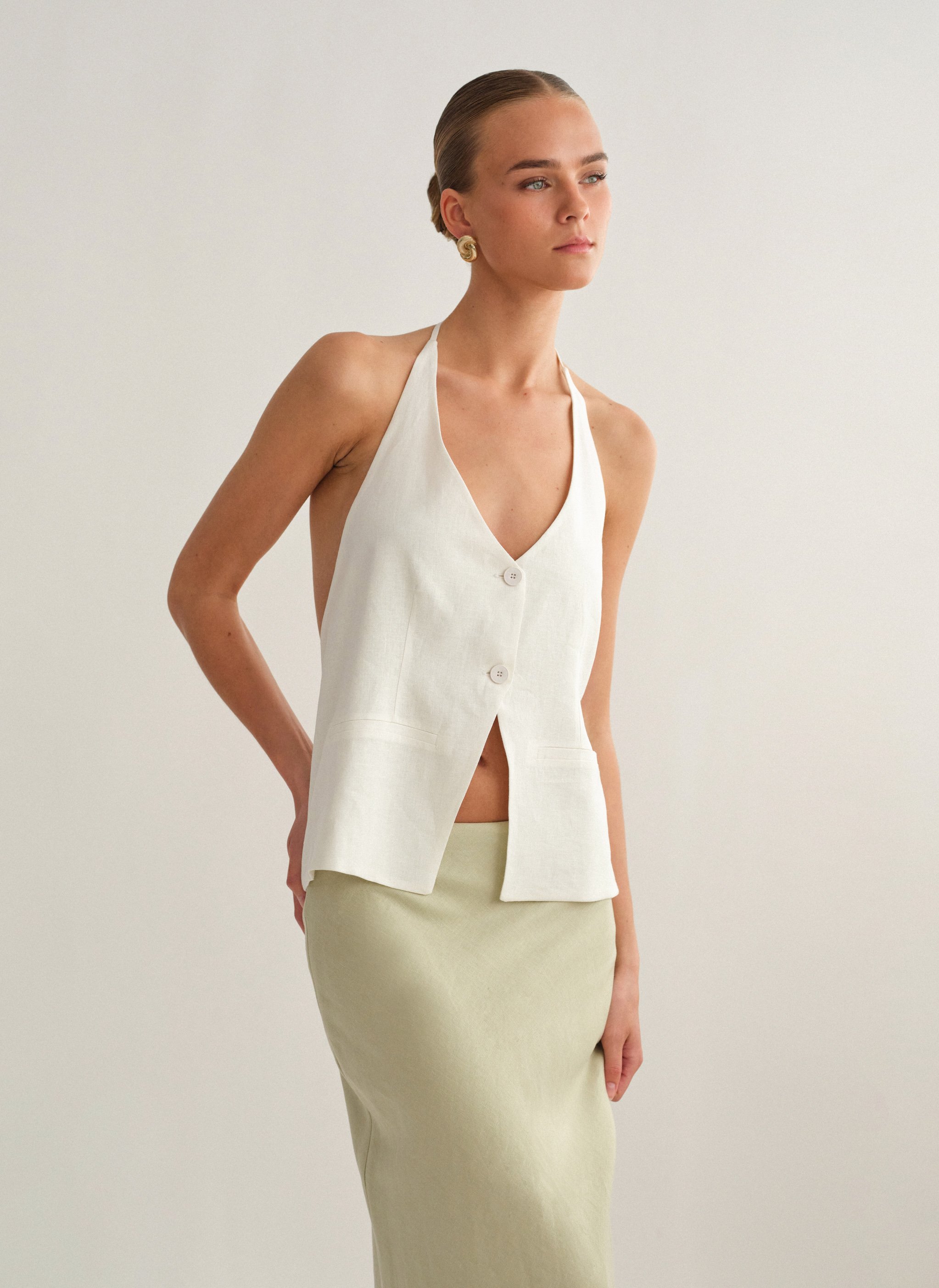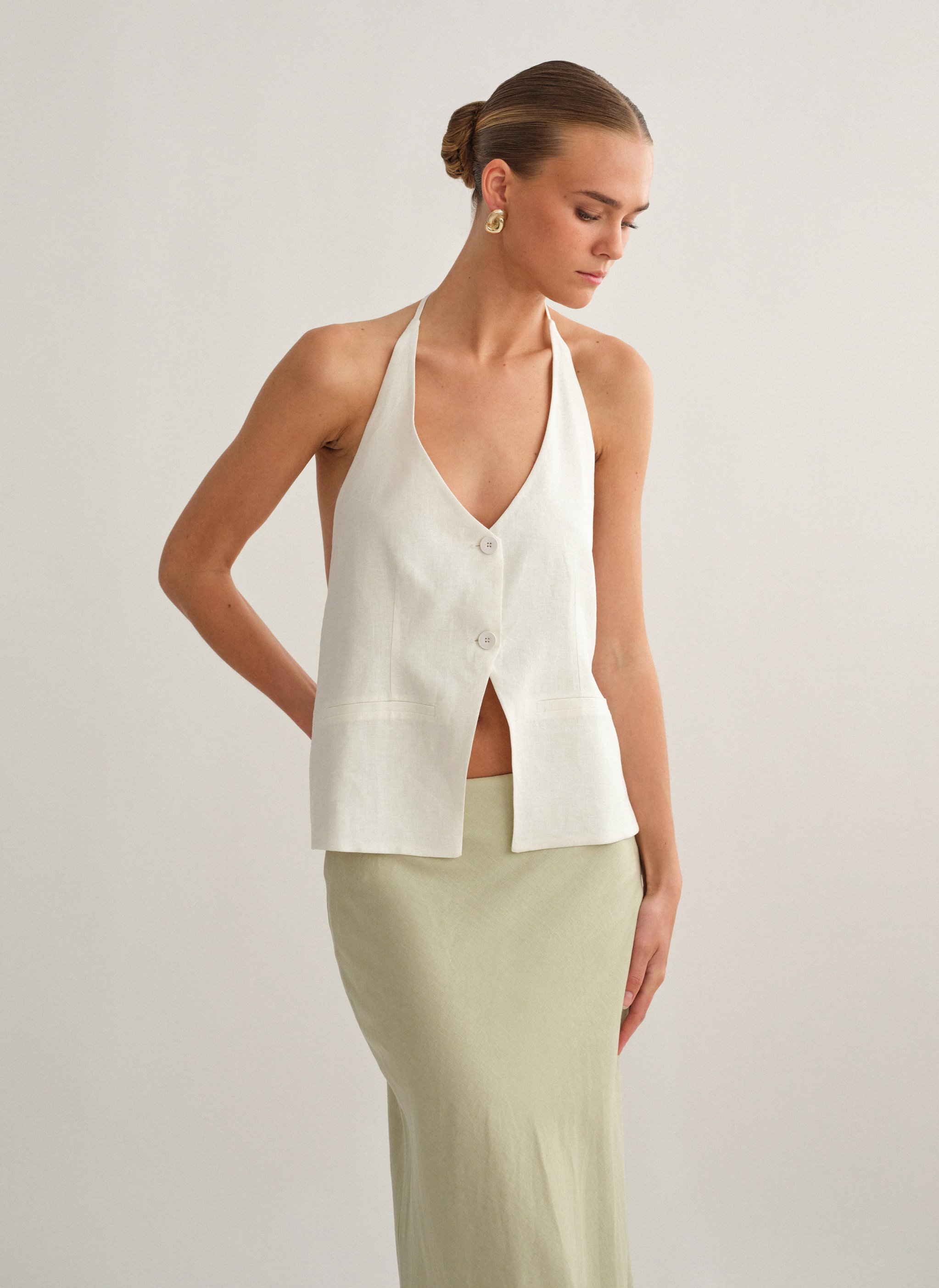 Λινό halter γιλέκο με δεσίματα και κλείσιμο εμπρός με κουμπιά.