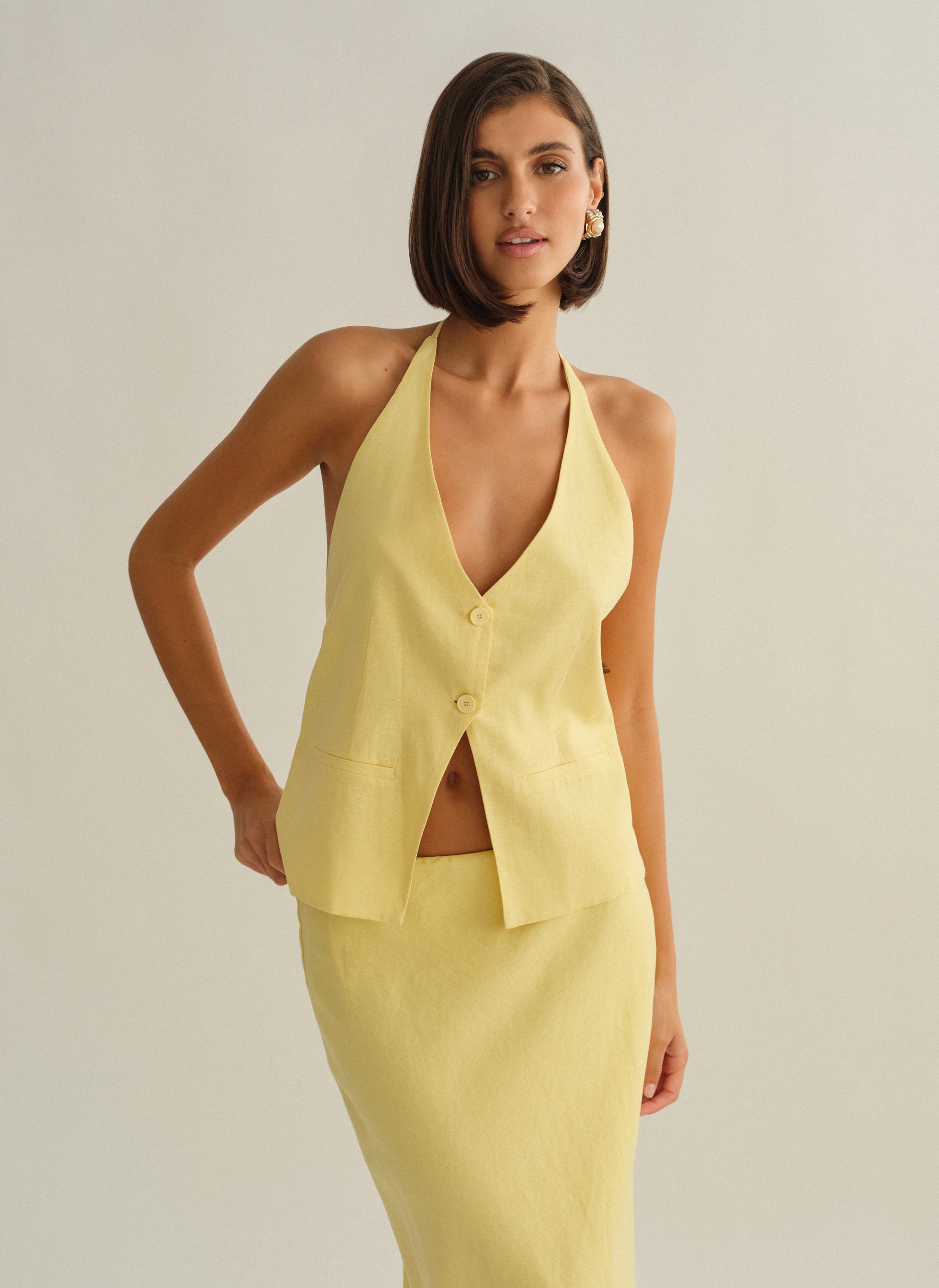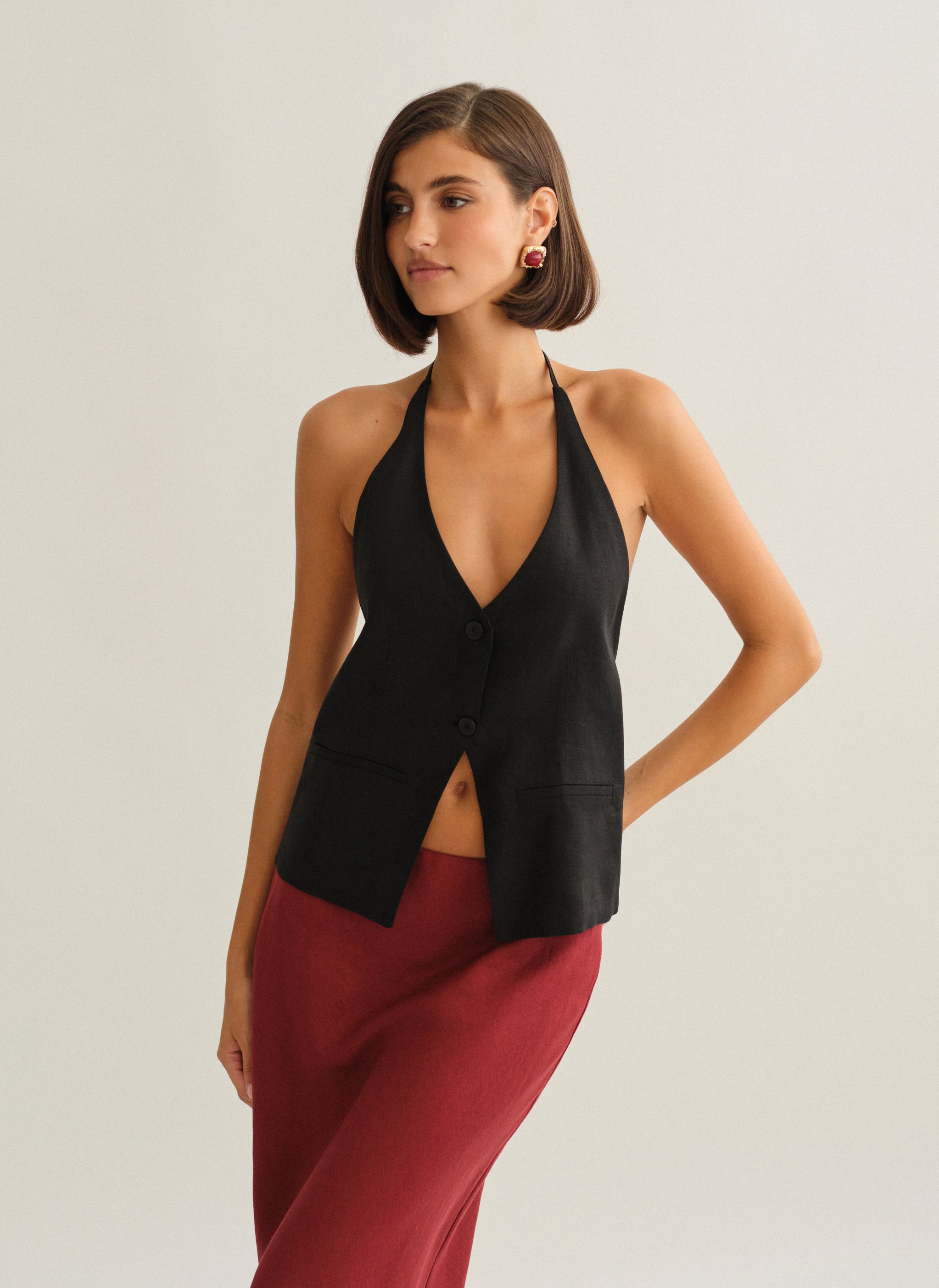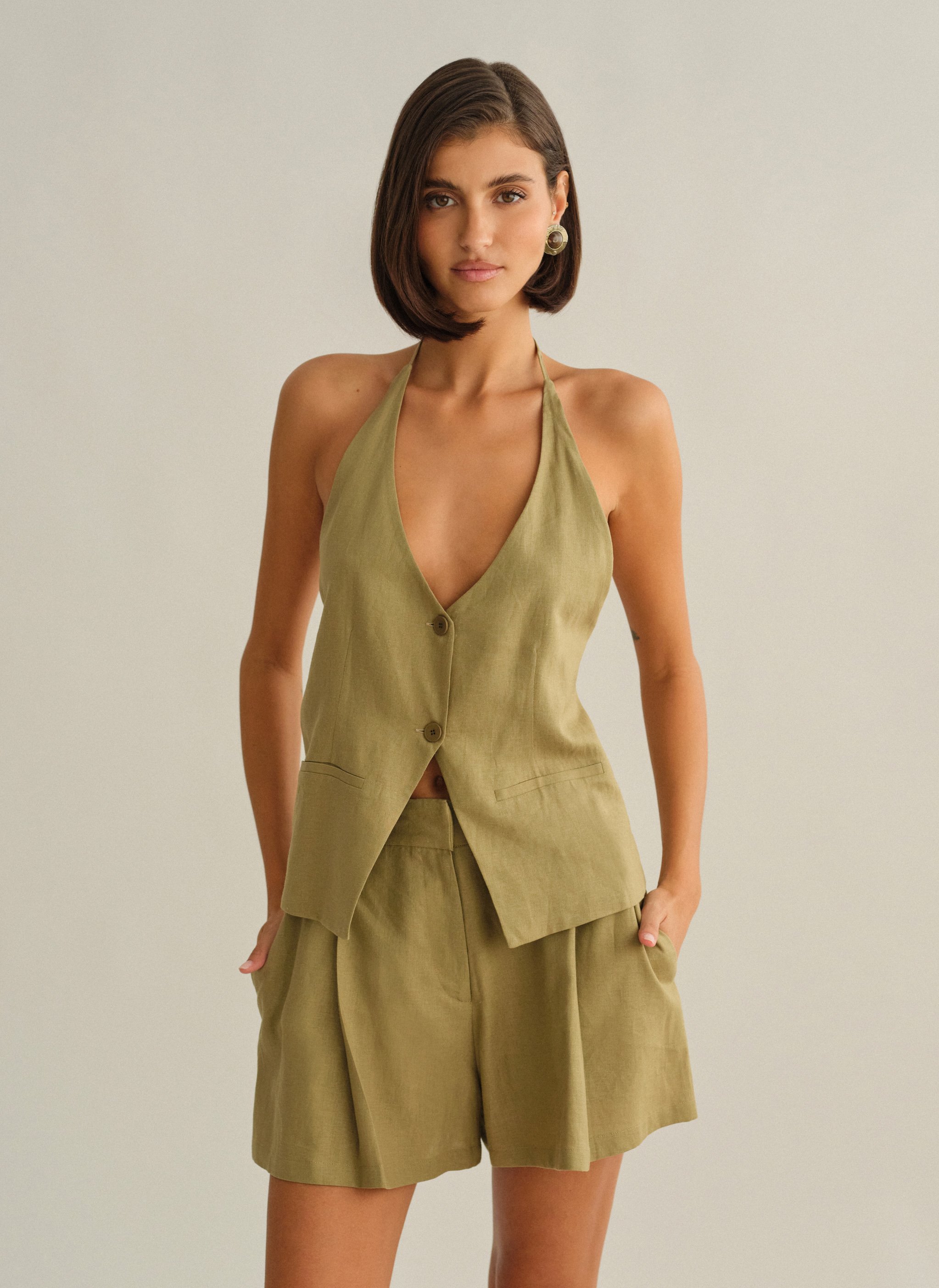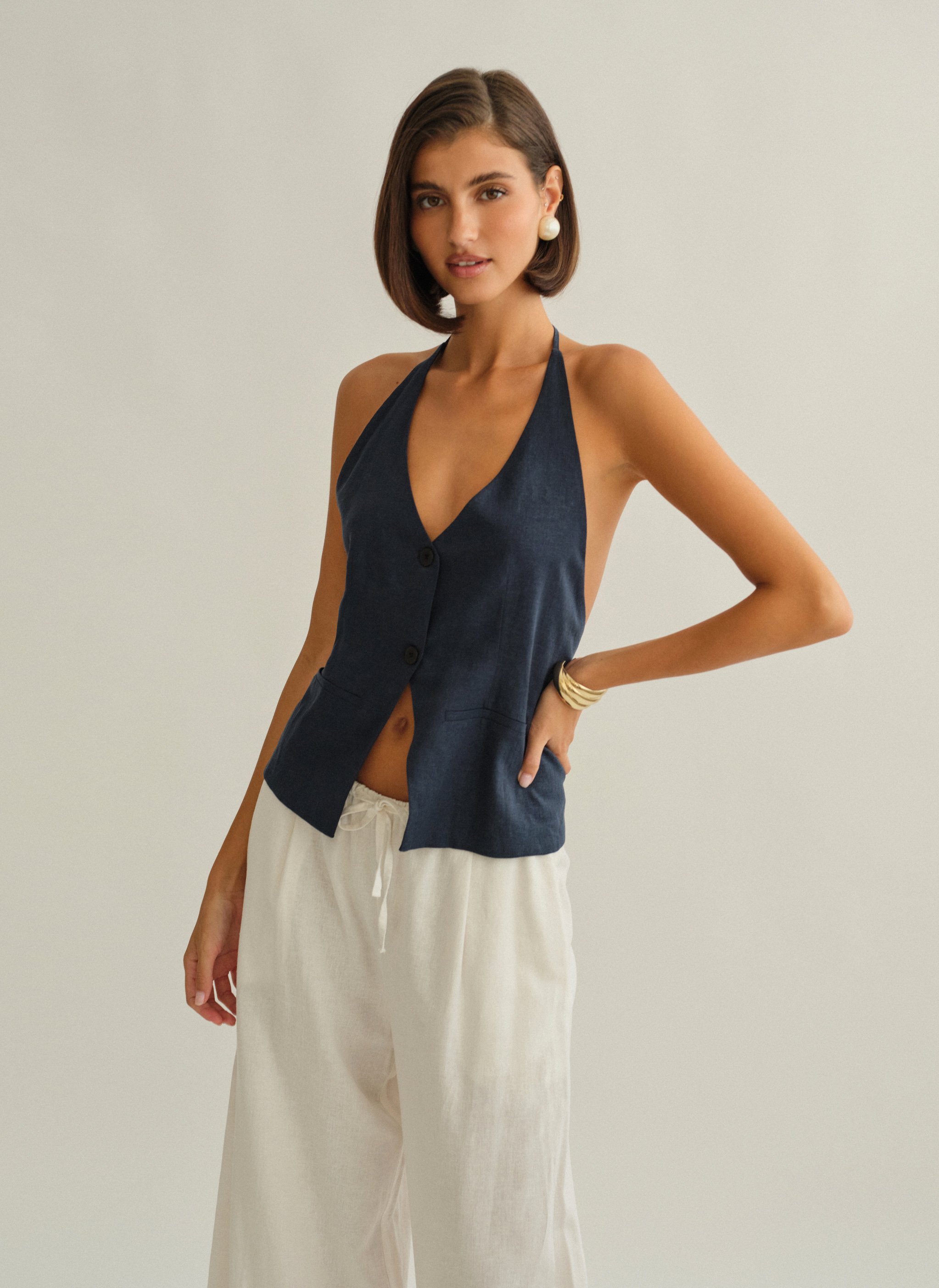 Λινό halter γιλέκο με δεσίματα και κλείσιμο εμπρός με κουμπιά.