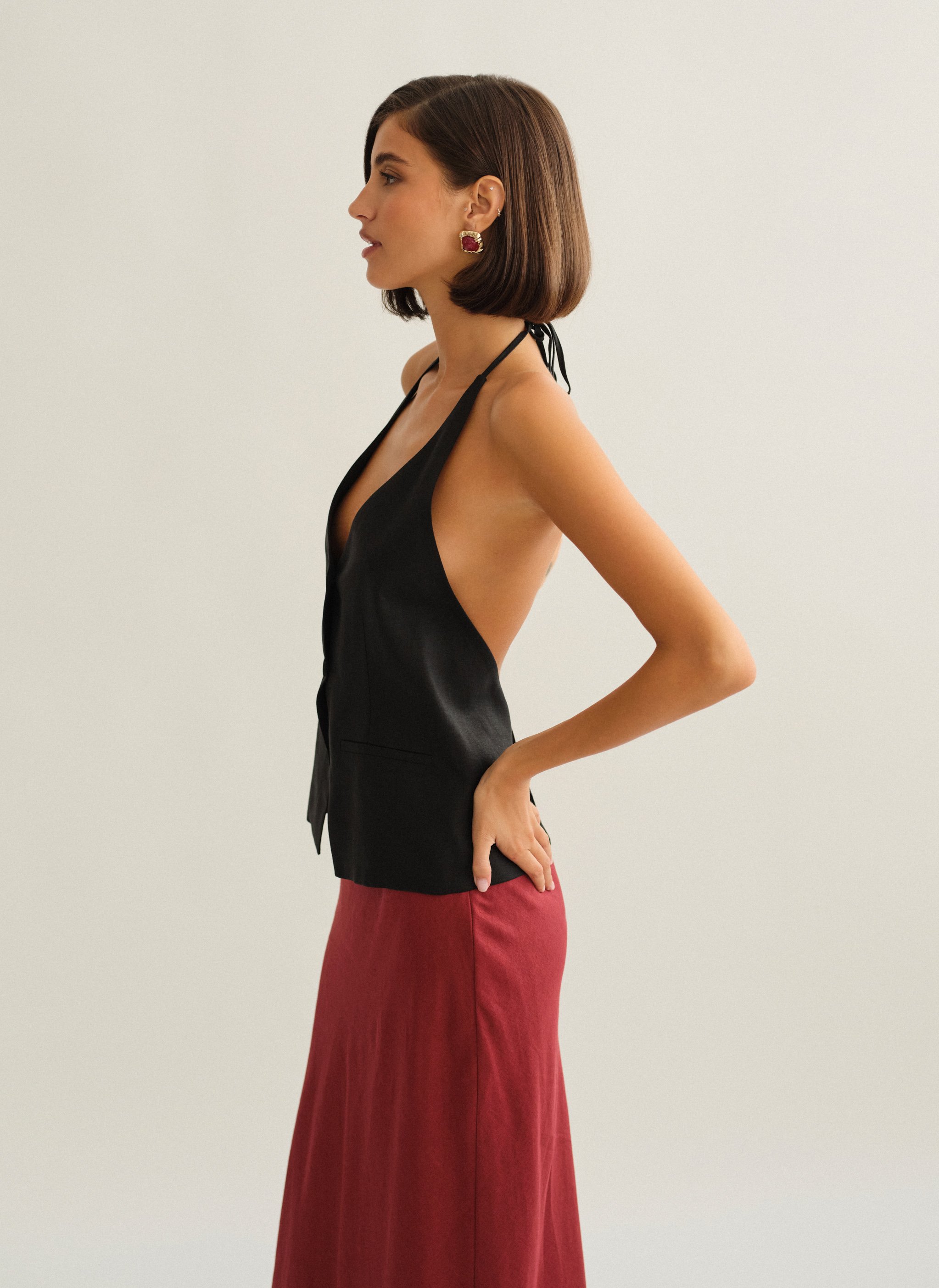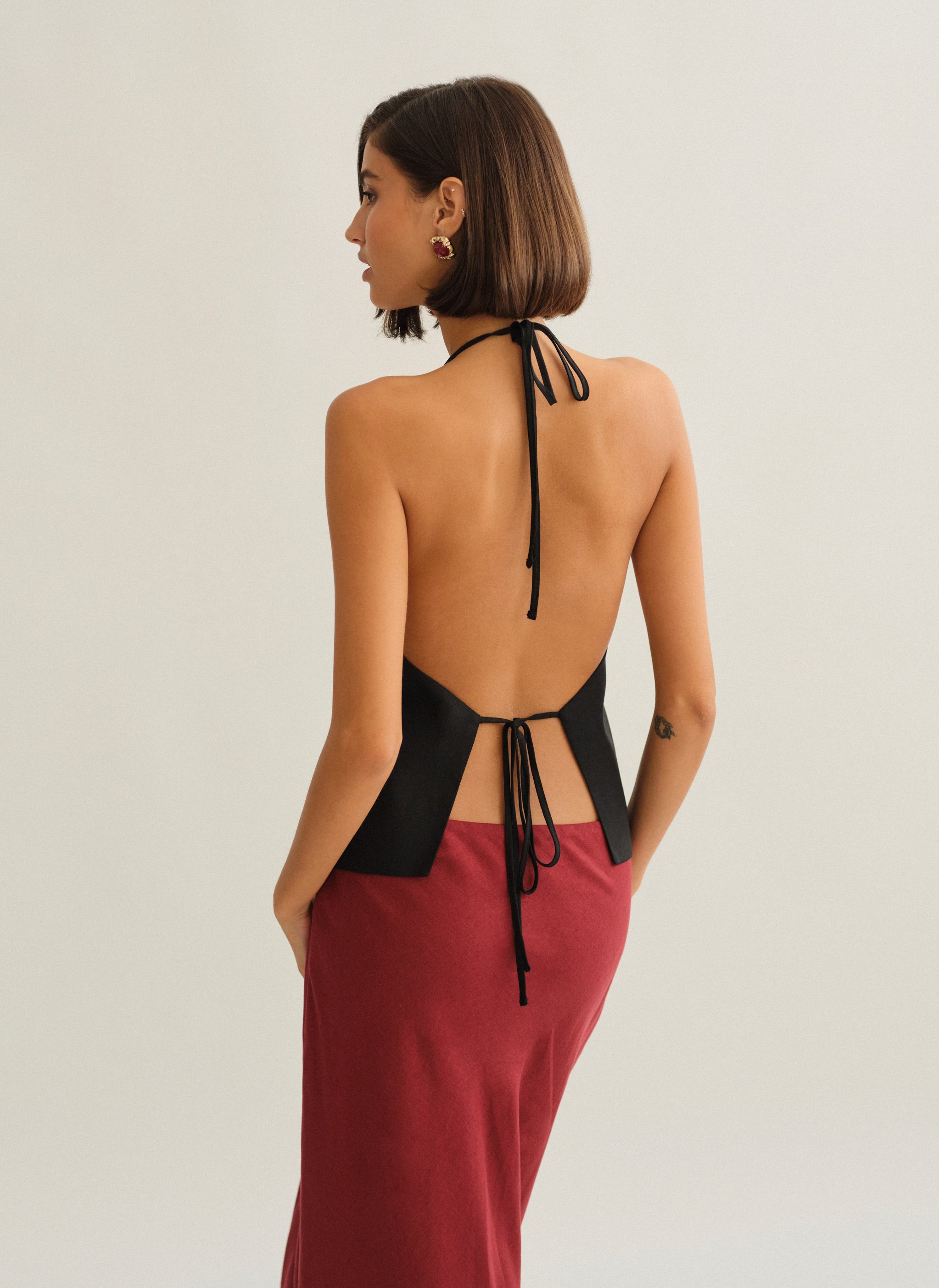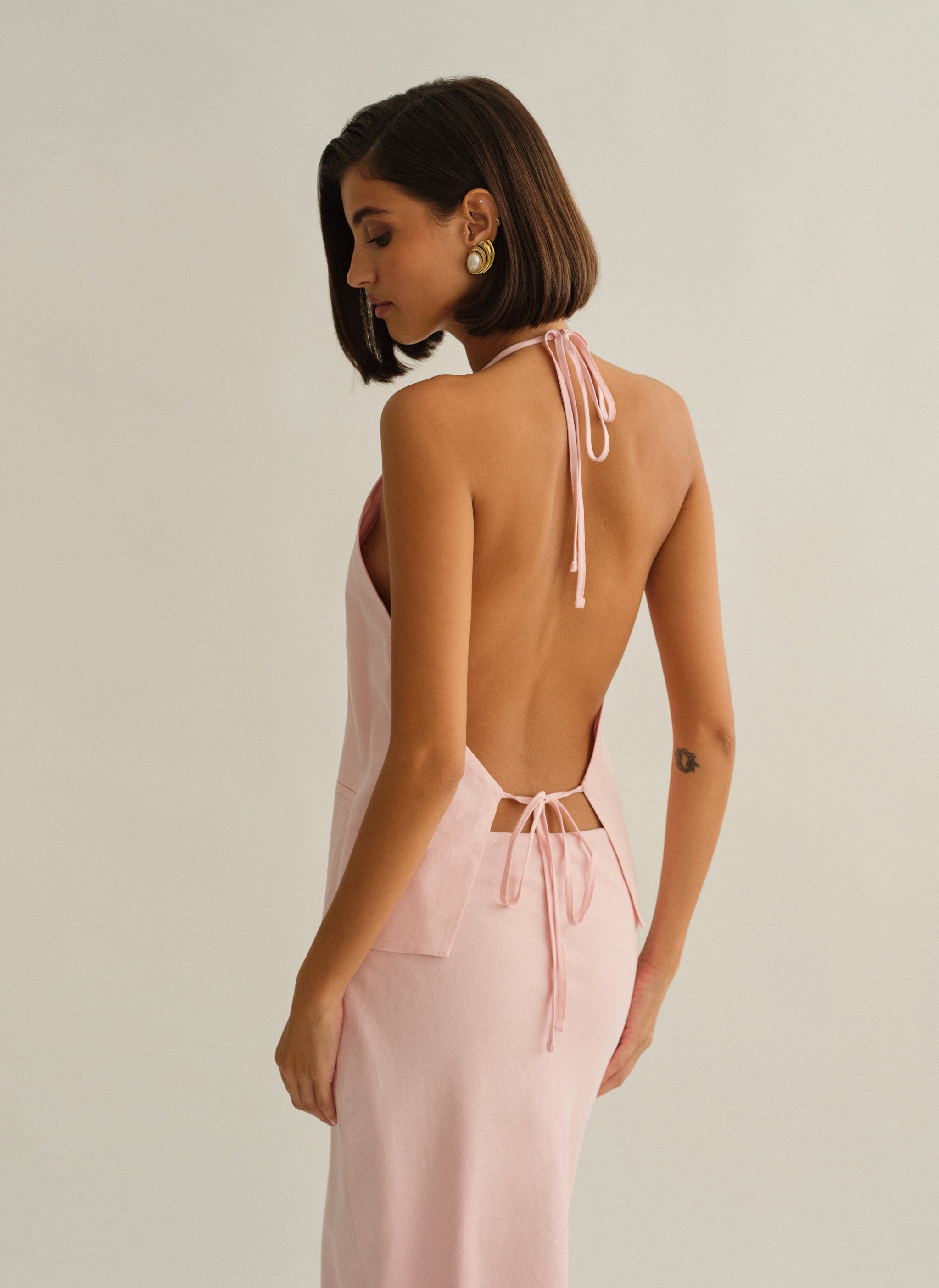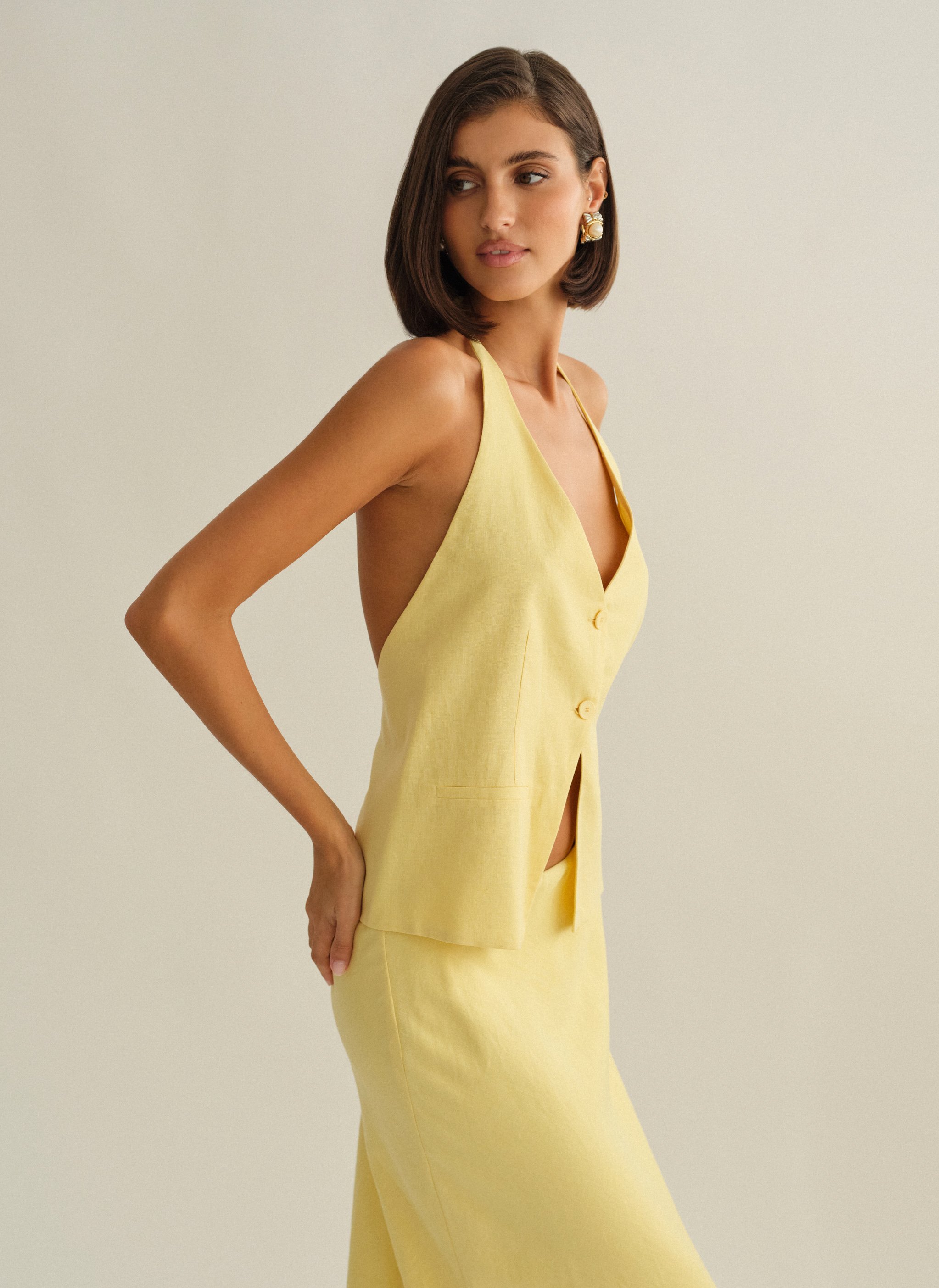 Λινό halter γιλέκο με δεσίματα και κλείσιμο εμπρός με κουμπιά.