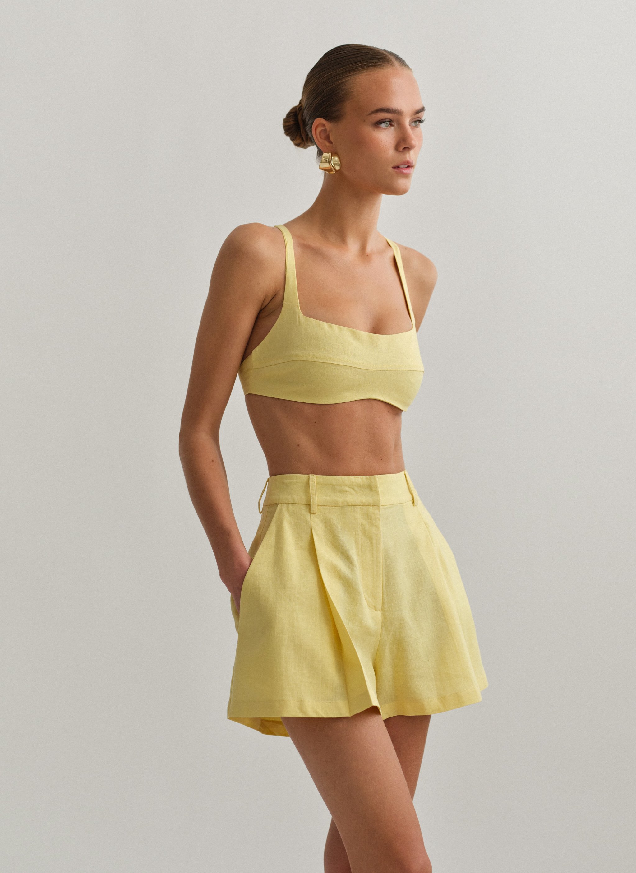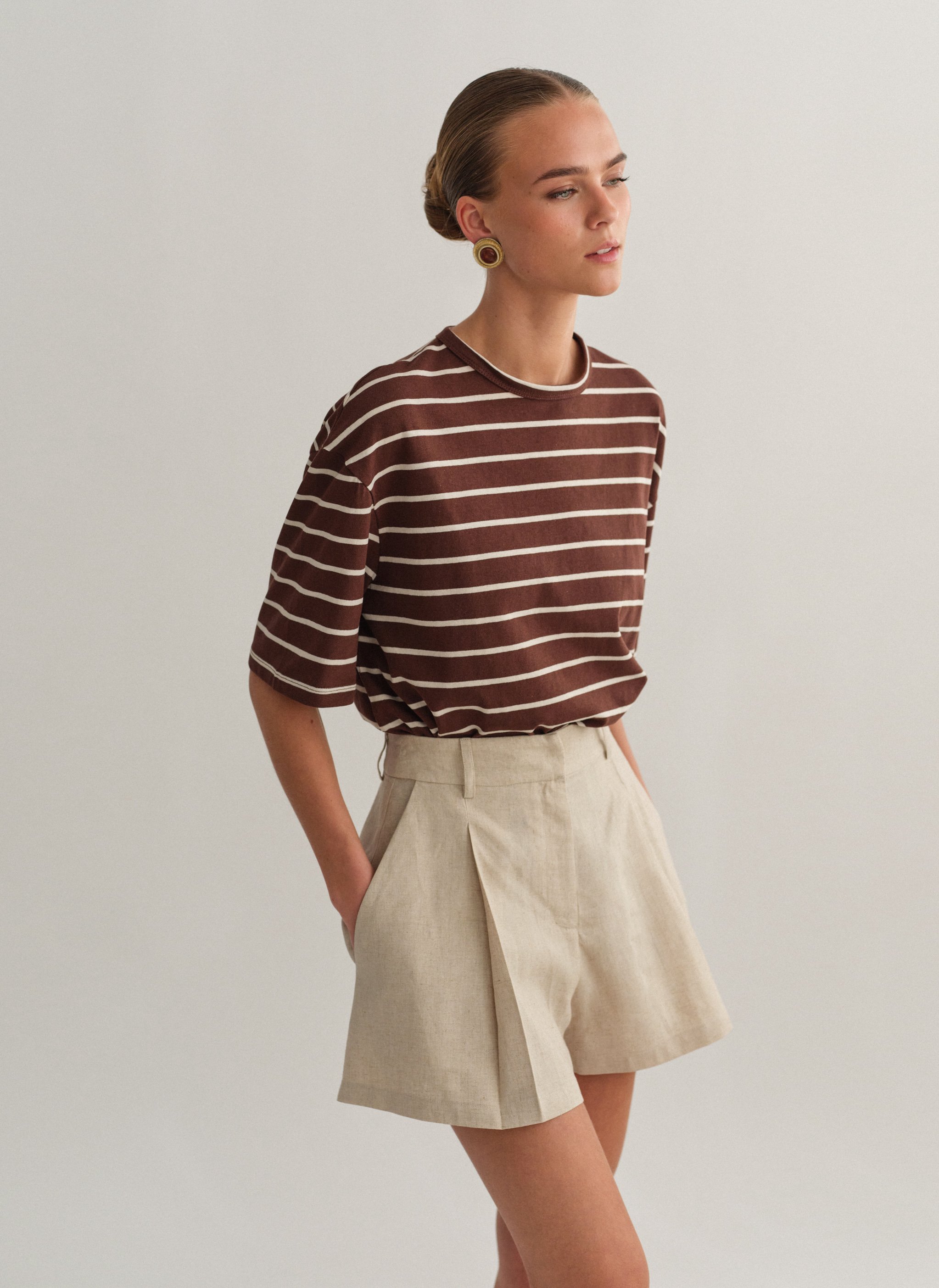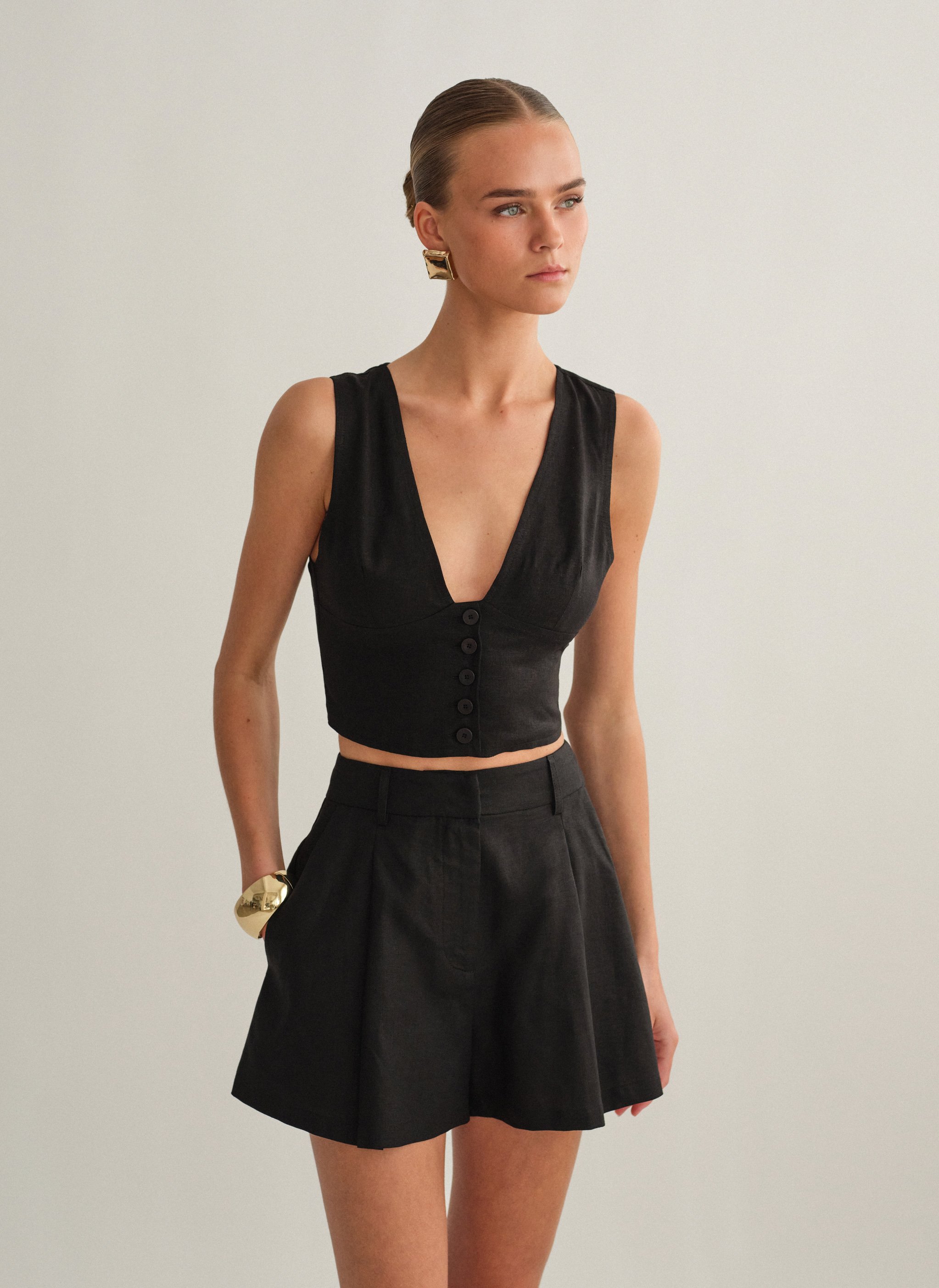 Ψηλόμεσο λινό σορτς με πιέτες και τσέπες.