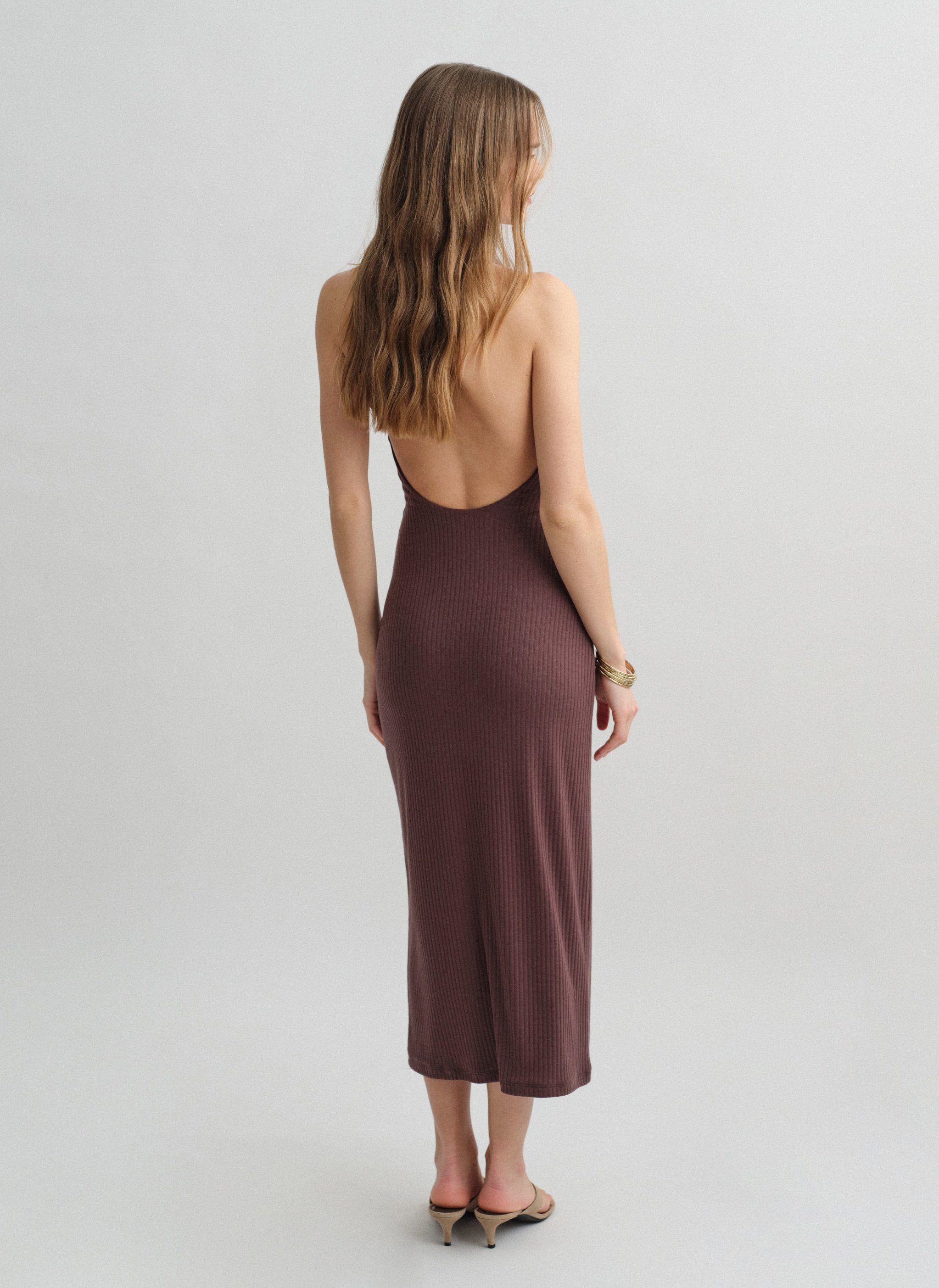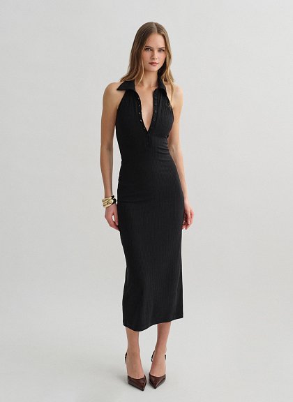 Ελαστικό μακρύ ριπ αμάνικο φόρεμα με ανοιχτή πλάτη και γιακά.