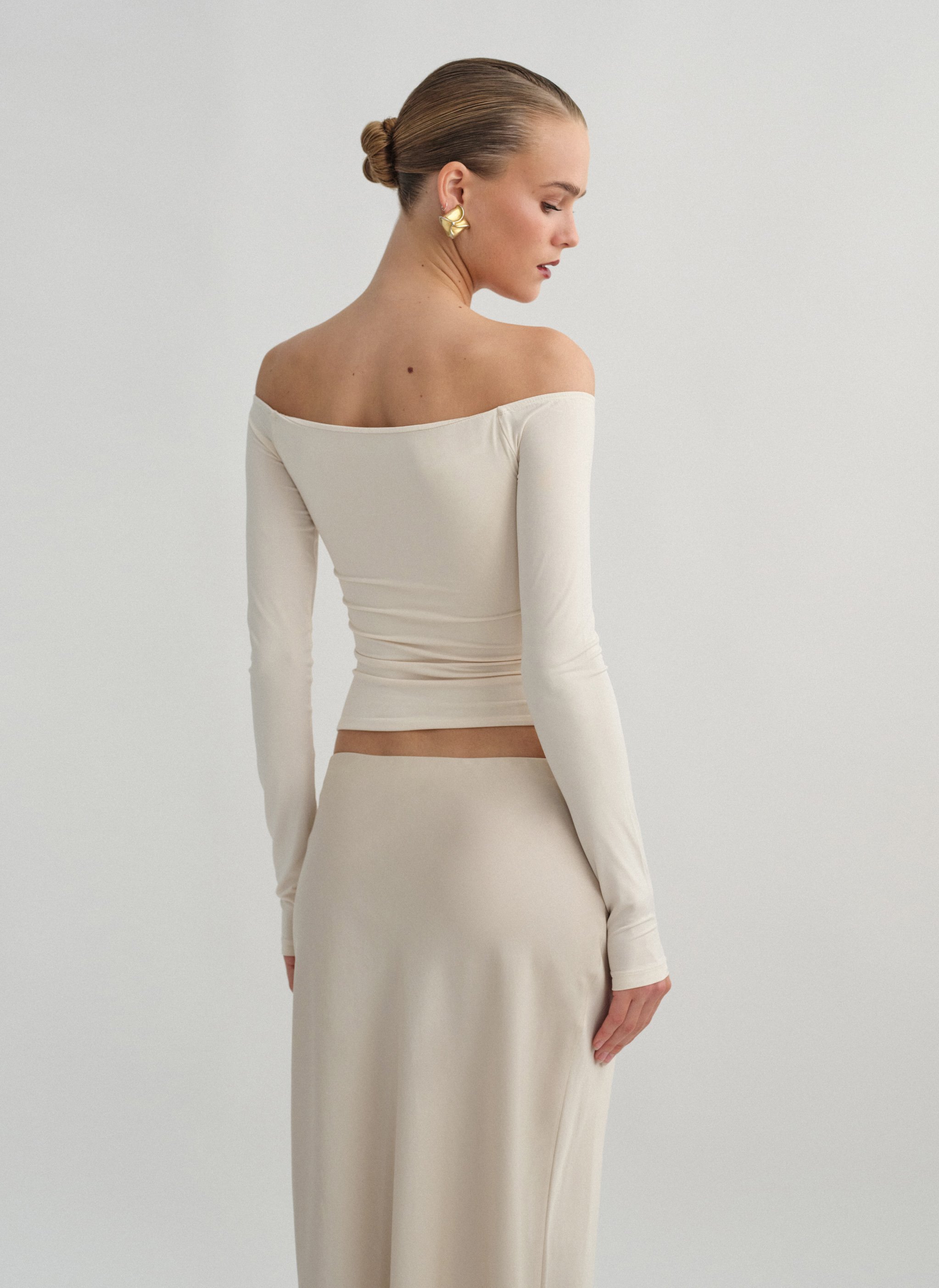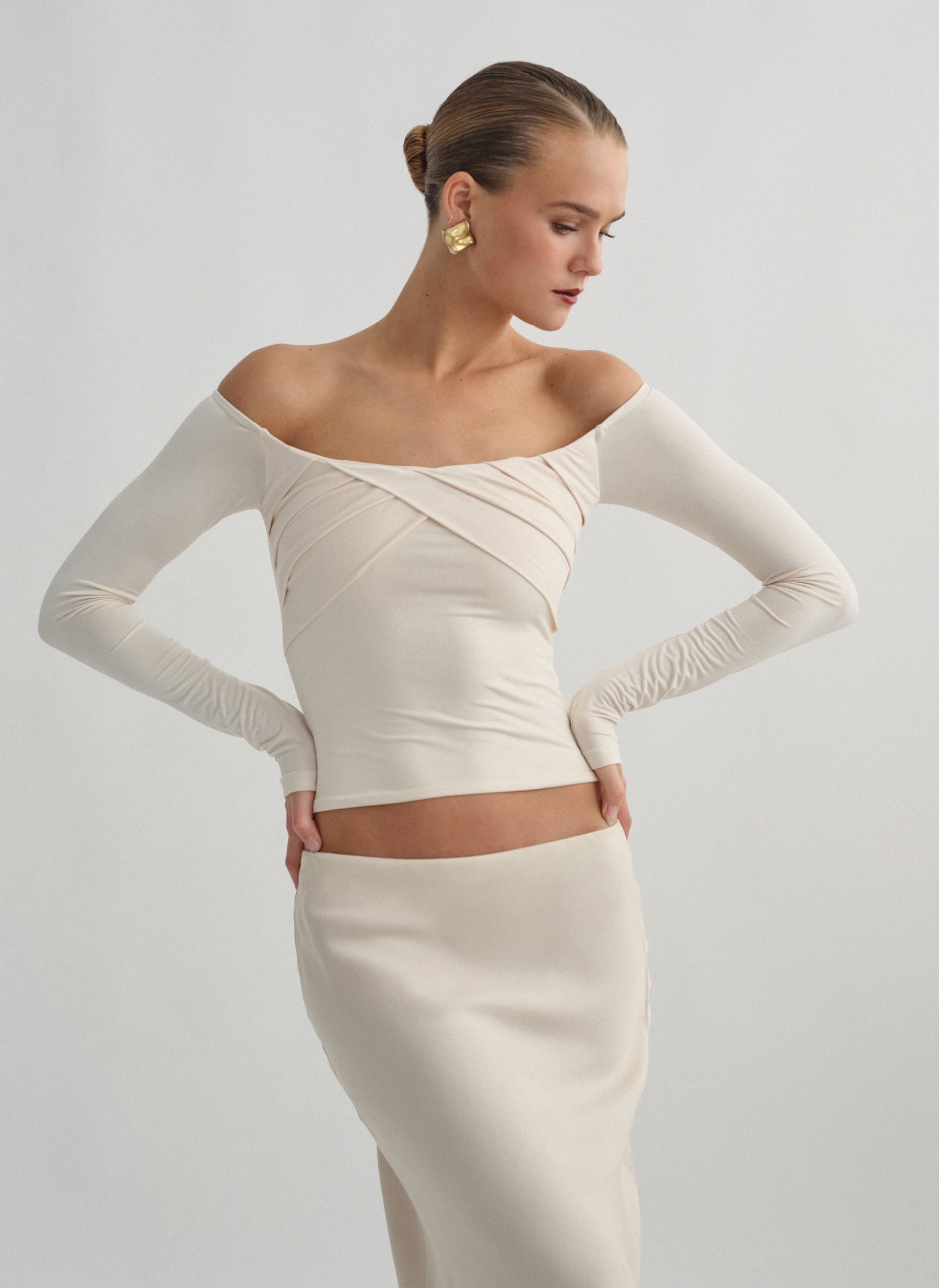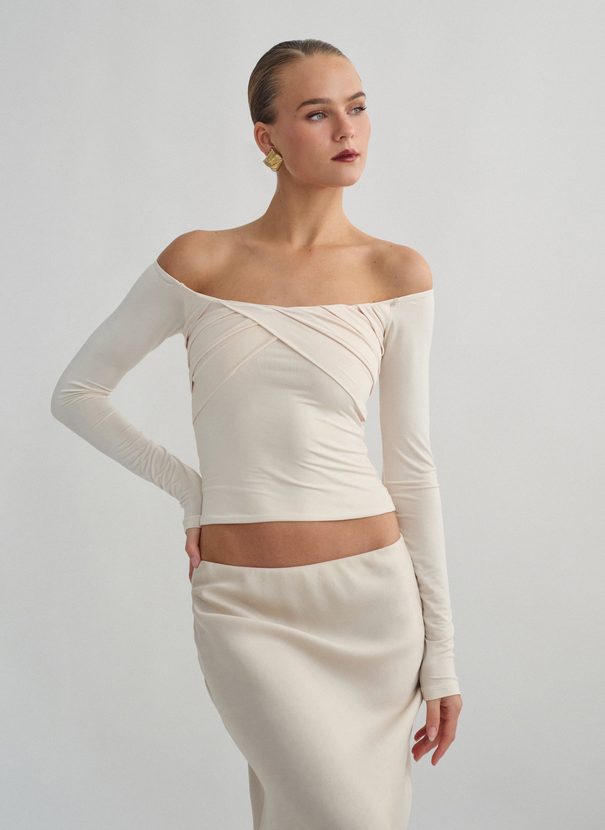 Ελαστική μακρυμάνικη μπλούζα με χιαστί λεπτομέρεια στο στήθος και διπλό ύφασμα που δε διαγράφει.