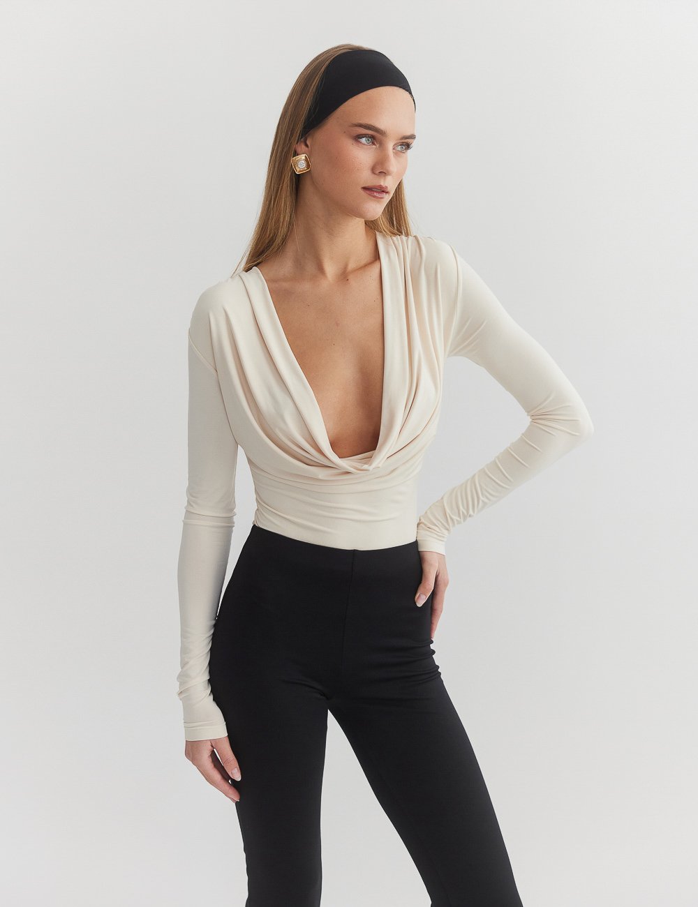 Ελαστικό μακρυμάνικο κορμάκι με ντραπέ λαιμόκοψη.