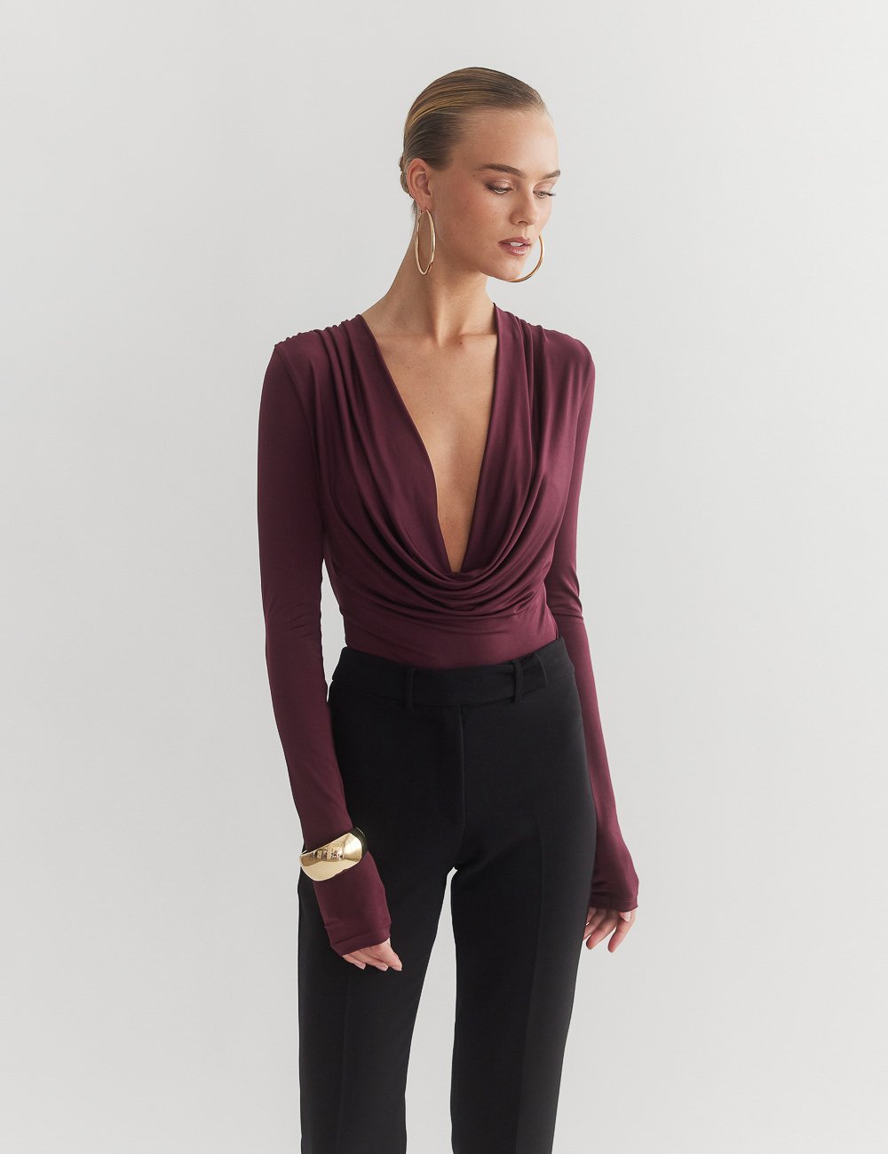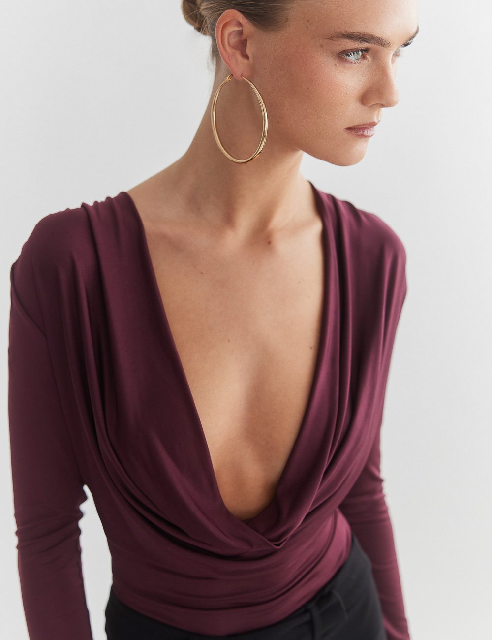 Ελαστικό εφαρμοστό μακρυμάνικο κορμάκι με ντραπέ λαιμόκοψη.