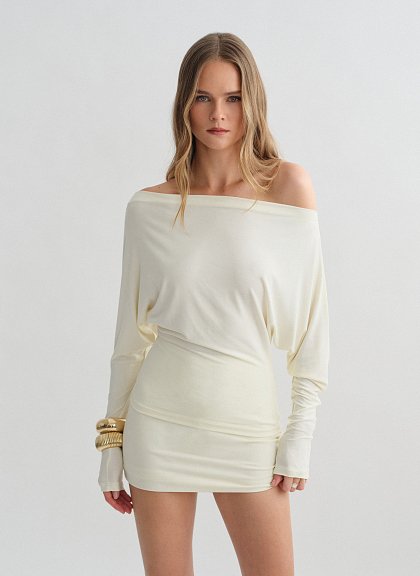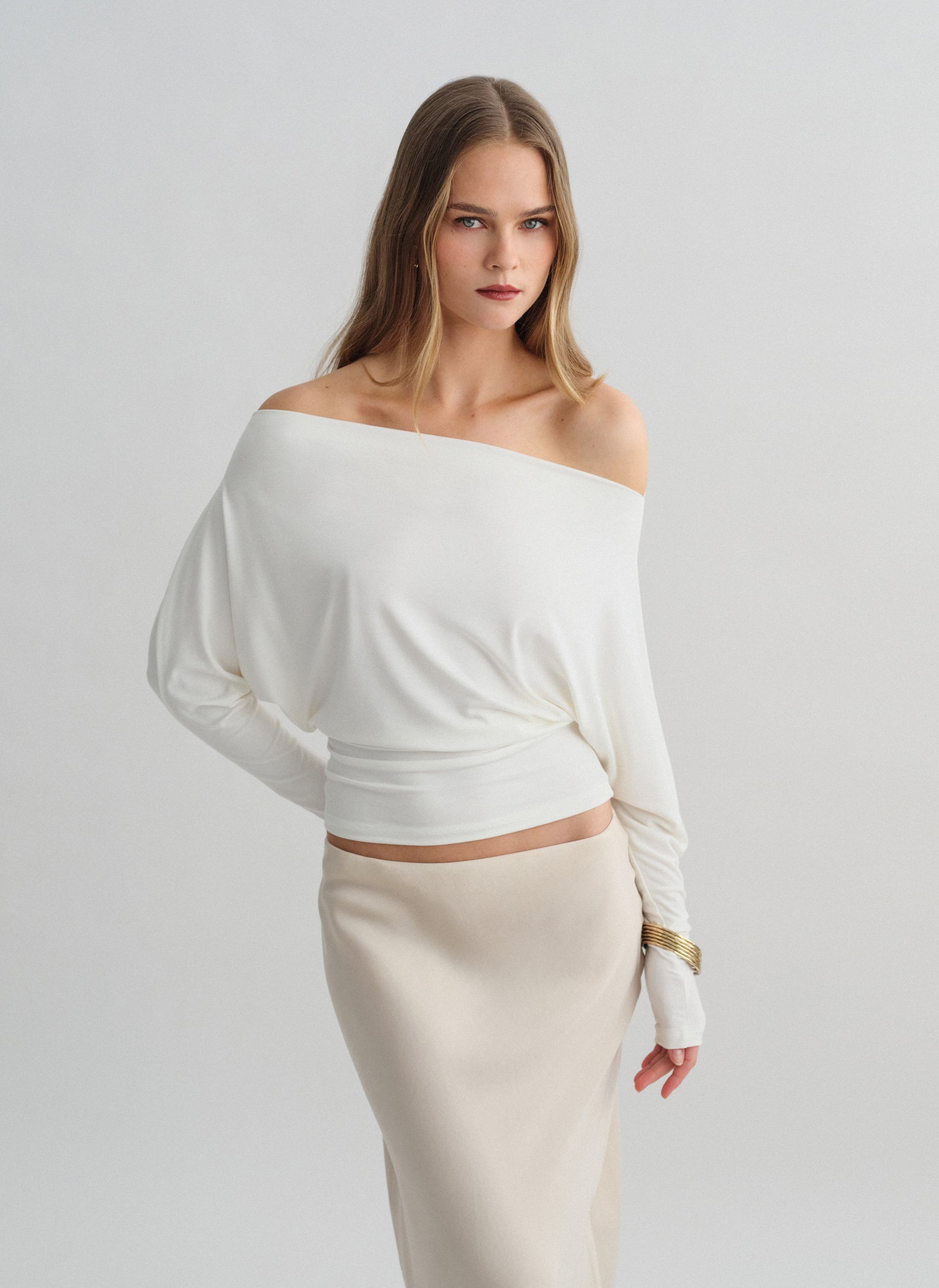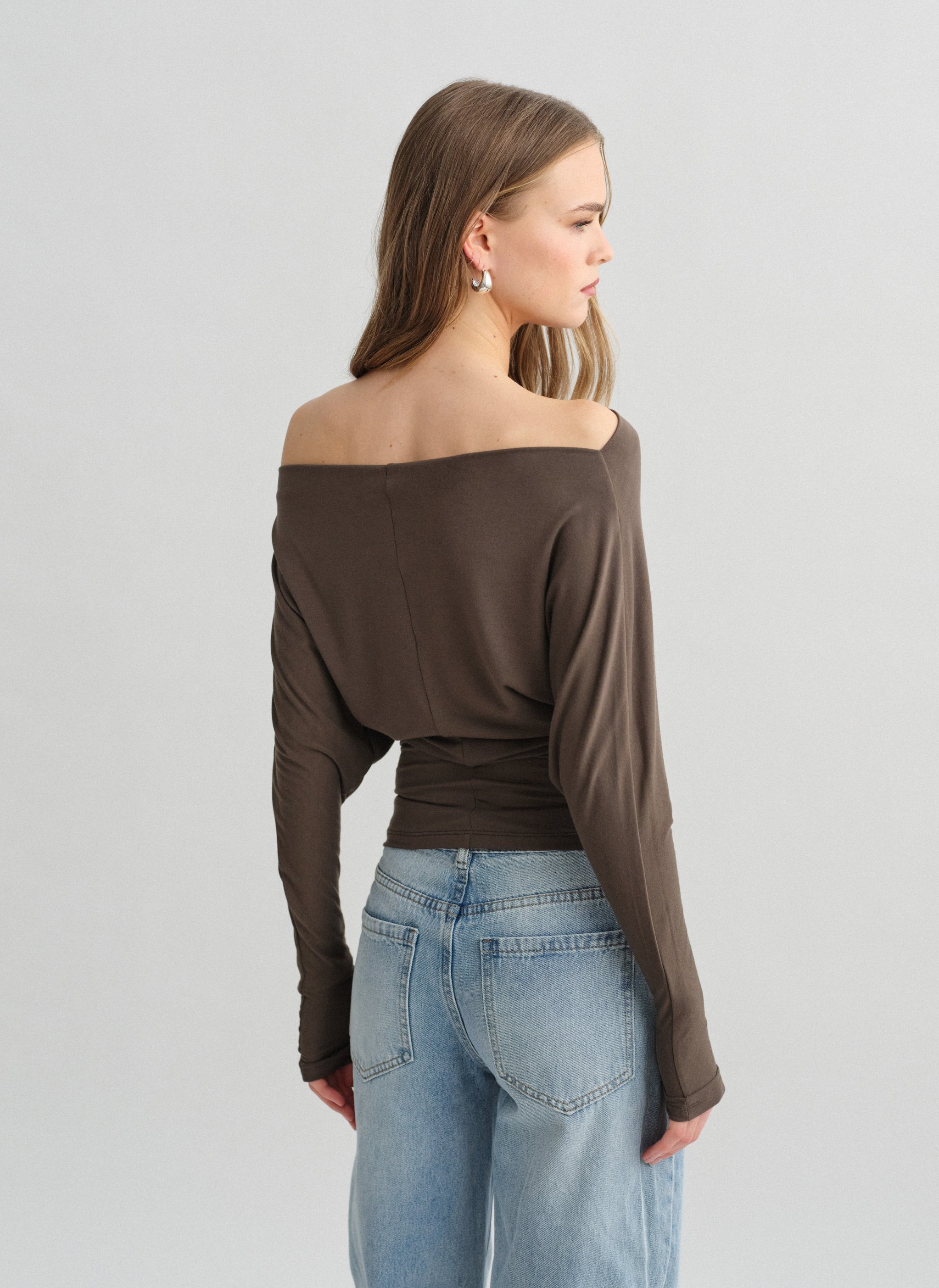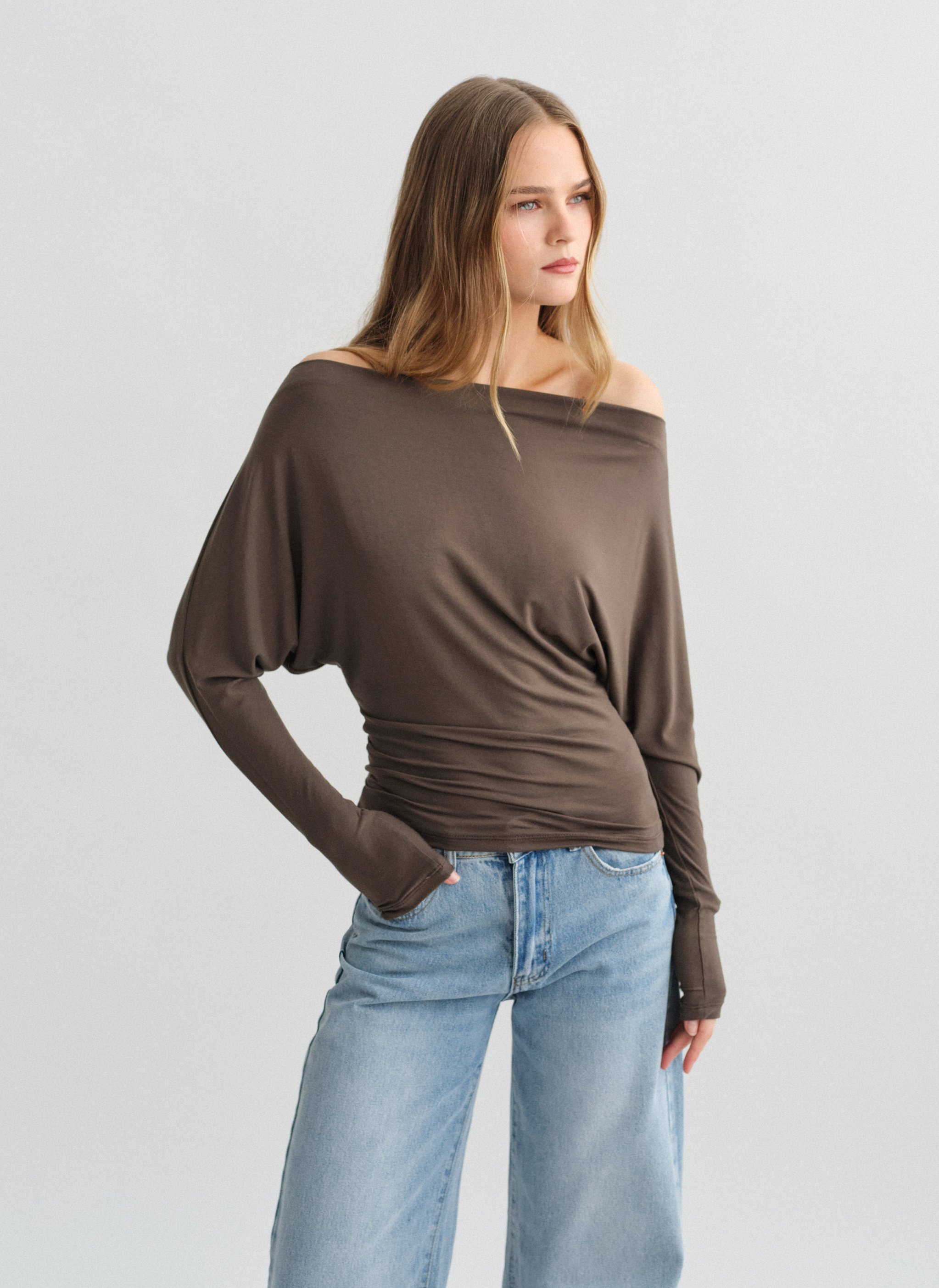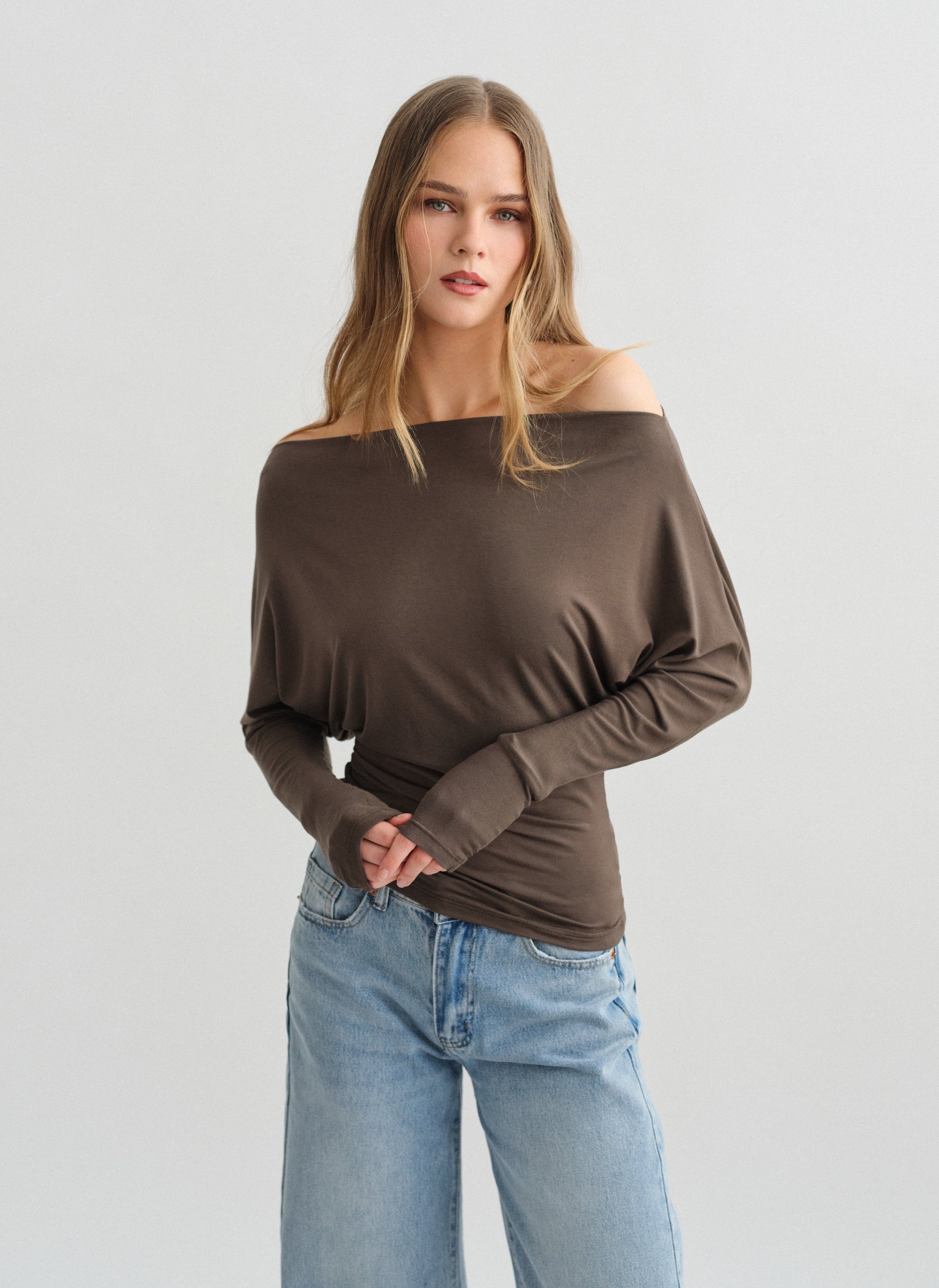 Ελαστική μακρυμάνικη μεσάτη off-shoulder μπλούζα bamboo.