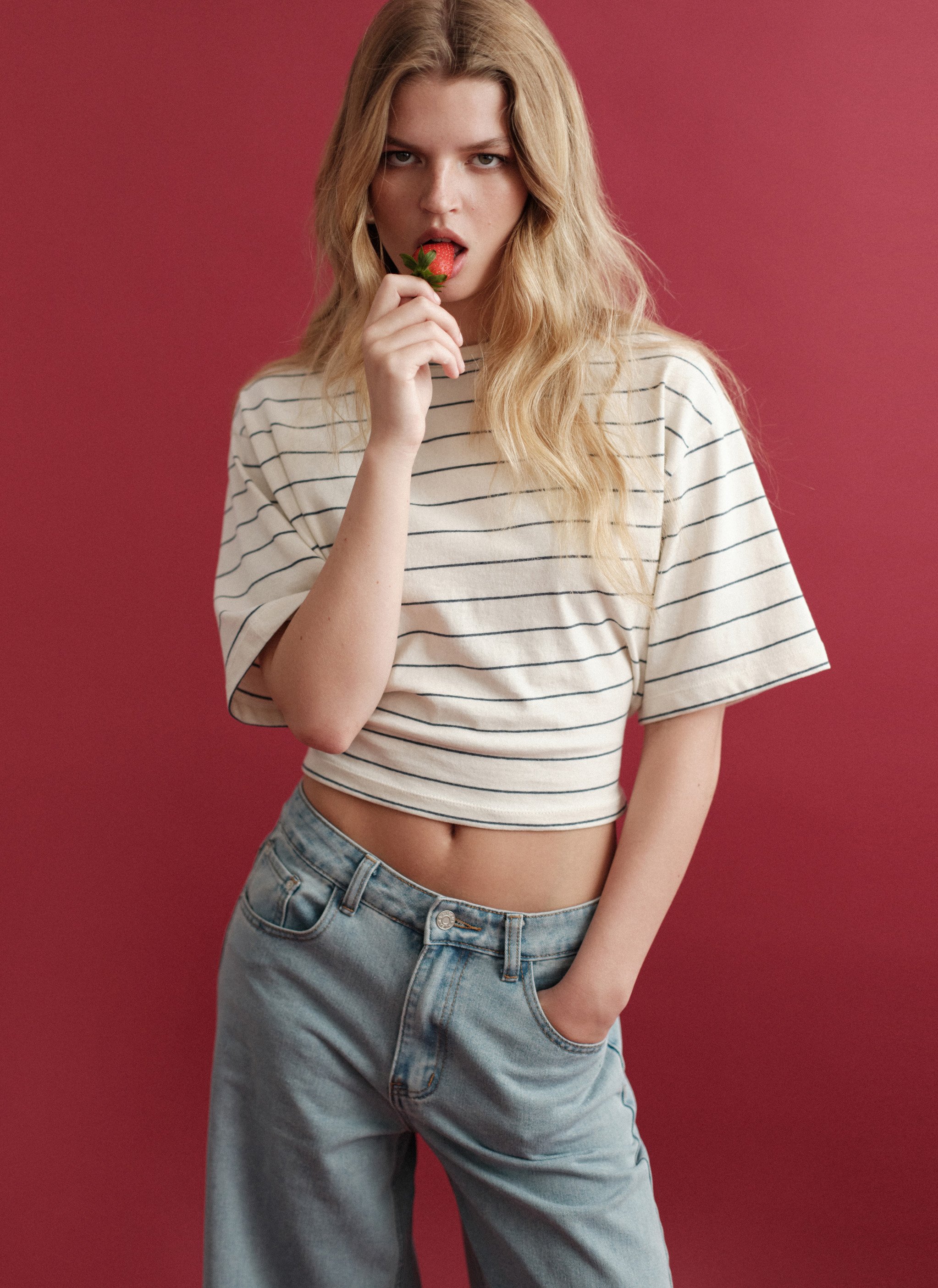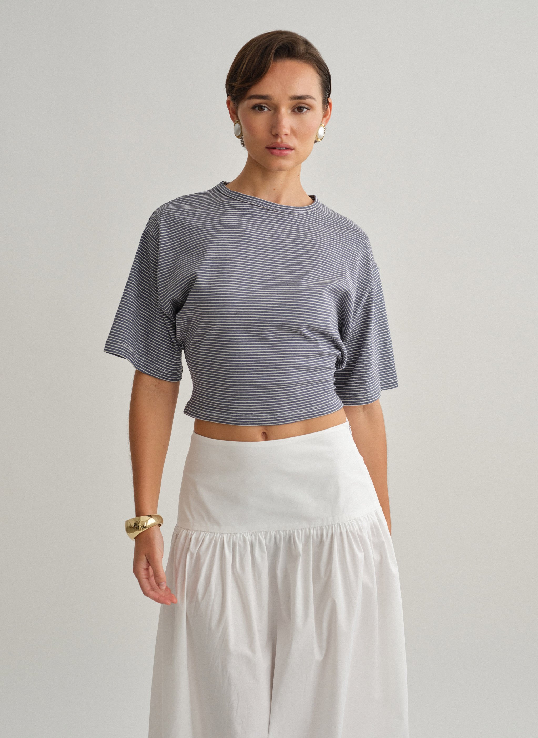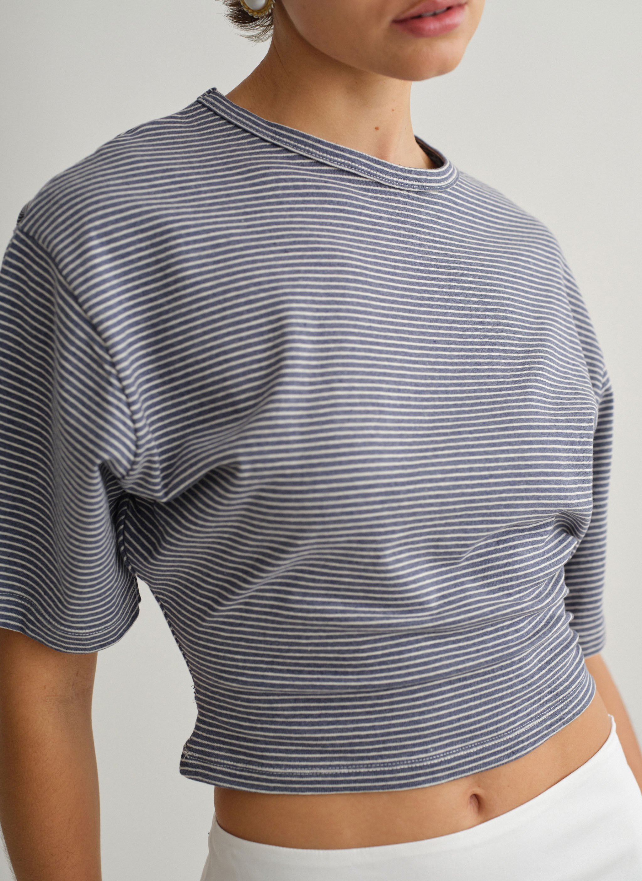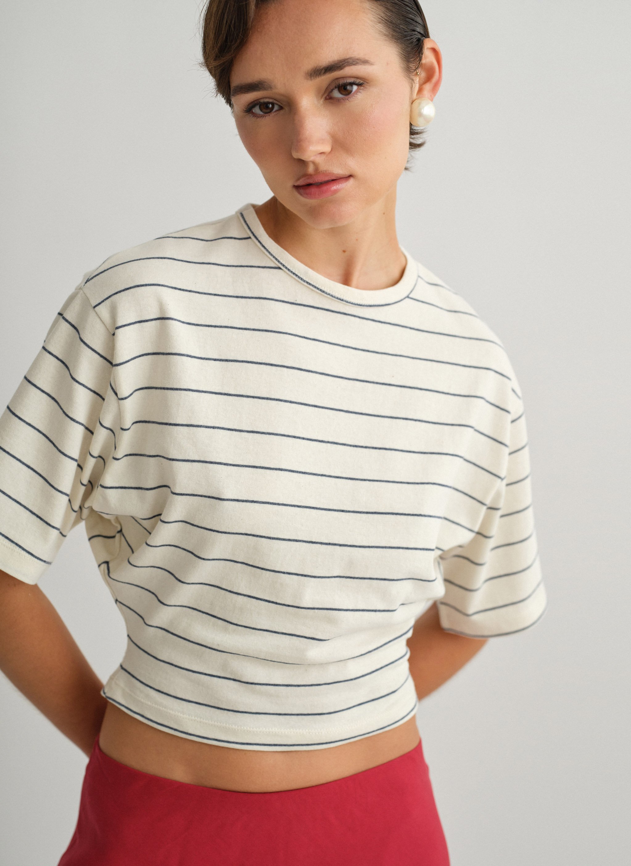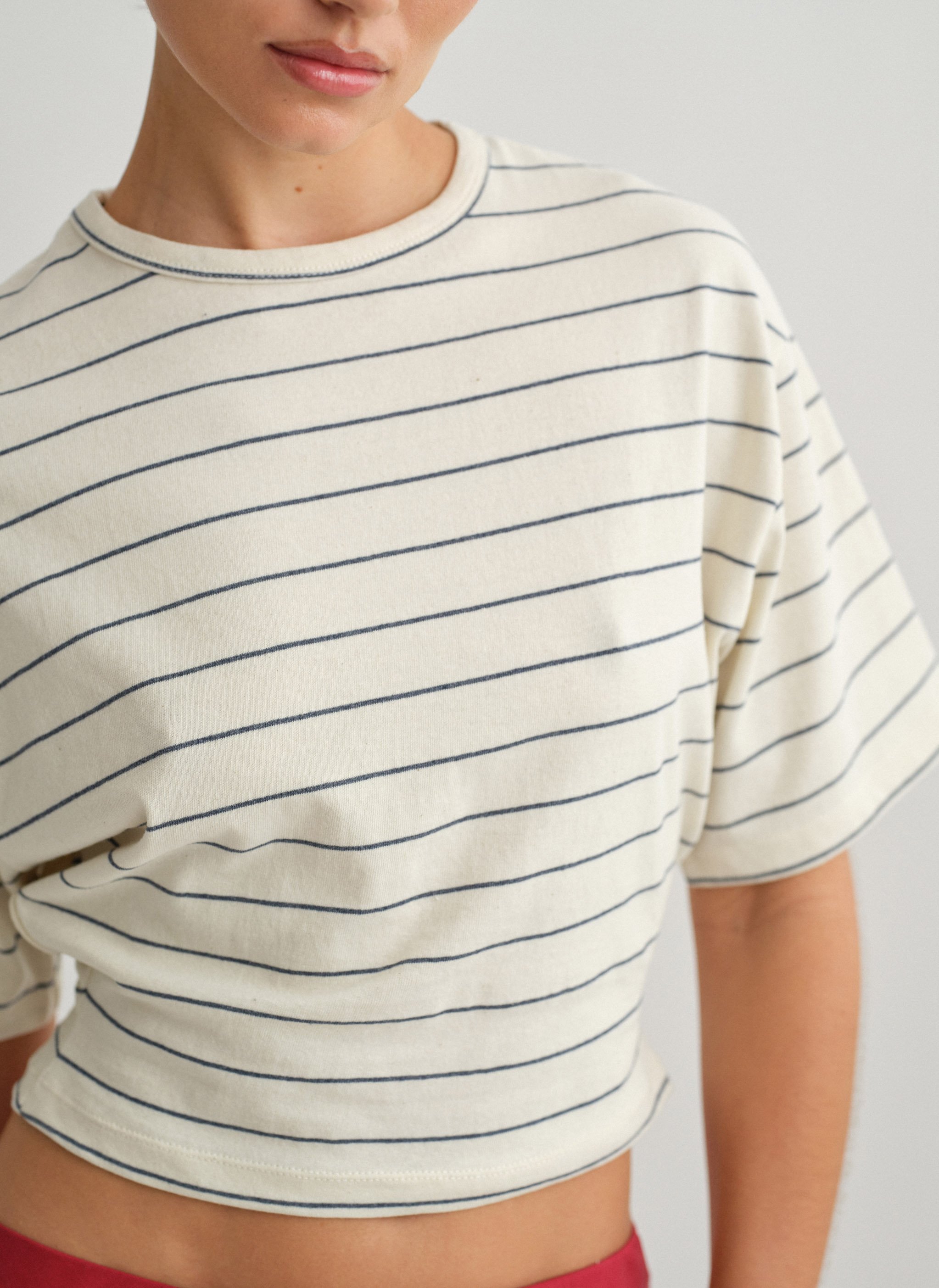 Ελαστική βαμβακερή μεσάτη κοντομάνικη ριγέ μπλούζα με στρογγυλή λαιμόκοψη.