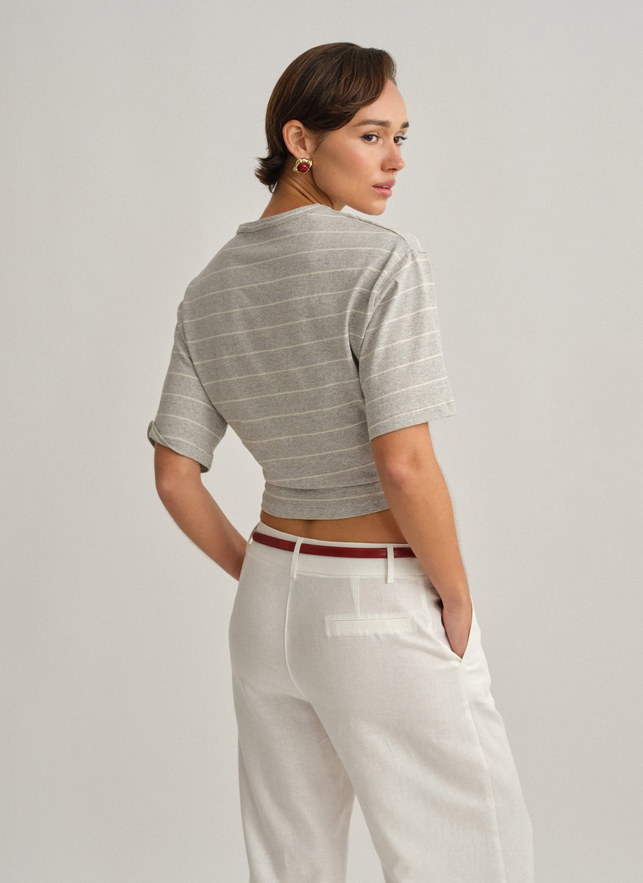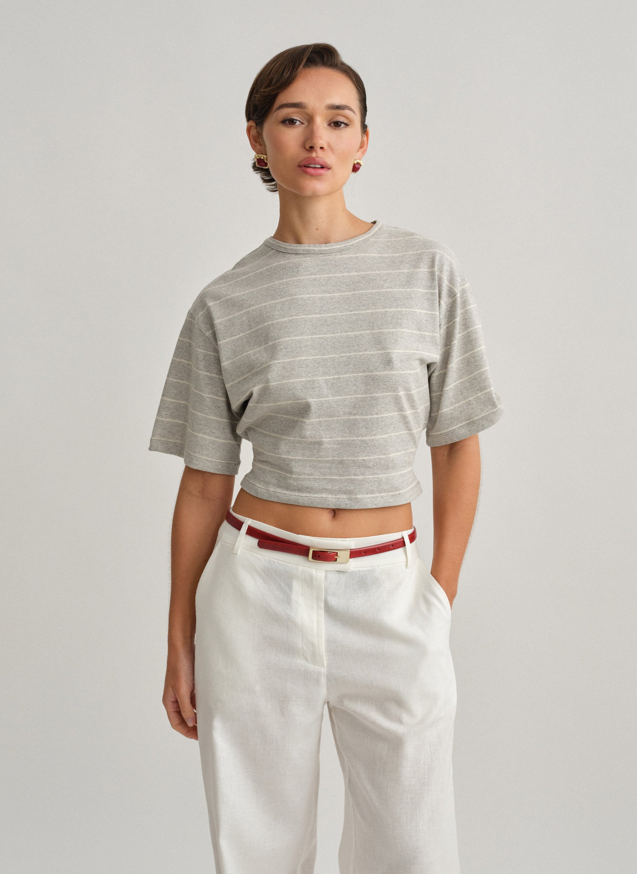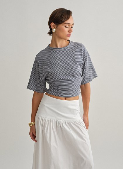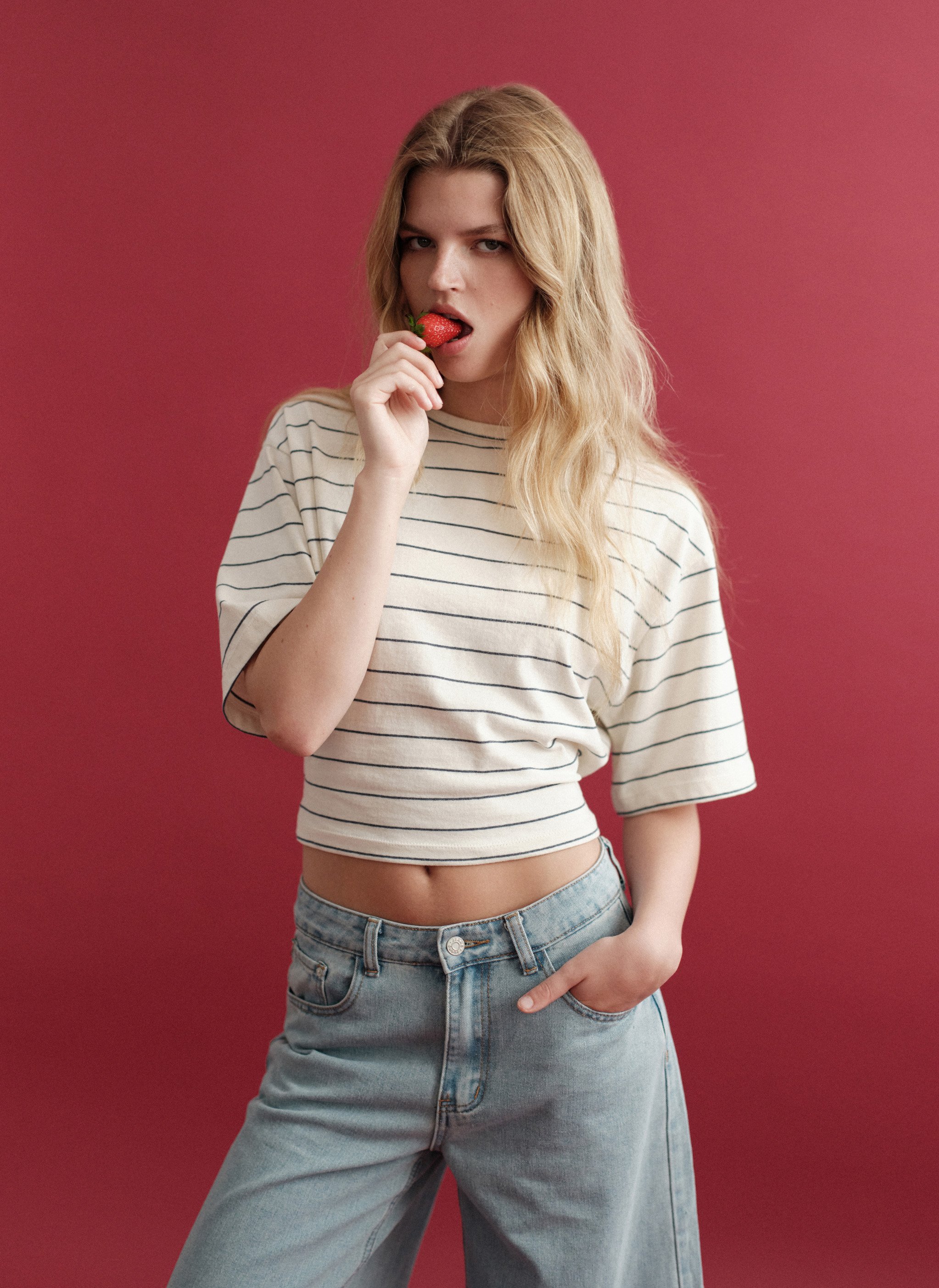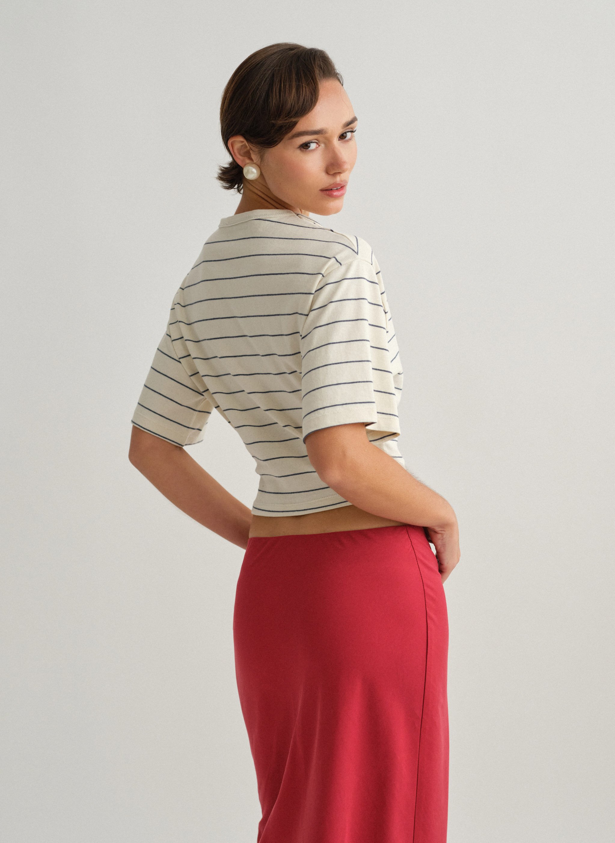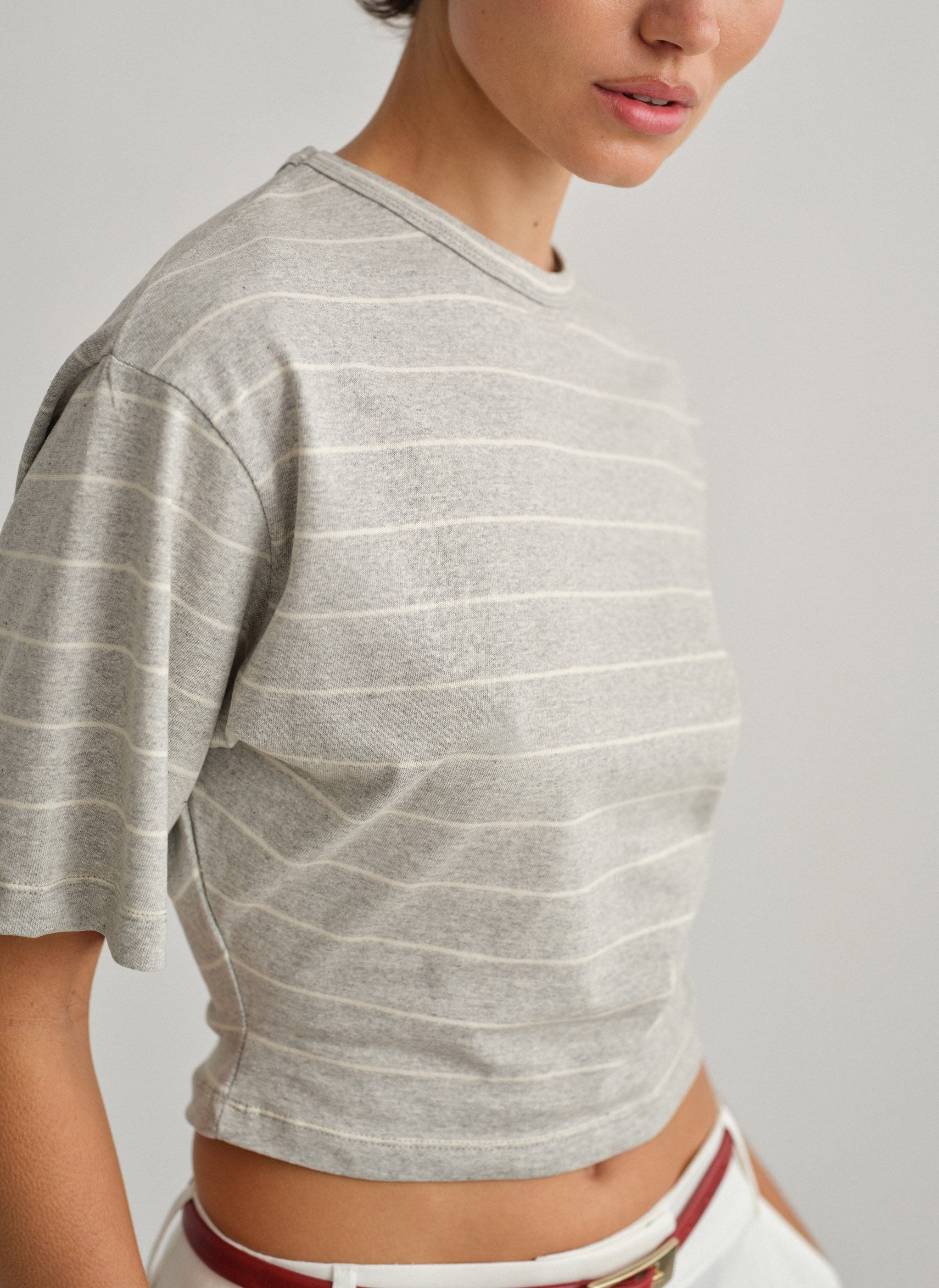 Ελαστική βαμβακερή μεσάτη κοντομάνικη ριγέ μπλούζα με στρογγυλή λαιμόκοψη.