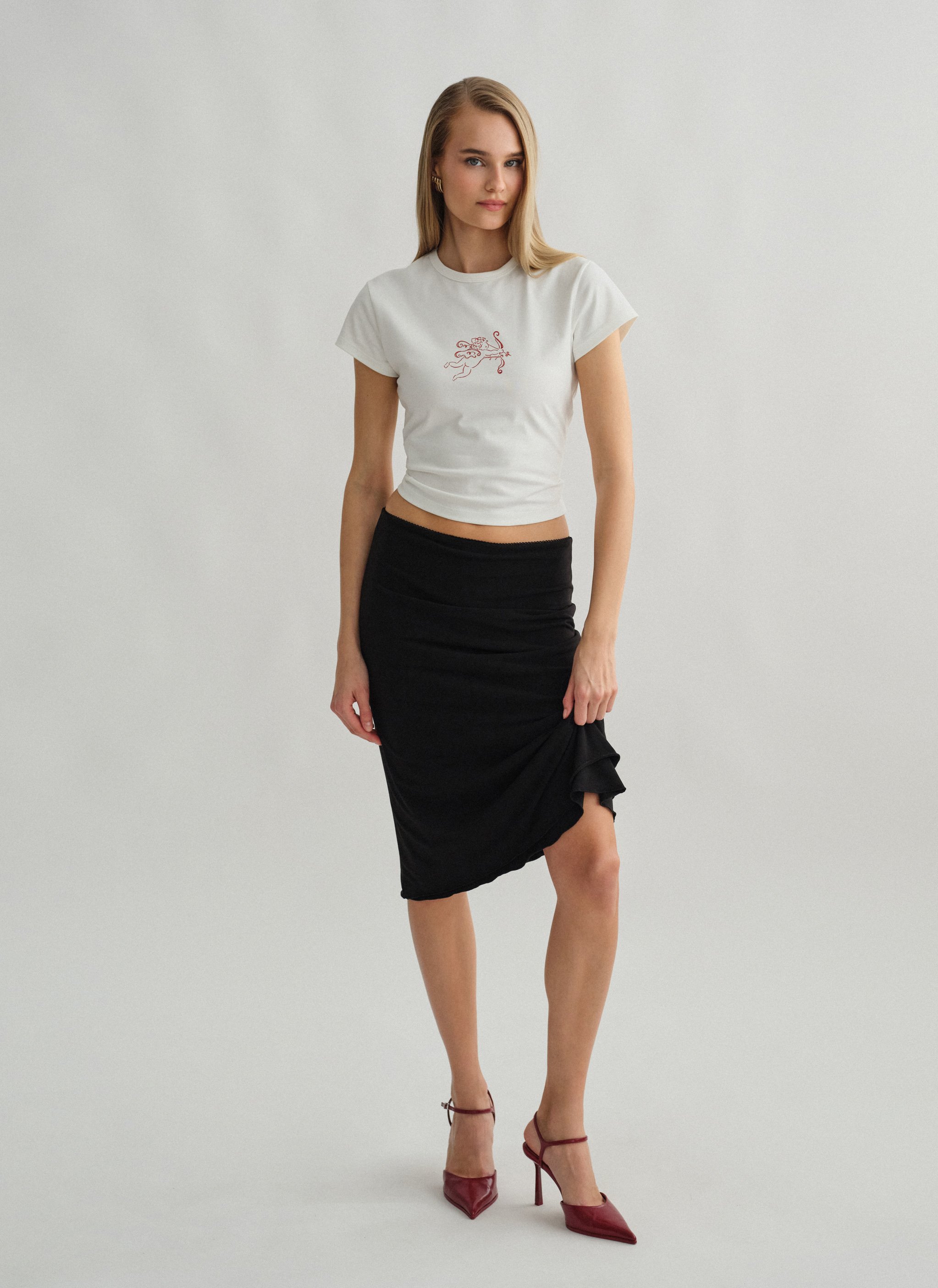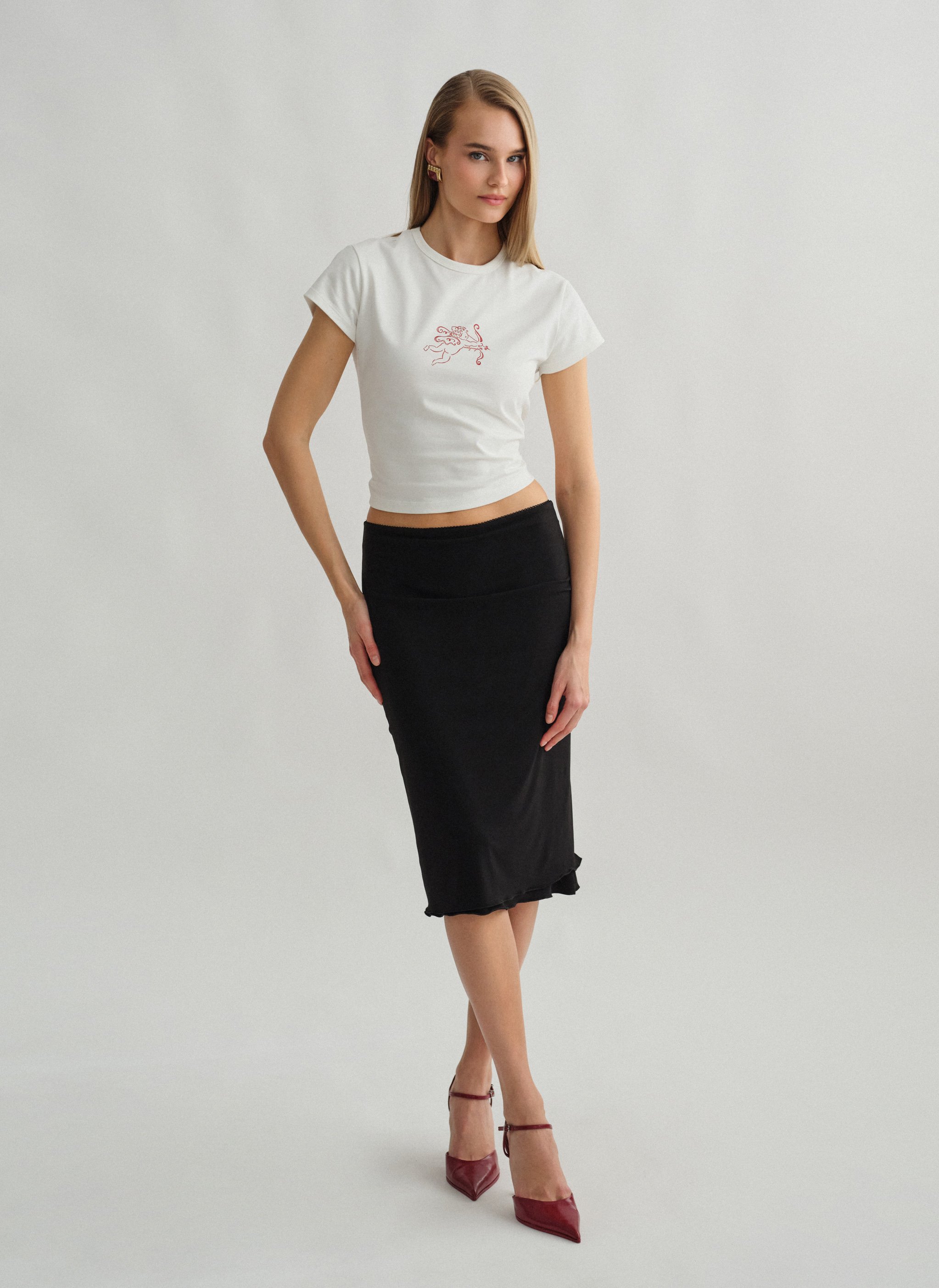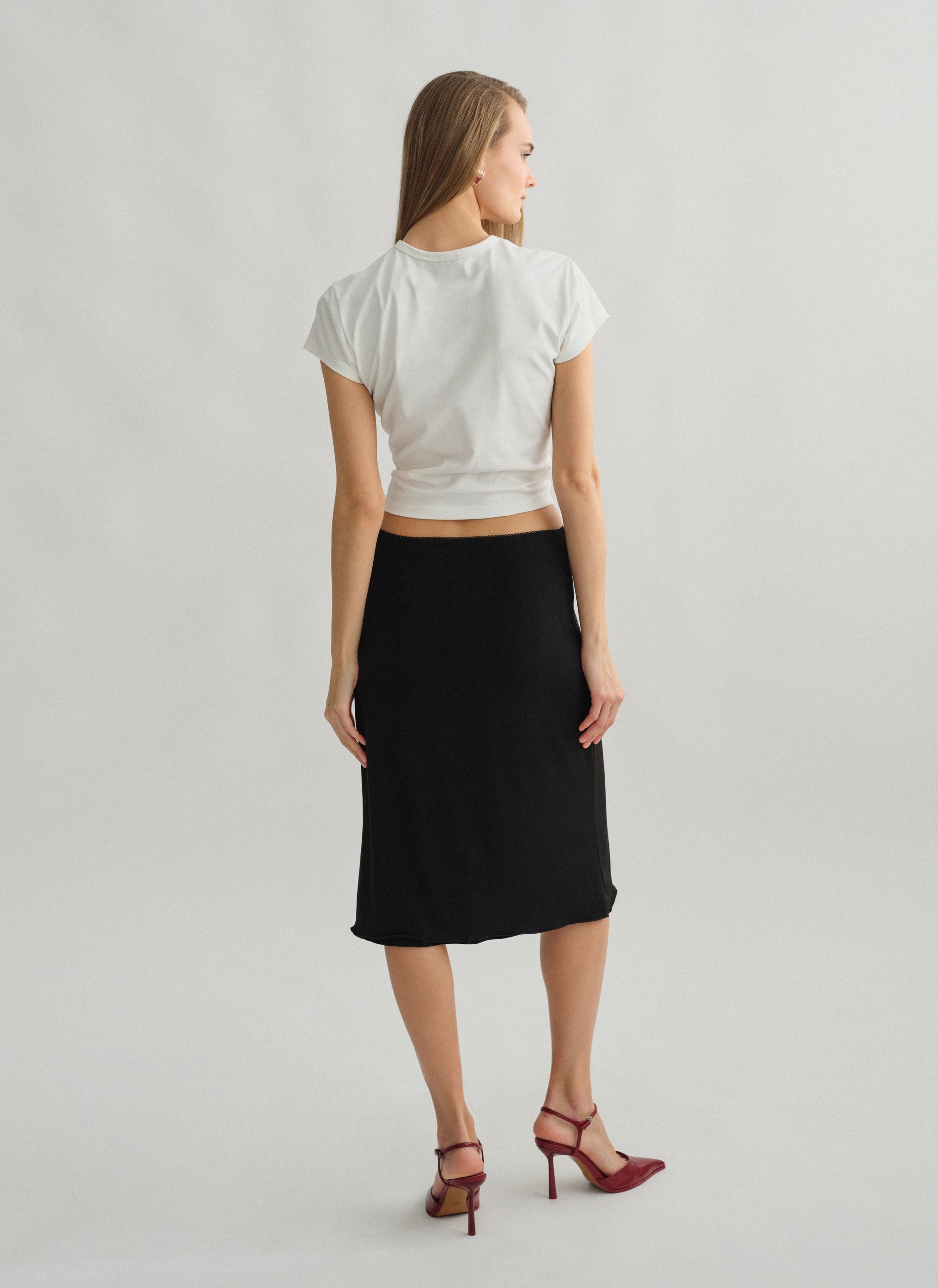 Ελαστική midi φούστα με λεπτομέρεια σε χρωματική αντίθεση και εσωτερικό λάστιχο στη μέση.