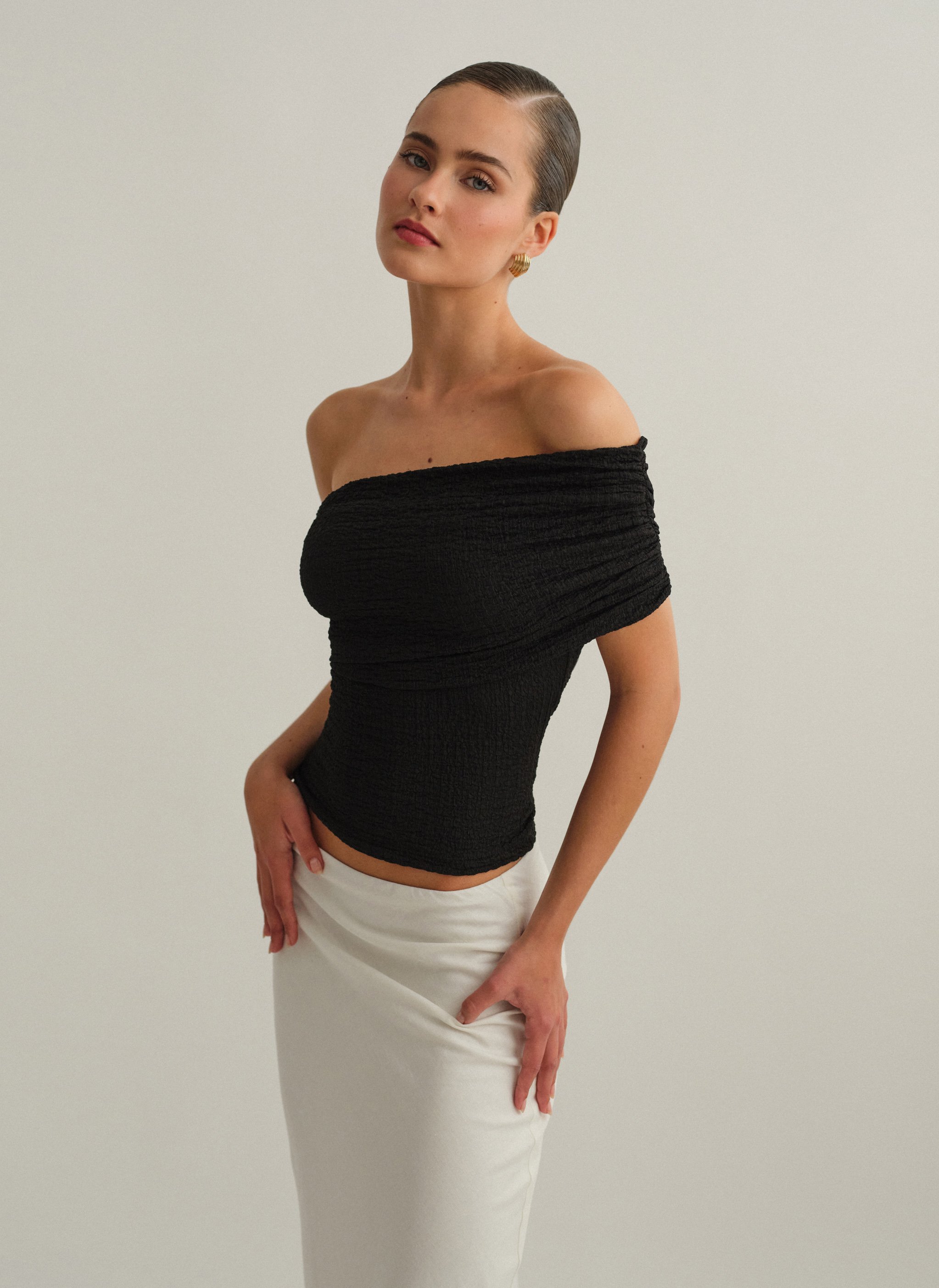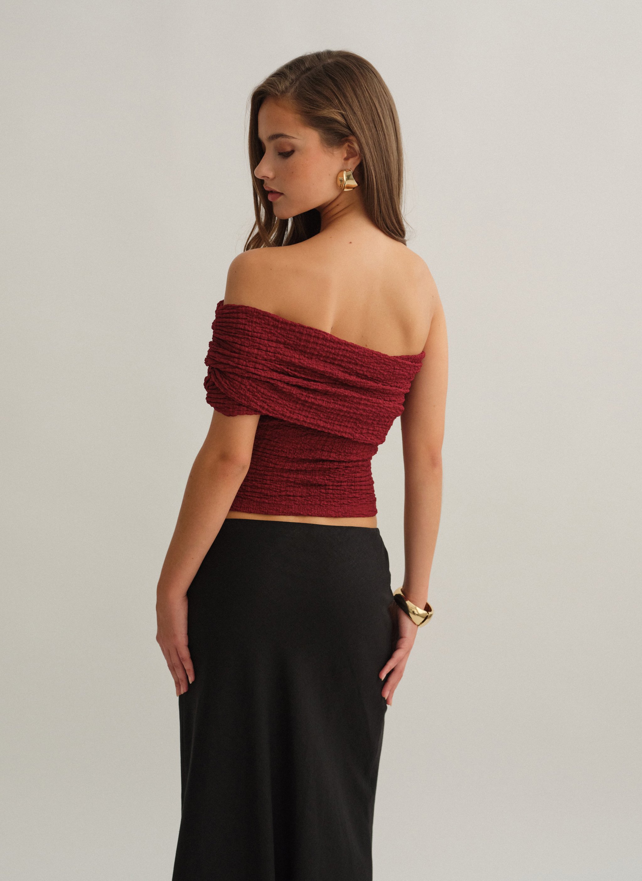 Ελαστική off-shoulder μπλούζα σε ανάγλυφη υφή με ασύμμετρη γυριστή λαιμόκοψη με σούρες.