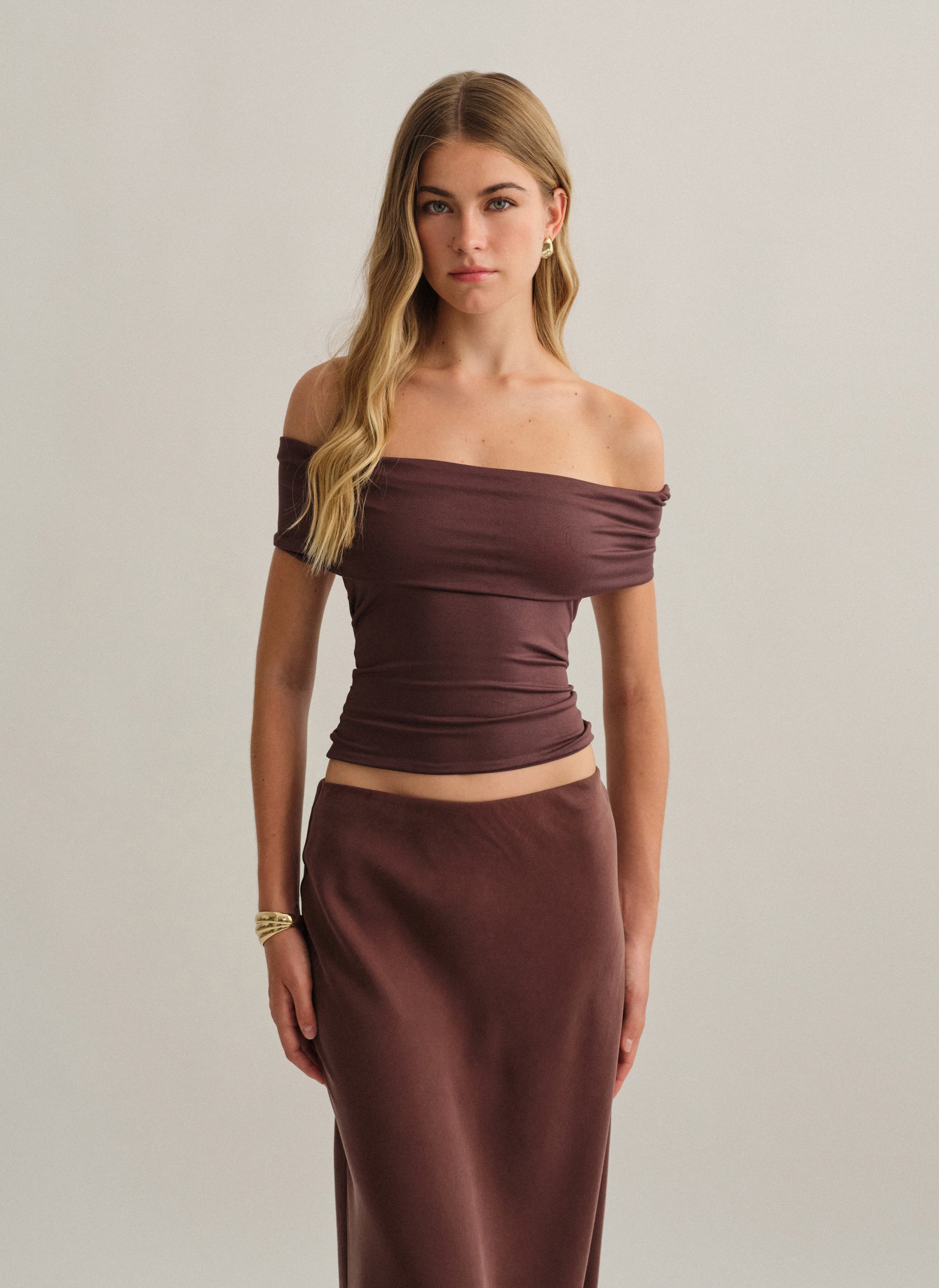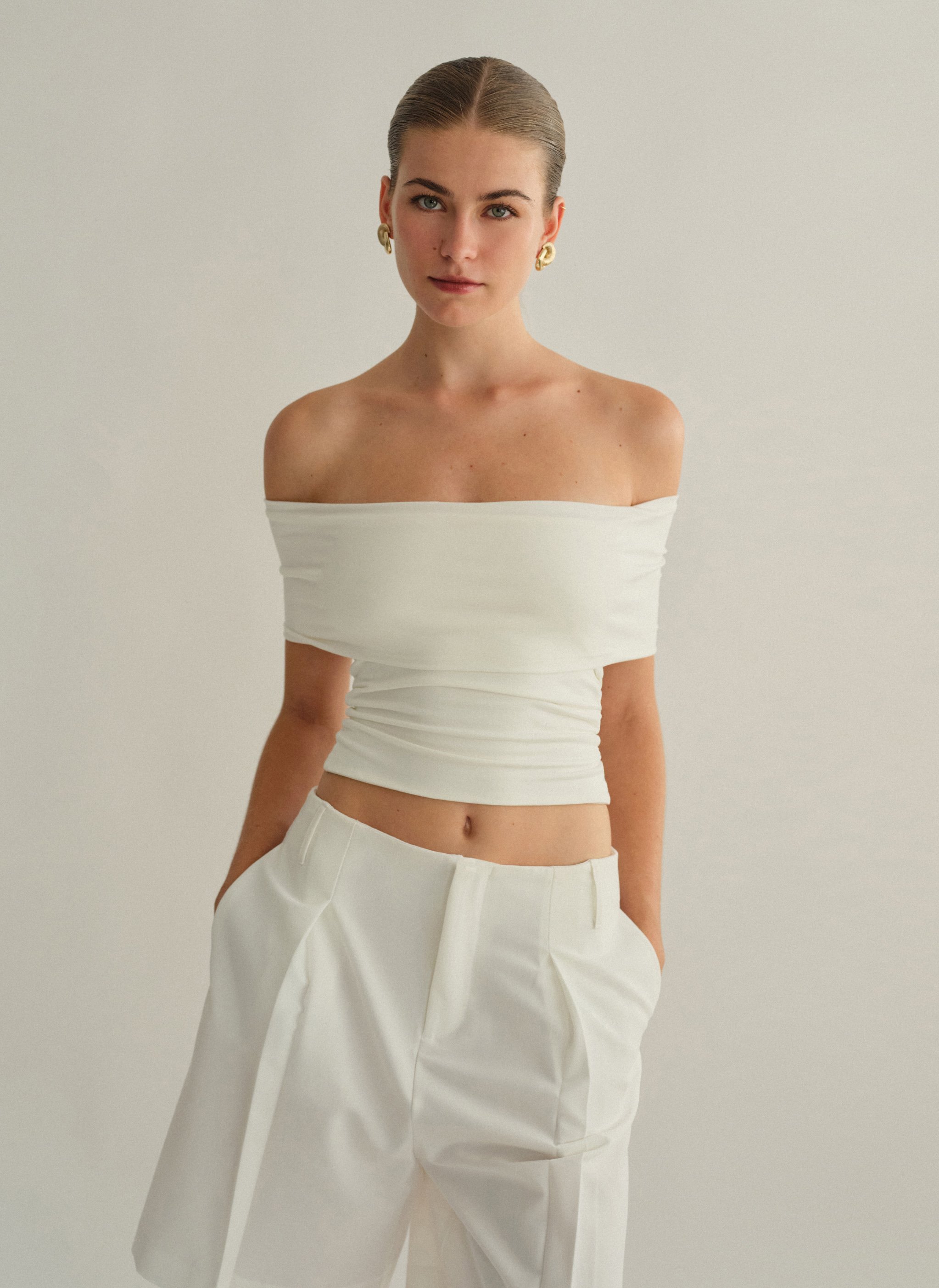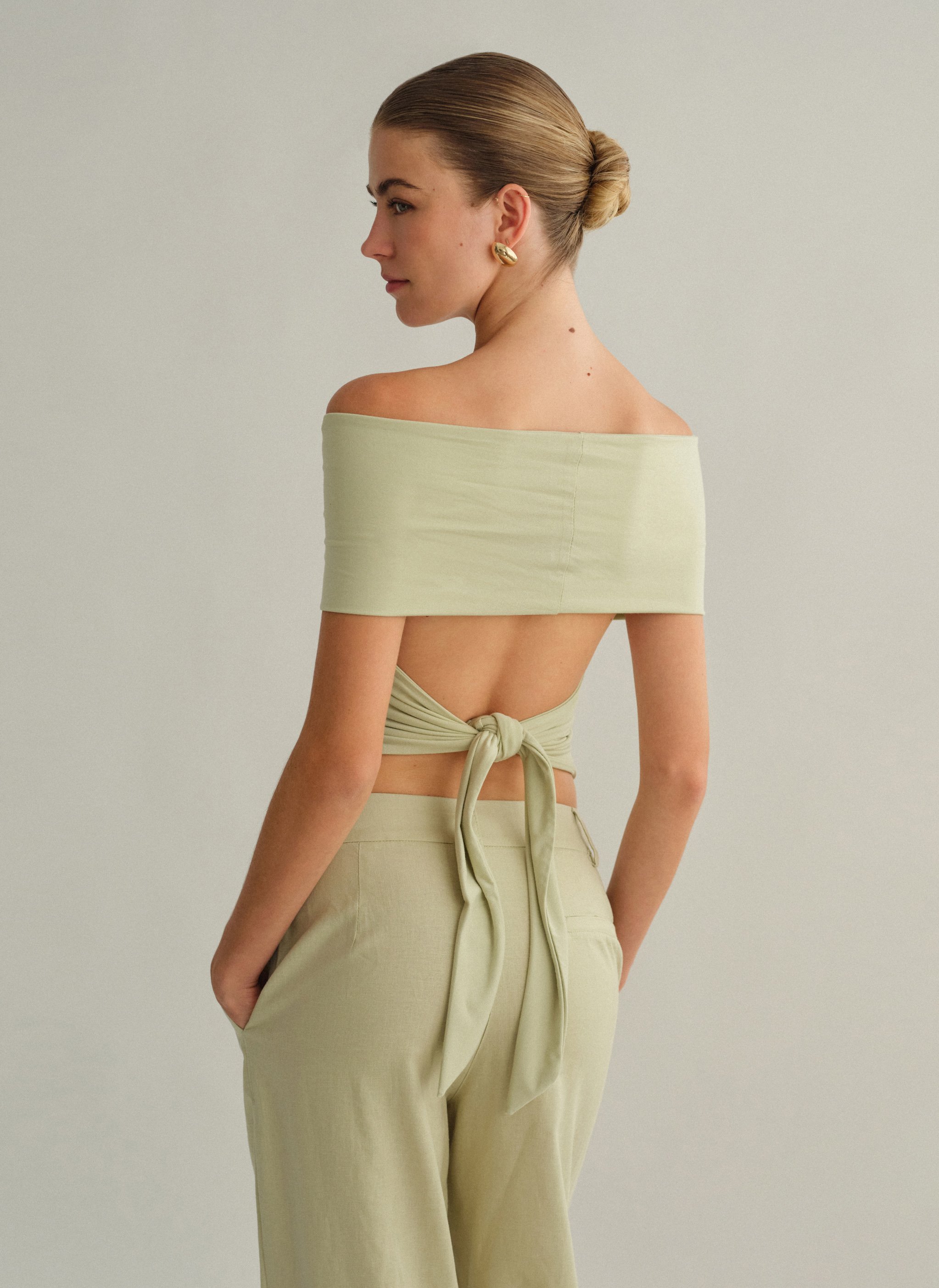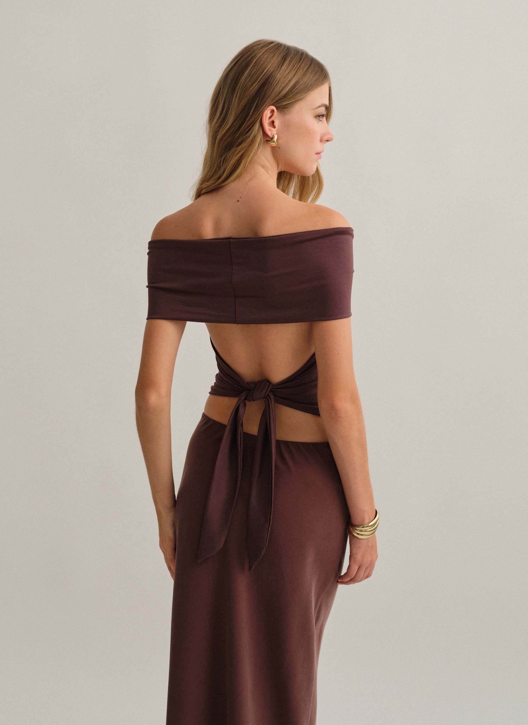 Ελαστικό off-shoulder τοπ bamboo με γυριστή λαιμόκοψη και δέσιμο στην πλάτη.