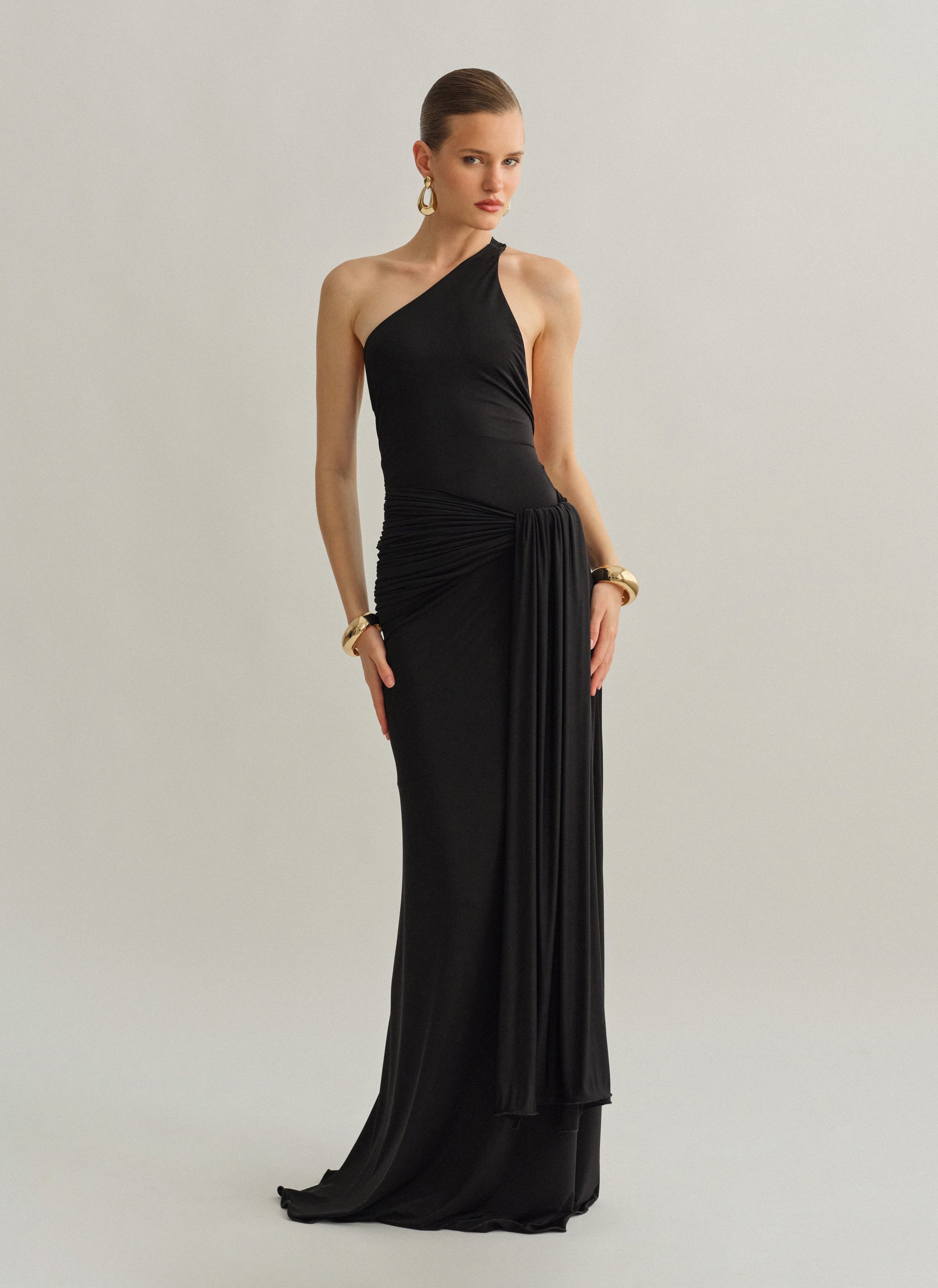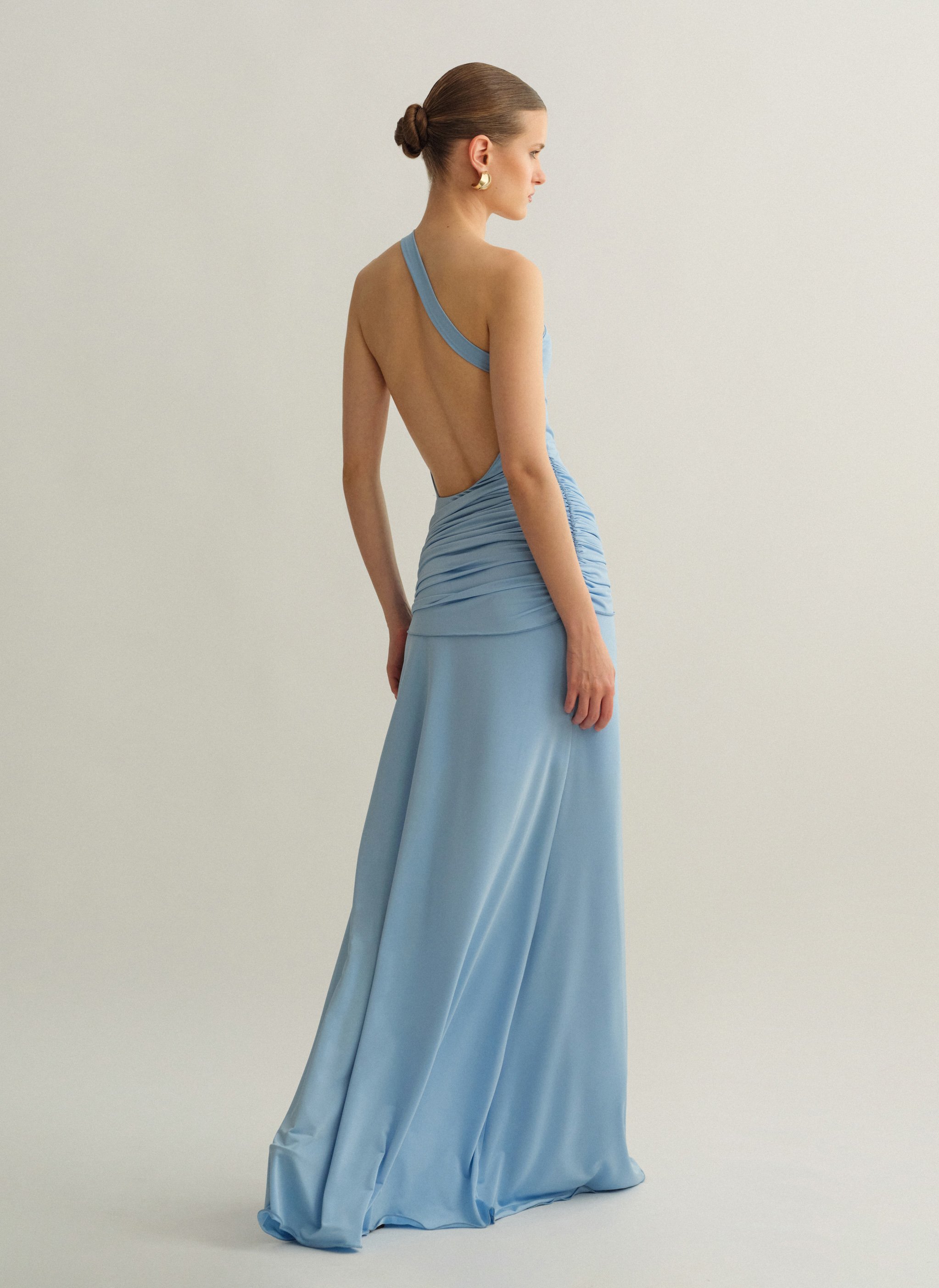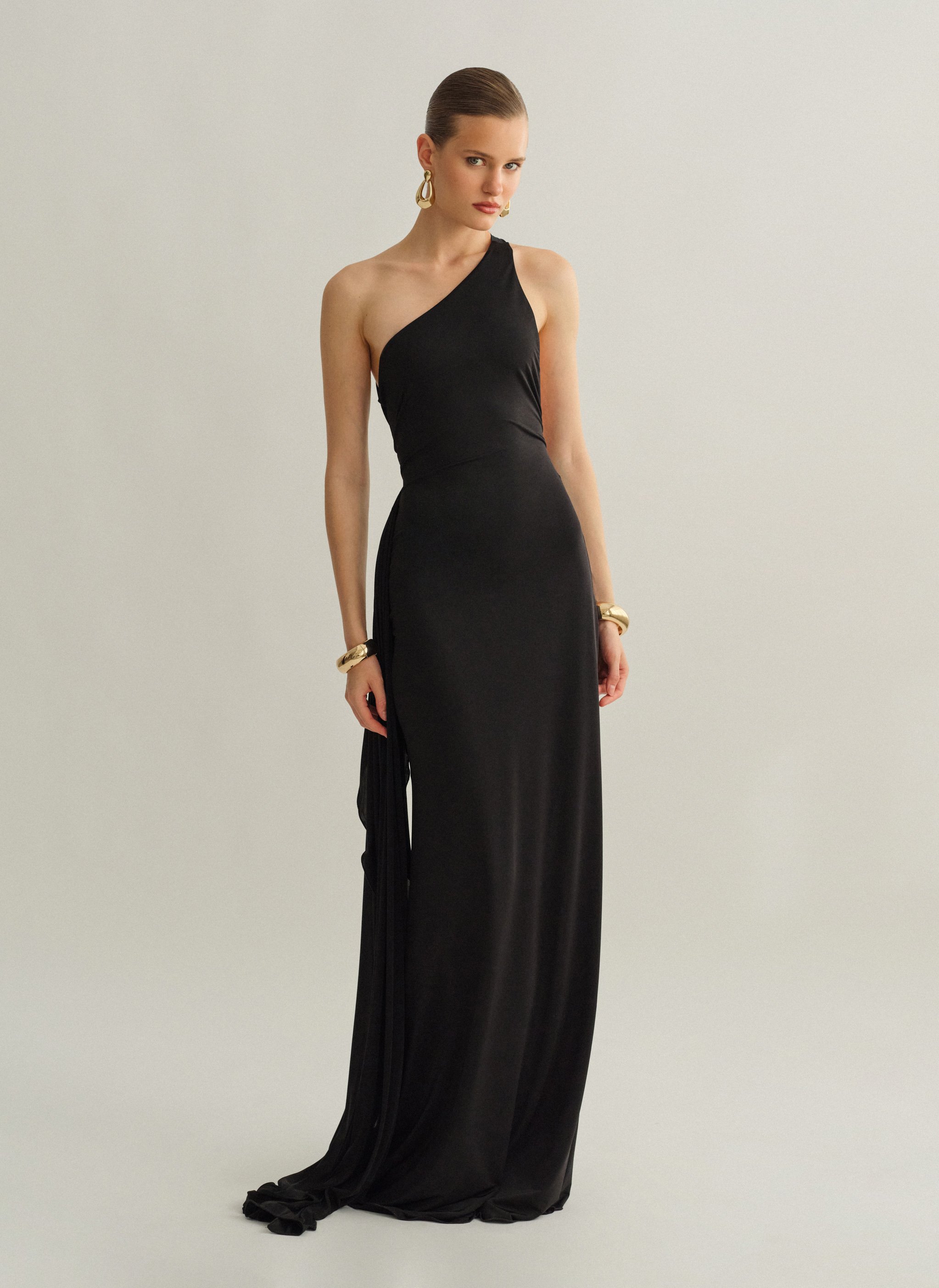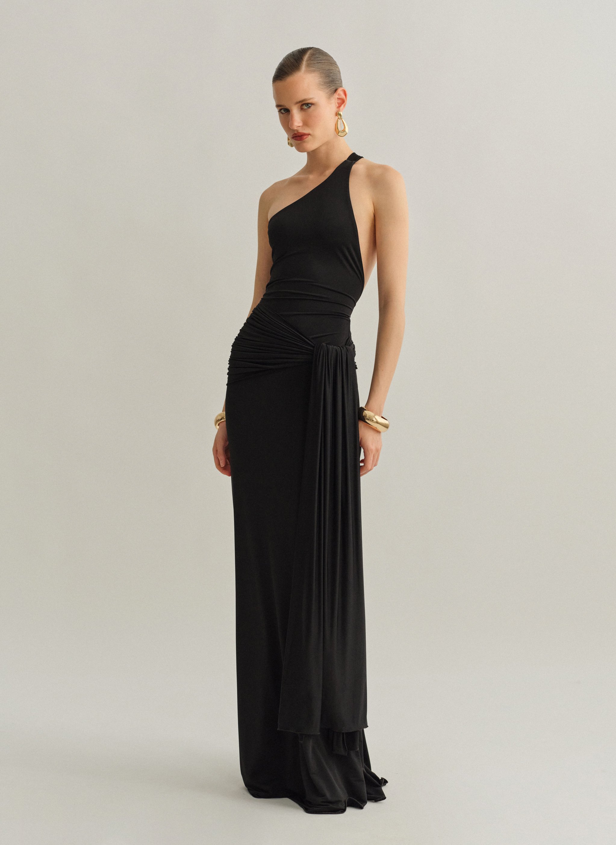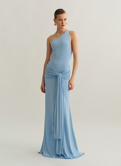 Ελαστικό one-shoulder μακρύ φόρεμα με ζώνη και ανοιχτή πλάτη.