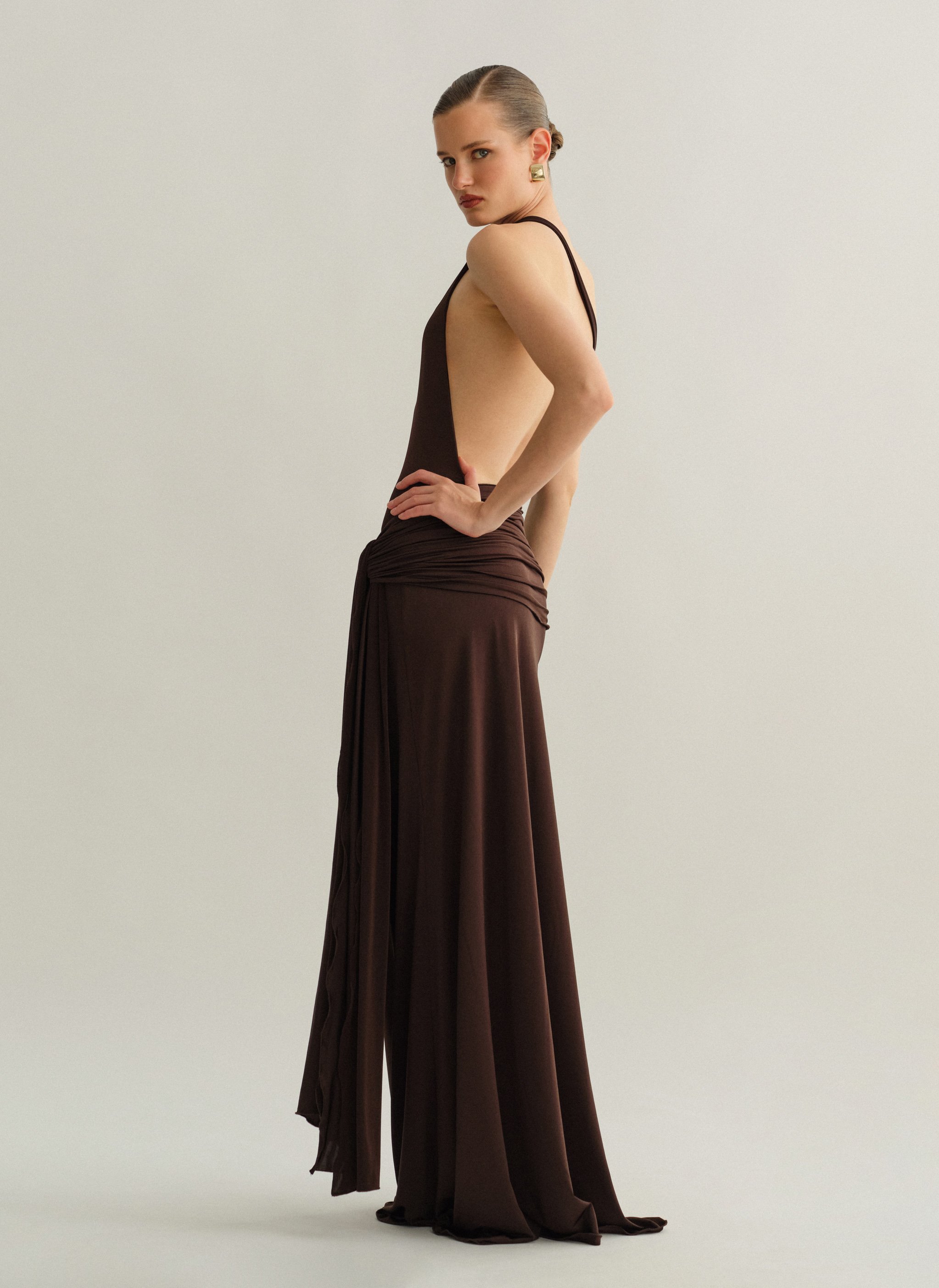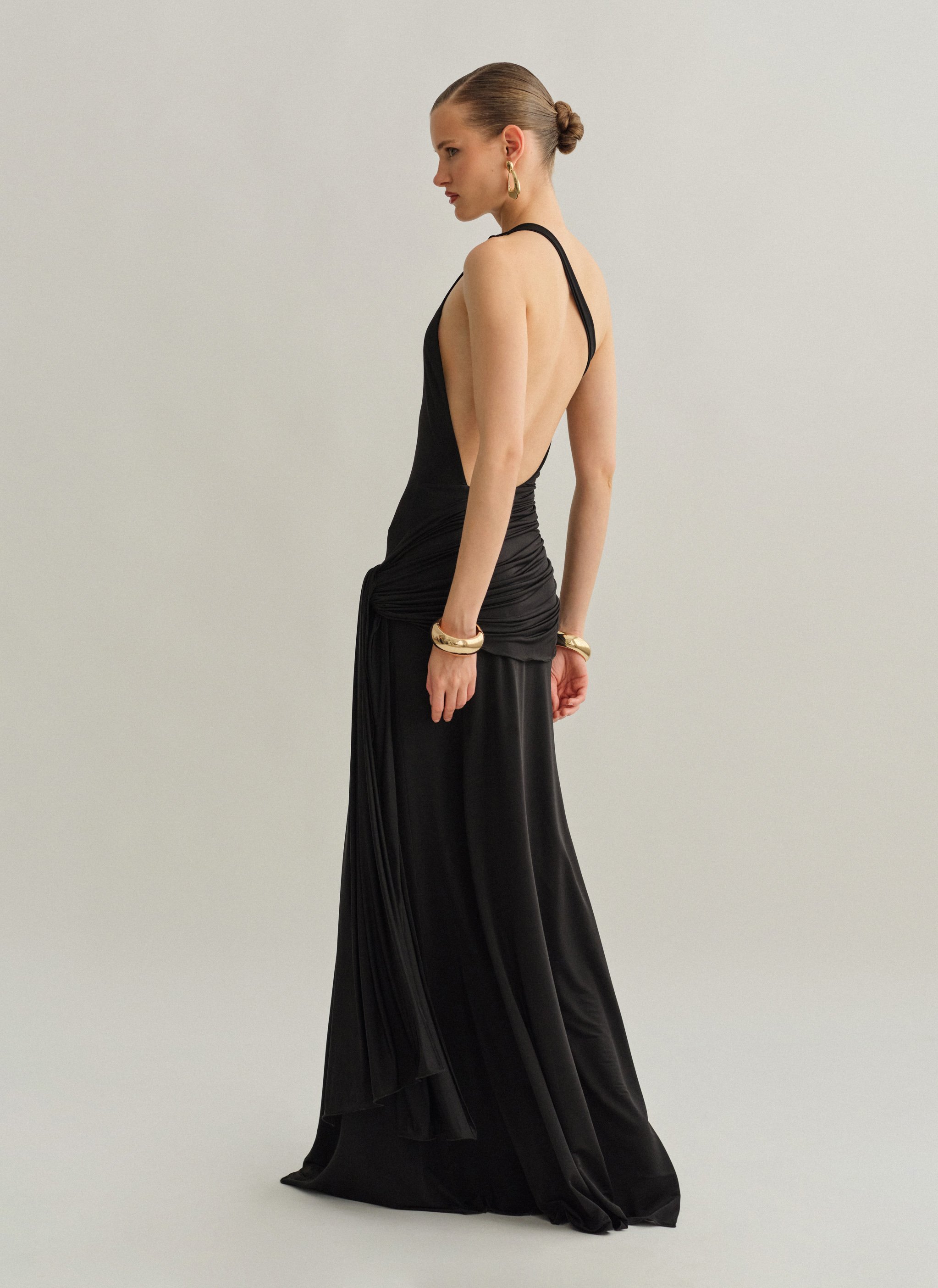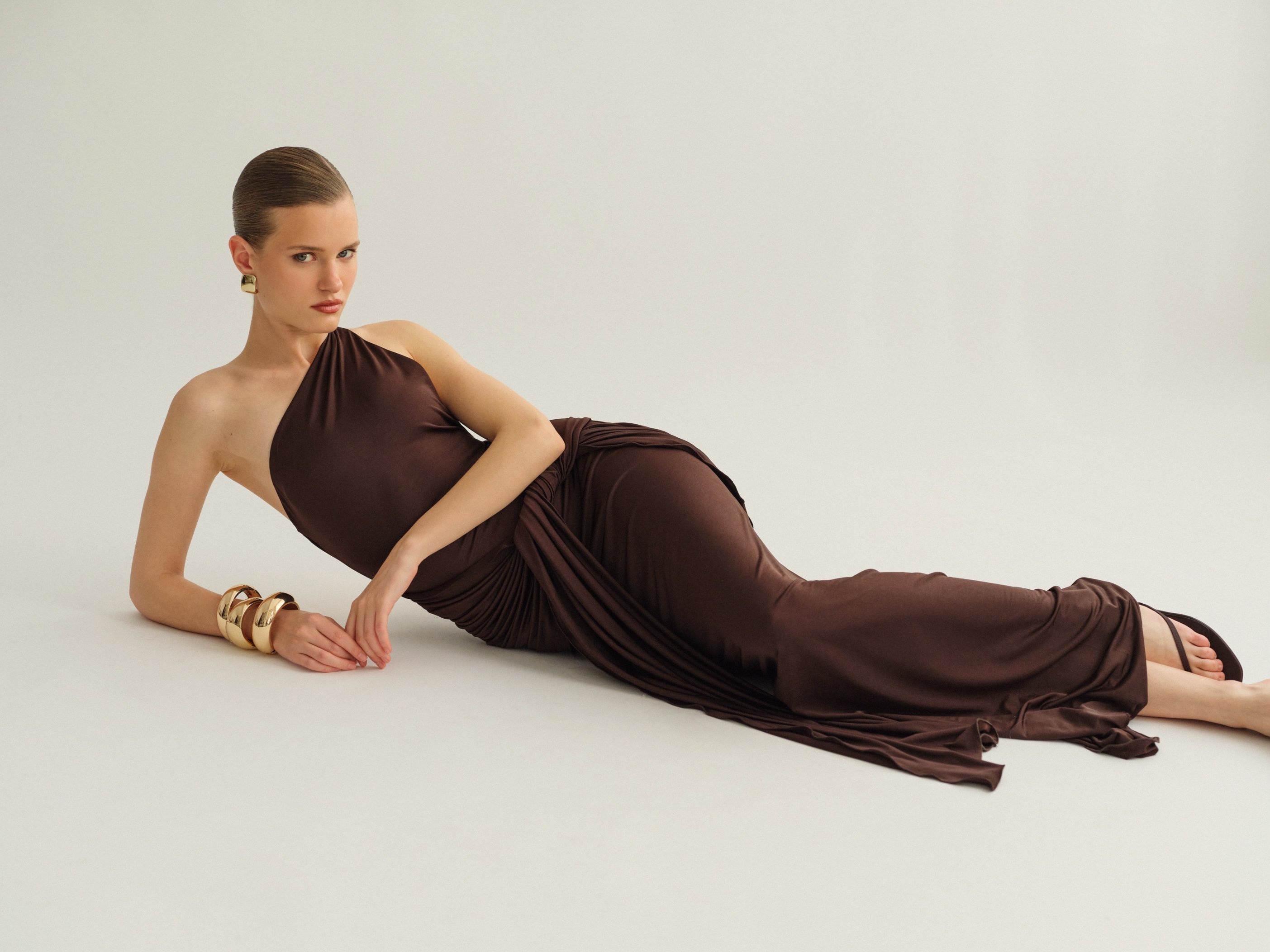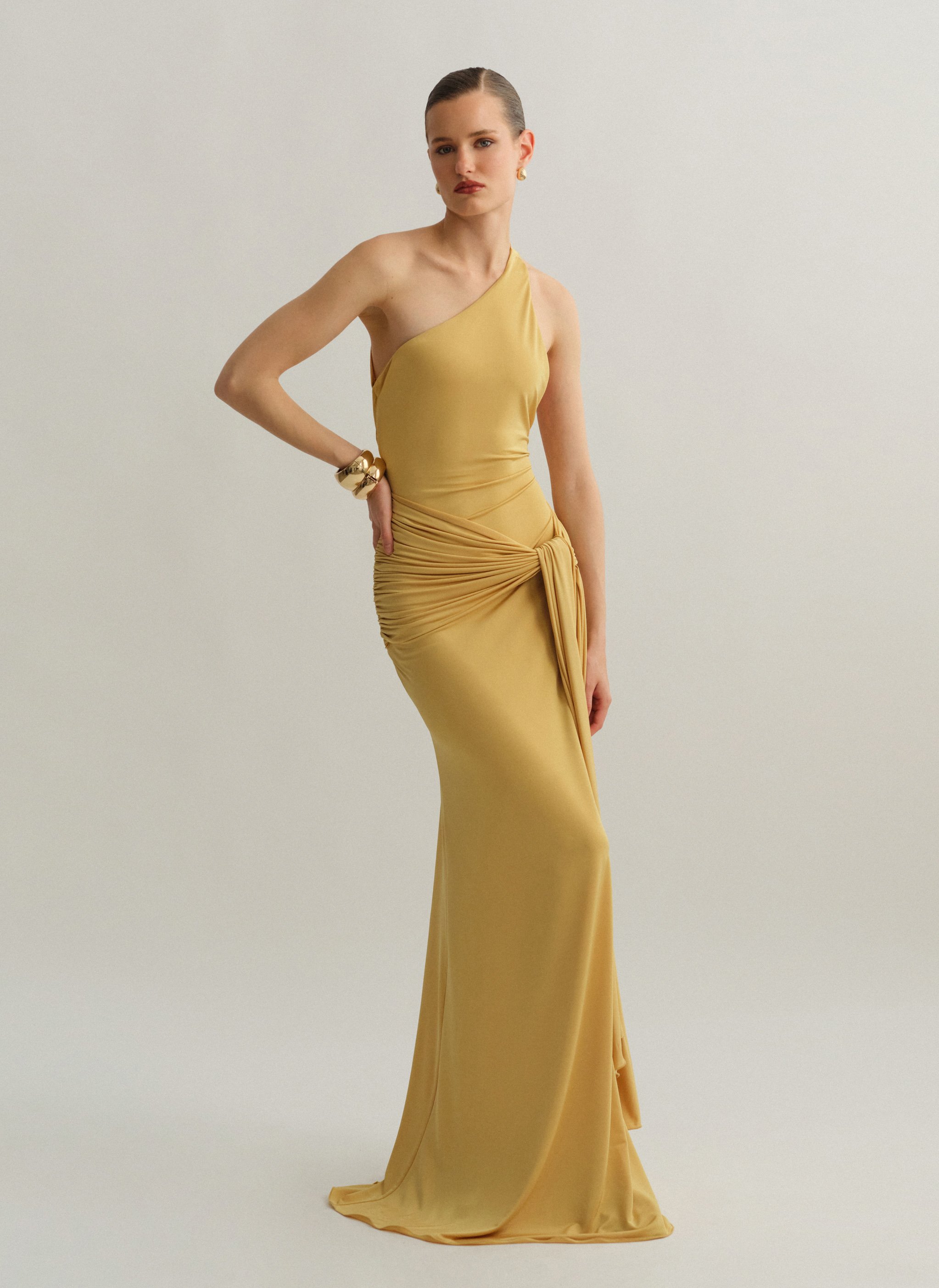 Ελαστικό one-shoulder μακρύ φόρεμα με ζώνη και ανοιχτή πλάτη.