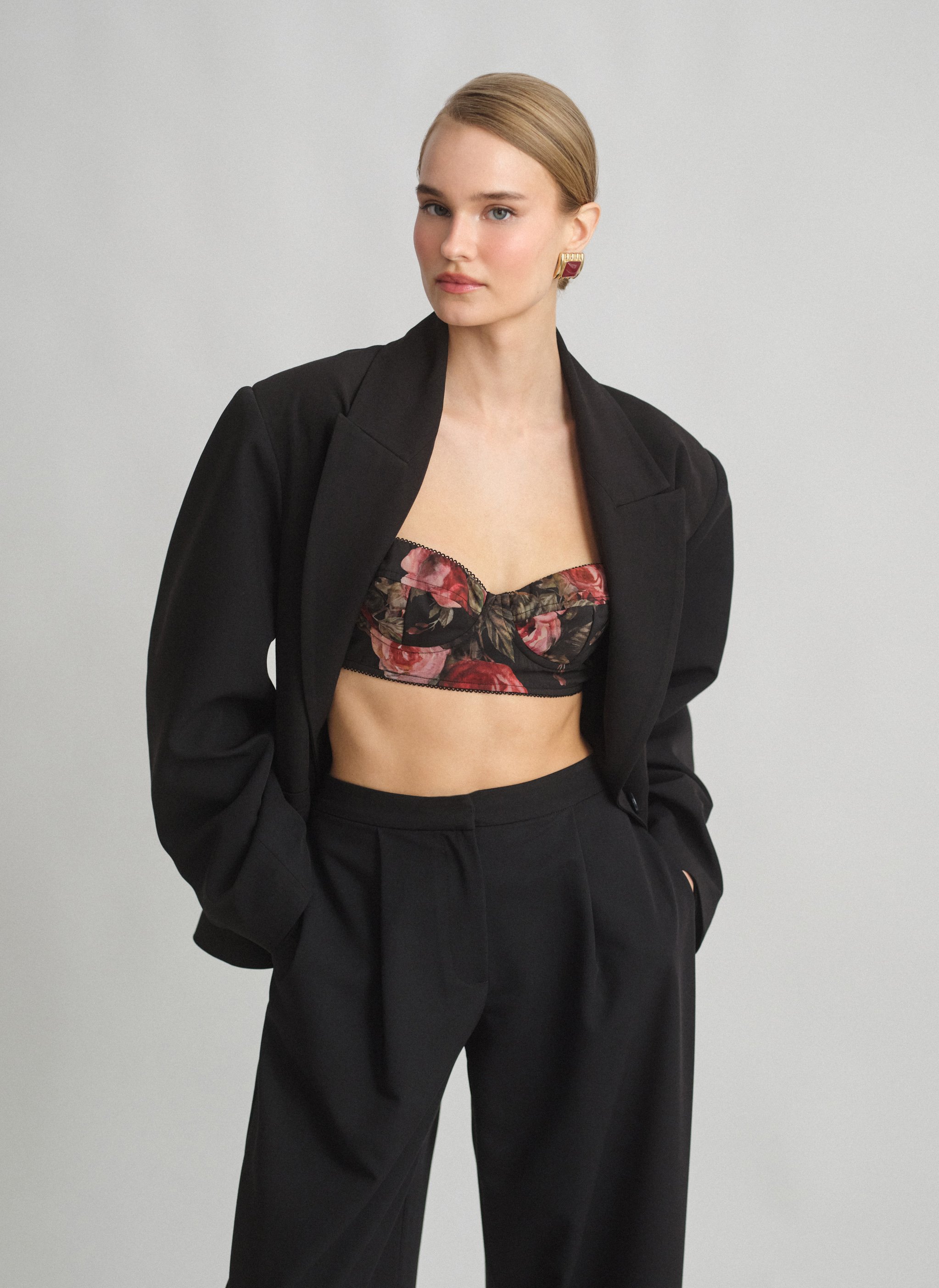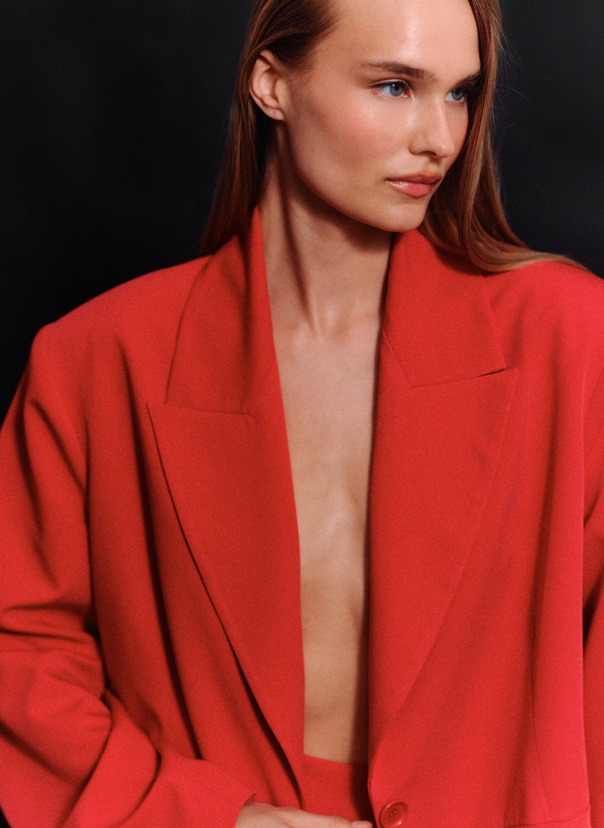 Το προϊόν διαθέτει ίσια γραμμή, έντονες βάτες στους ώμους και μανίκια με δομή, τσέπες με ρέλι και επένδυση από φόδρα.