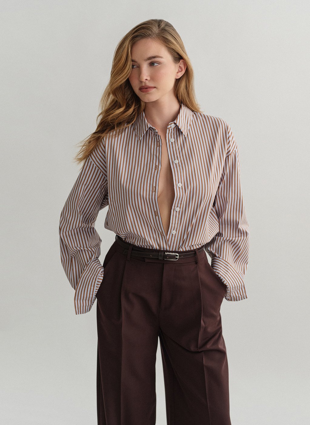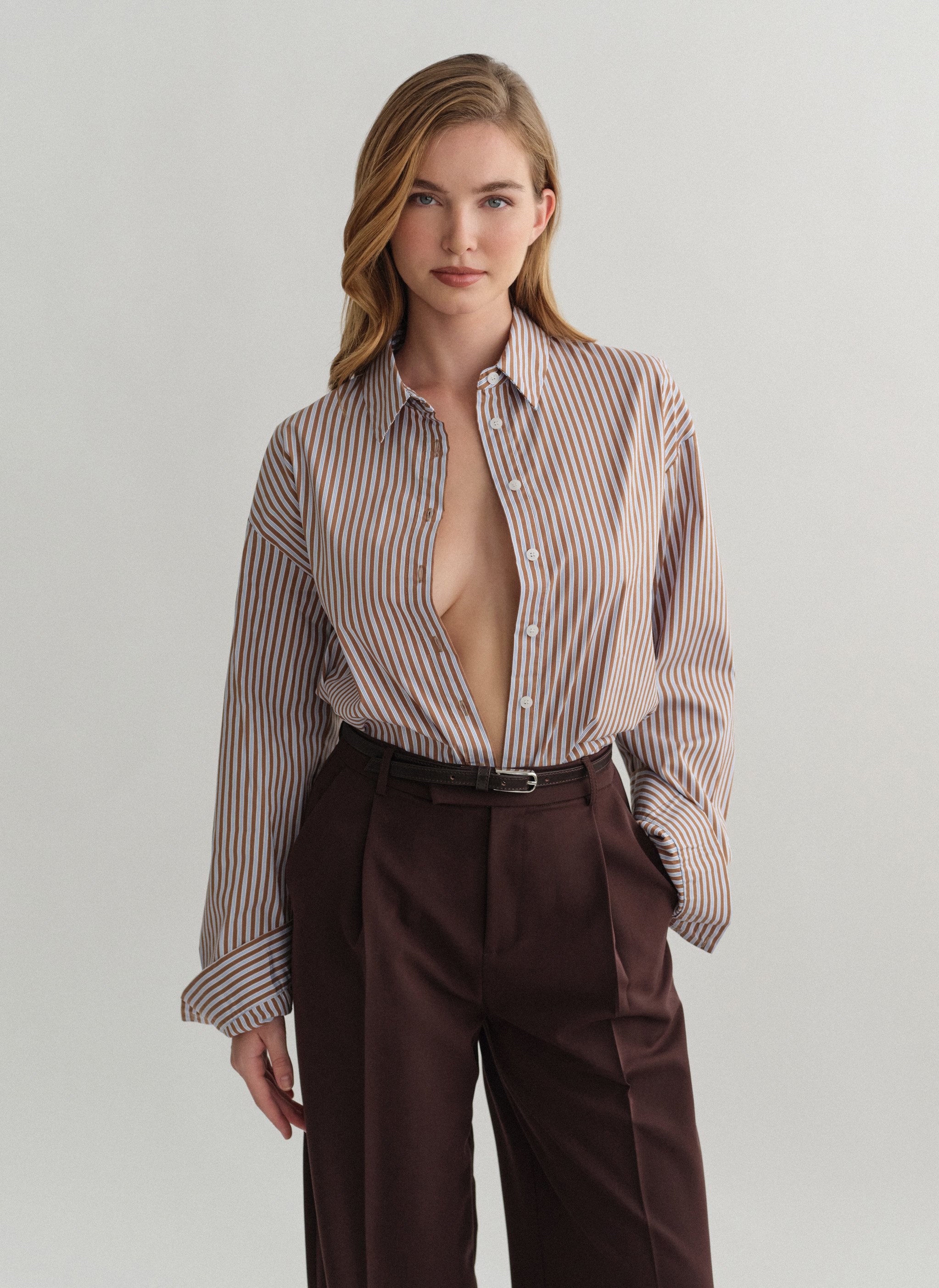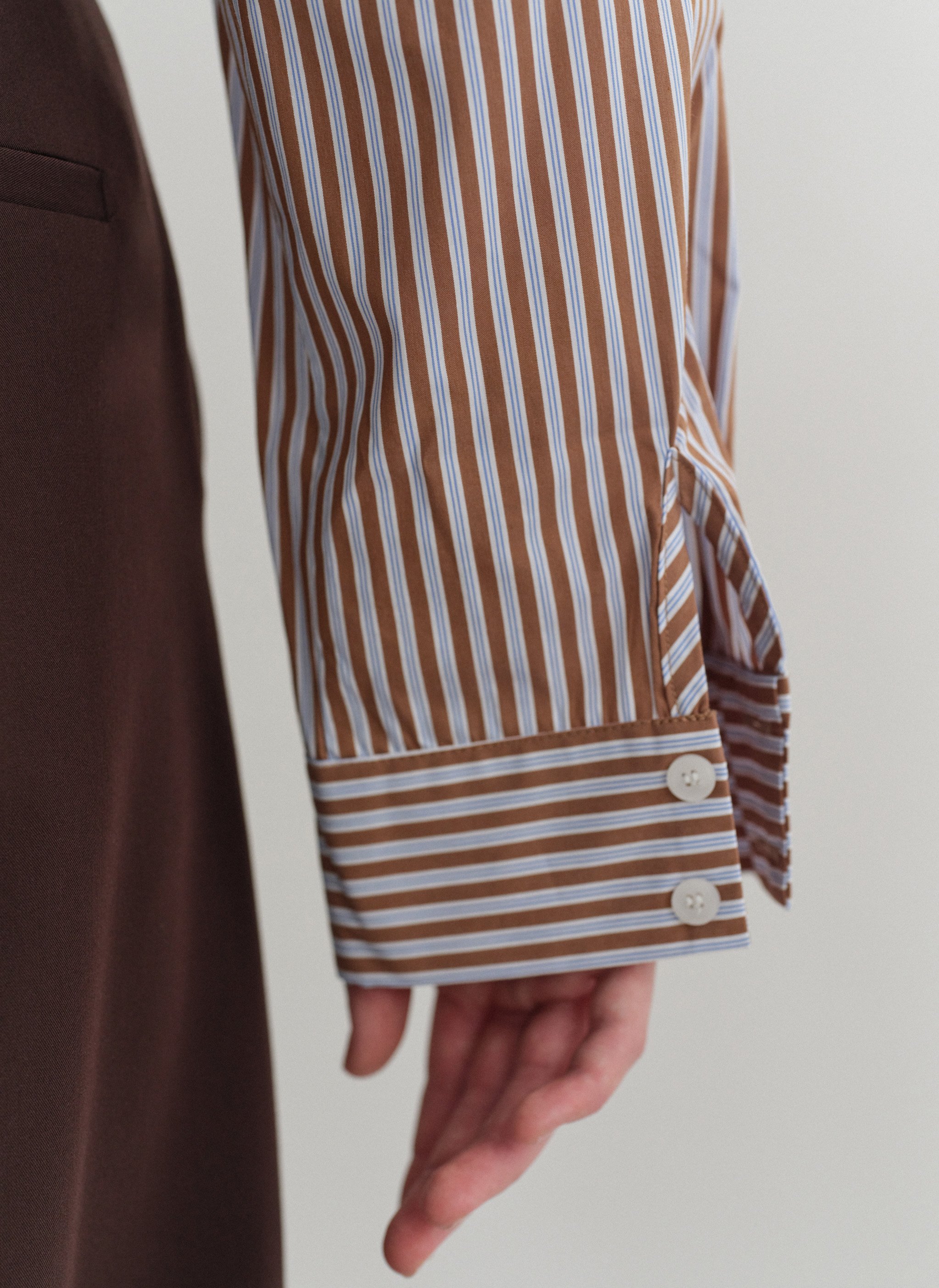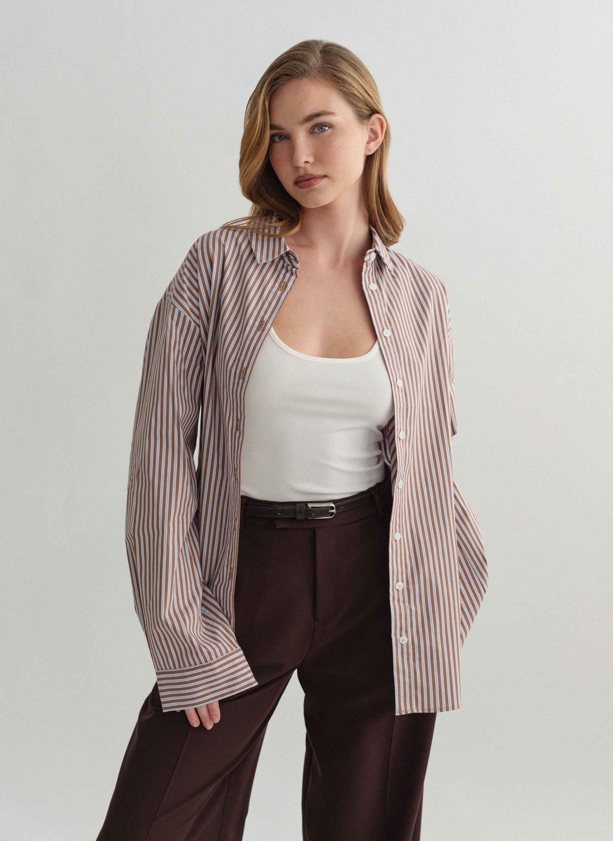 Oversized πουκάμισο ποπλίνα με καφέ και γαλάζια ρίγα.