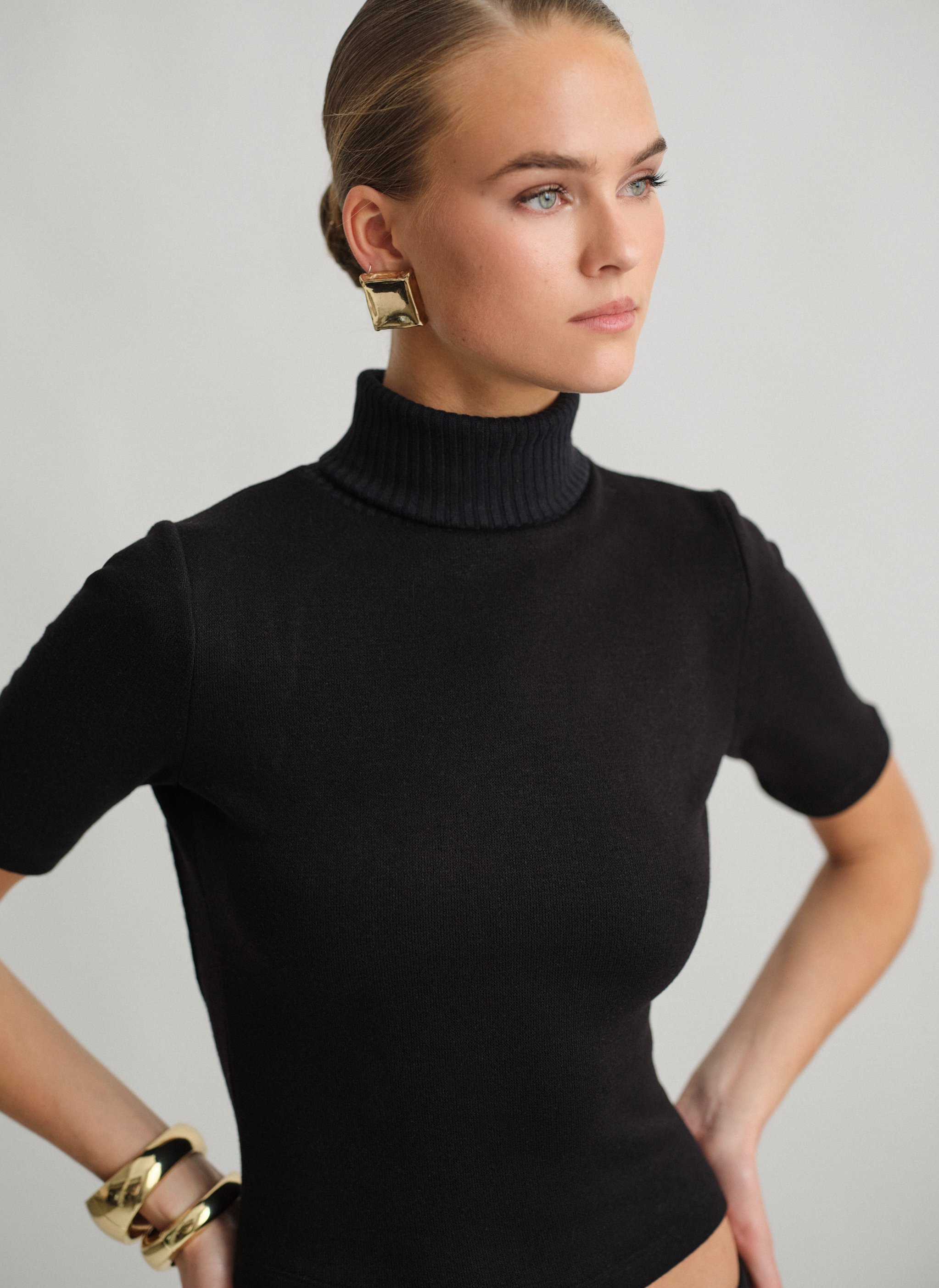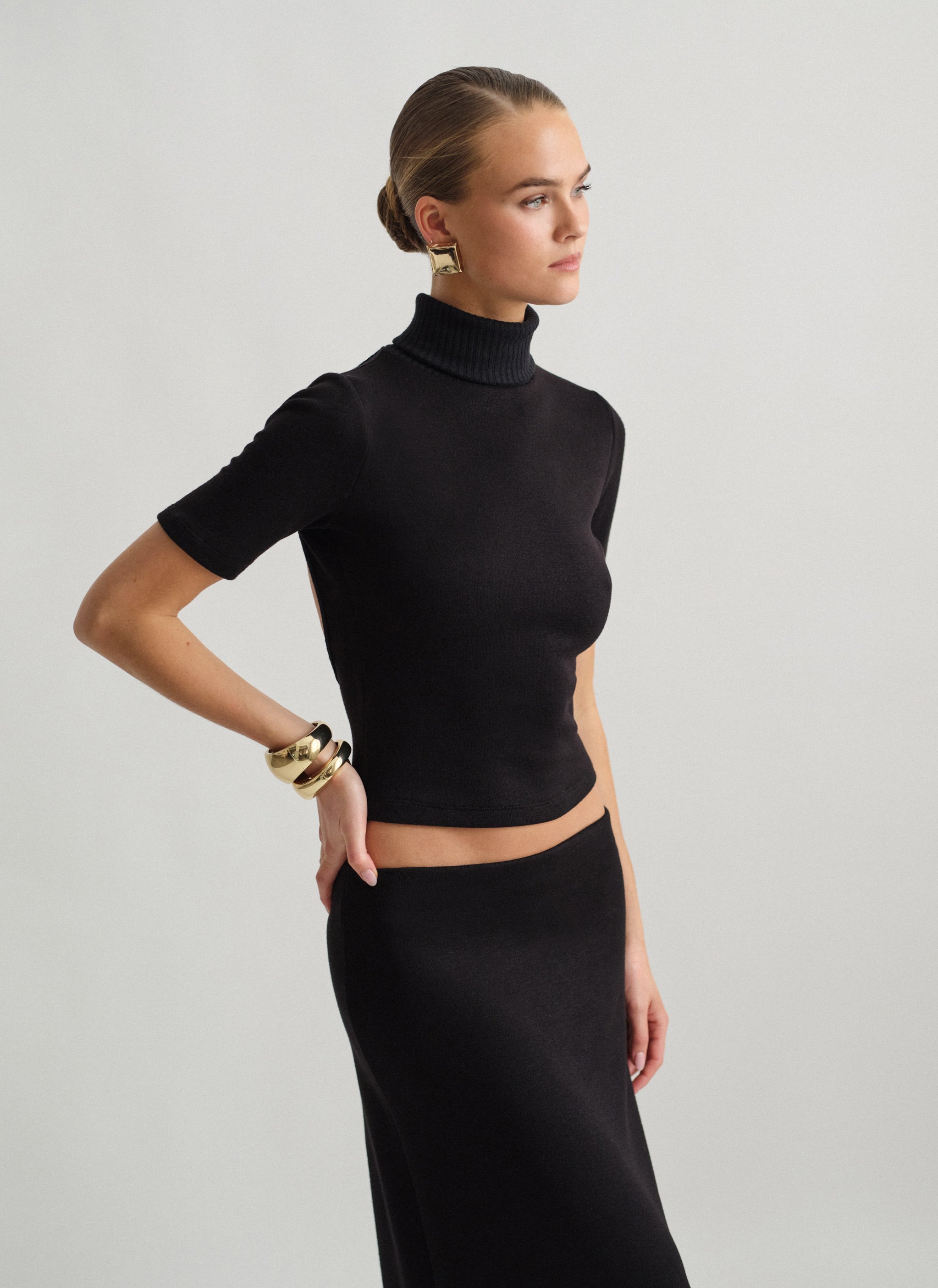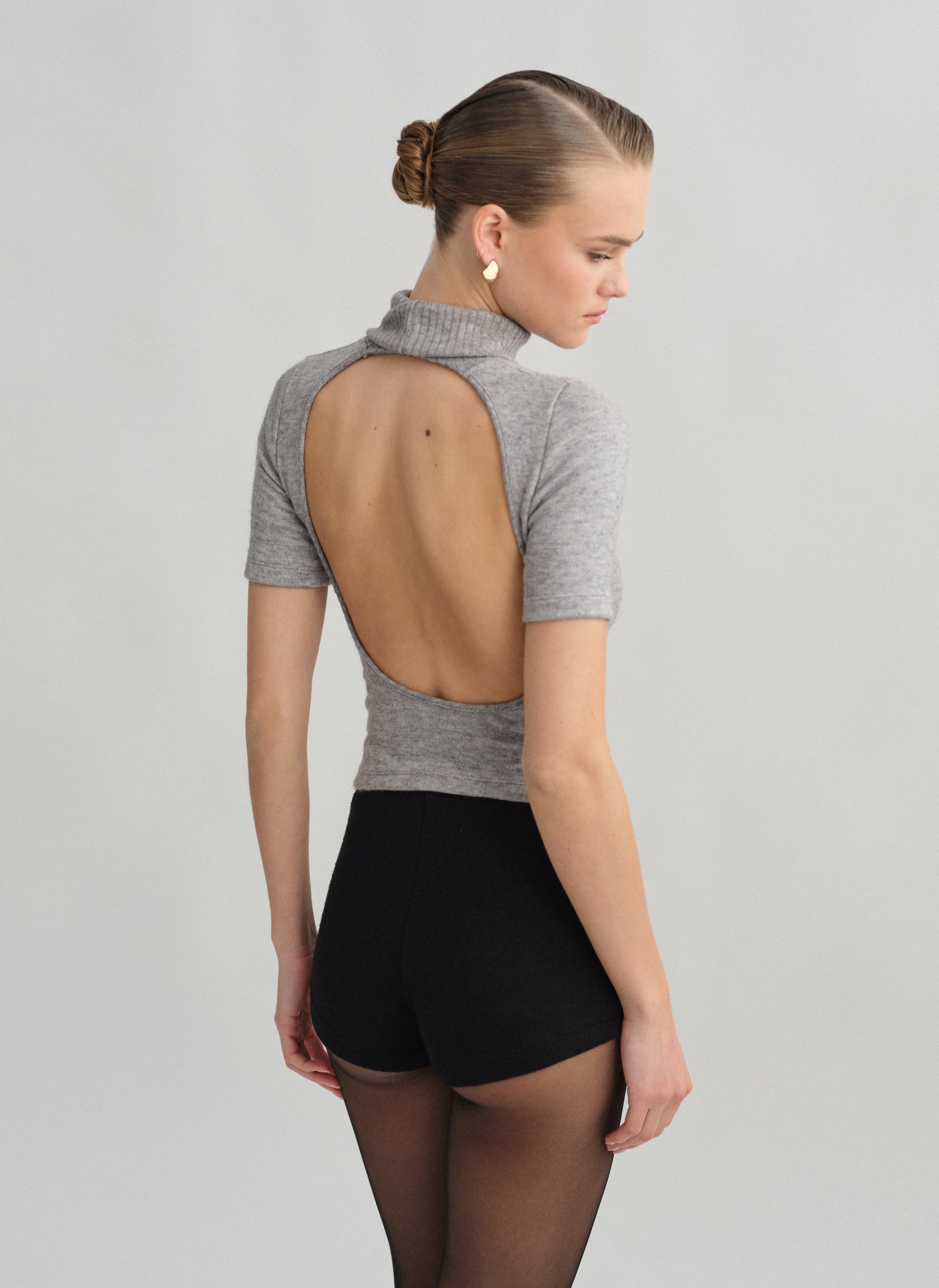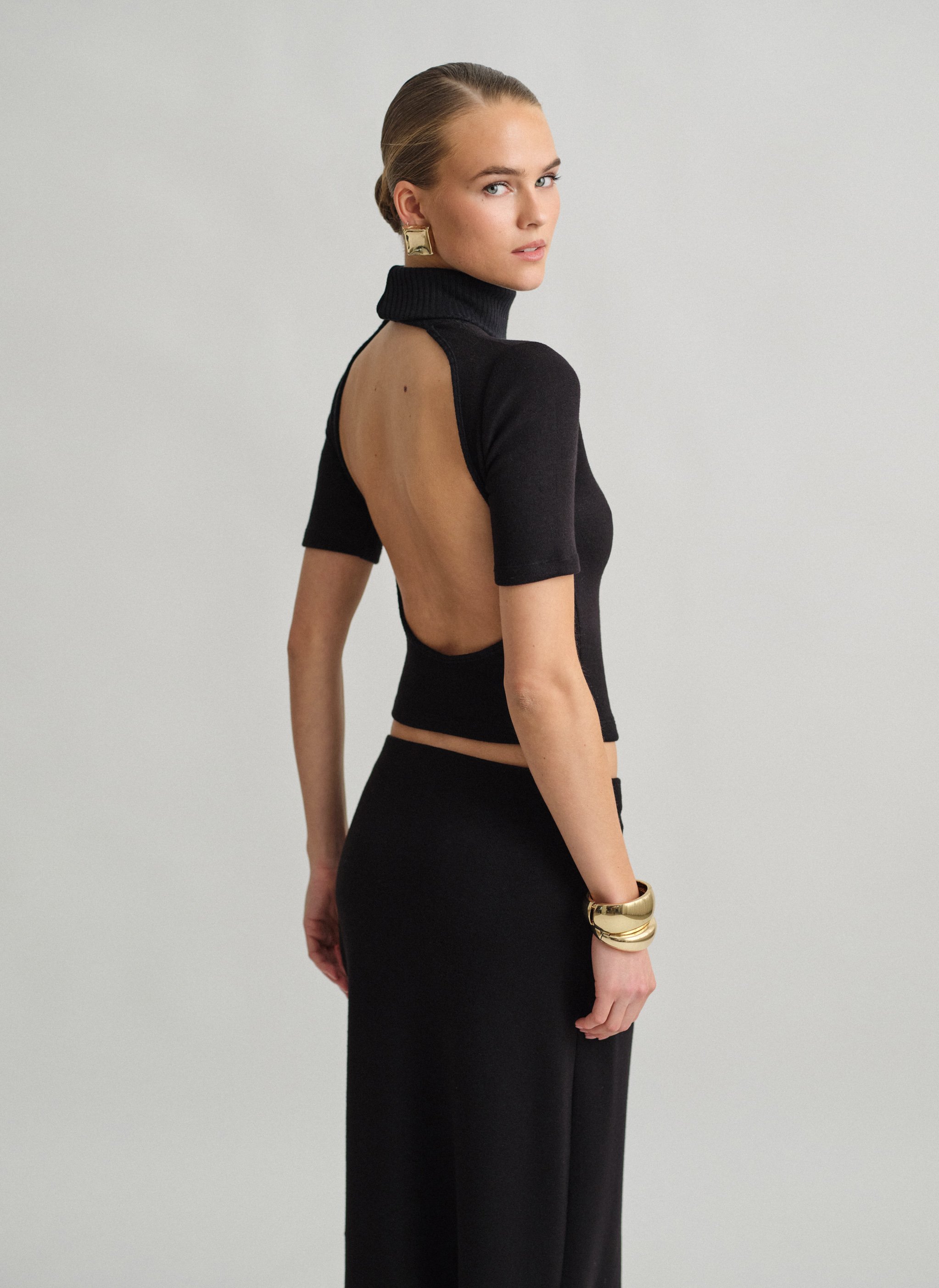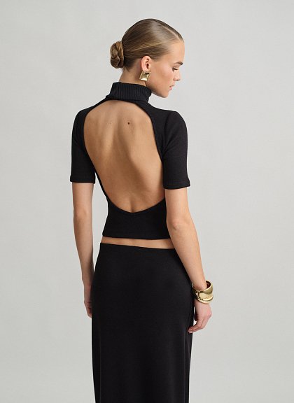 Ελαστική πλεκτή κοντομάνικη μπλούζα με γυριστό γιακά ζιβάγκο και ανοιχτή πλάτη.