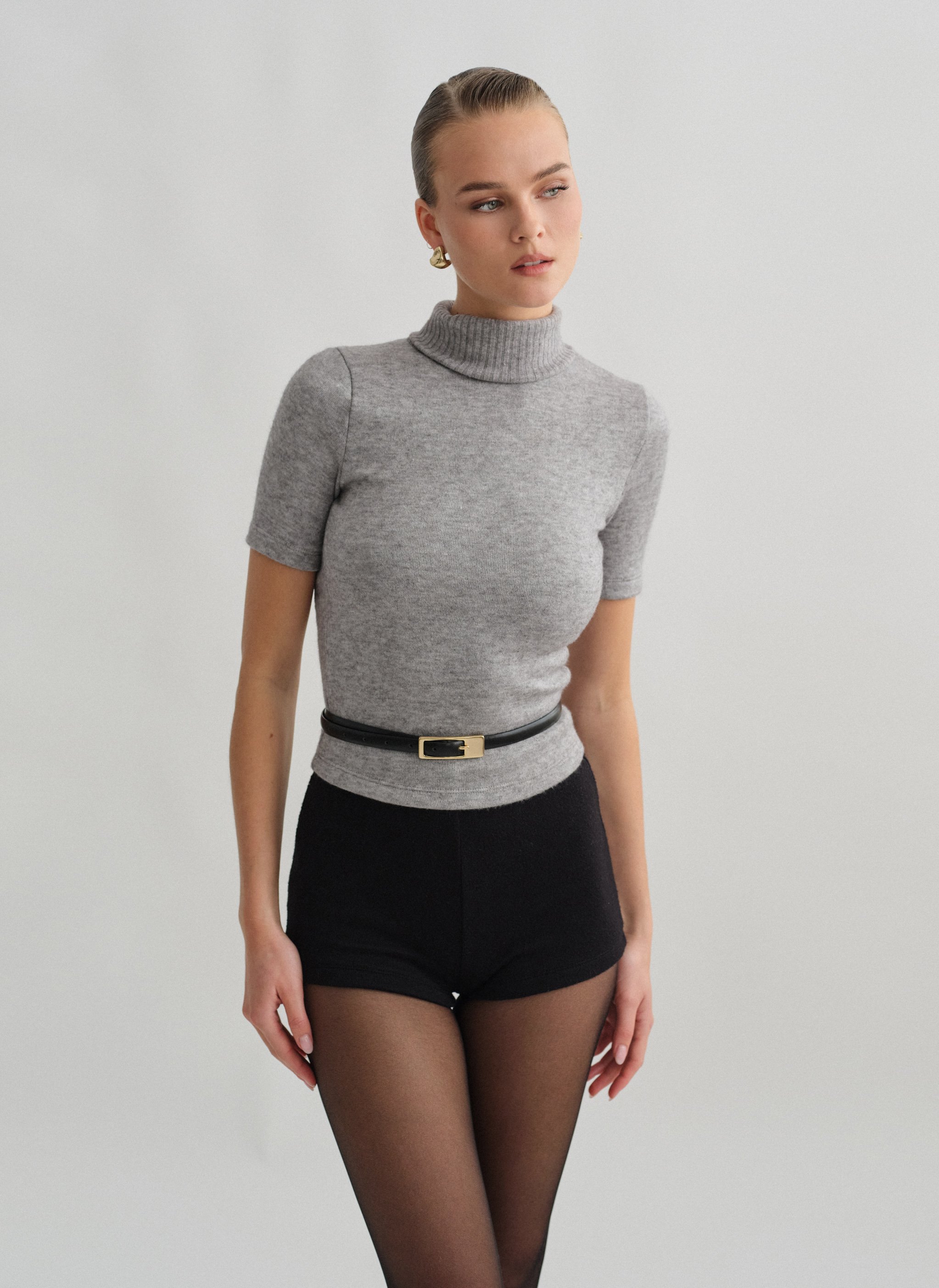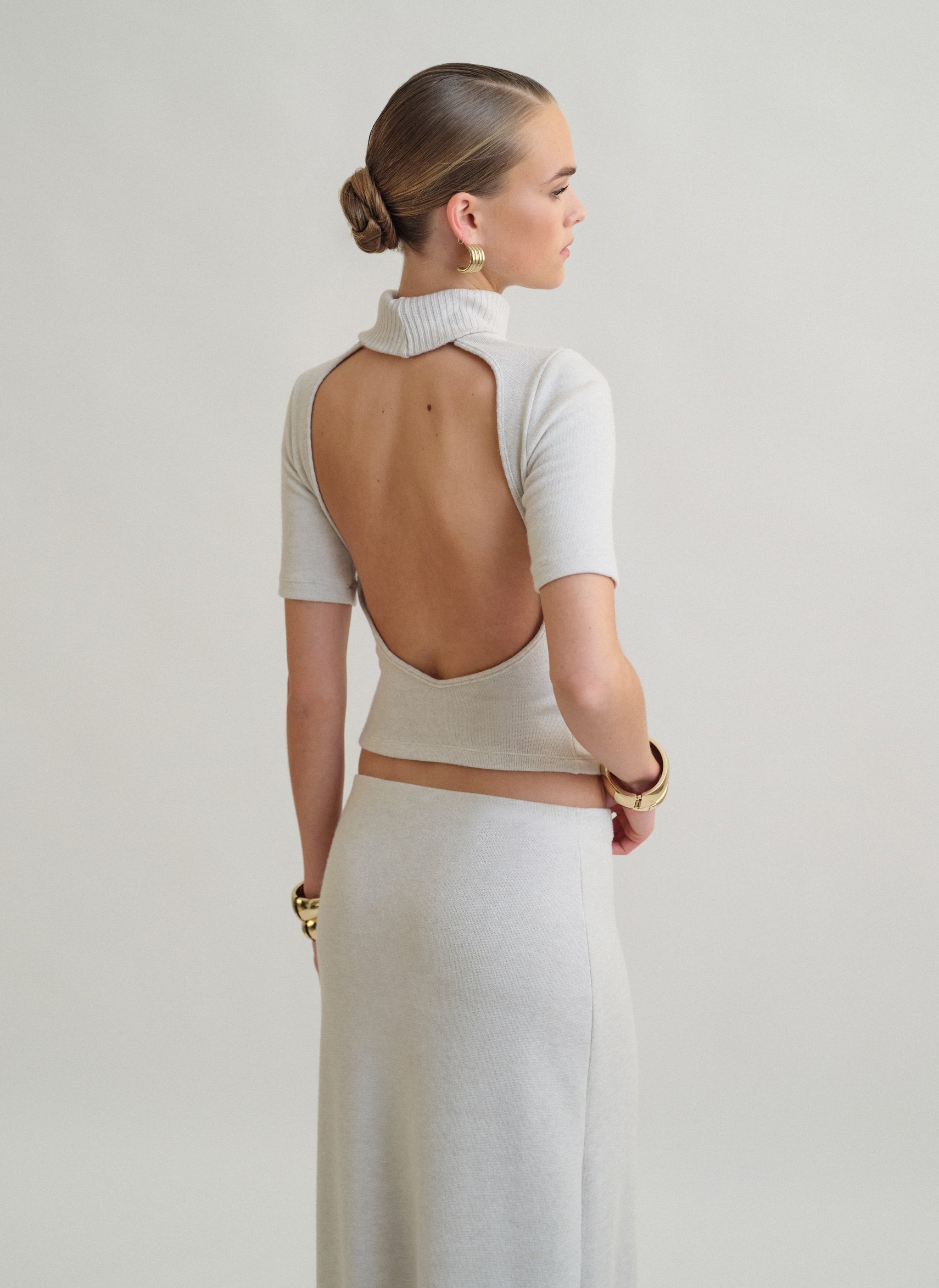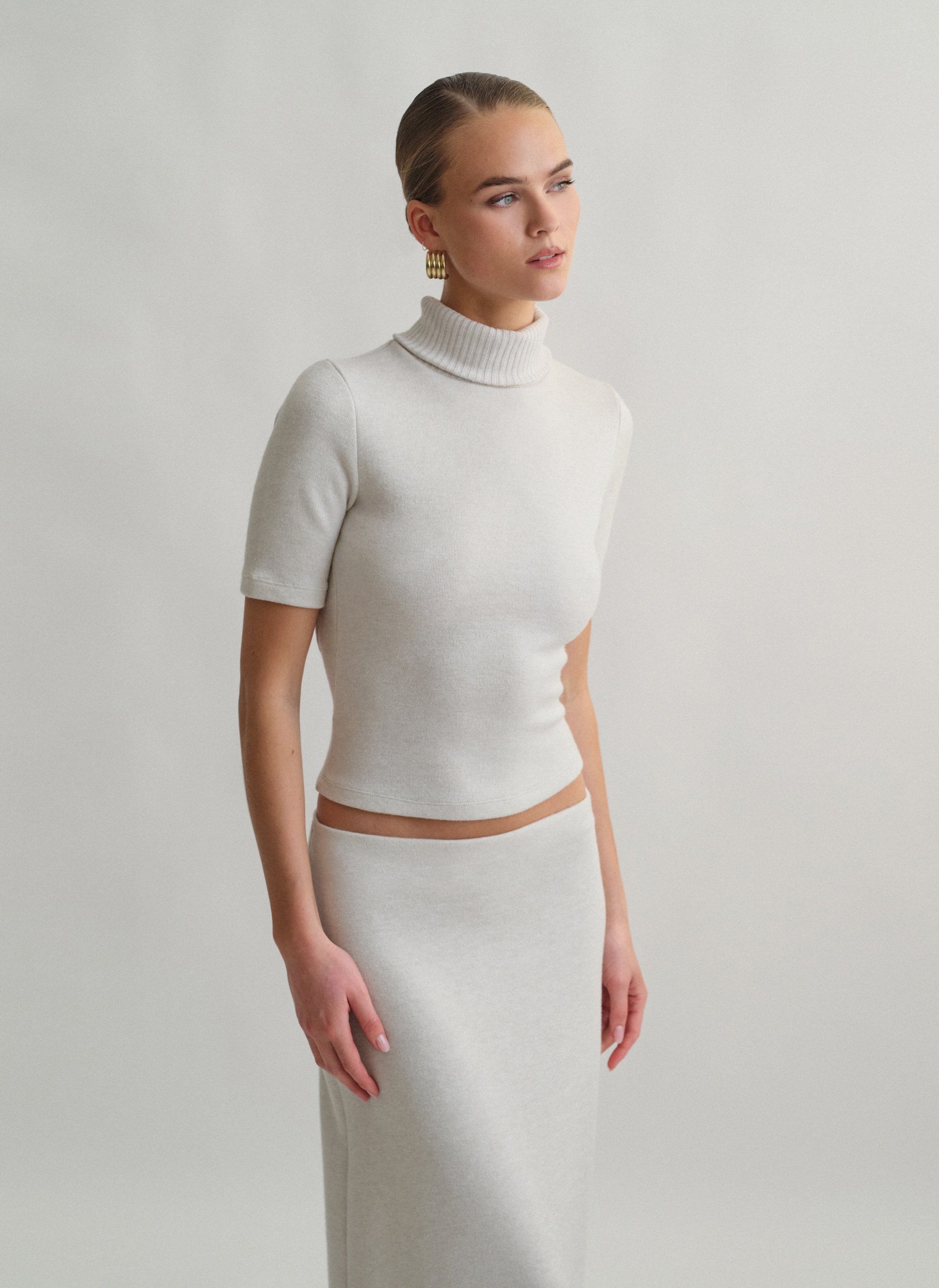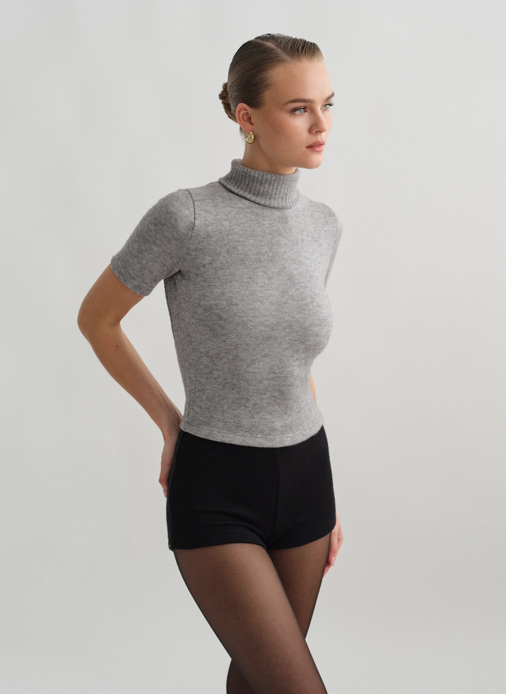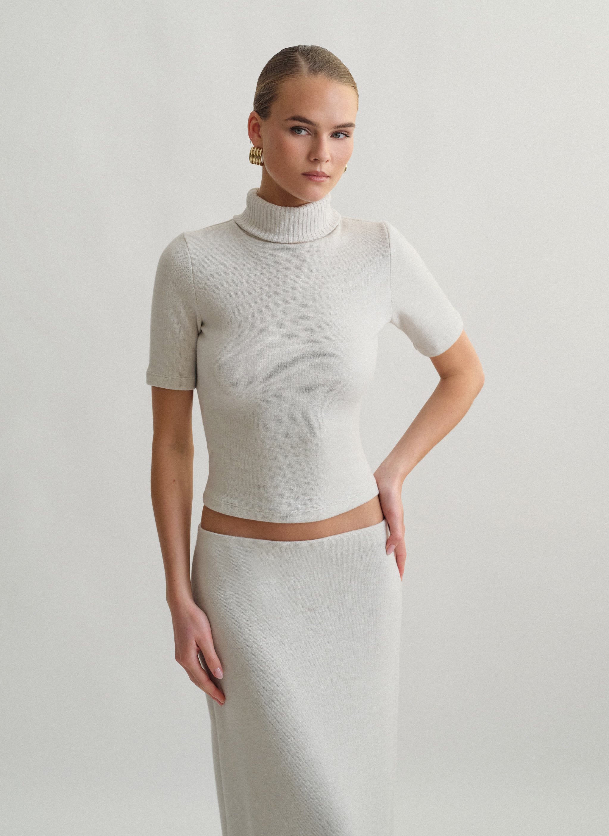 Ελαστική πλεκτή κοντομάνικη μπλούζα με γυριστό γιακά ζιβάγκο και ανοιχτή πλάτη.