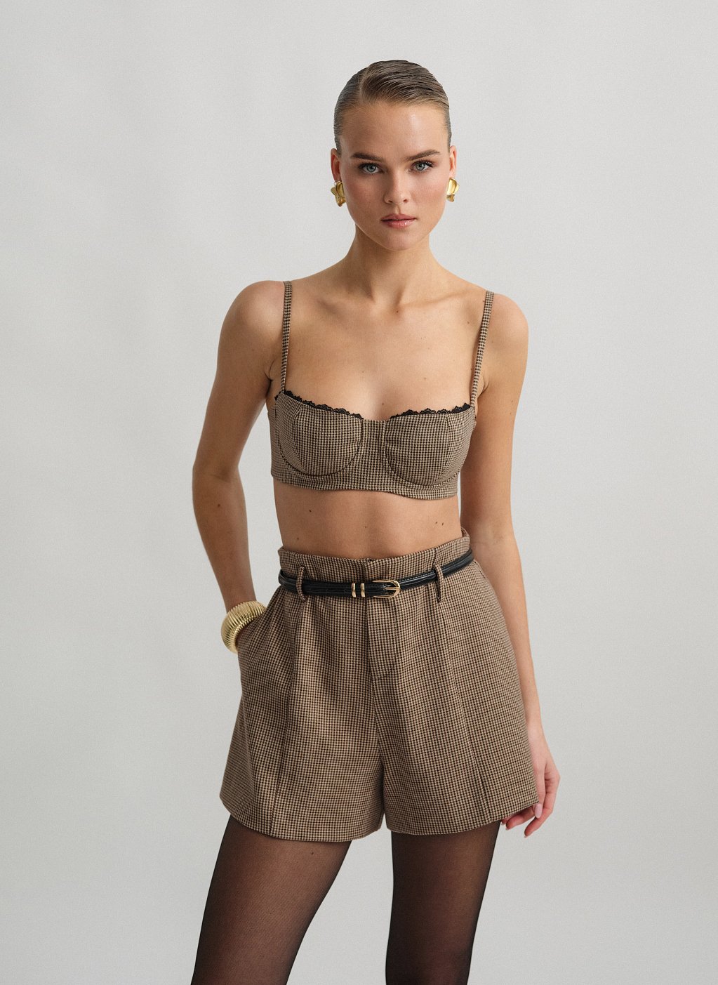 Ψηλόμεσο υφασμάτινο σορτς σε houndstooth ύφανση με διακοσμητικές ραφές και κλείσιμο εμπρός με φερμουάρ.