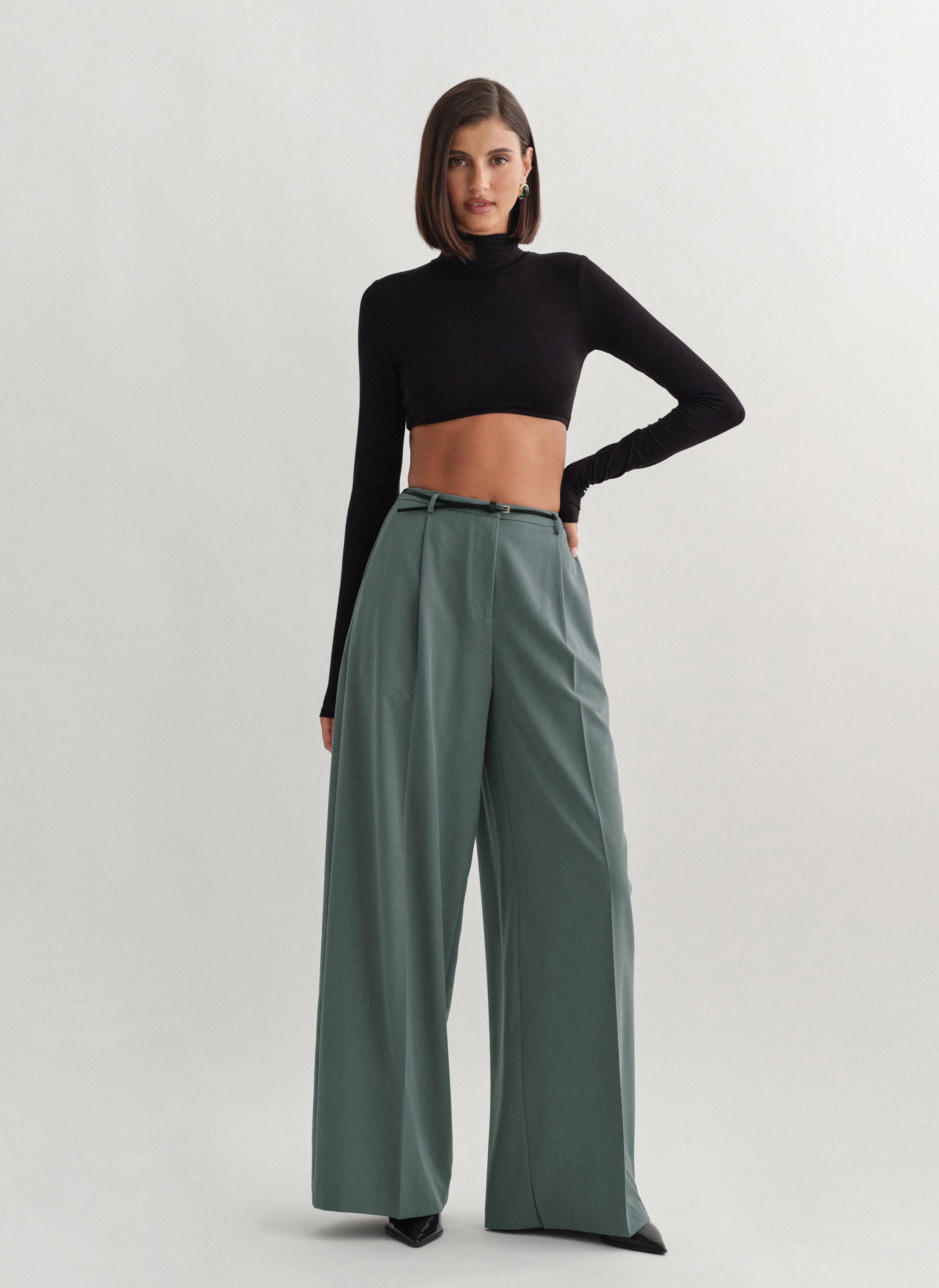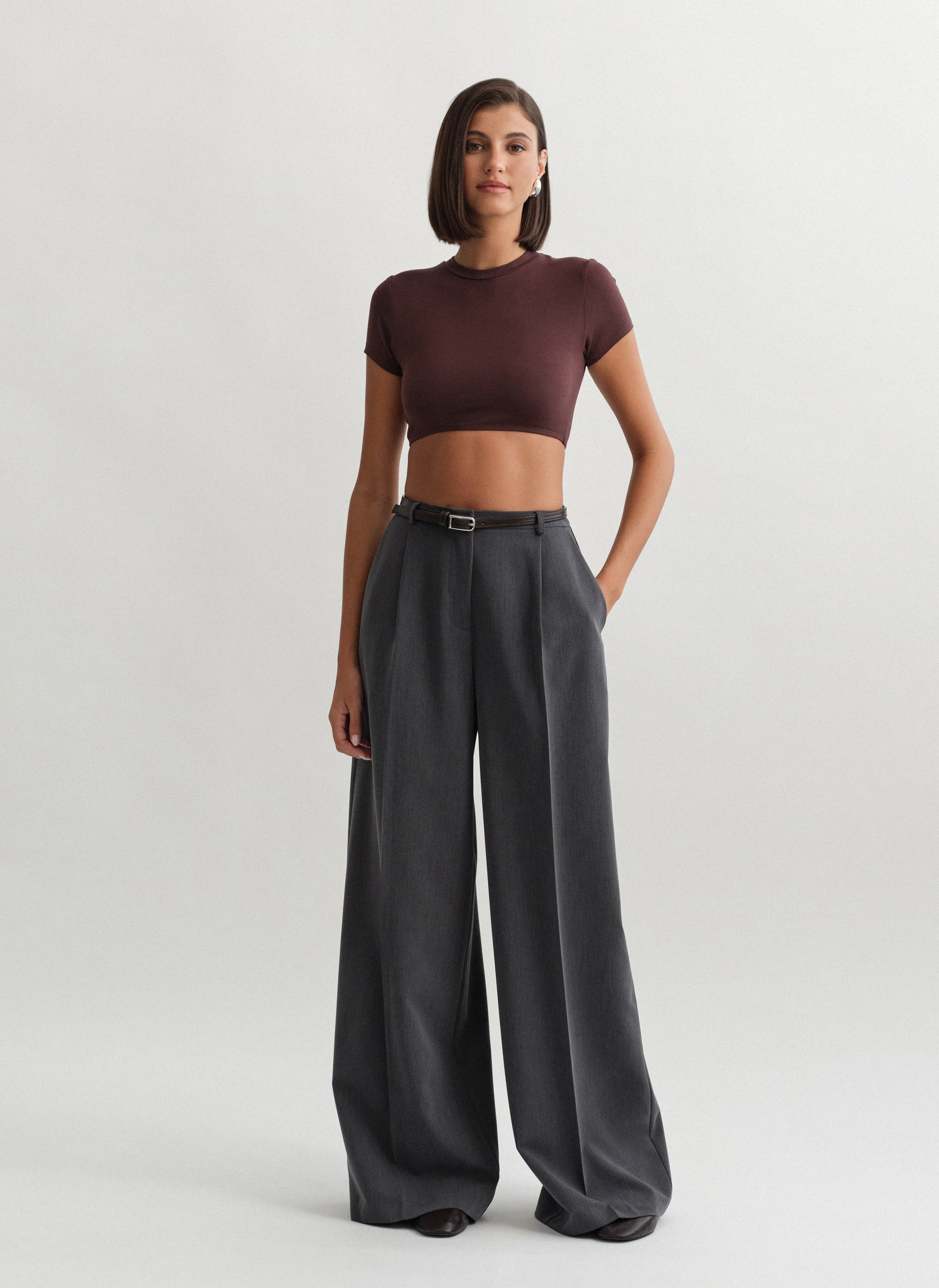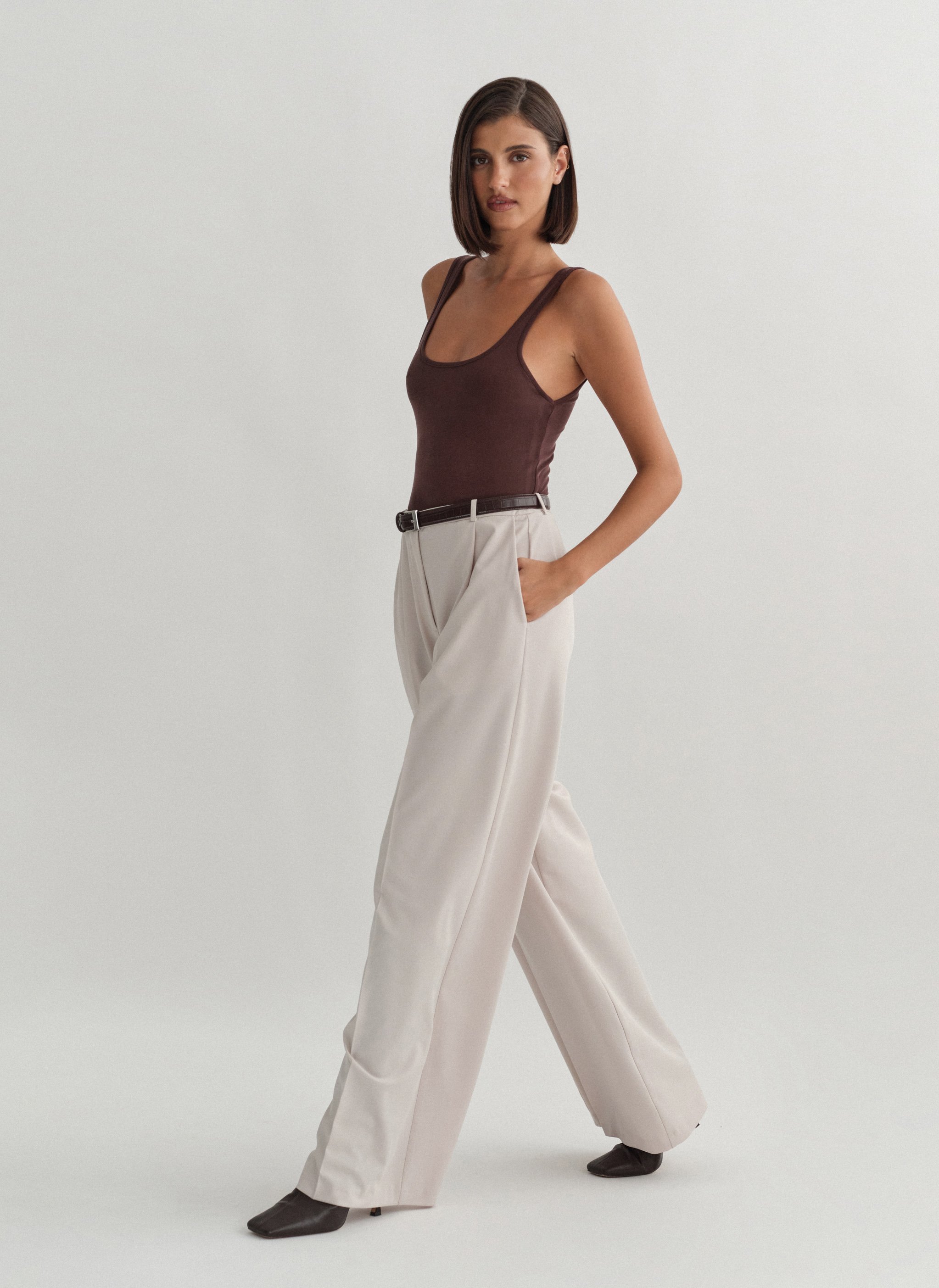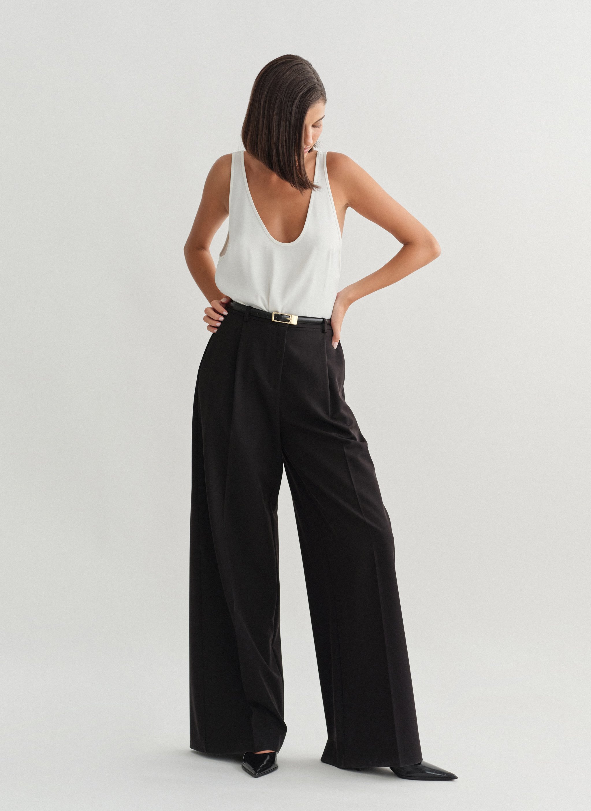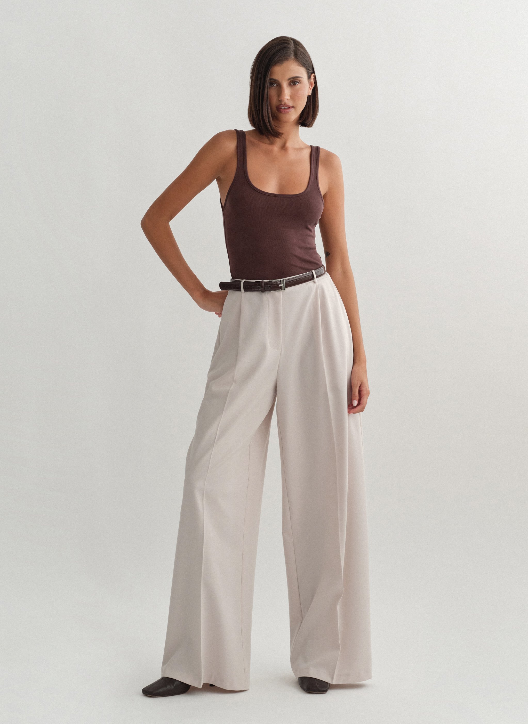 Ψηλόμεσο υφασμάτινο παντελόνι με πιέτες και λεπτό ζωνάκι.