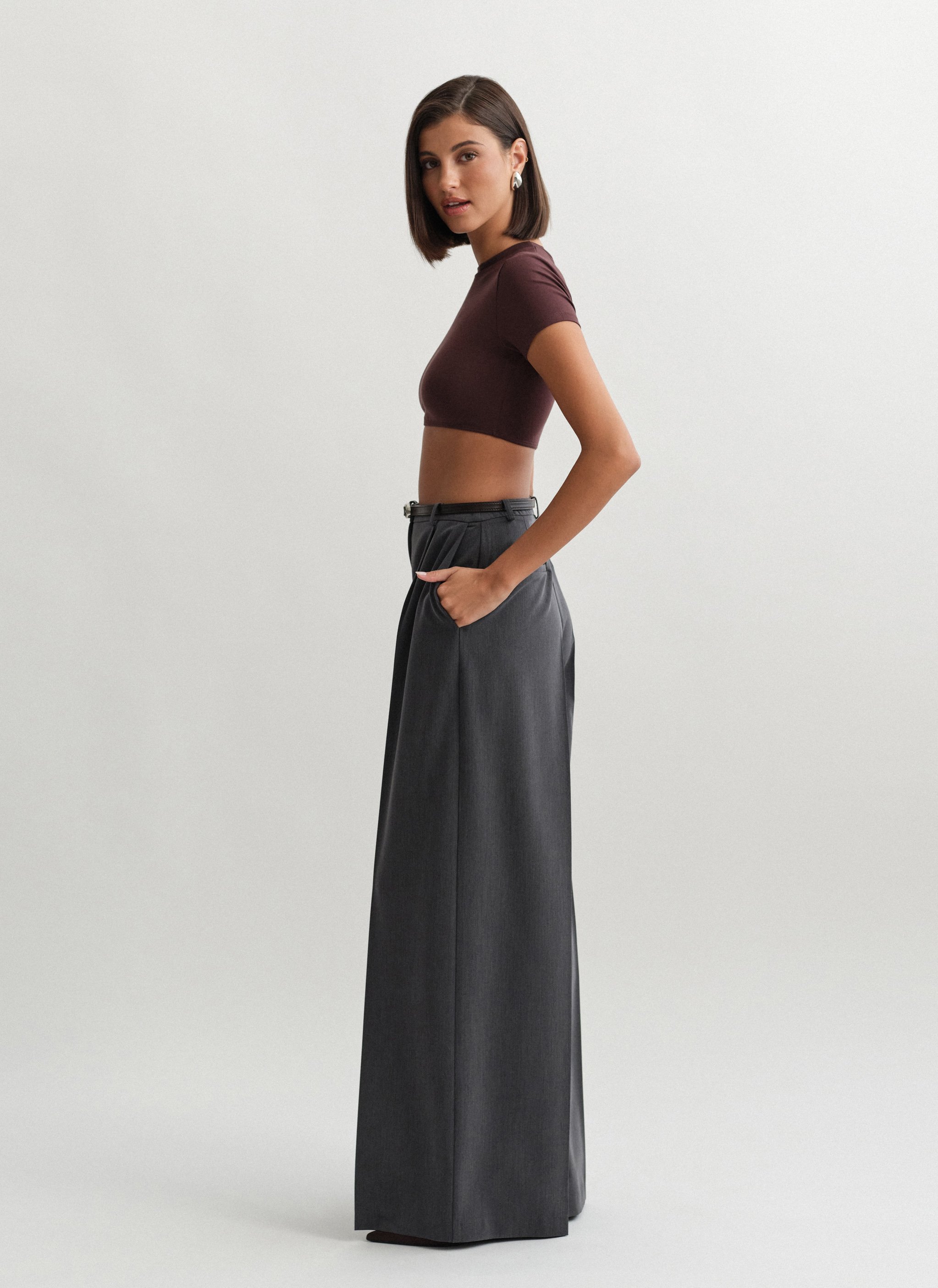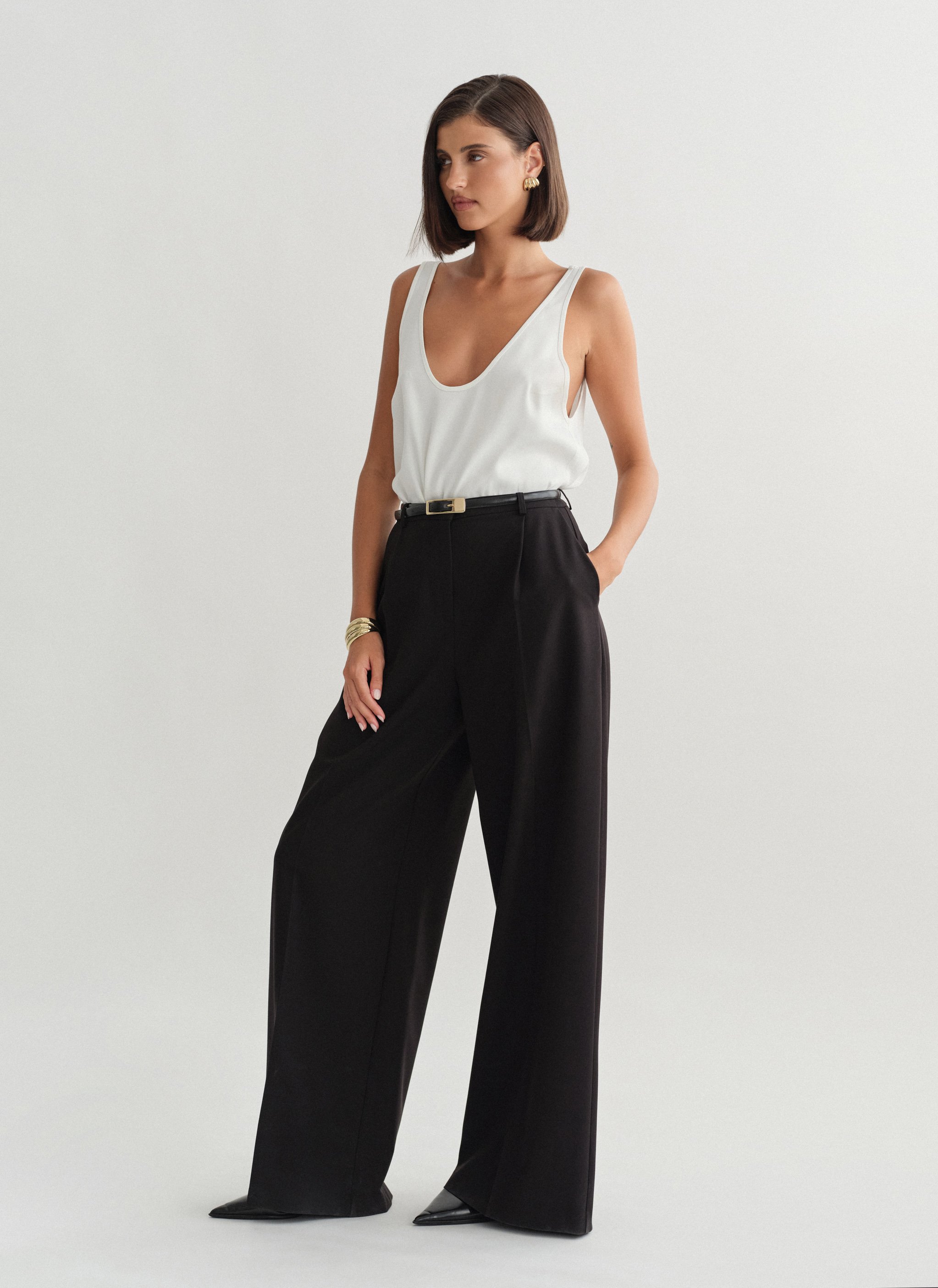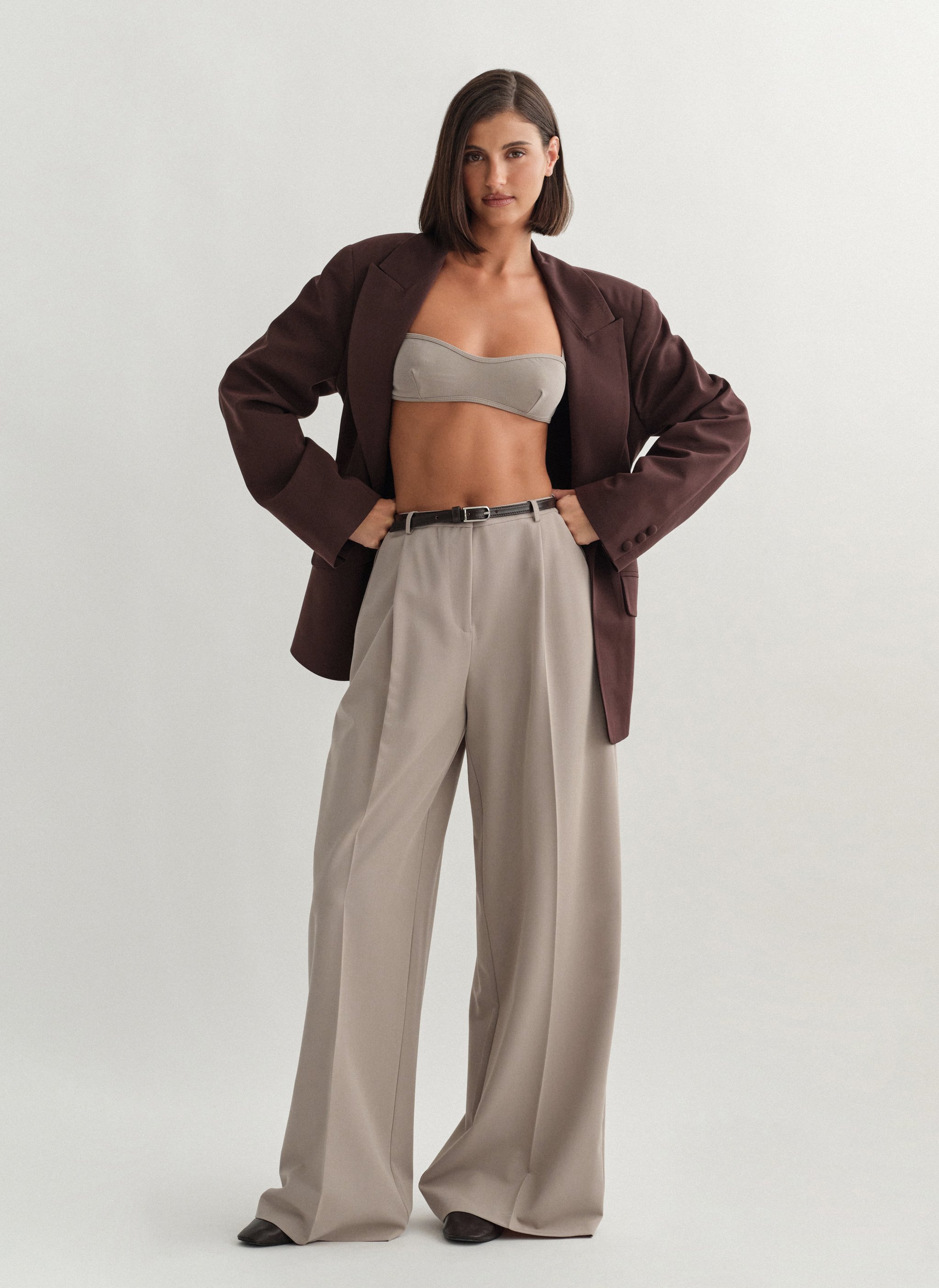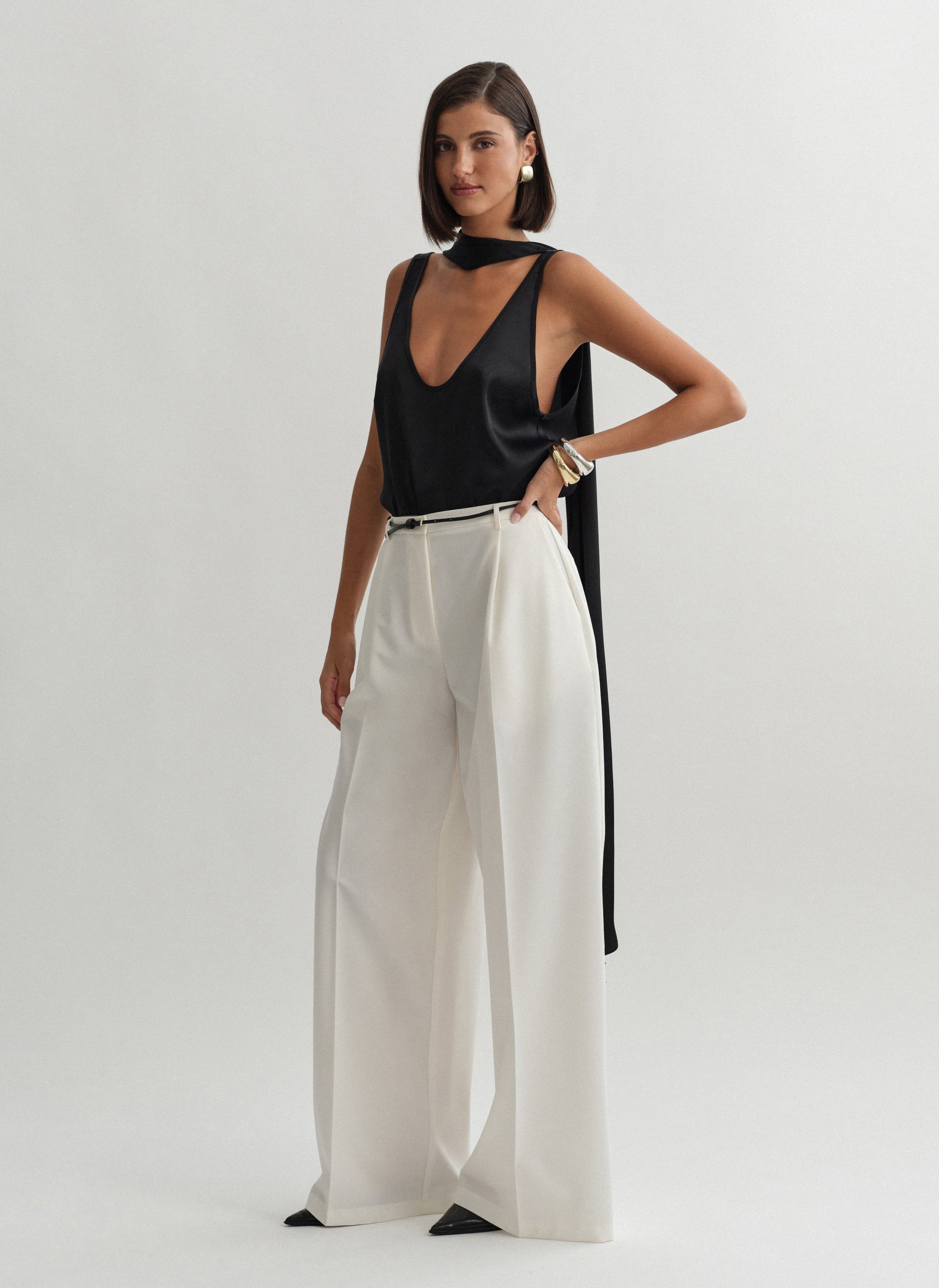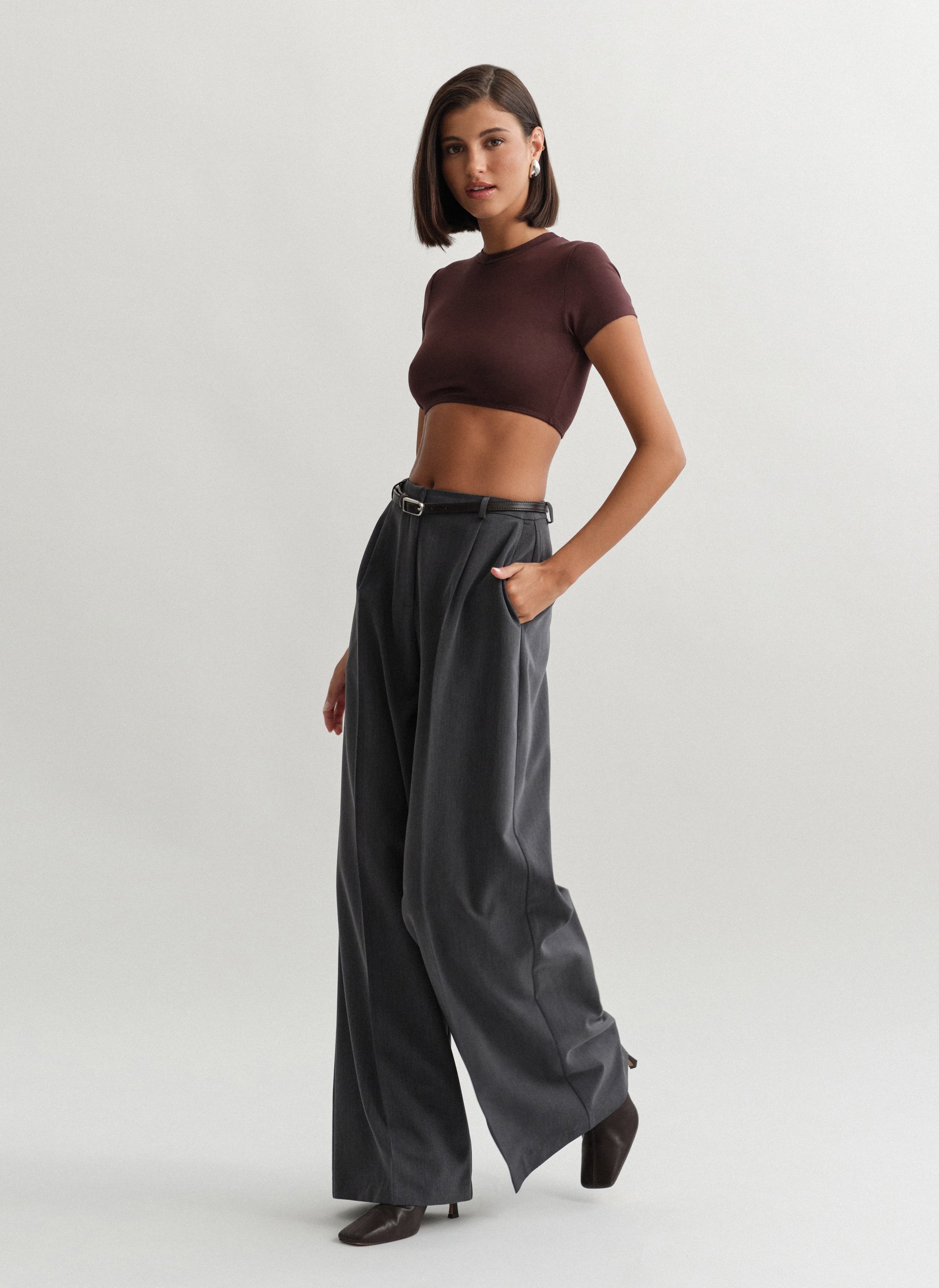 Ψηλόμεσο υφασμάτινο παντελόνι με πιέτες και λεπτό ζωνάκι.