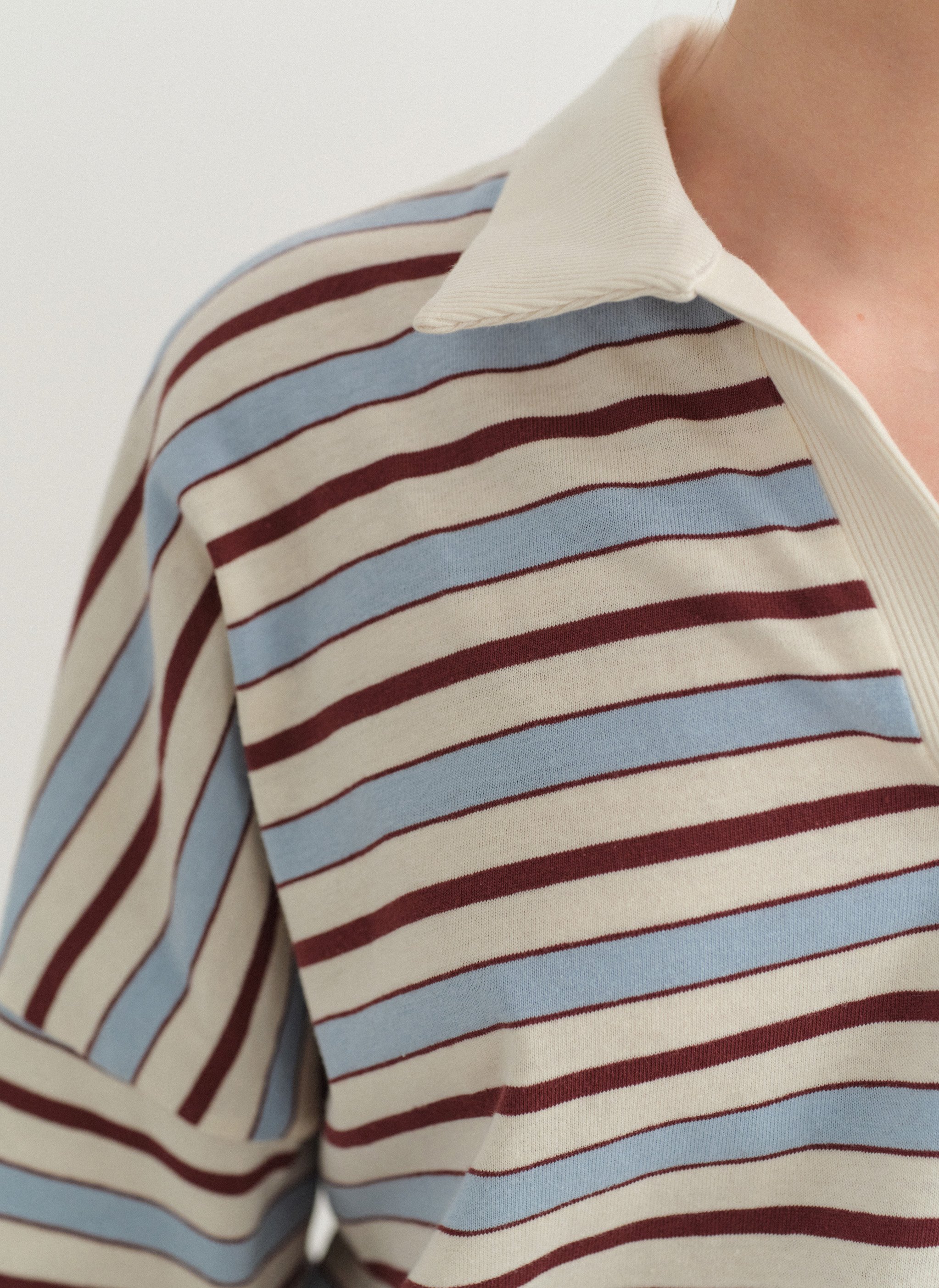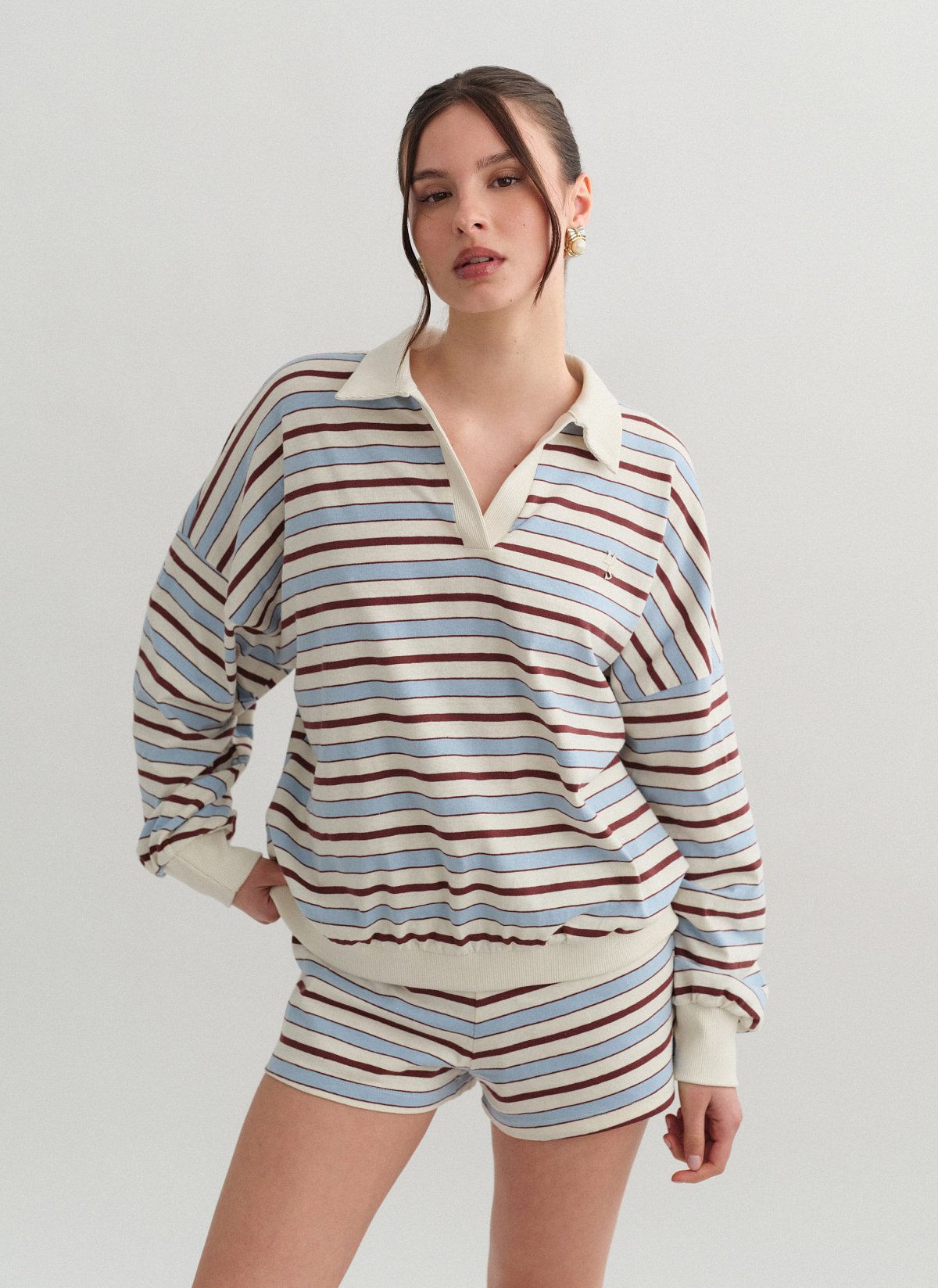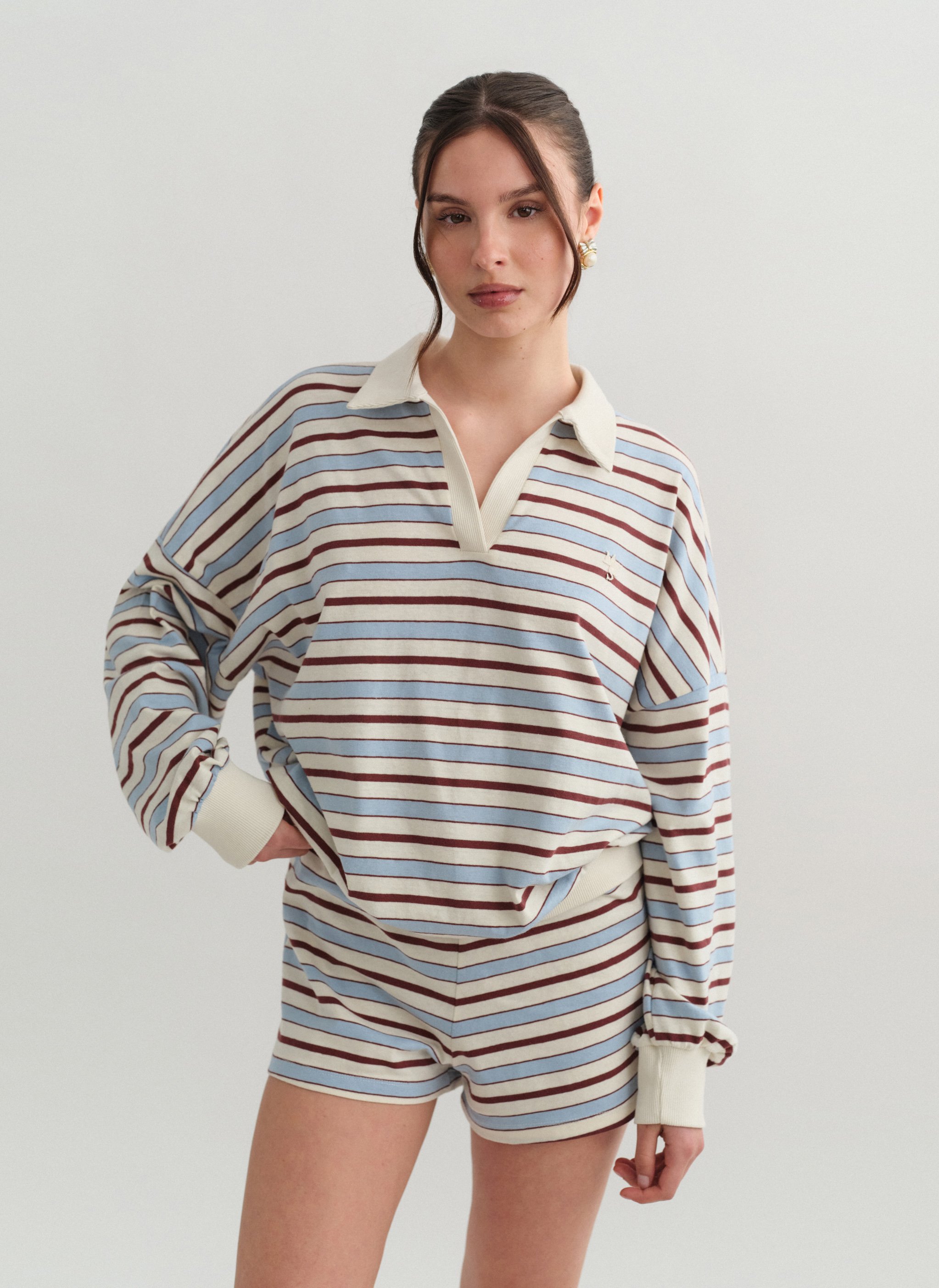 Μακρυμάνικη ριγέ μπλούζα με ριπ γιακά, κέντημα και λαιμόκοψη V.