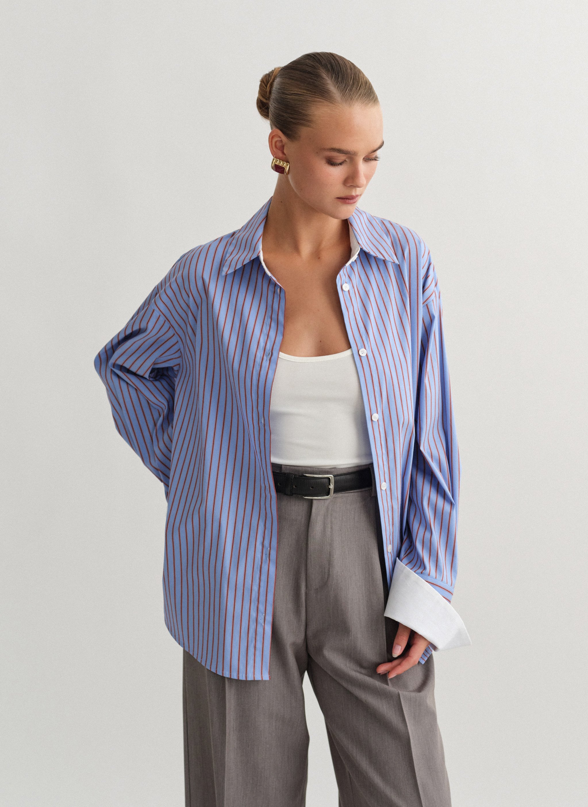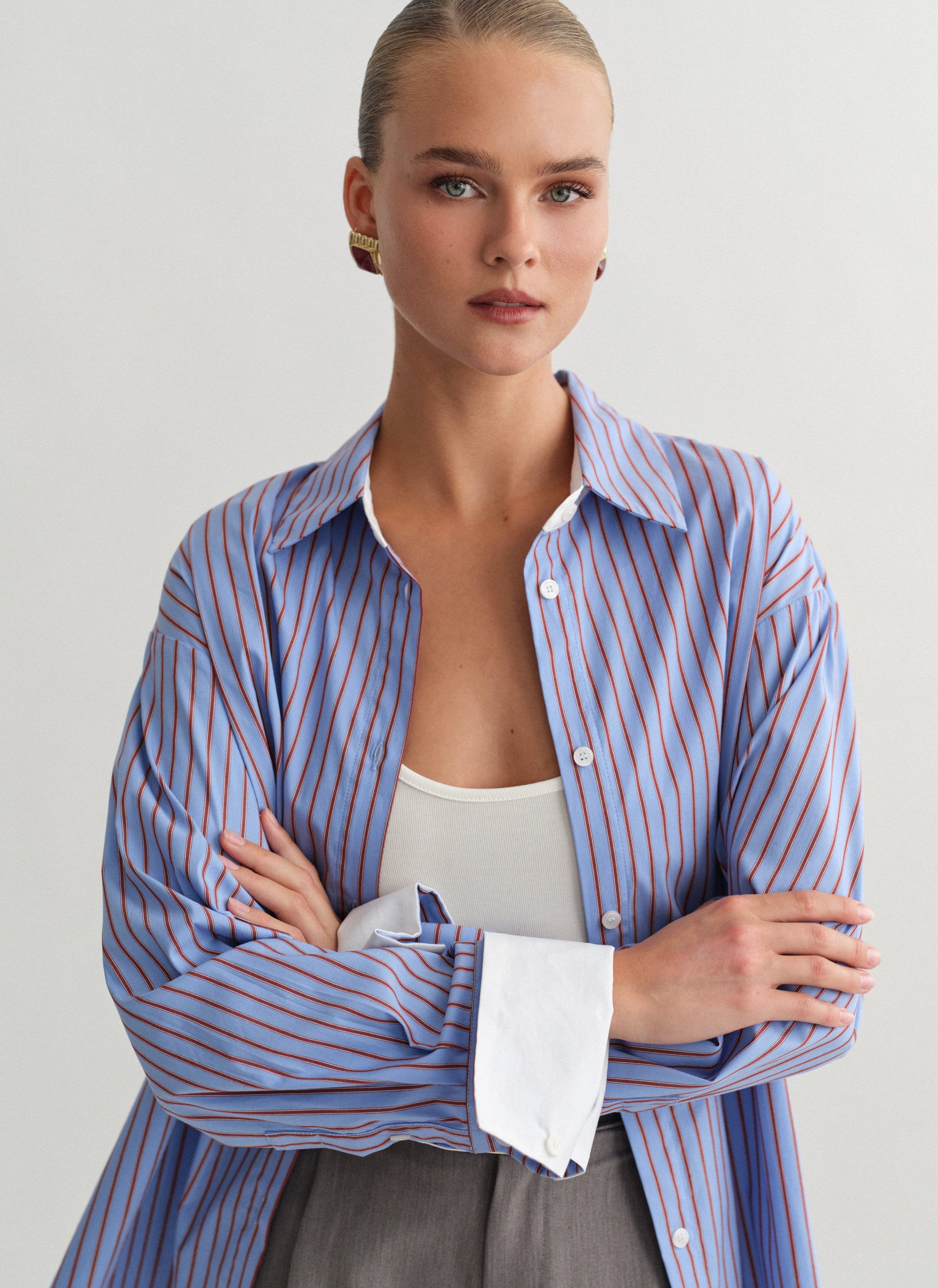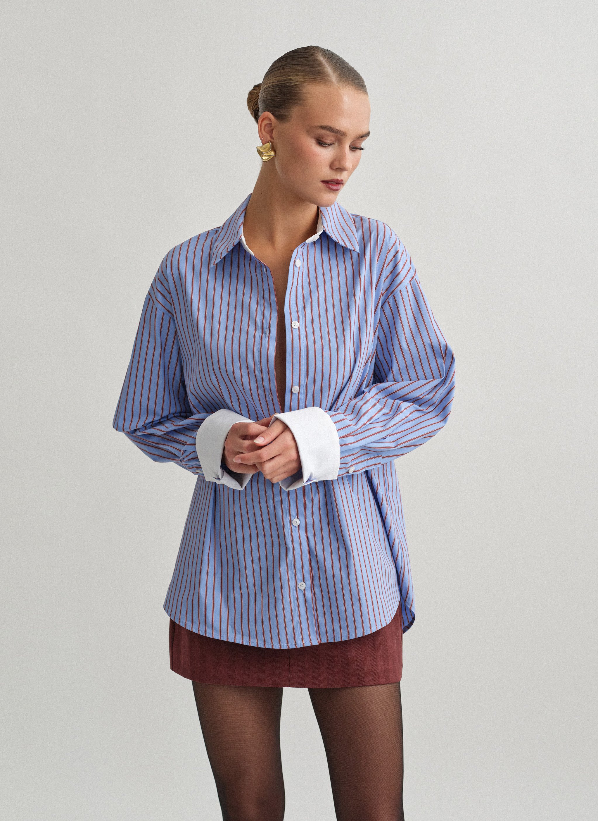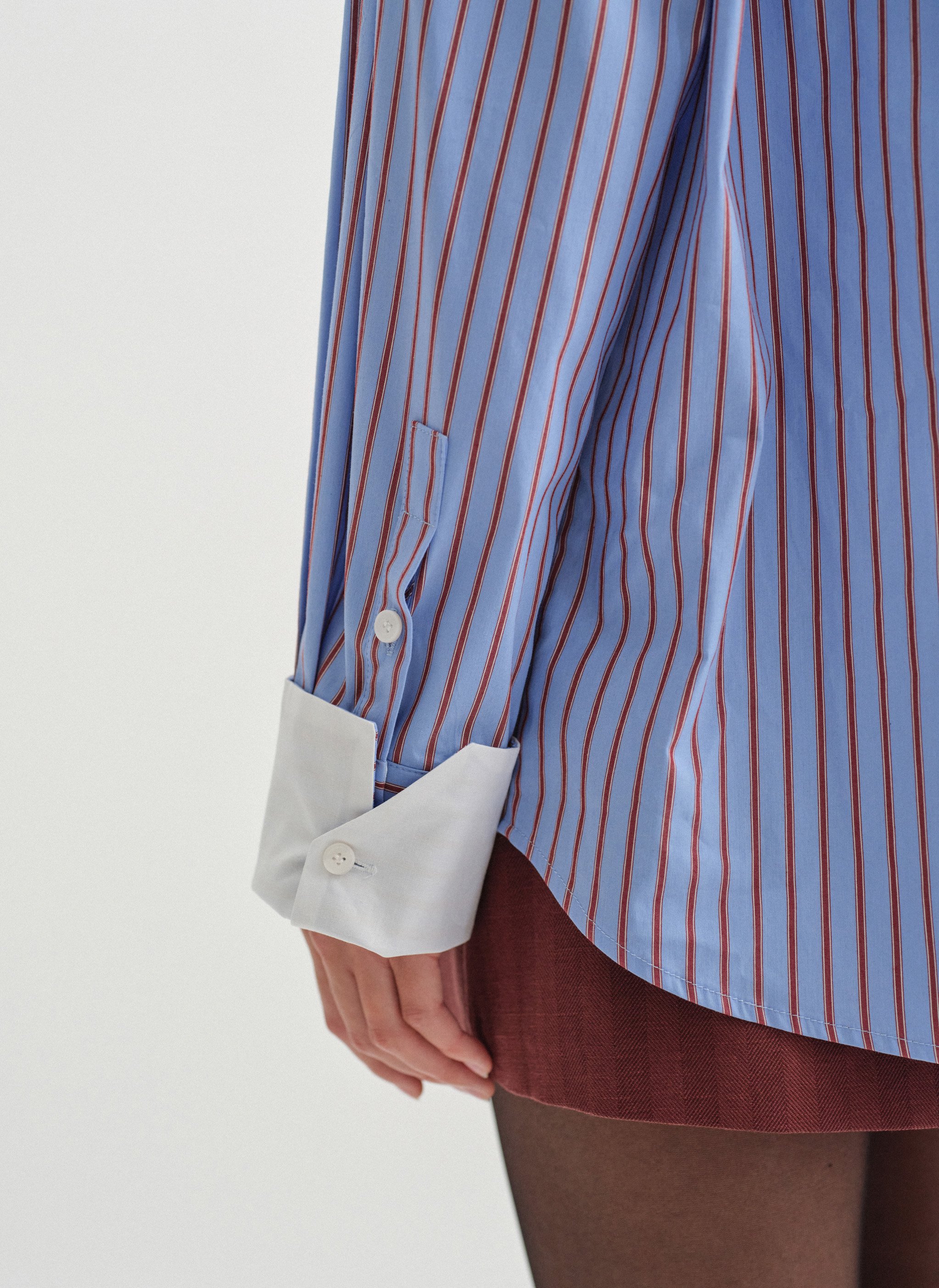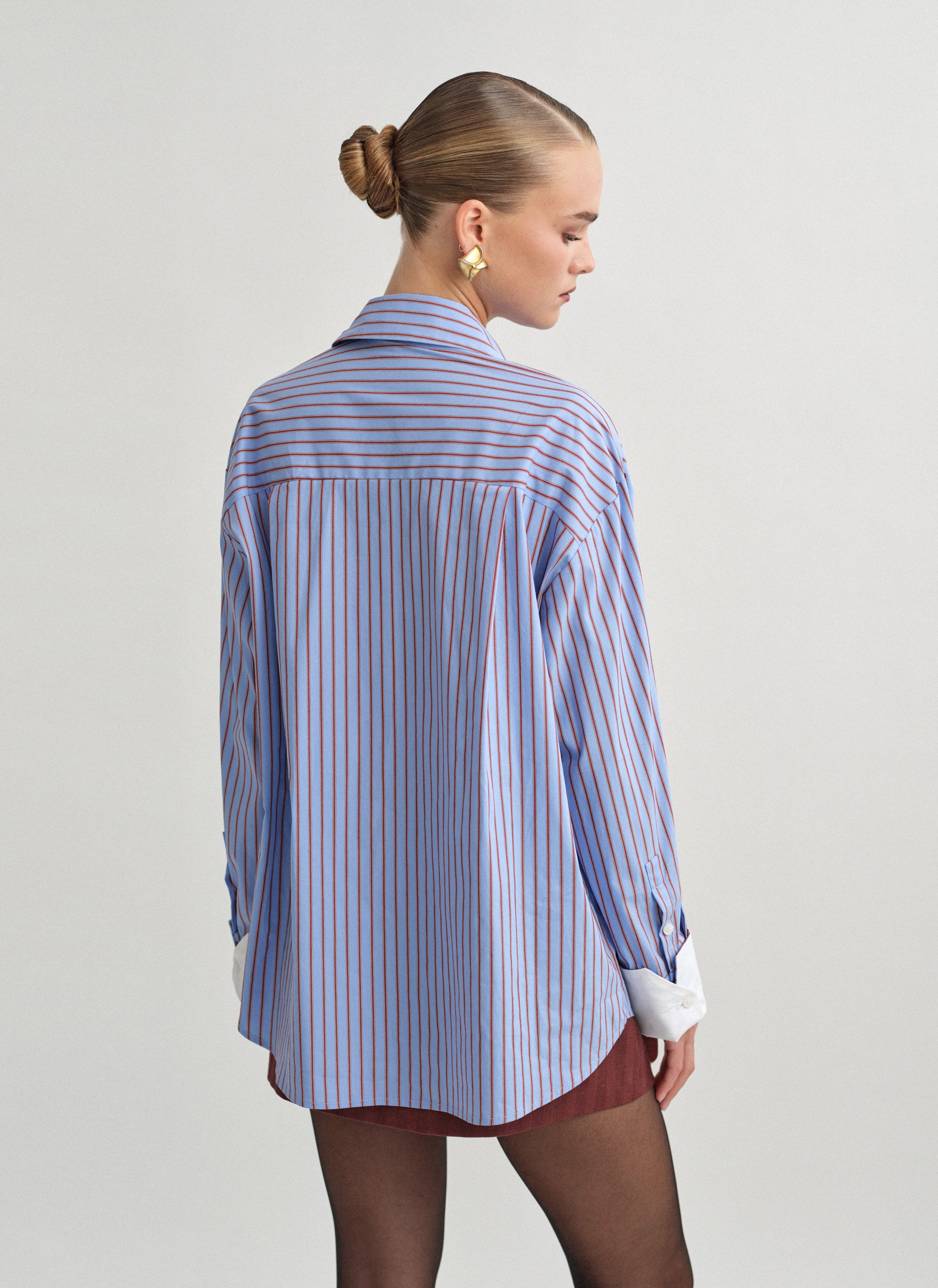 Oversized ριγέ πουκάμισο ποπλίνα με διχρωμία στον λαιμό και τη μανσέτα.