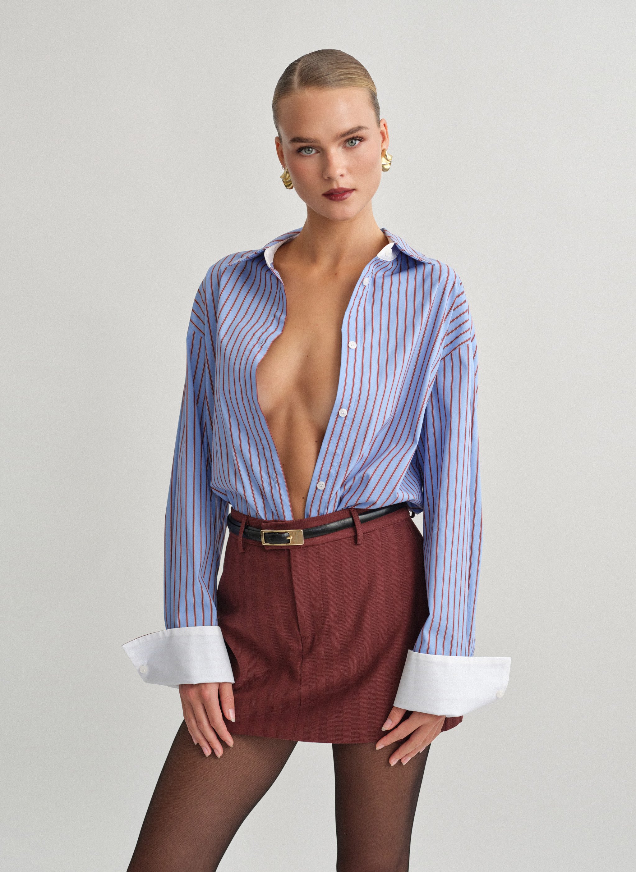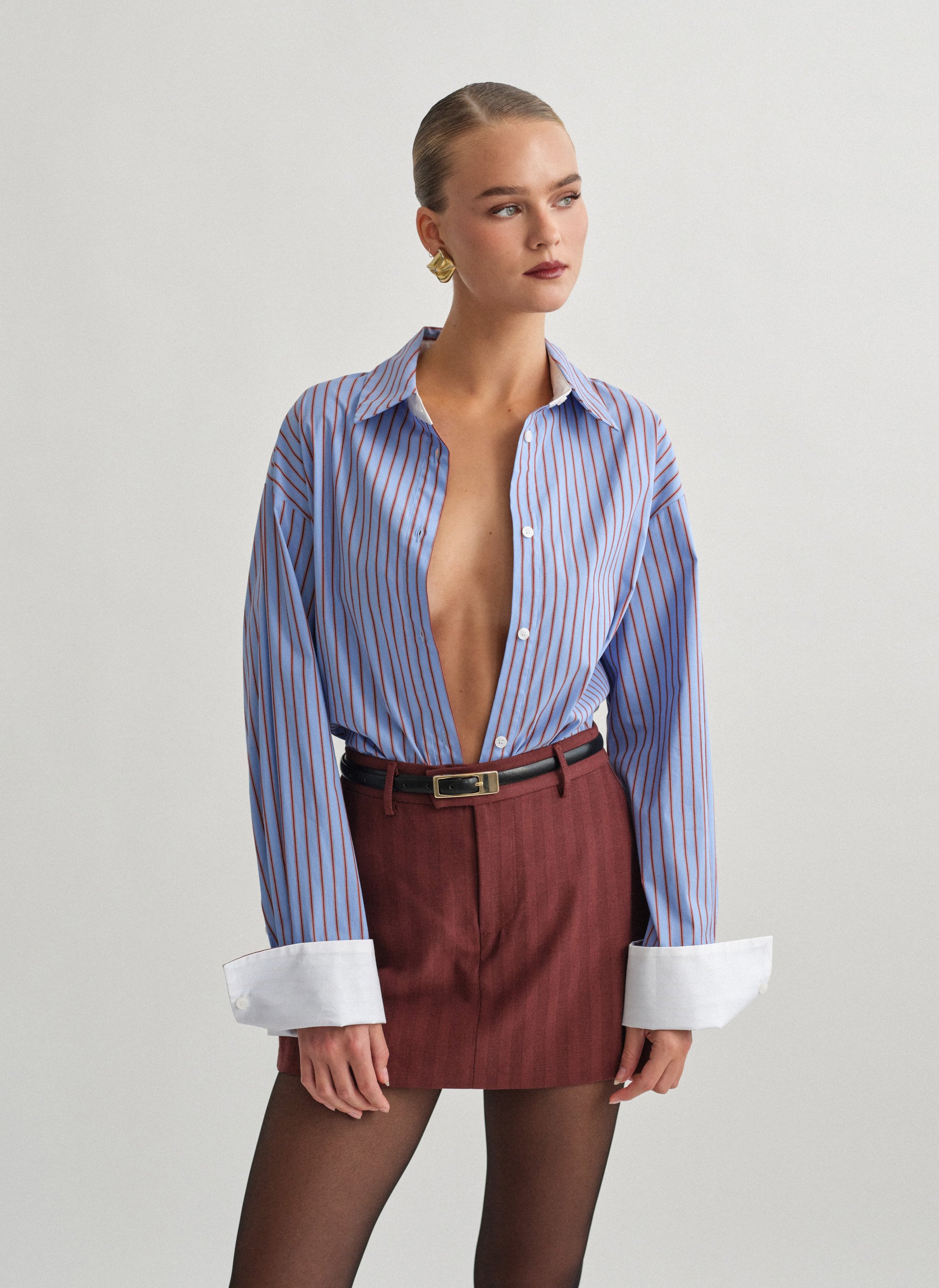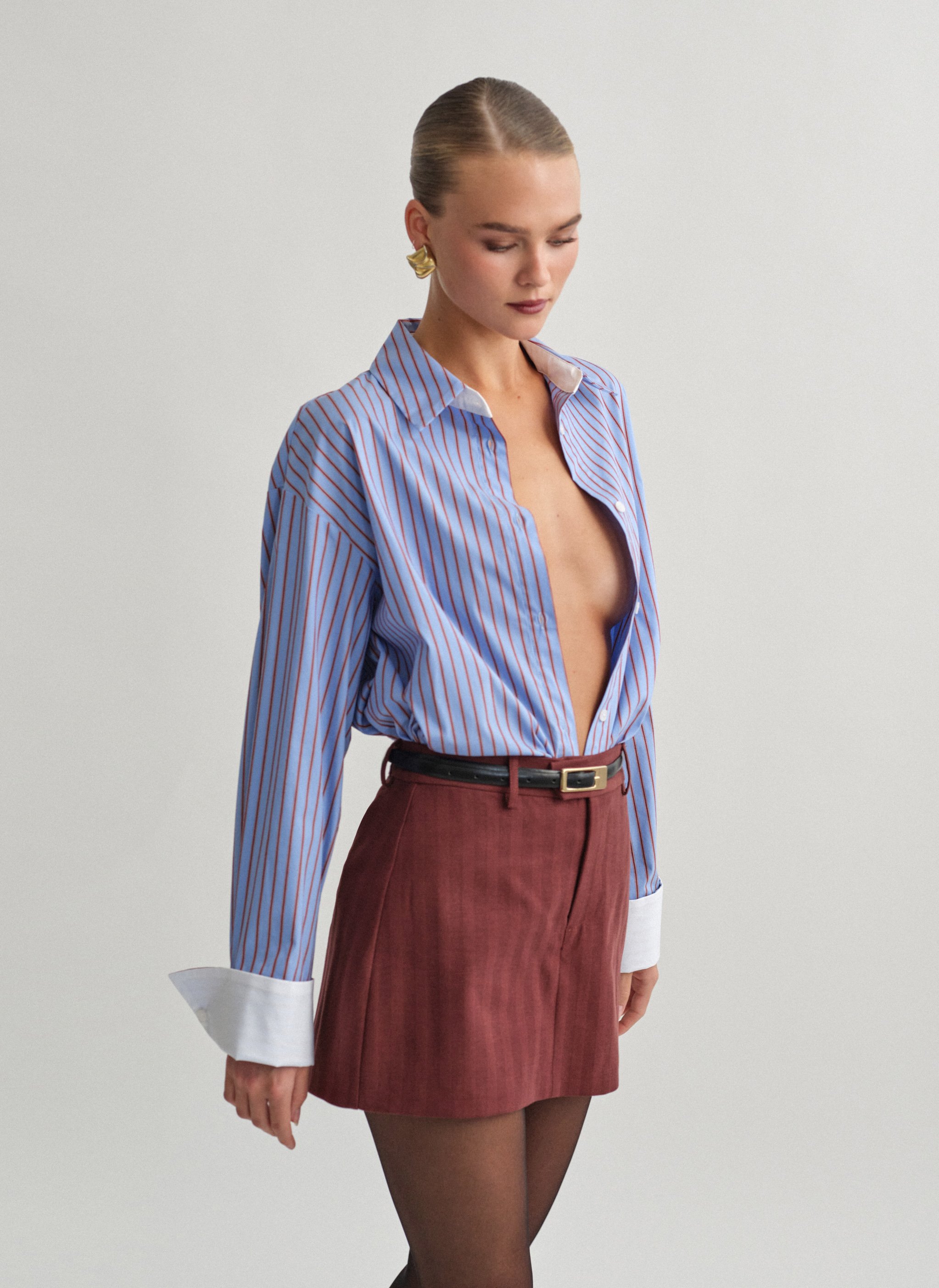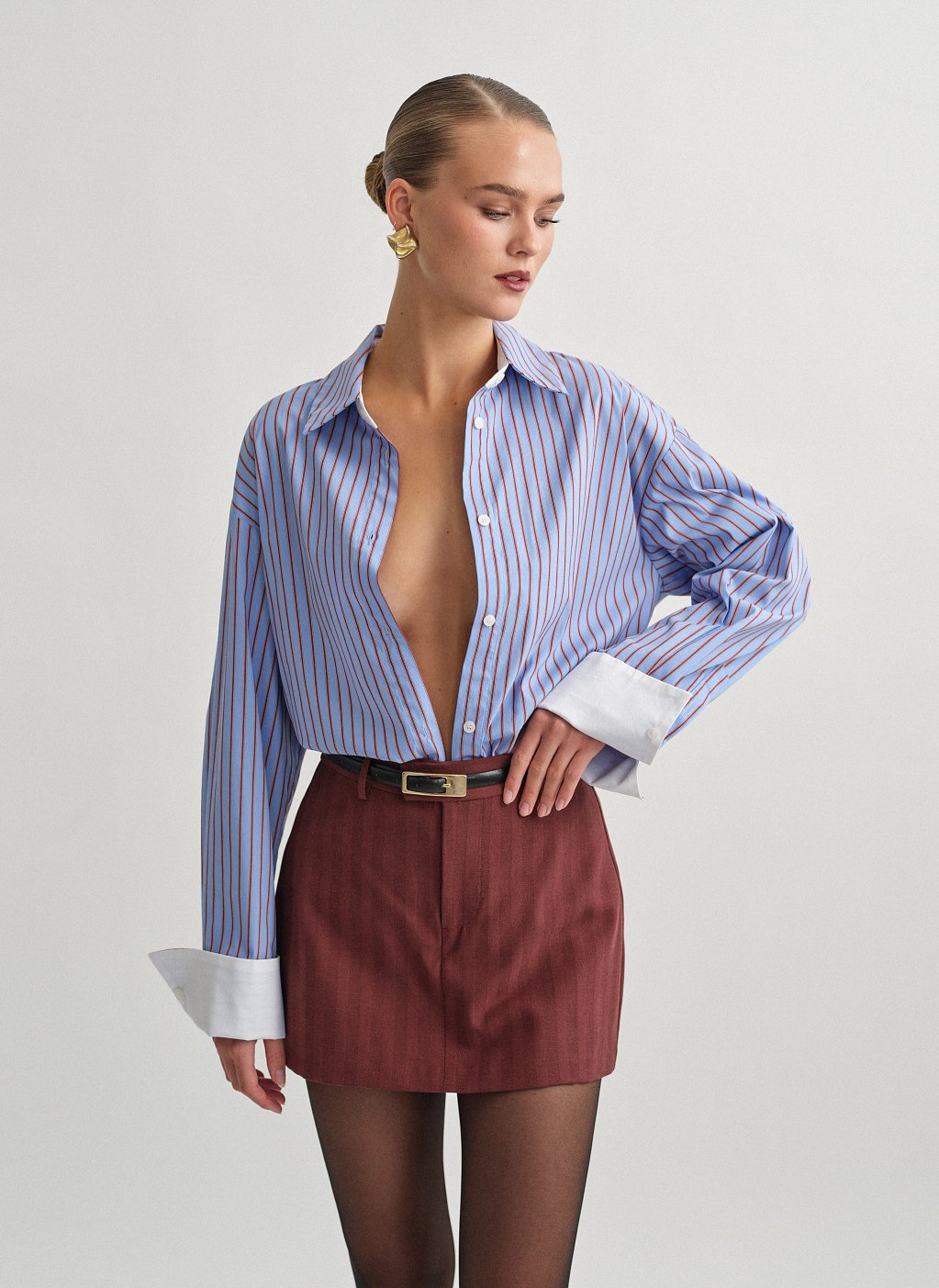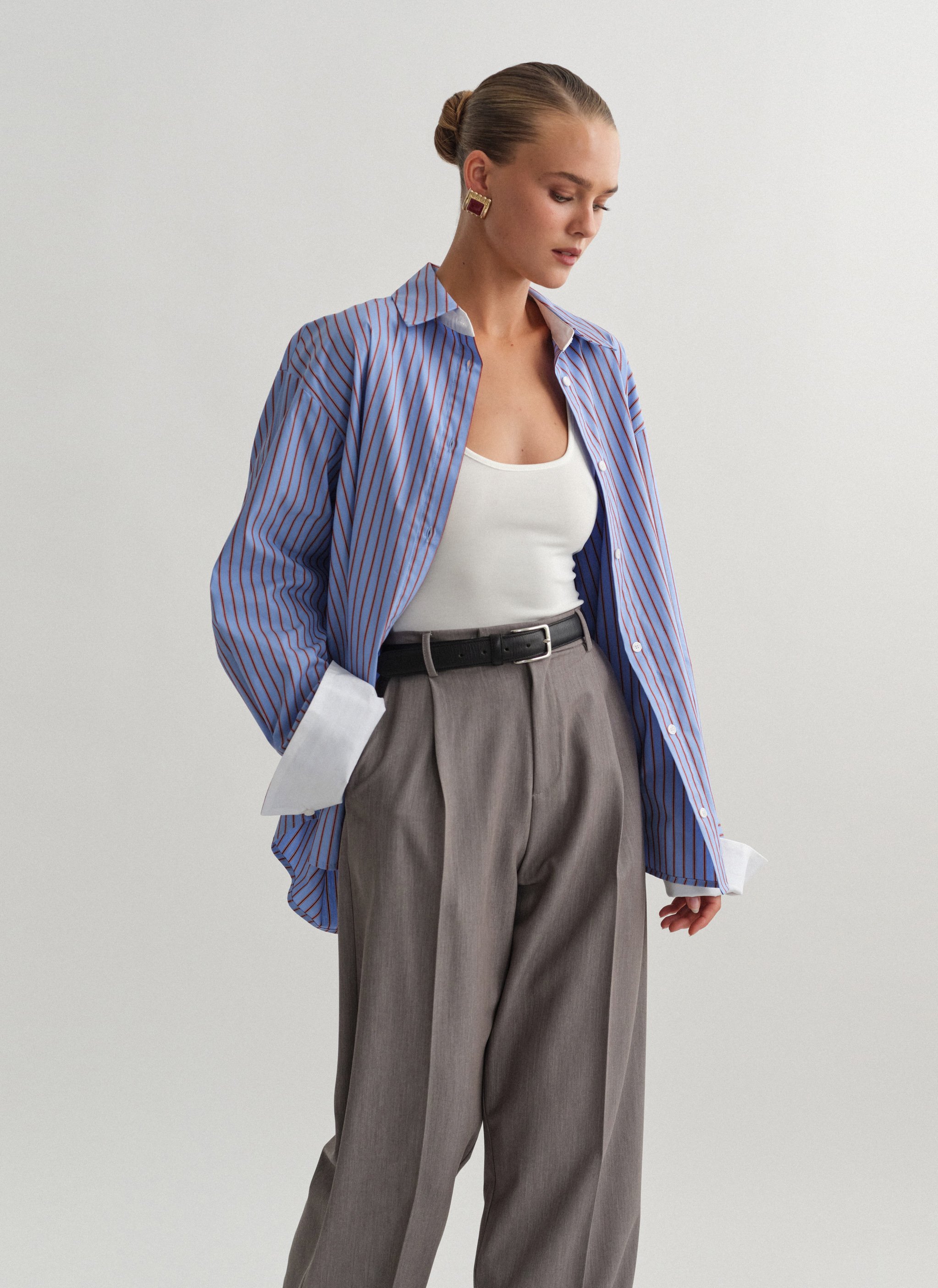 Oversized ριγέ πουκάμισο ποπλίνα με διχρωμία στον λαιμό και τη μανσέτα.