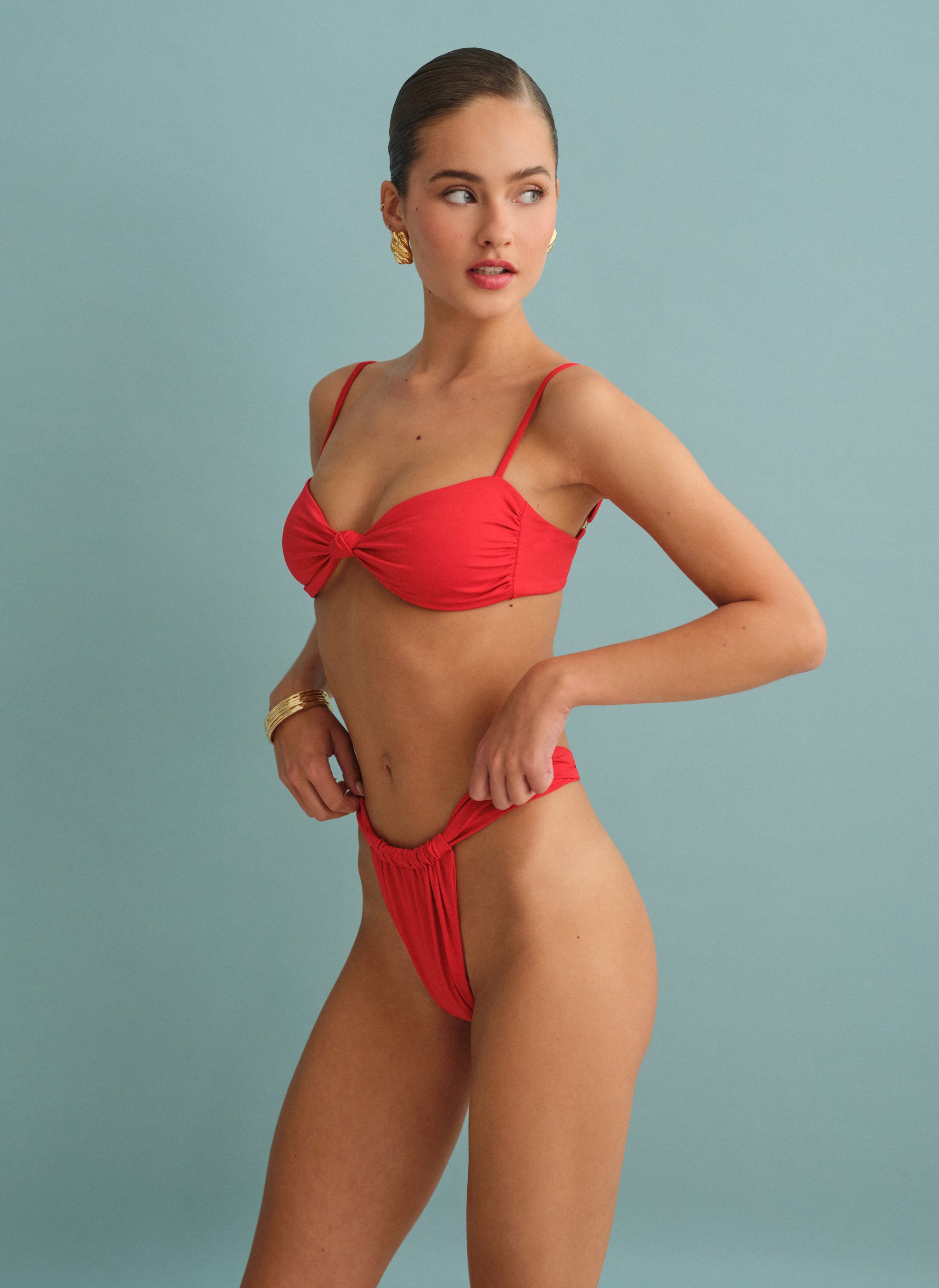 Ελαστικό μπικίνι, τοπ με εφέ σούρες και κόμπο στο κέντρο. Κάτω μέρος με παρτή εφαρμογή και ρυθμιζόμενο φάρδος με σούρες. Πωλείται ως σετ