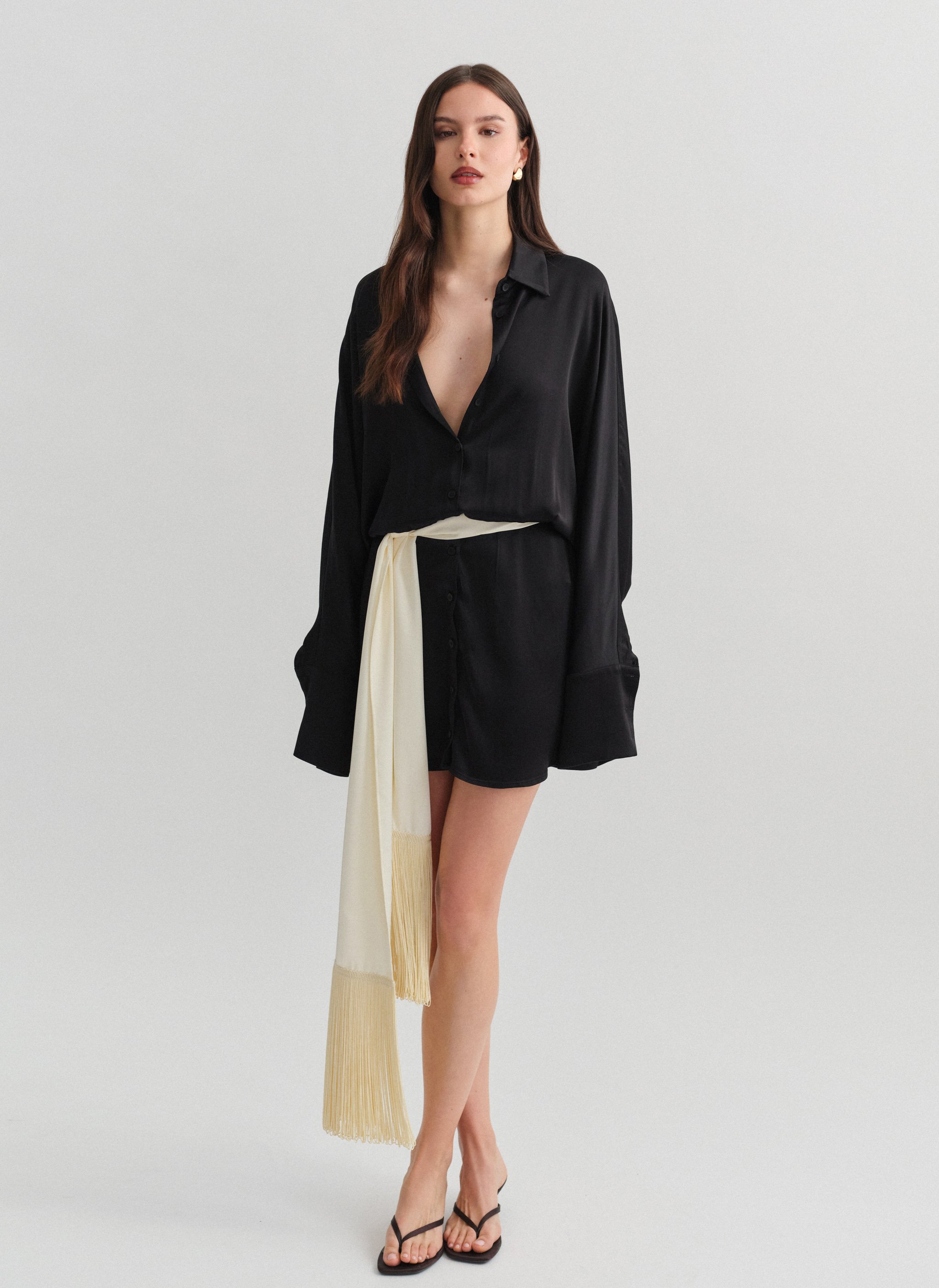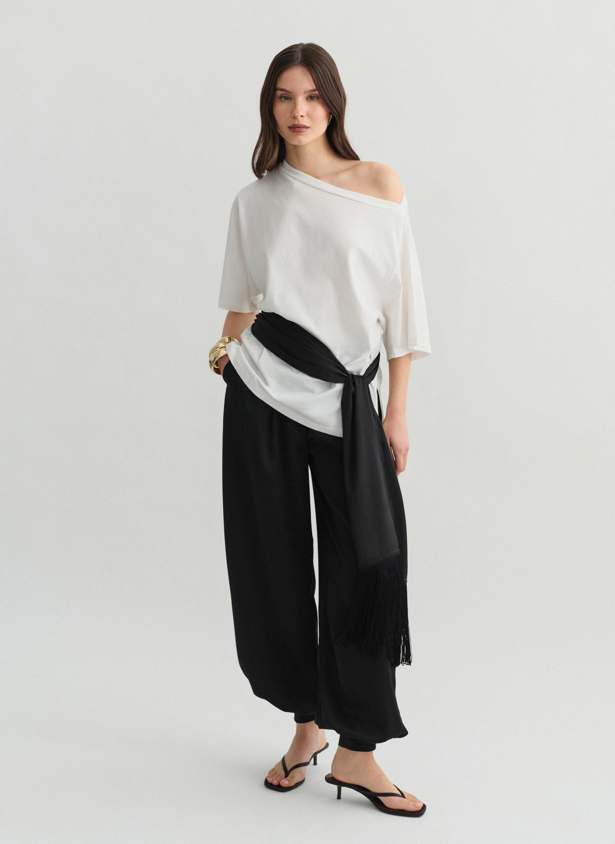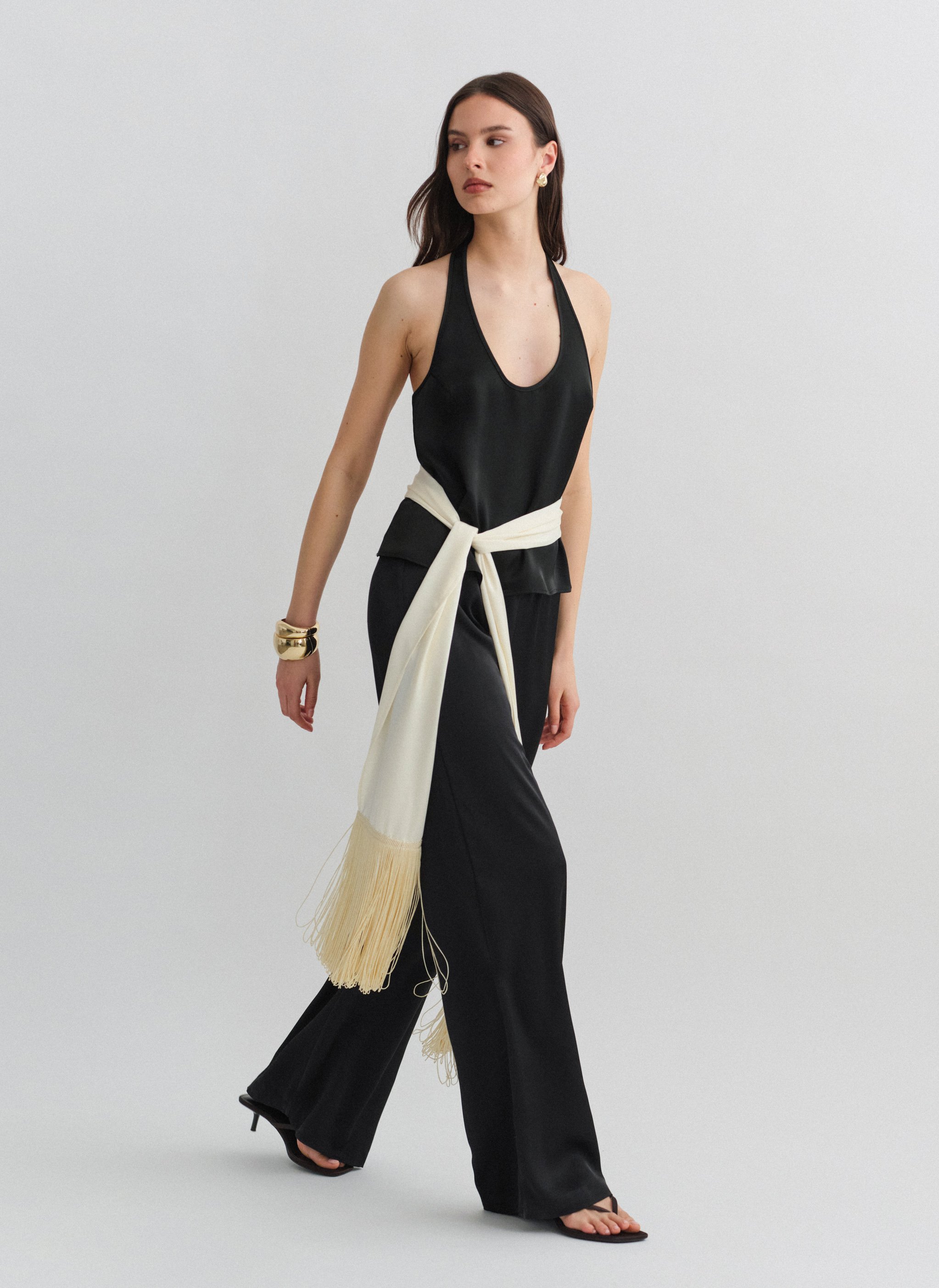 Φουλάρι σε όψη σατέν, με κρόσσια στο τελείωμα.