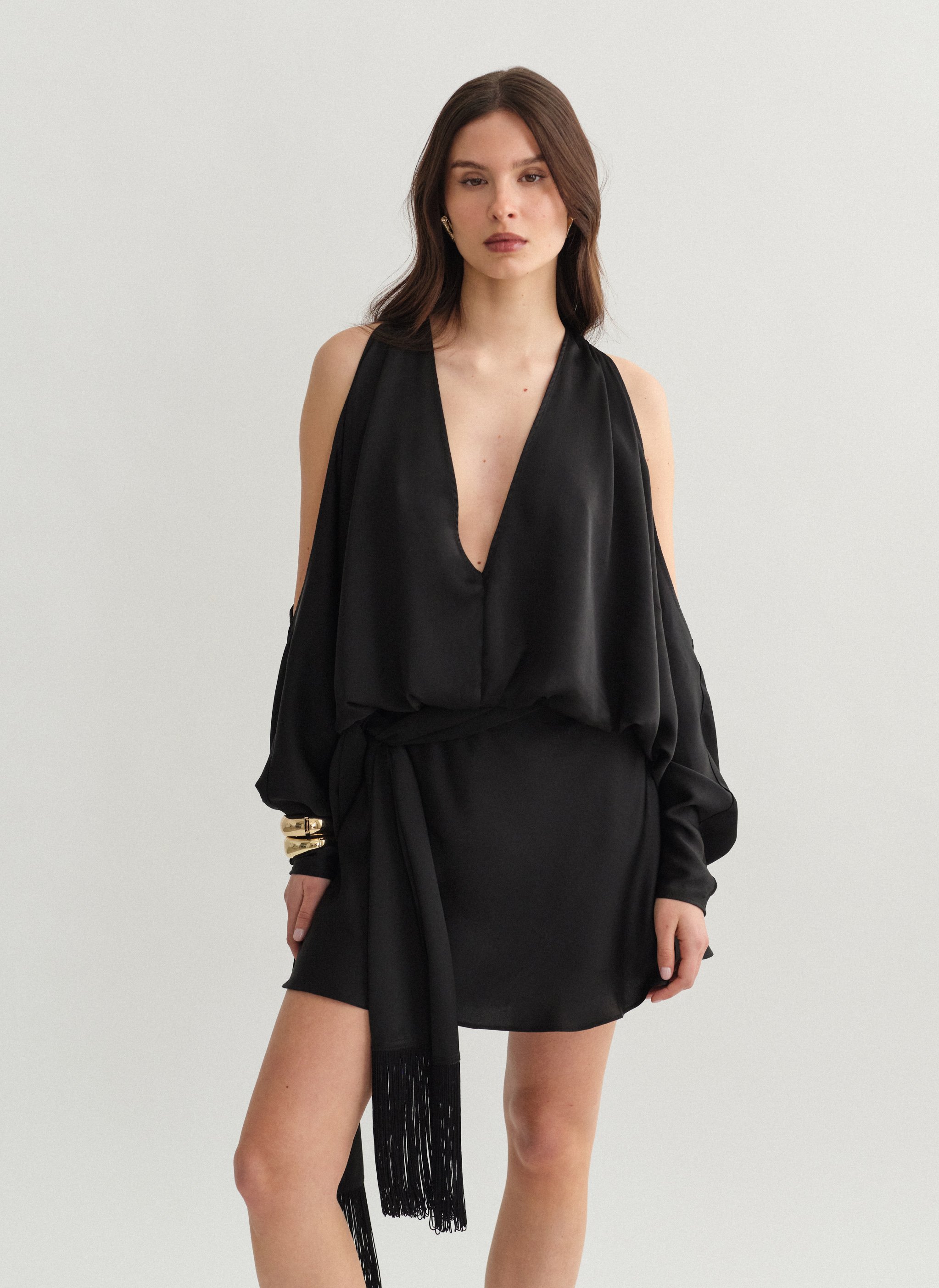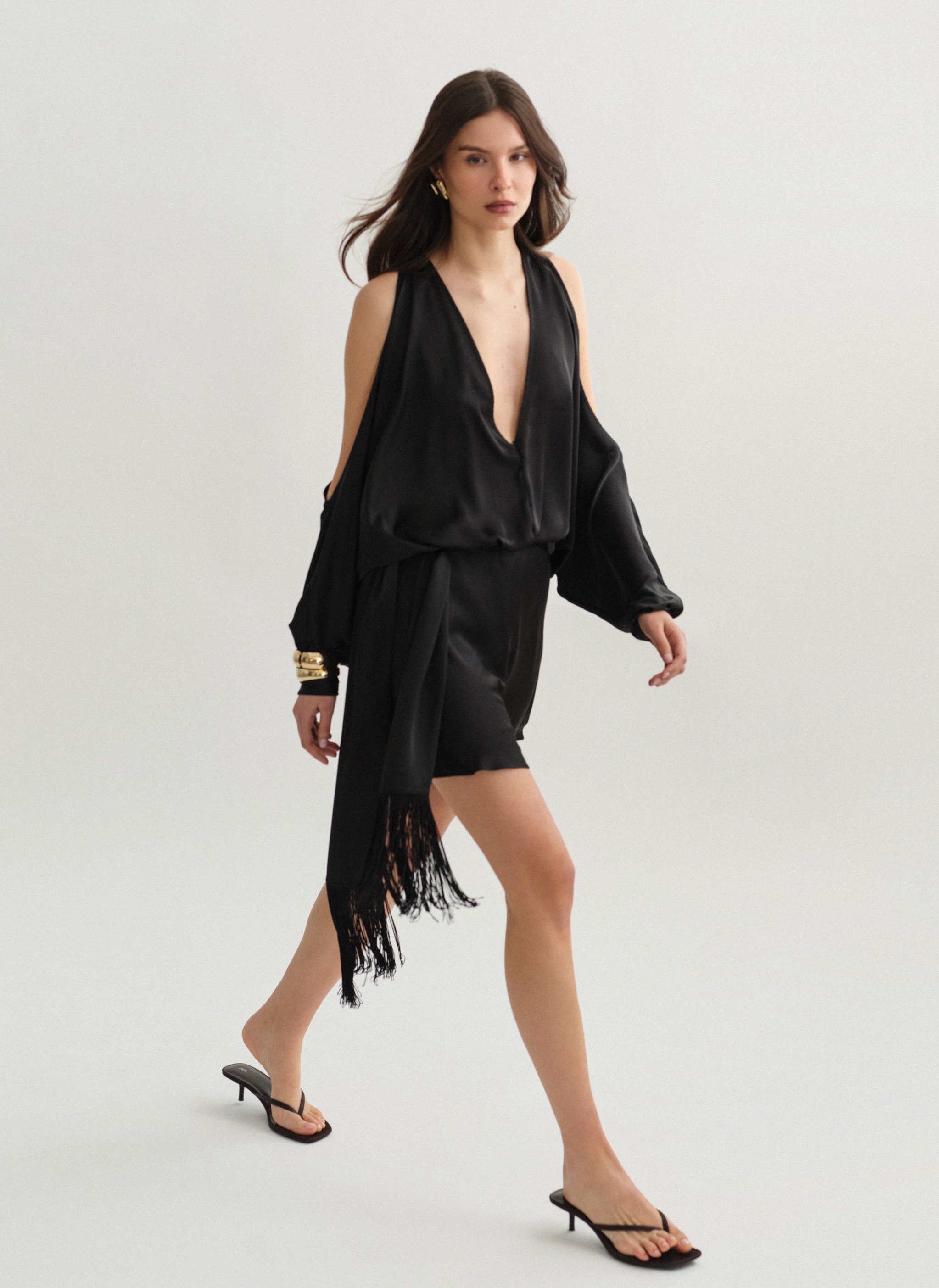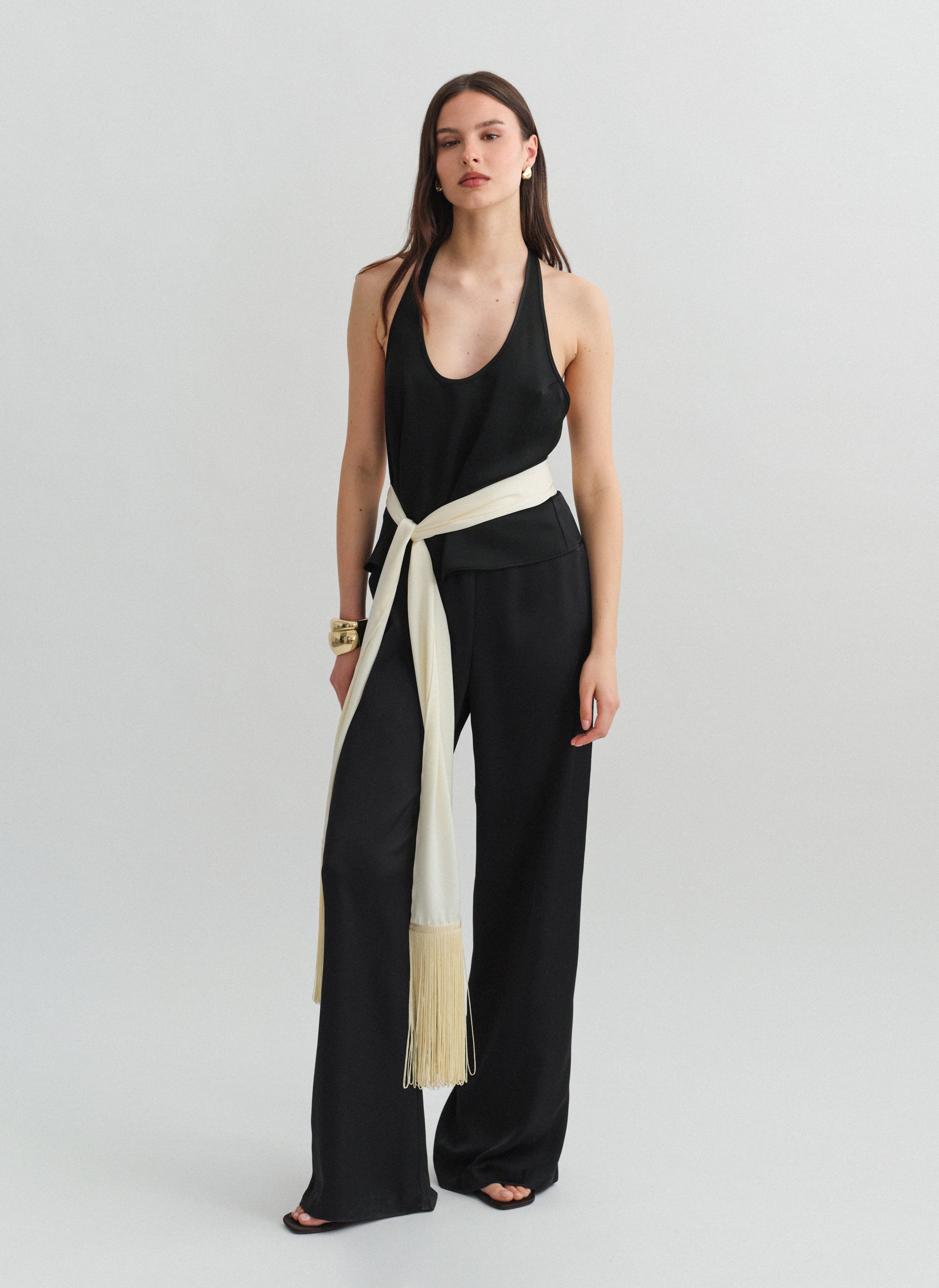 Φουλάρι σε όψη σατέν, με κρόσσια στο τελείωμα.