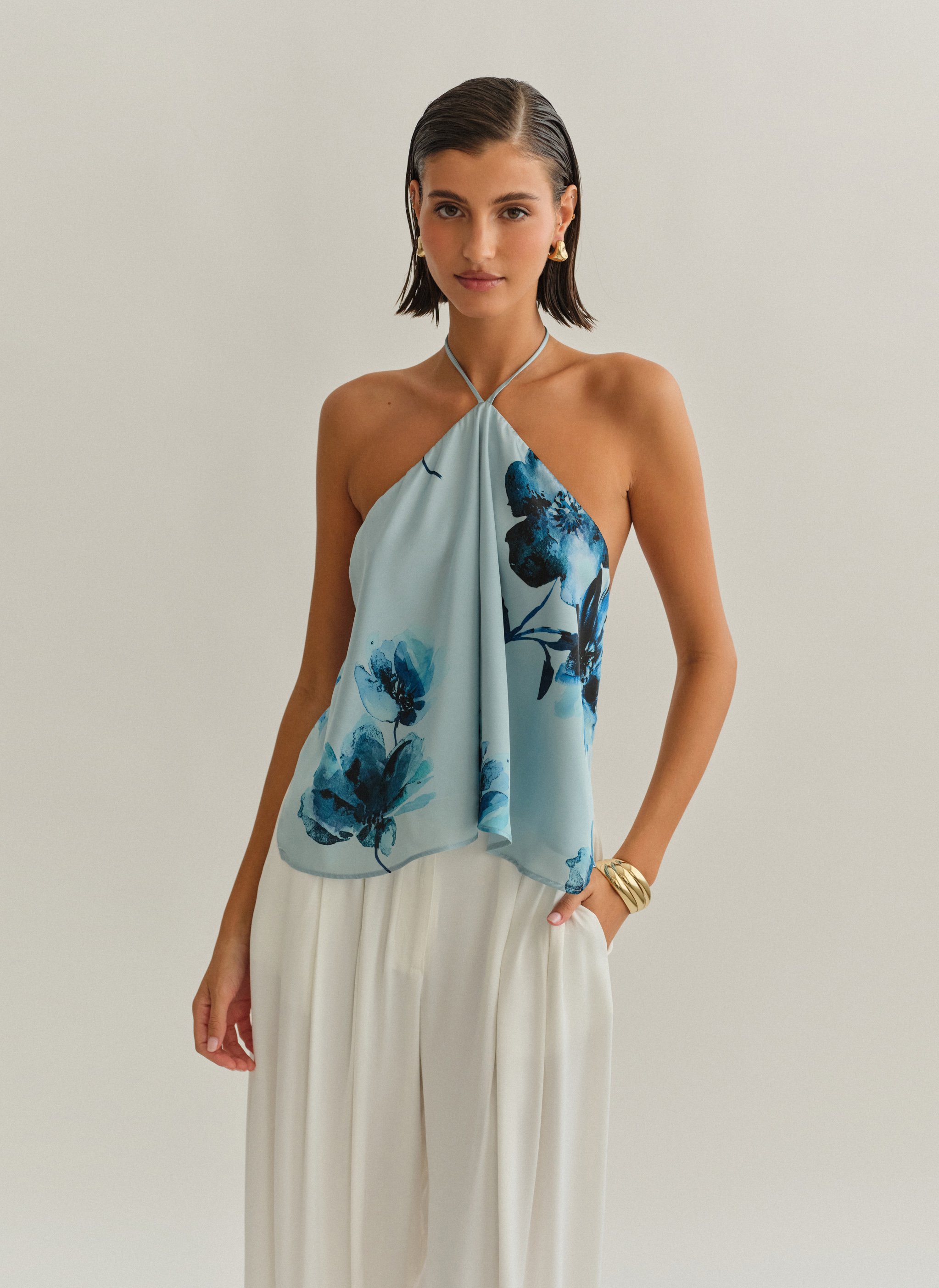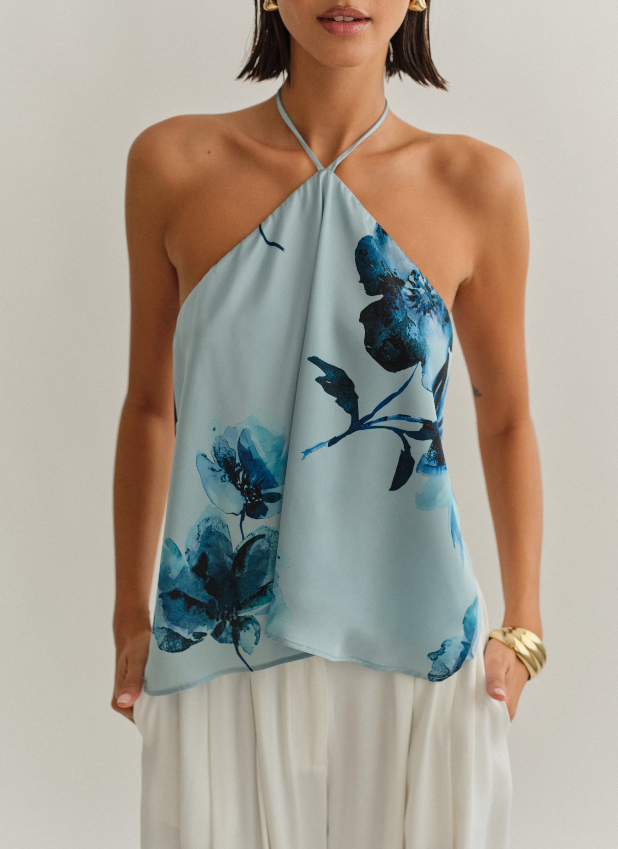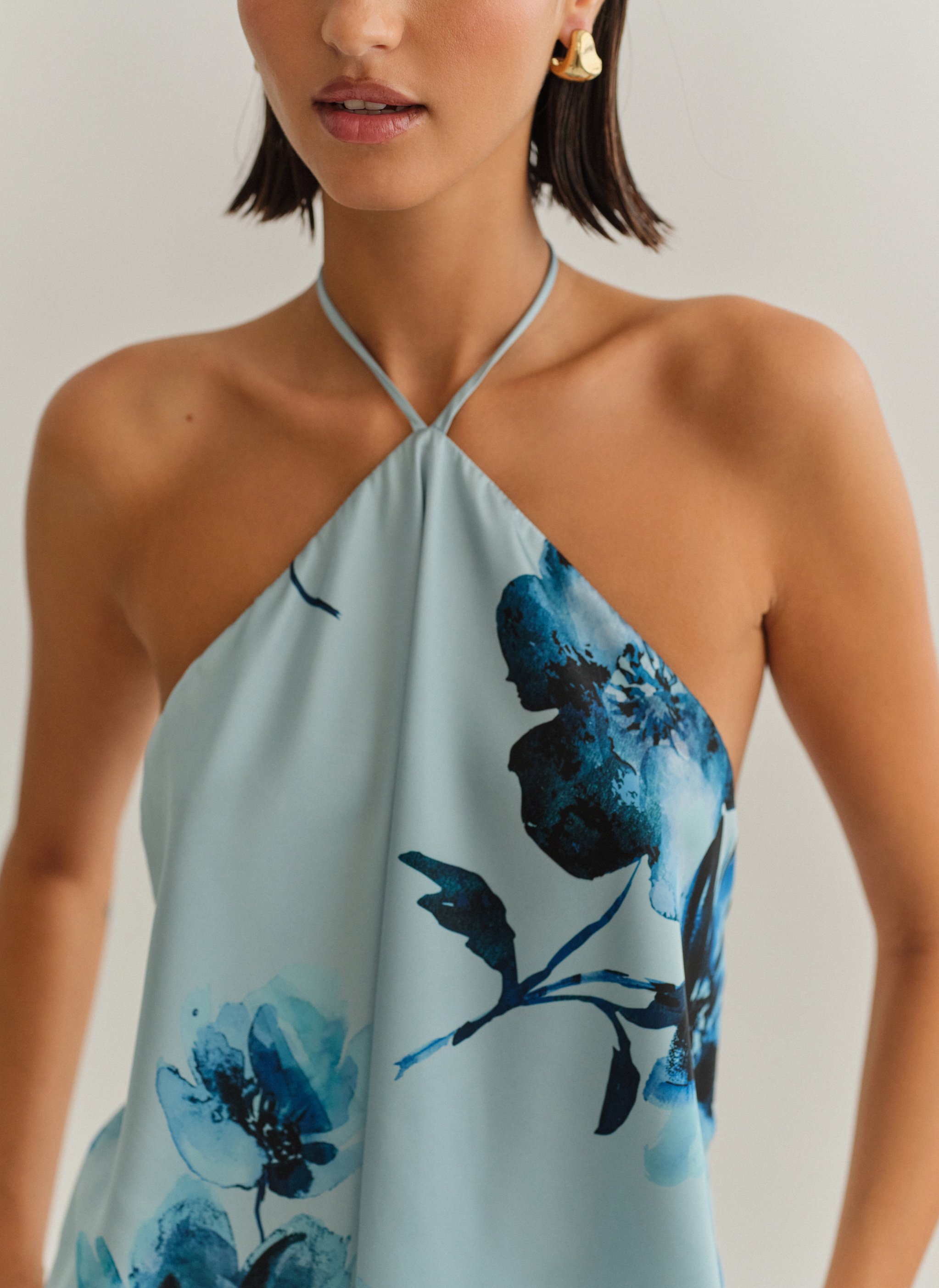 Σατέν halter τοπ εμπριμέ με ανοιχτή πλάτη και αποσπώμενη αλυσίδα με ρυθμιζόμενο κούμπωμα.