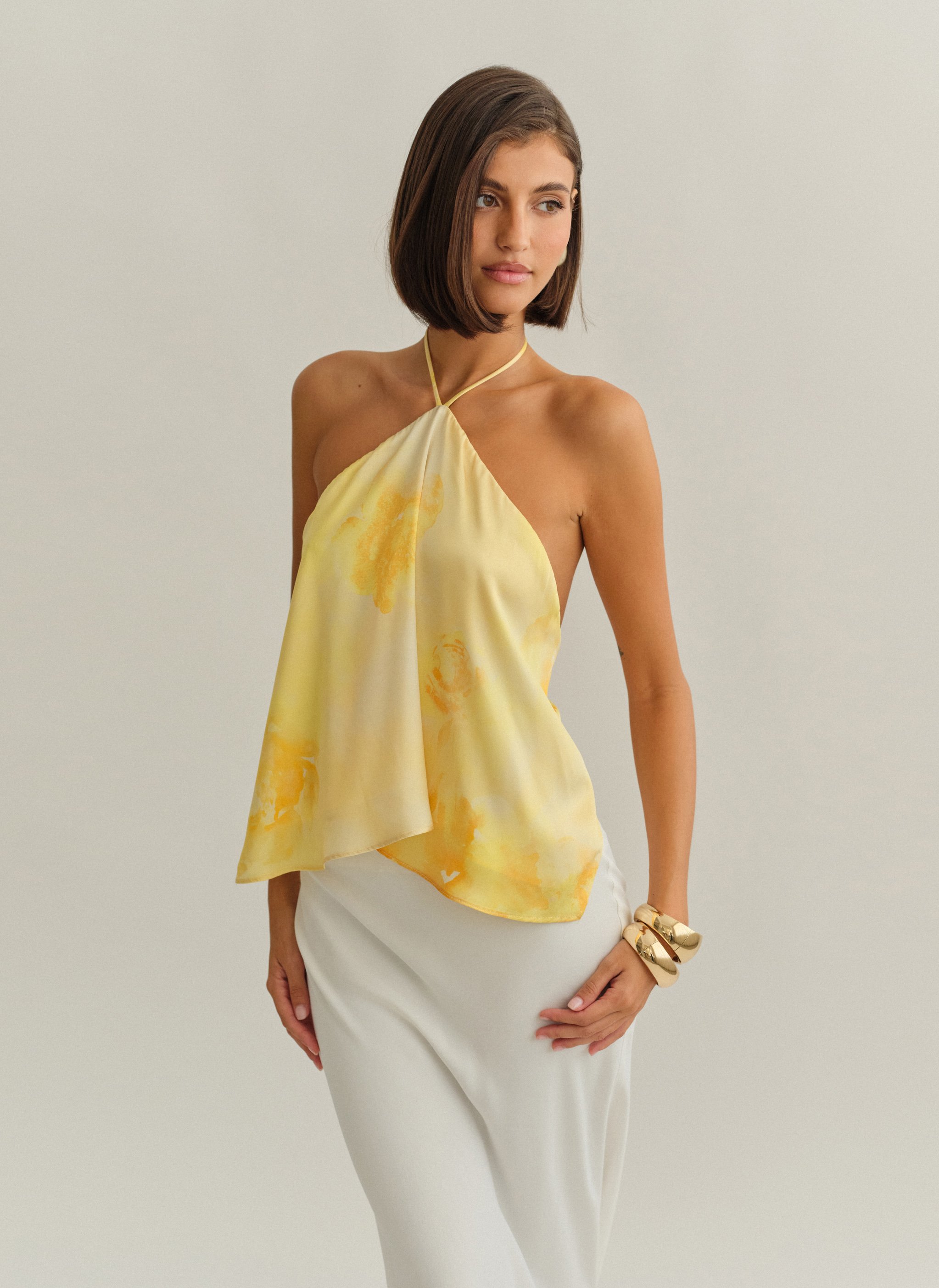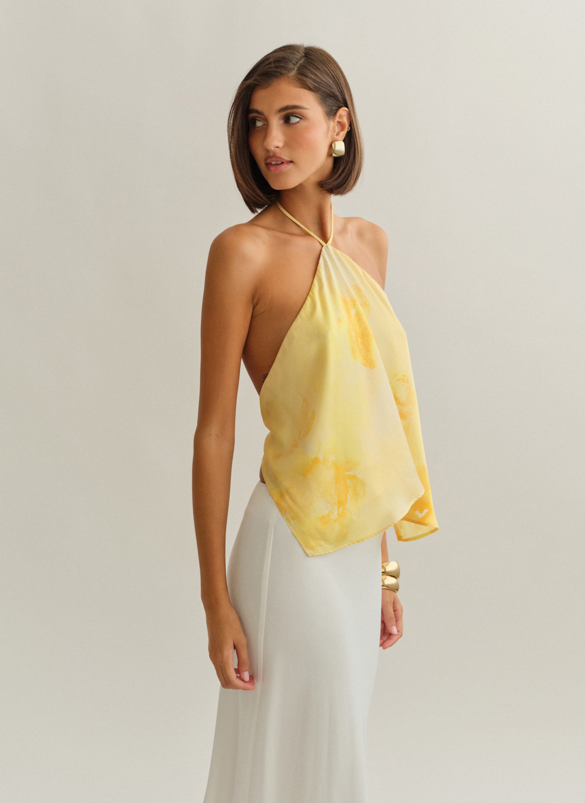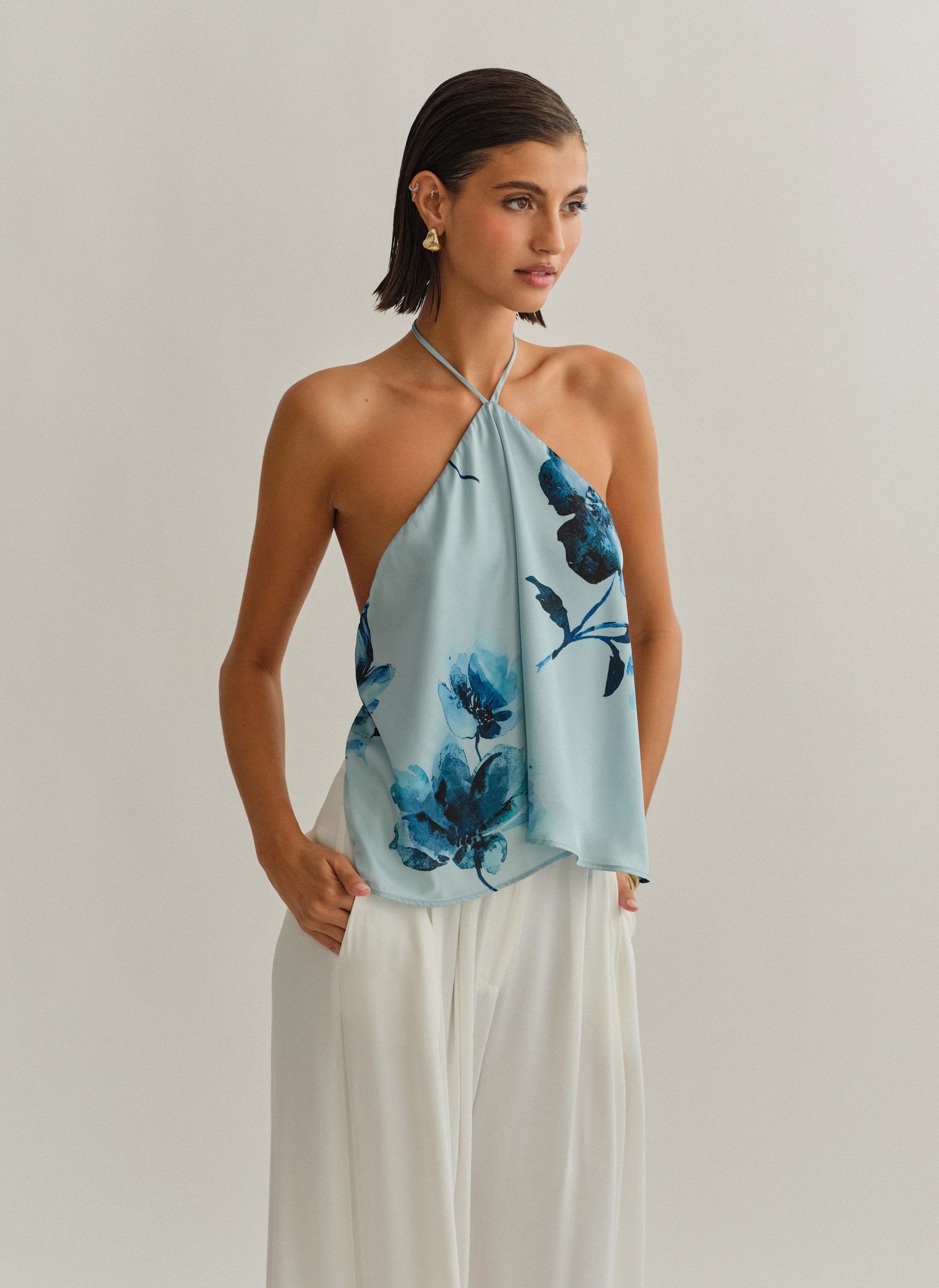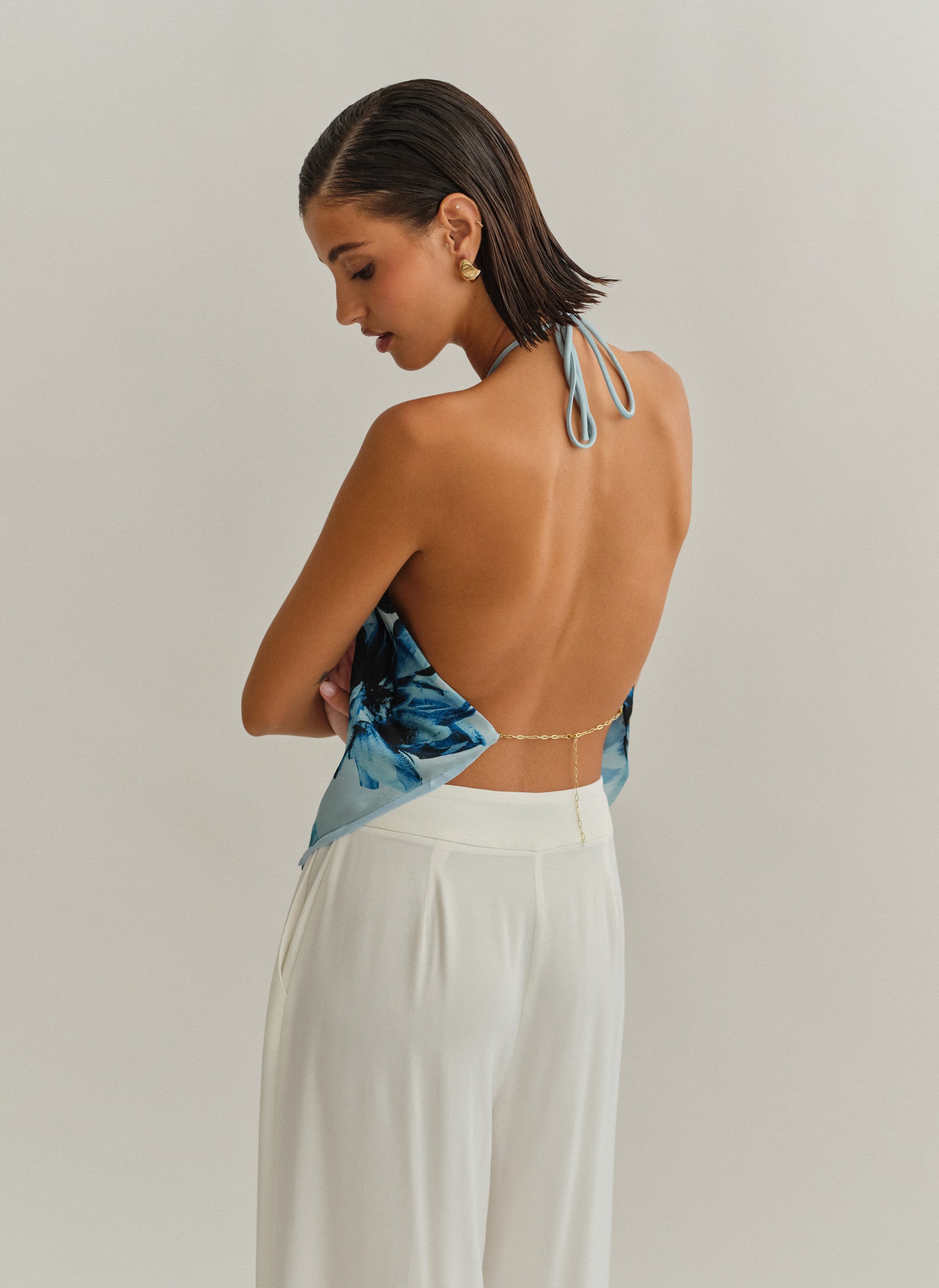 Σατέν halter τοπ εμπριμέ με ανοιχτή πλάτη και αποσπώμενη αλυσίδα με ρυθμιζόμενο κούμπωμα.