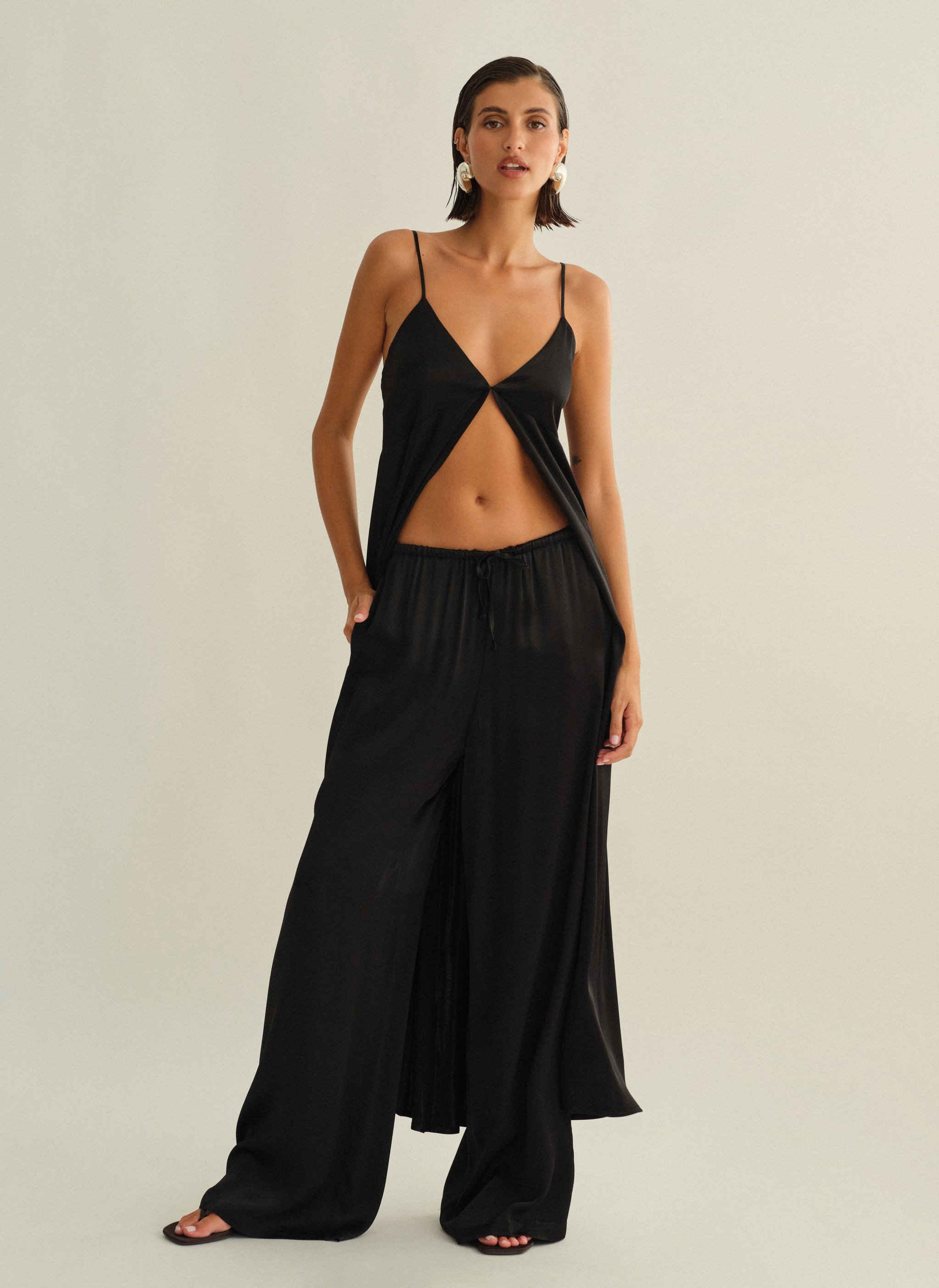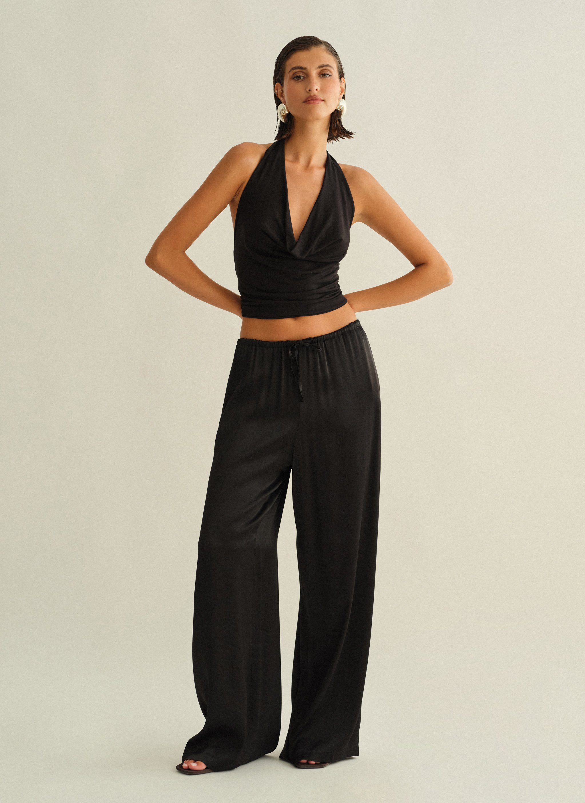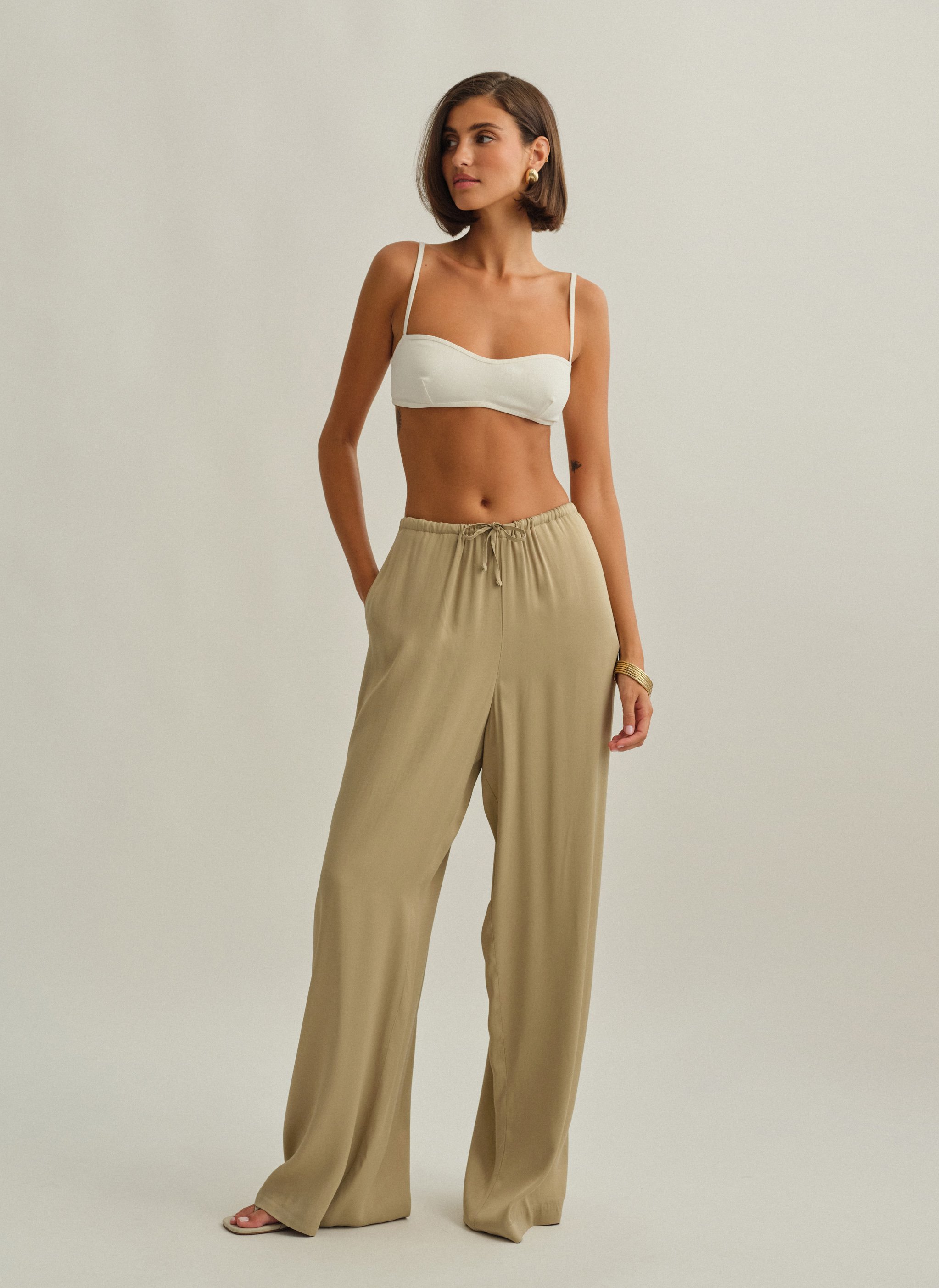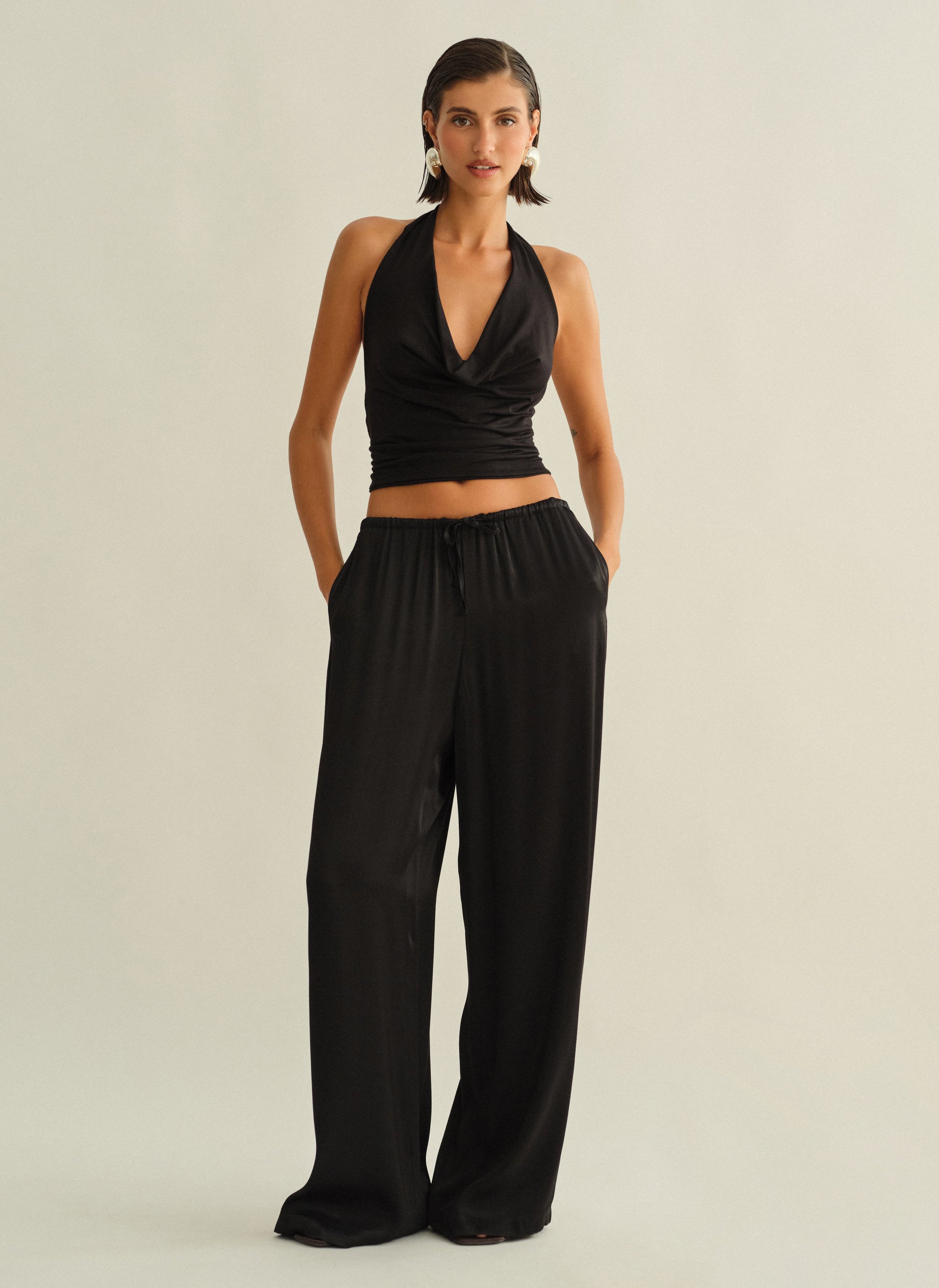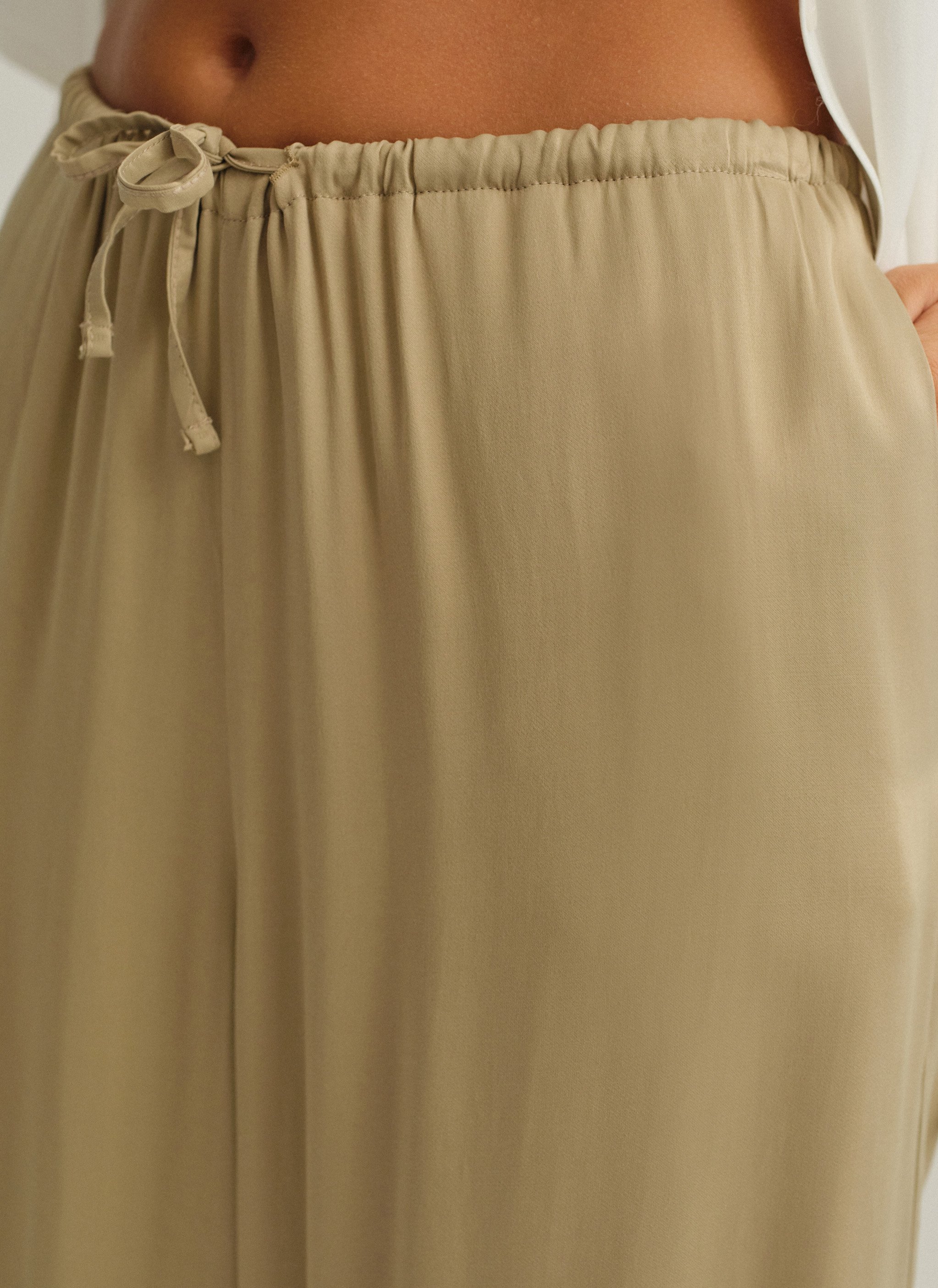 Σατέν παντελόνι με λάστιχο και δέσιμο στη μέση με κορδόνι.