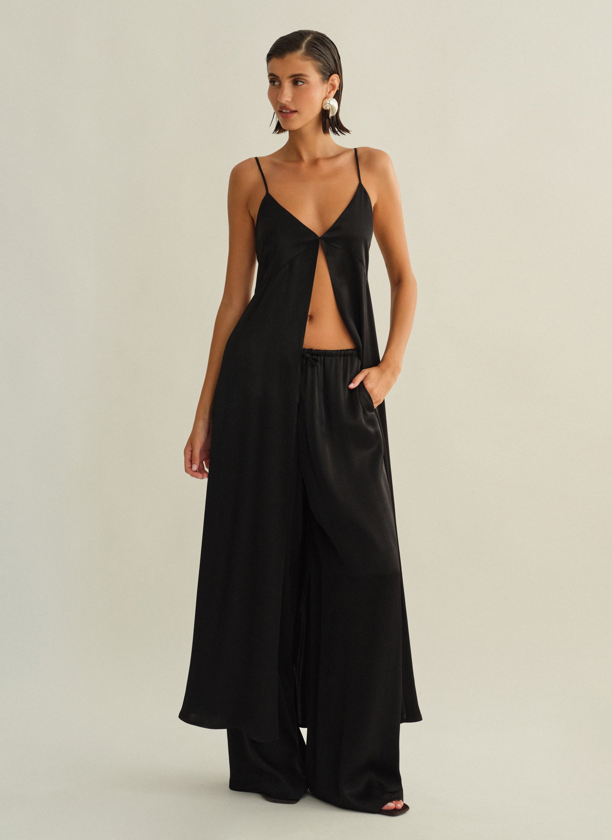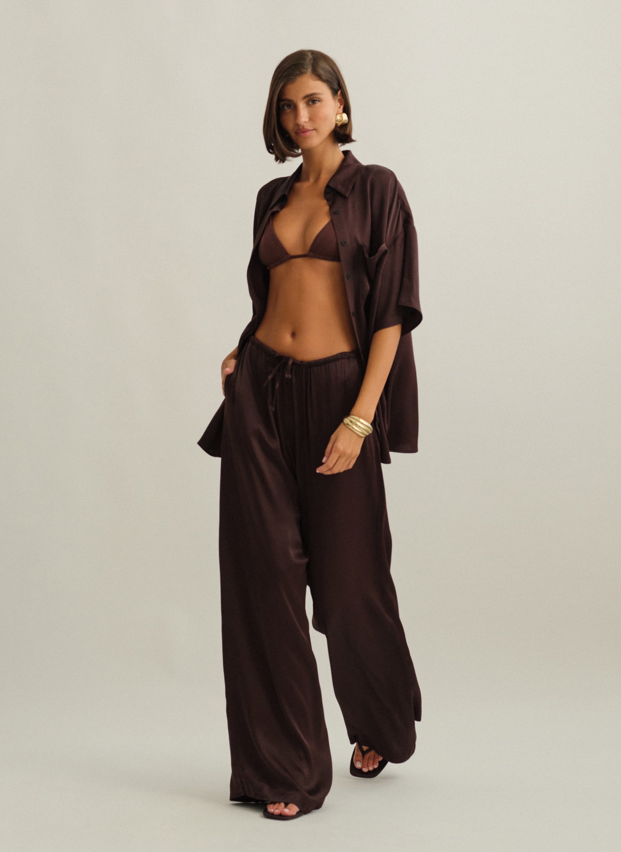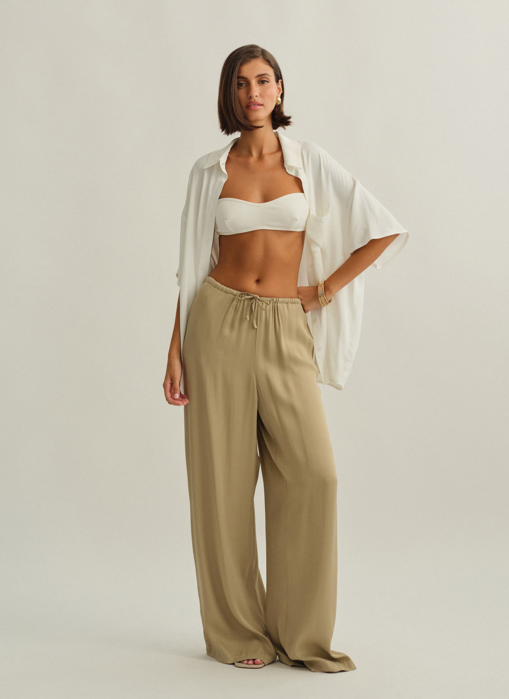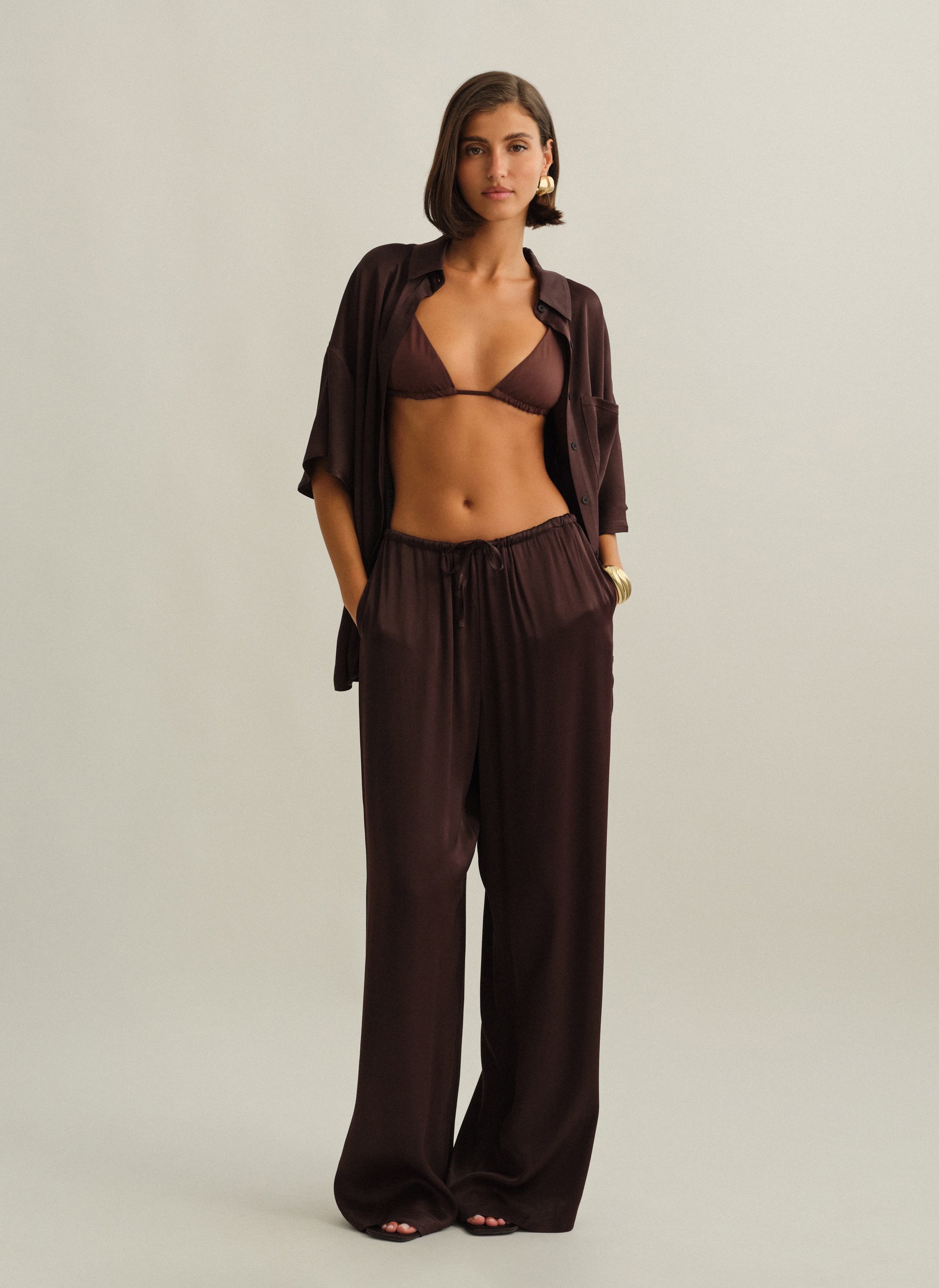 Σατέν παντελόνι με λάστιχο και δέσιμο στη μέση με κορδόνι.
