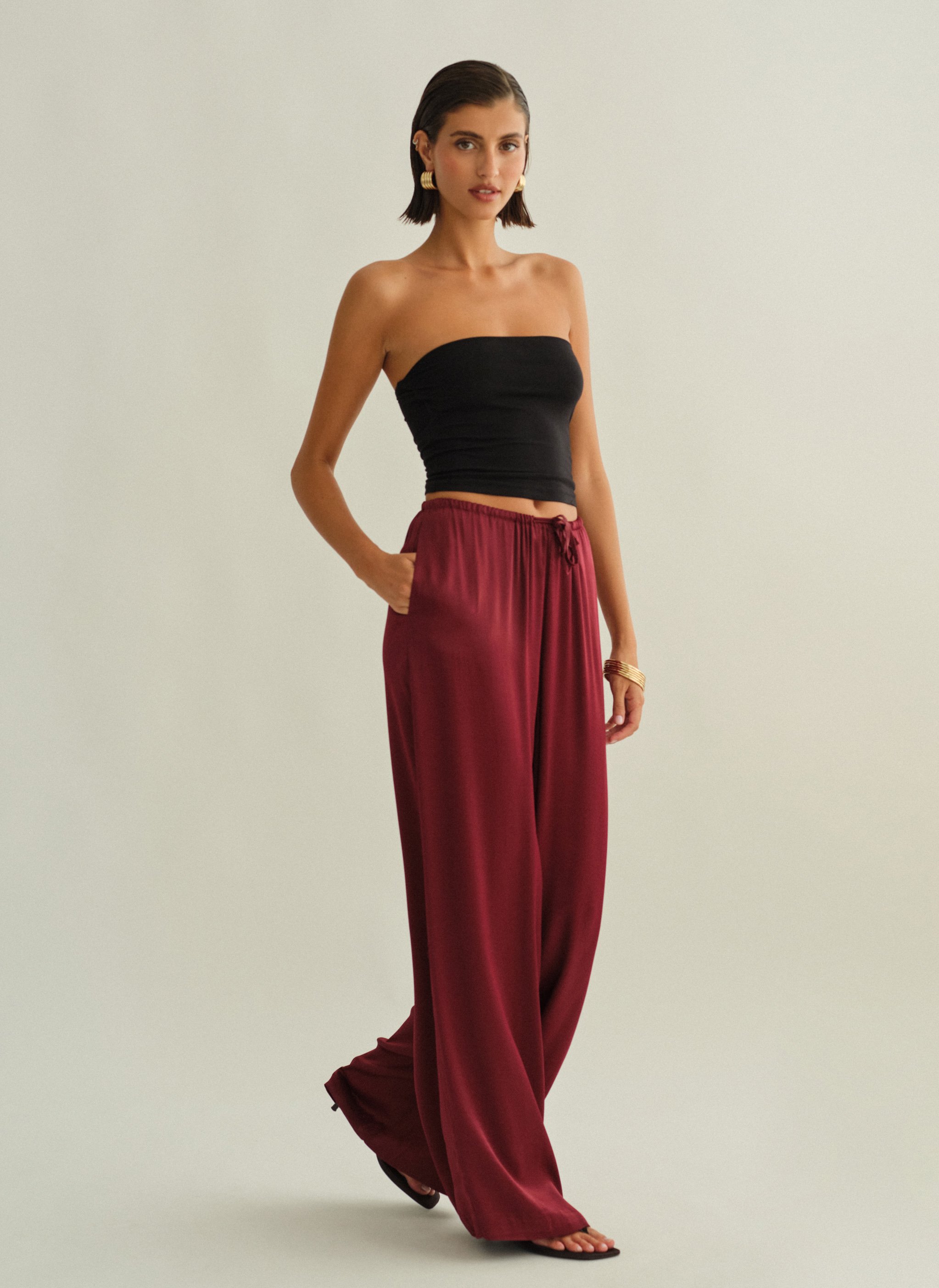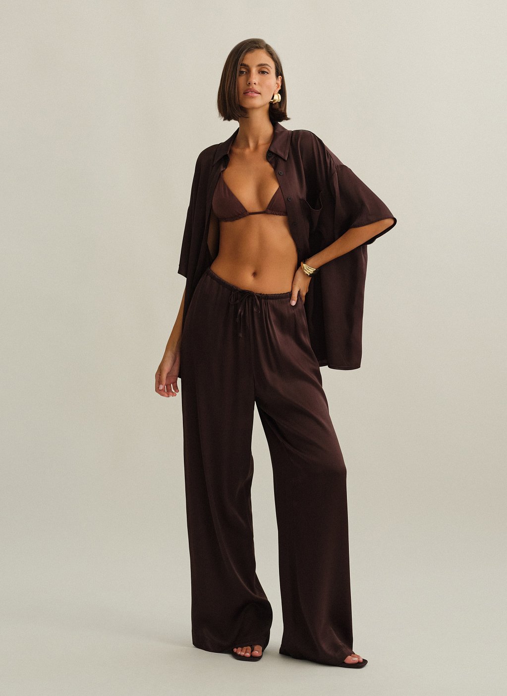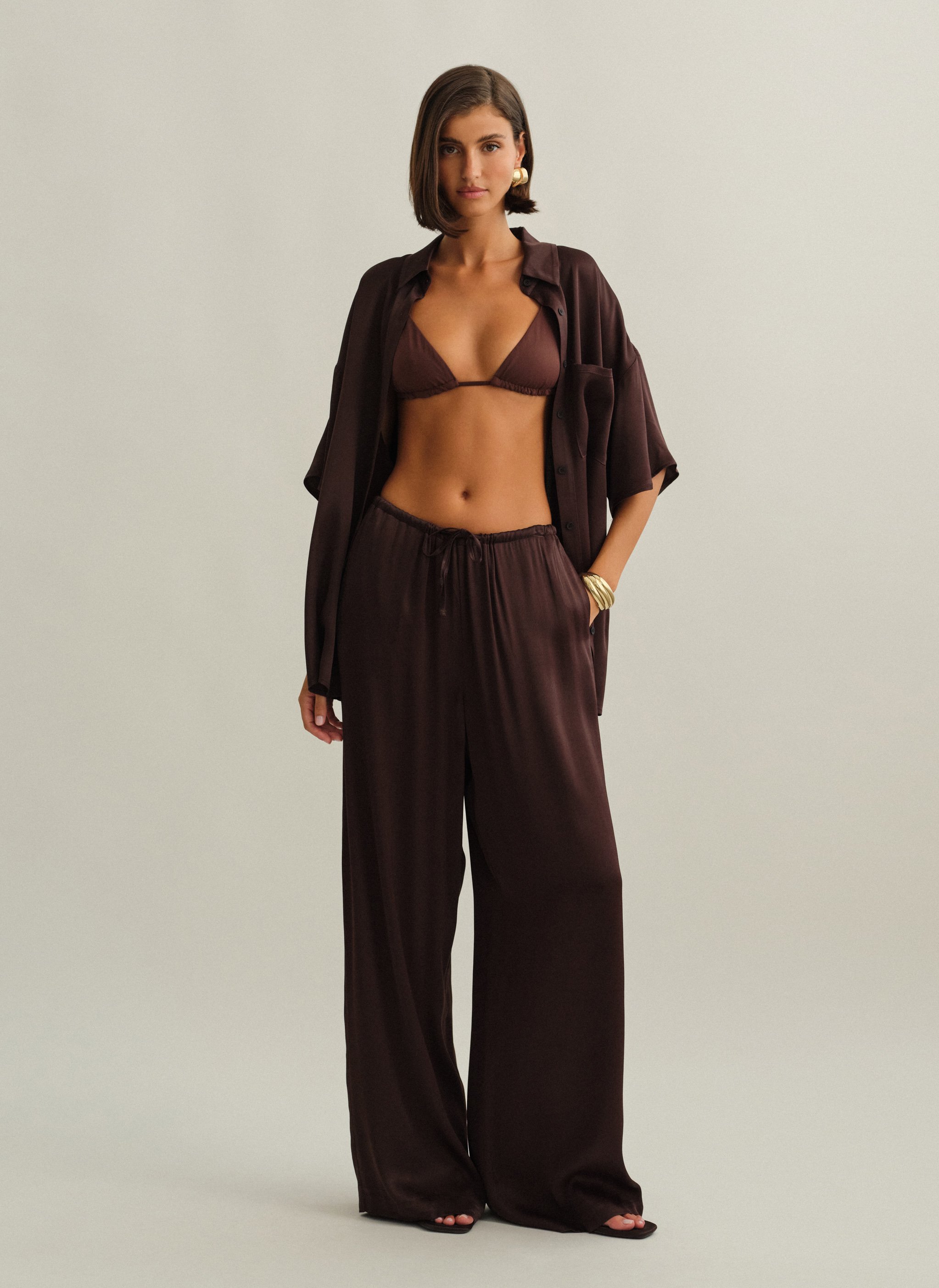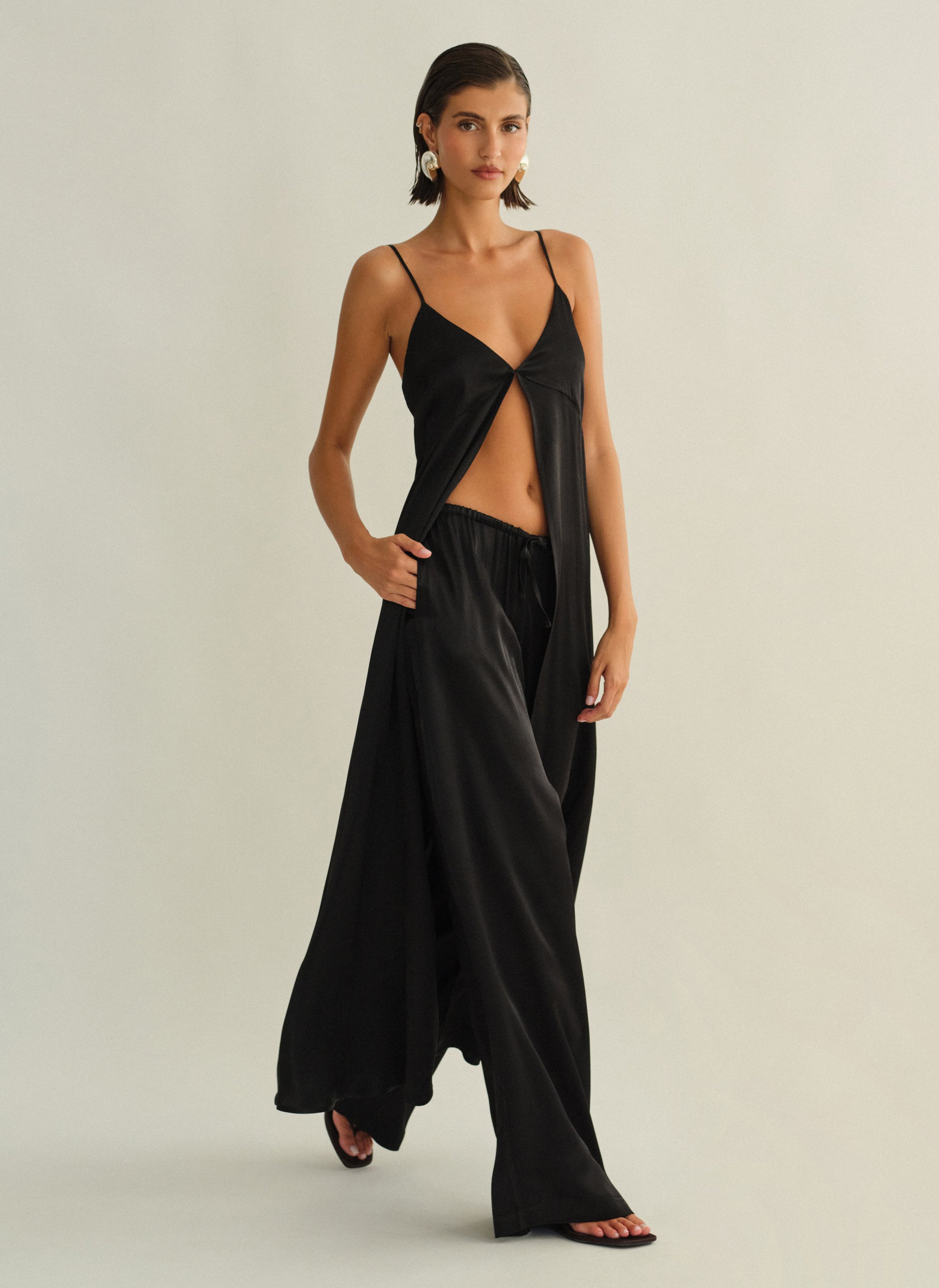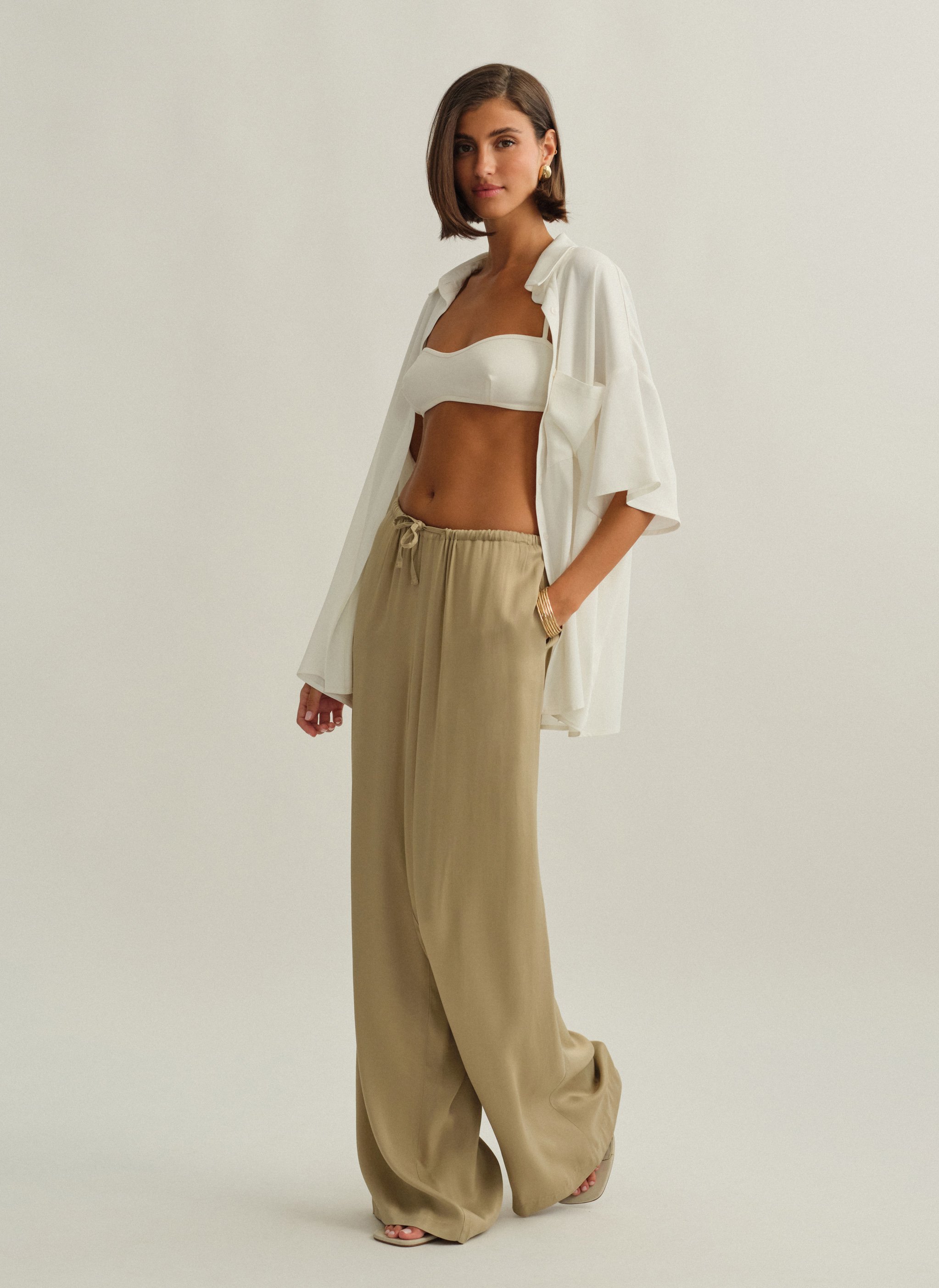 Σατέν παντελόνι με λάστιχο και δέσιμο στη μέση με κορδόνι.