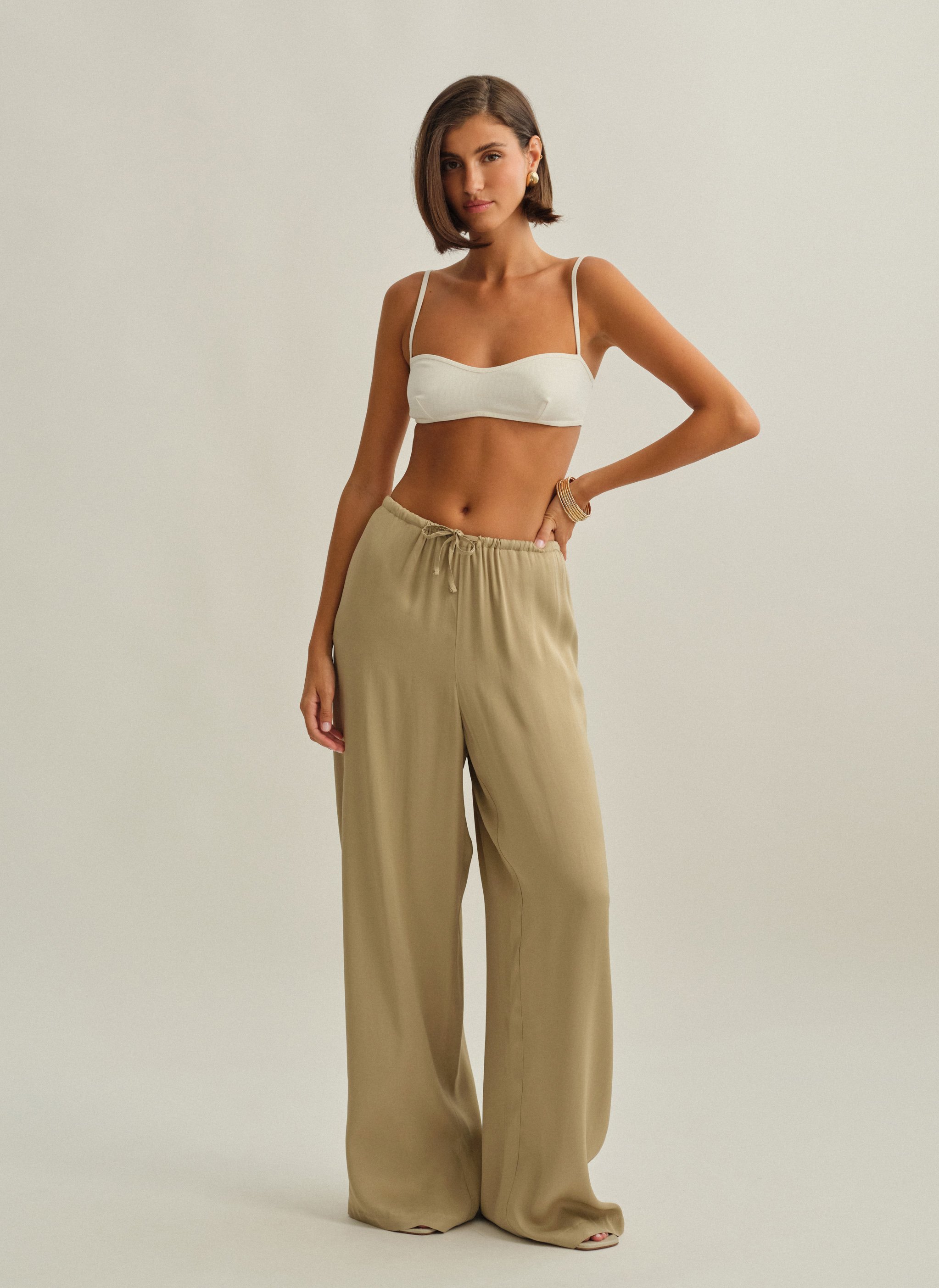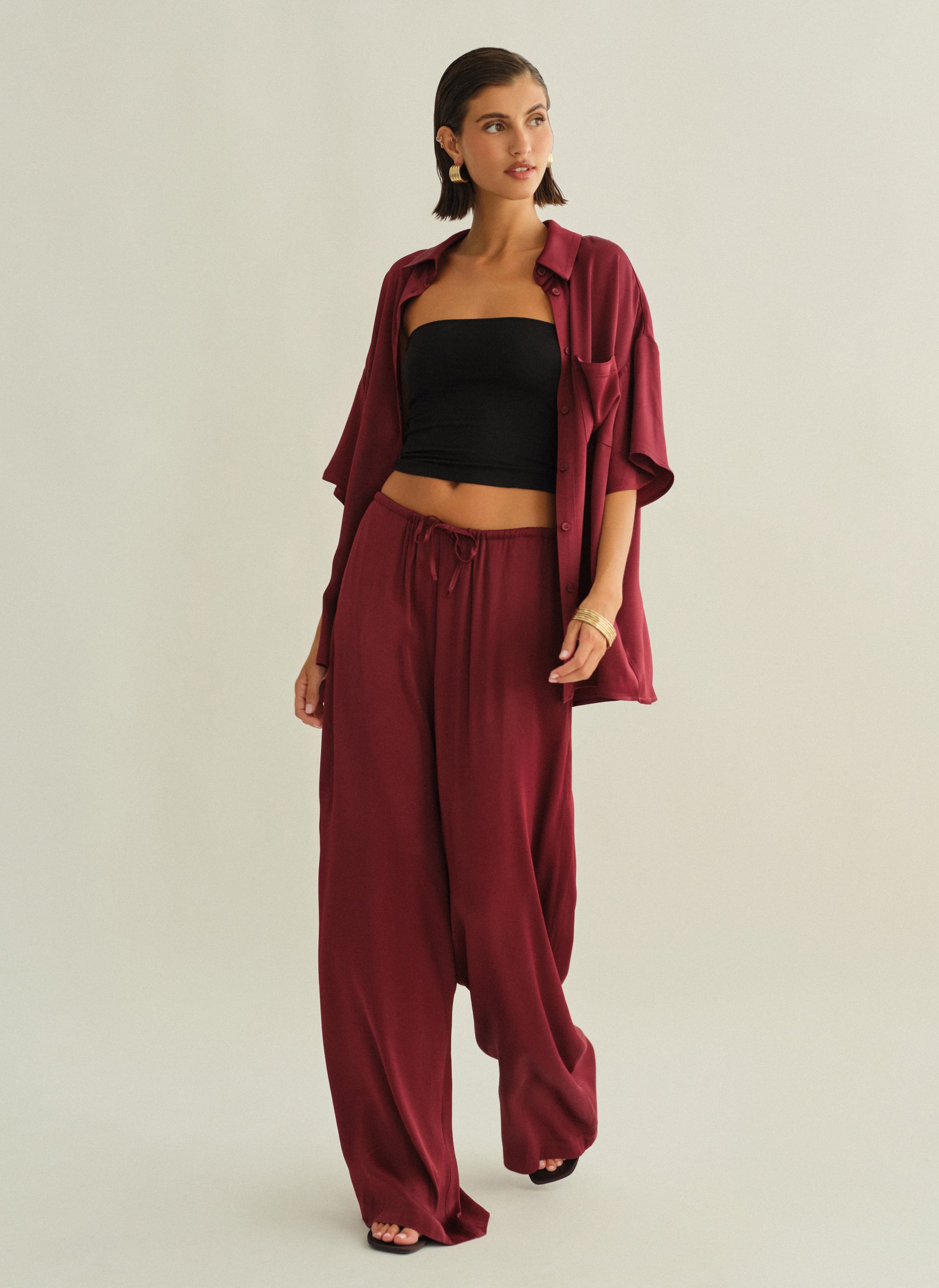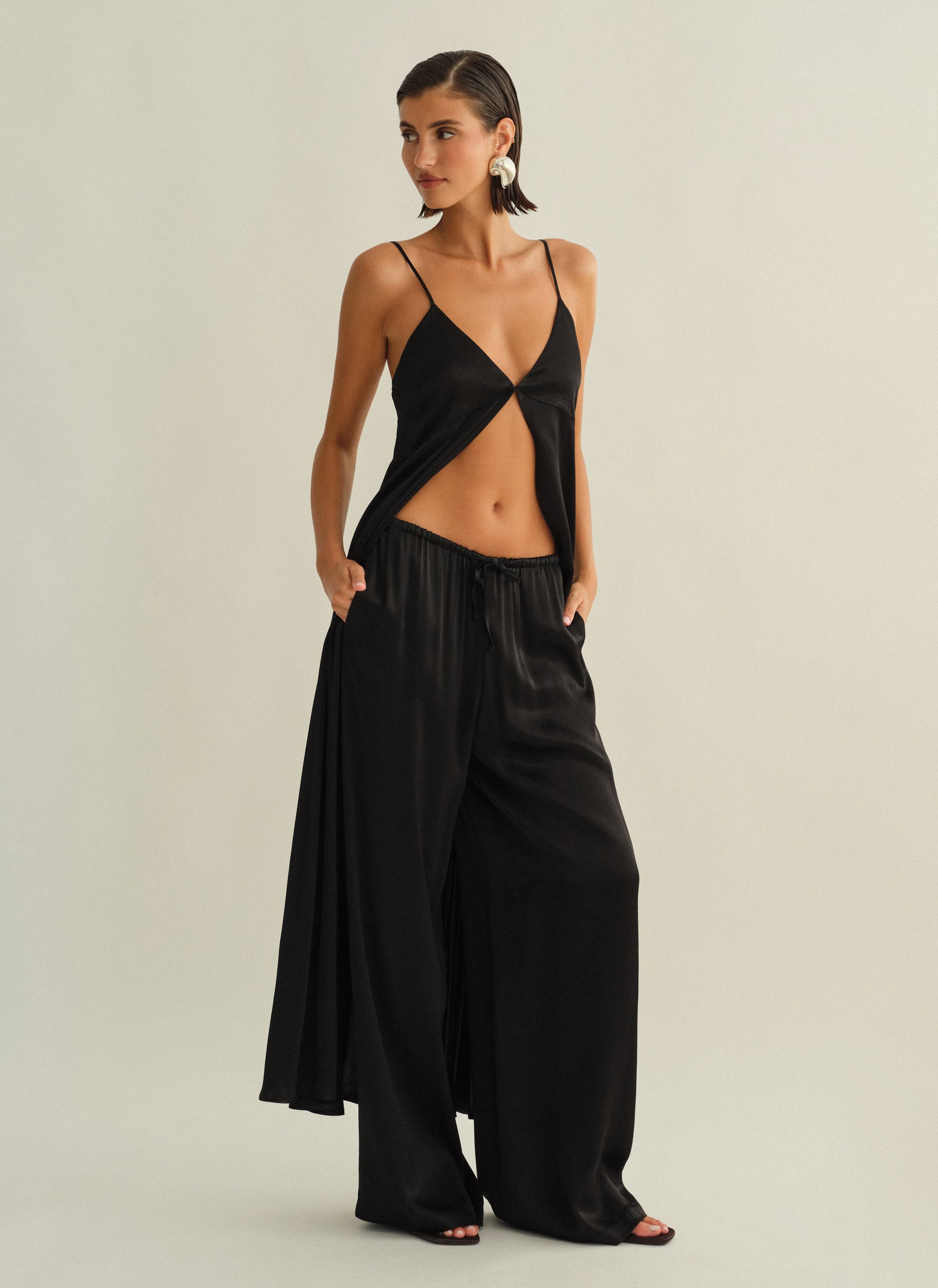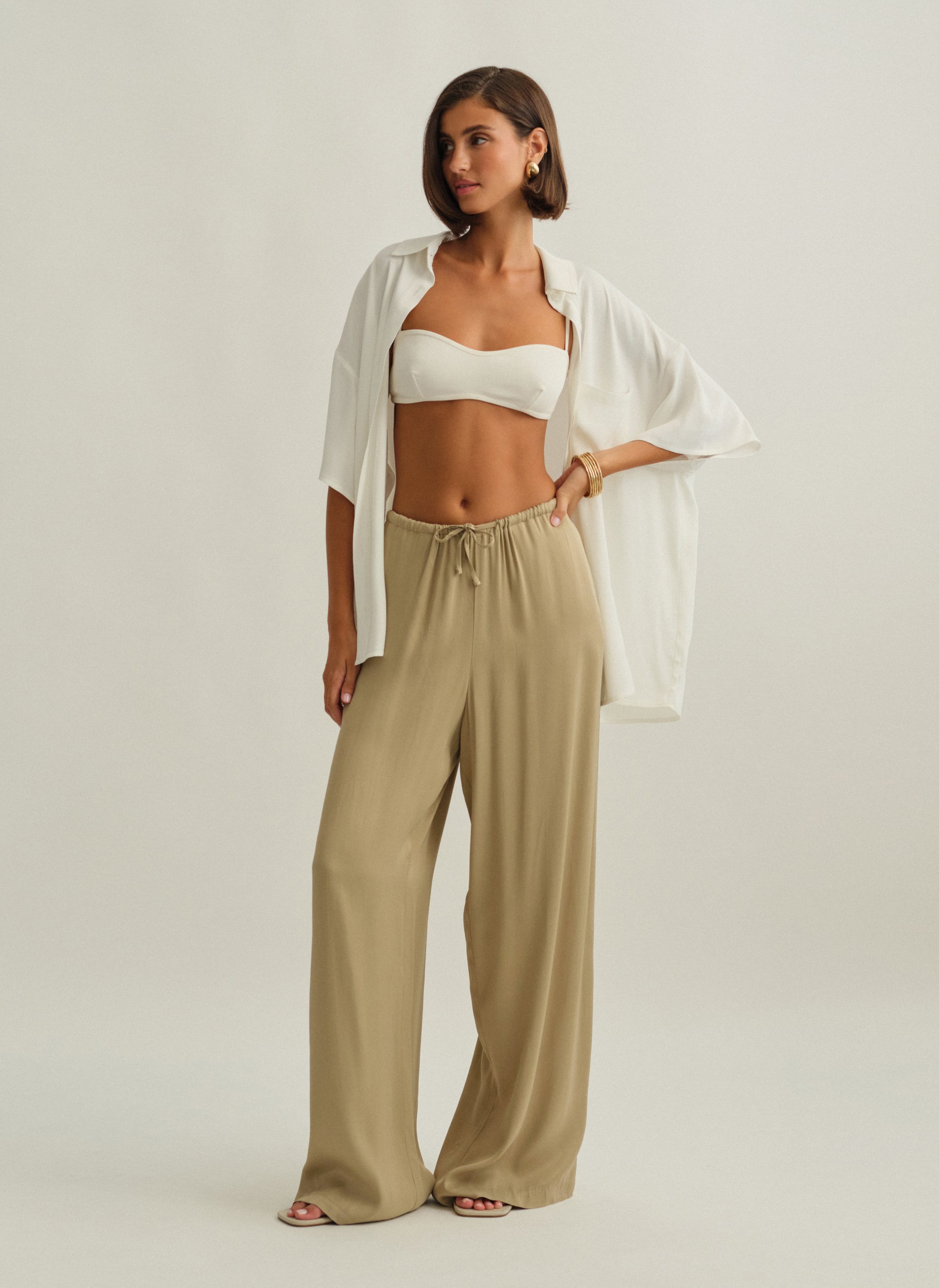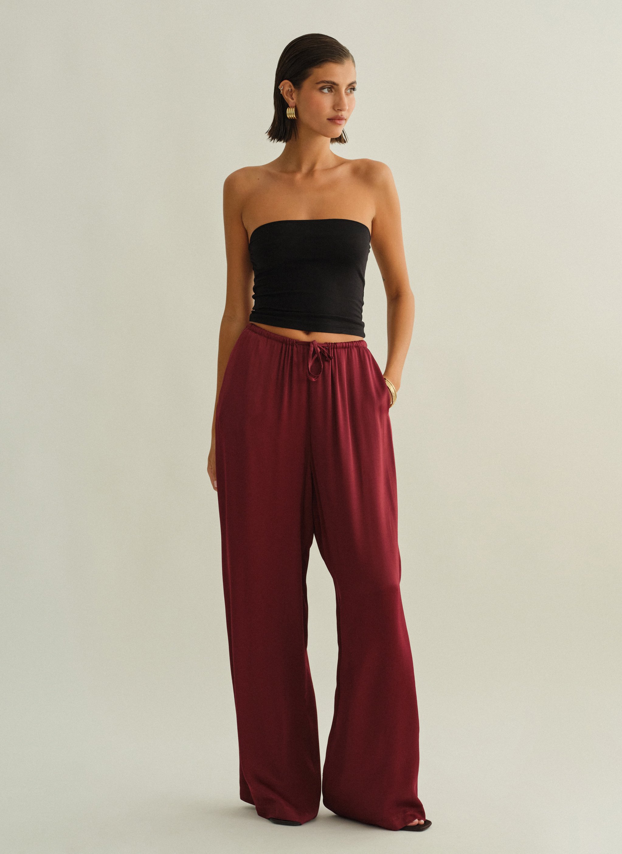 Σατέν παντελόνι με λάστιχο και δέσιμο στη μέση με κορδόνι.