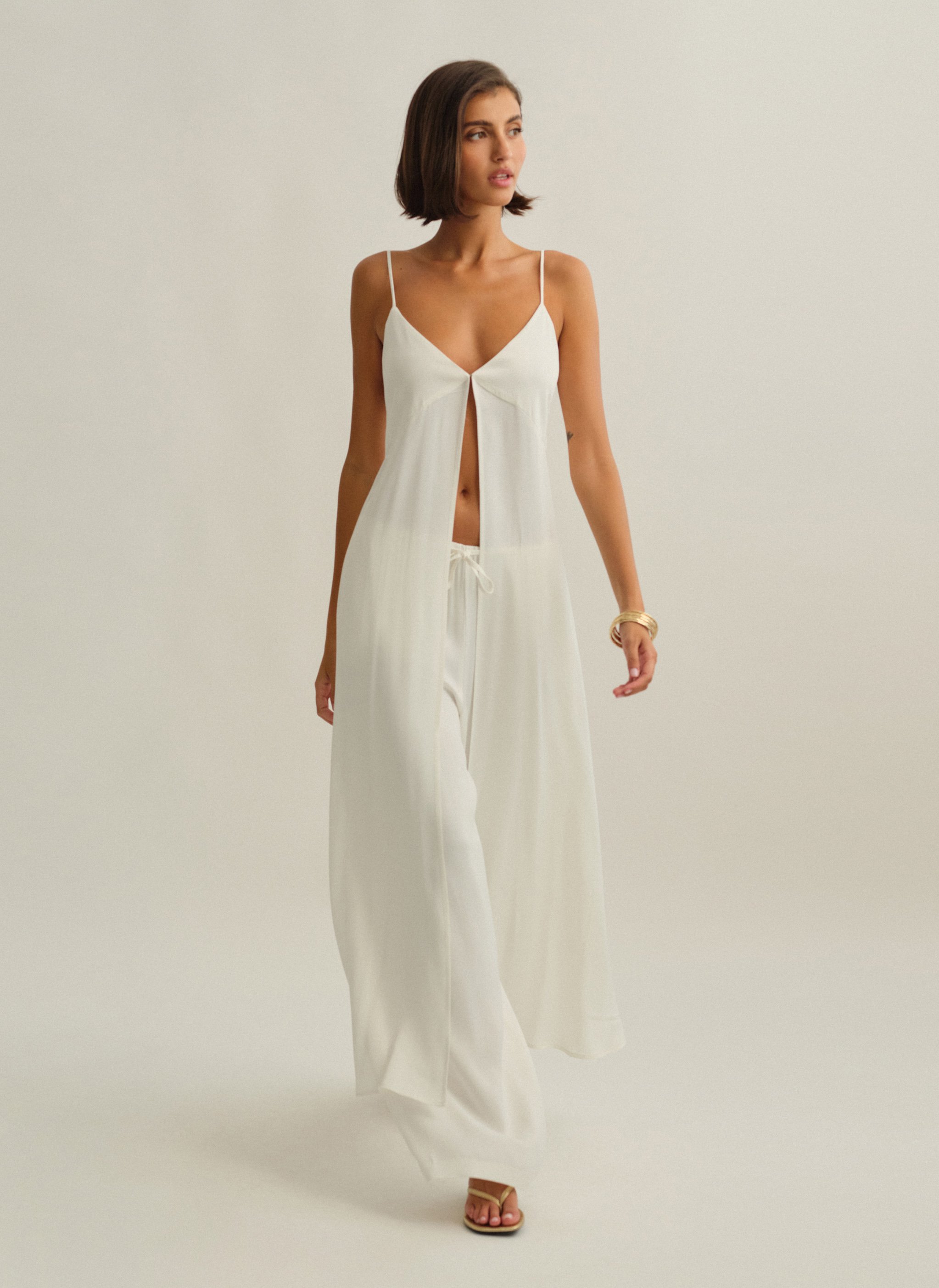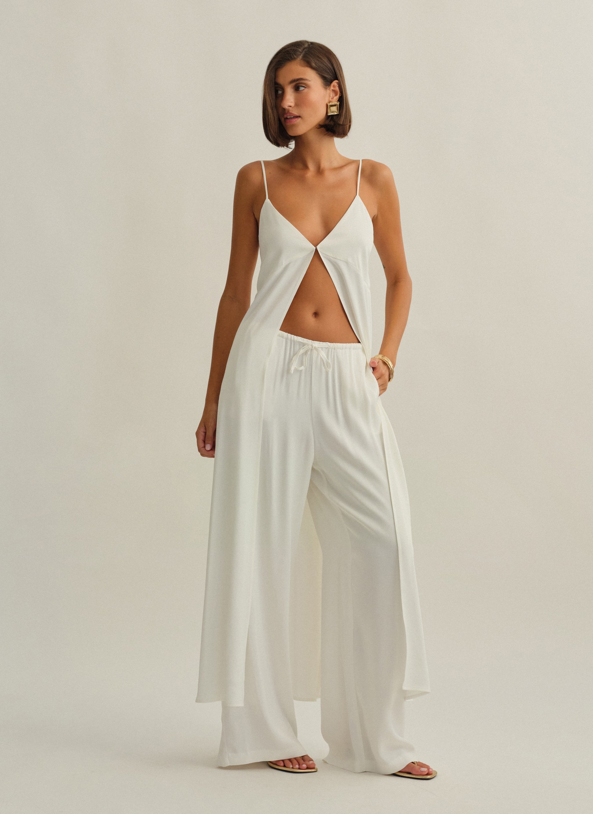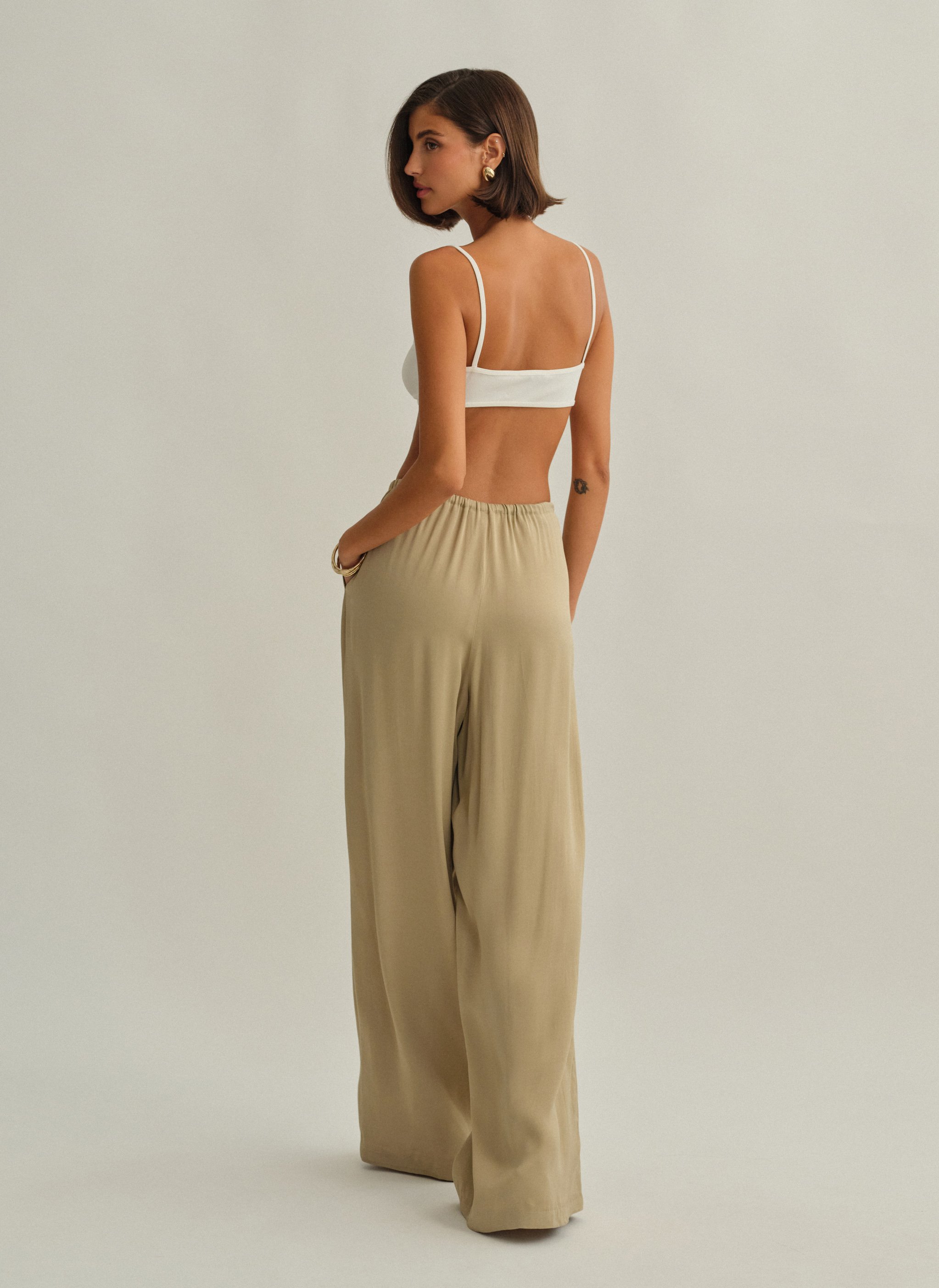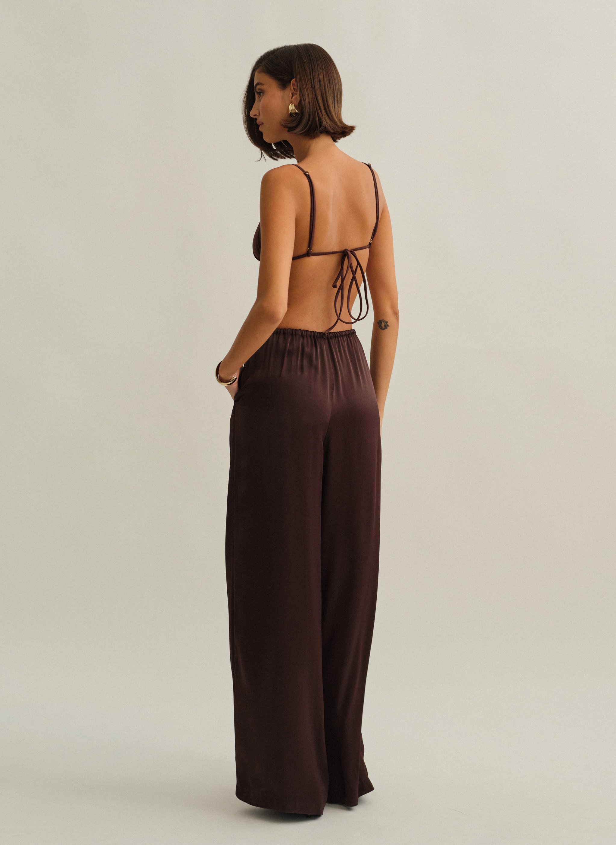 Σατέν παντελόνι με λάστιχο και δέσιμο στη μέση με κορδόνι.