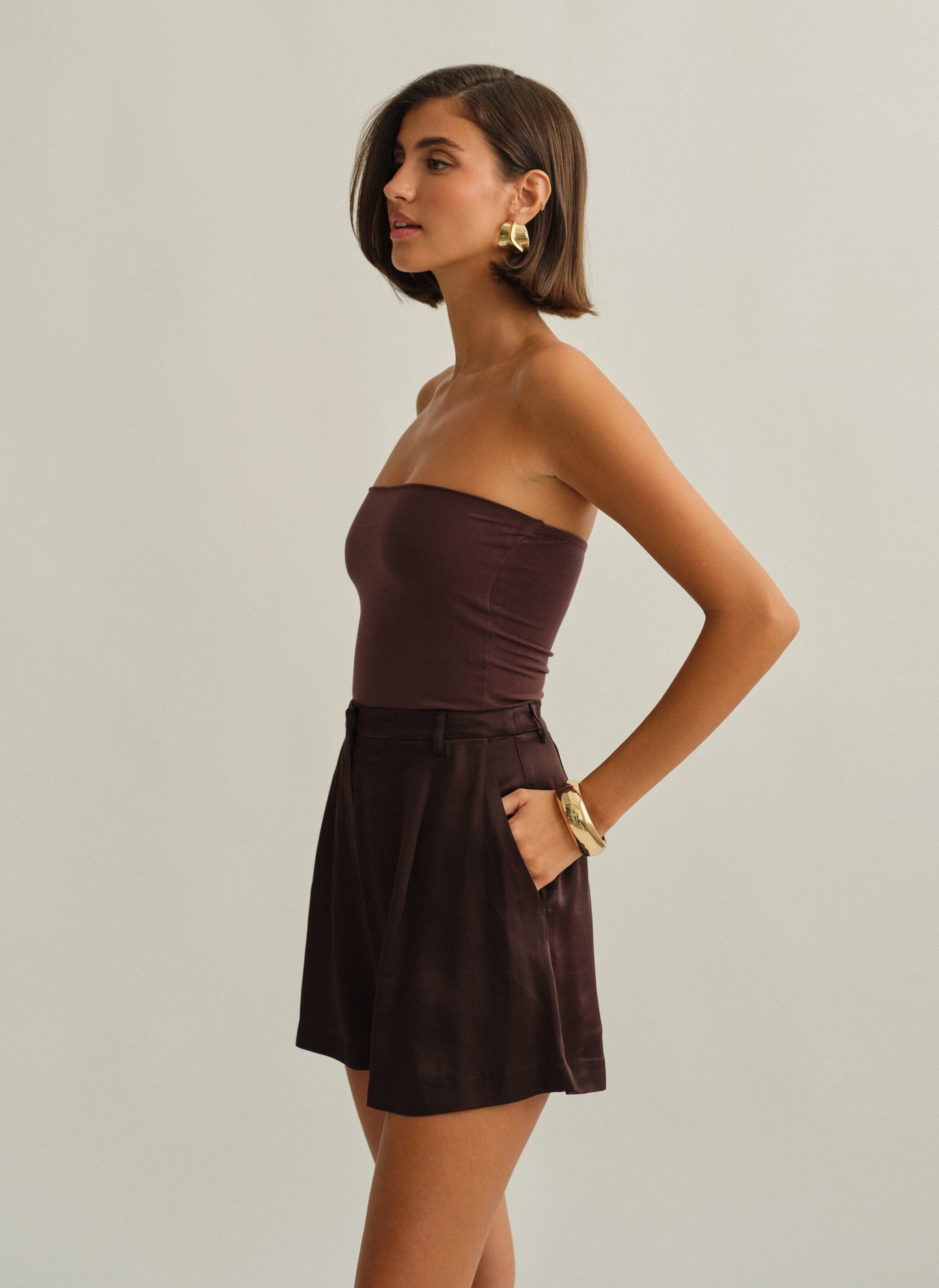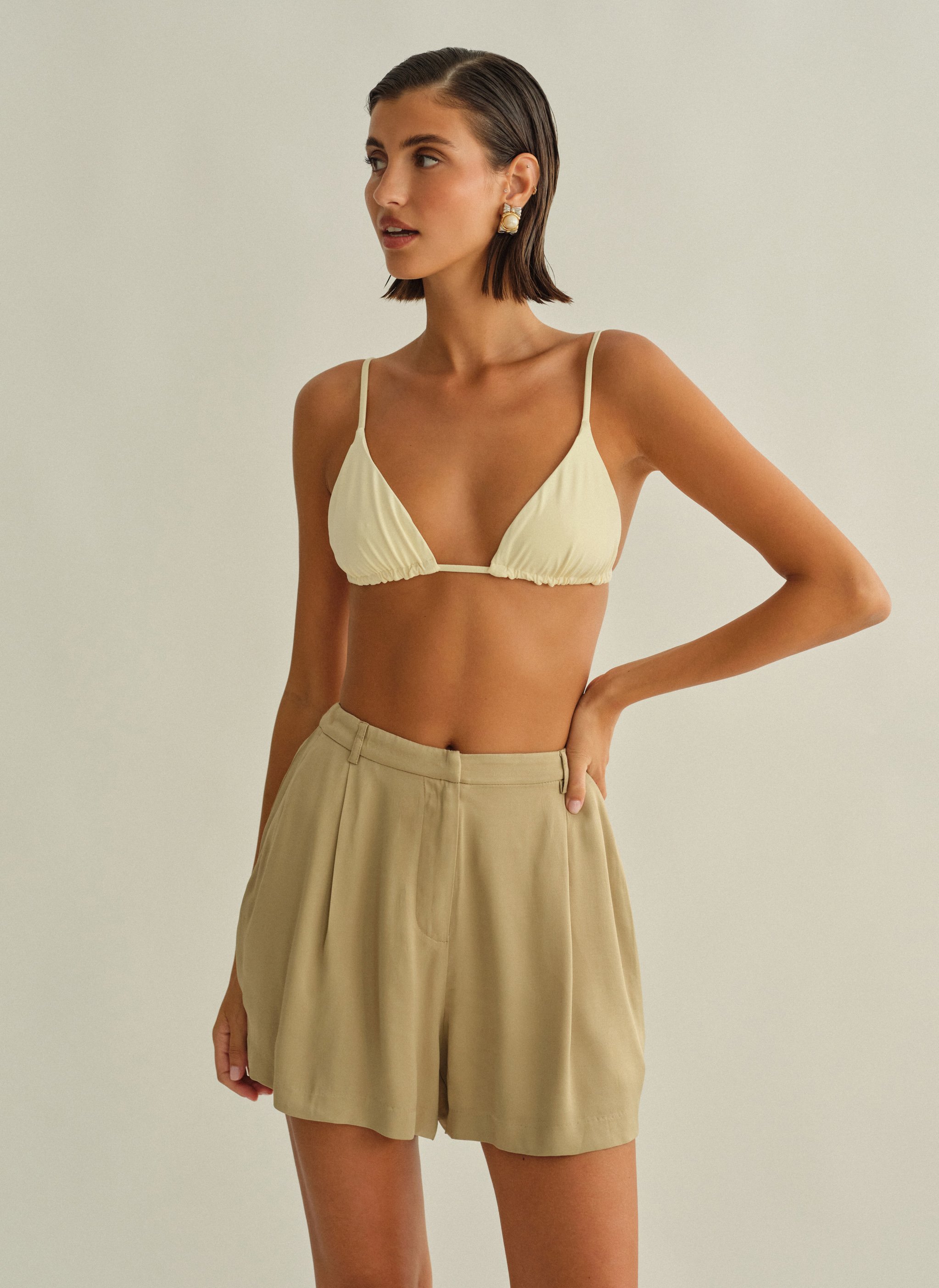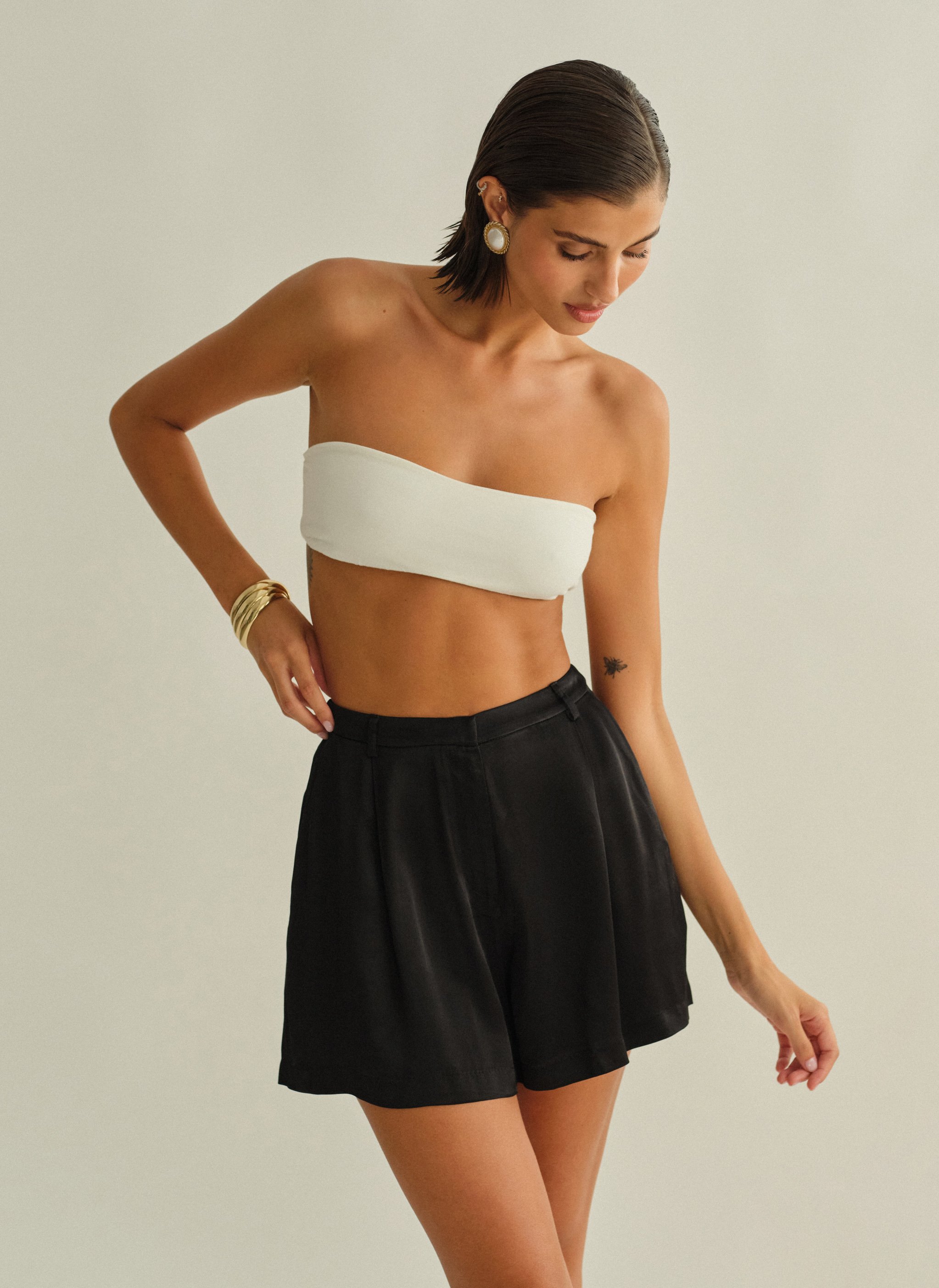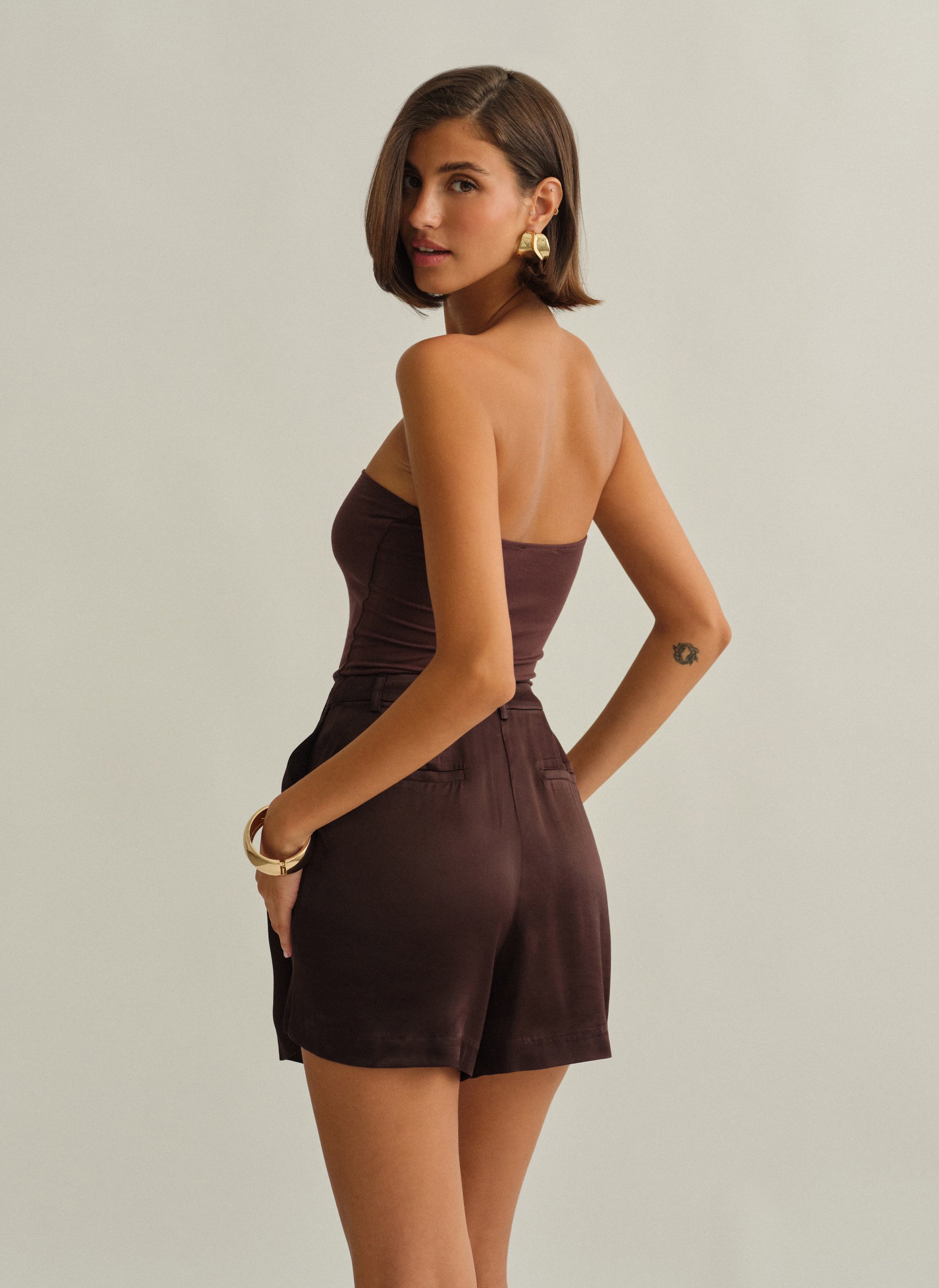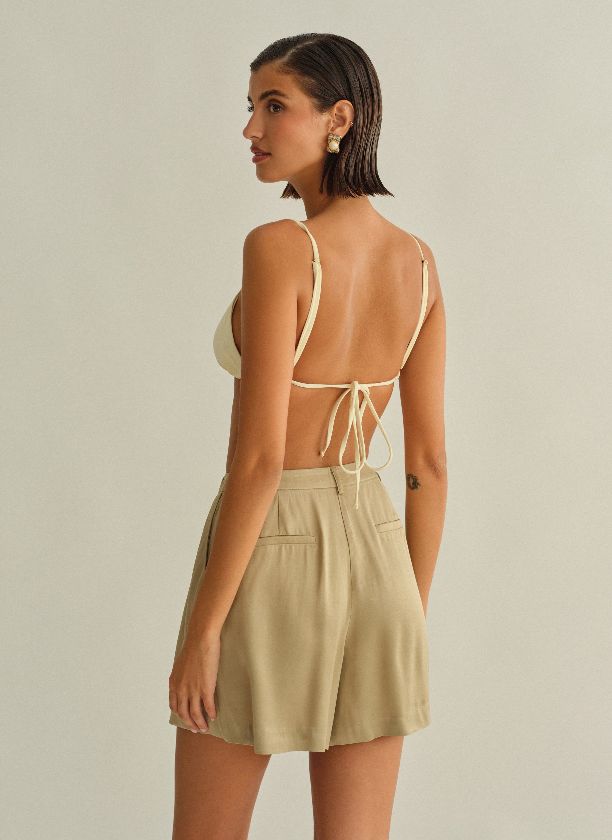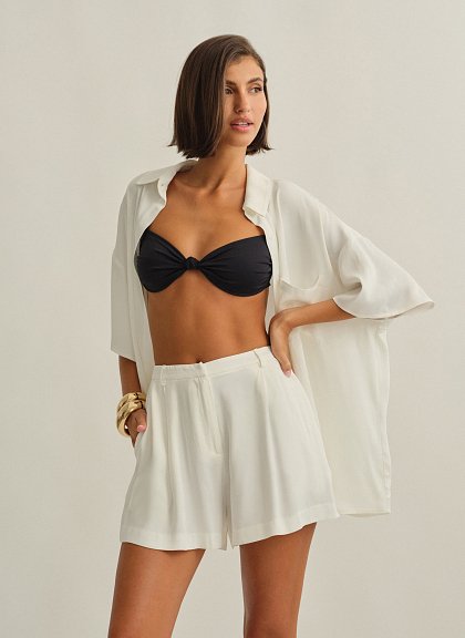 Ψηλόμεσο σατέν σορτς με πιέτες και τσέπες.