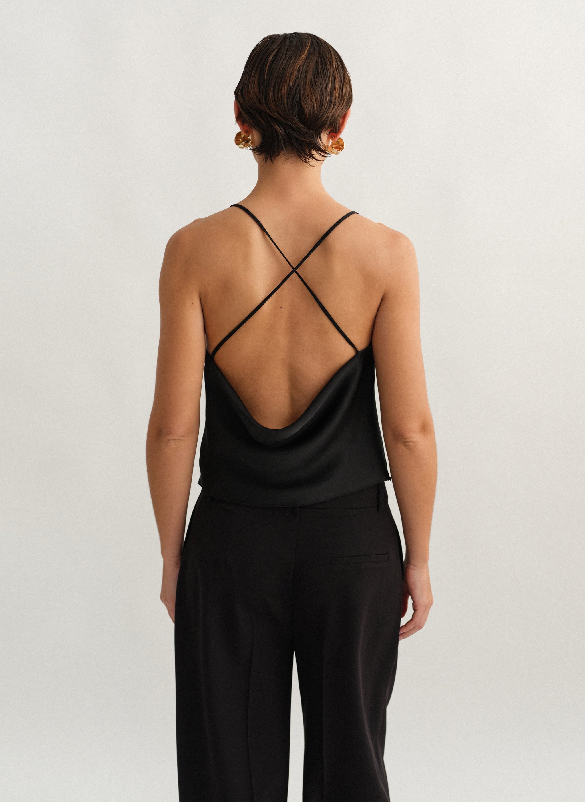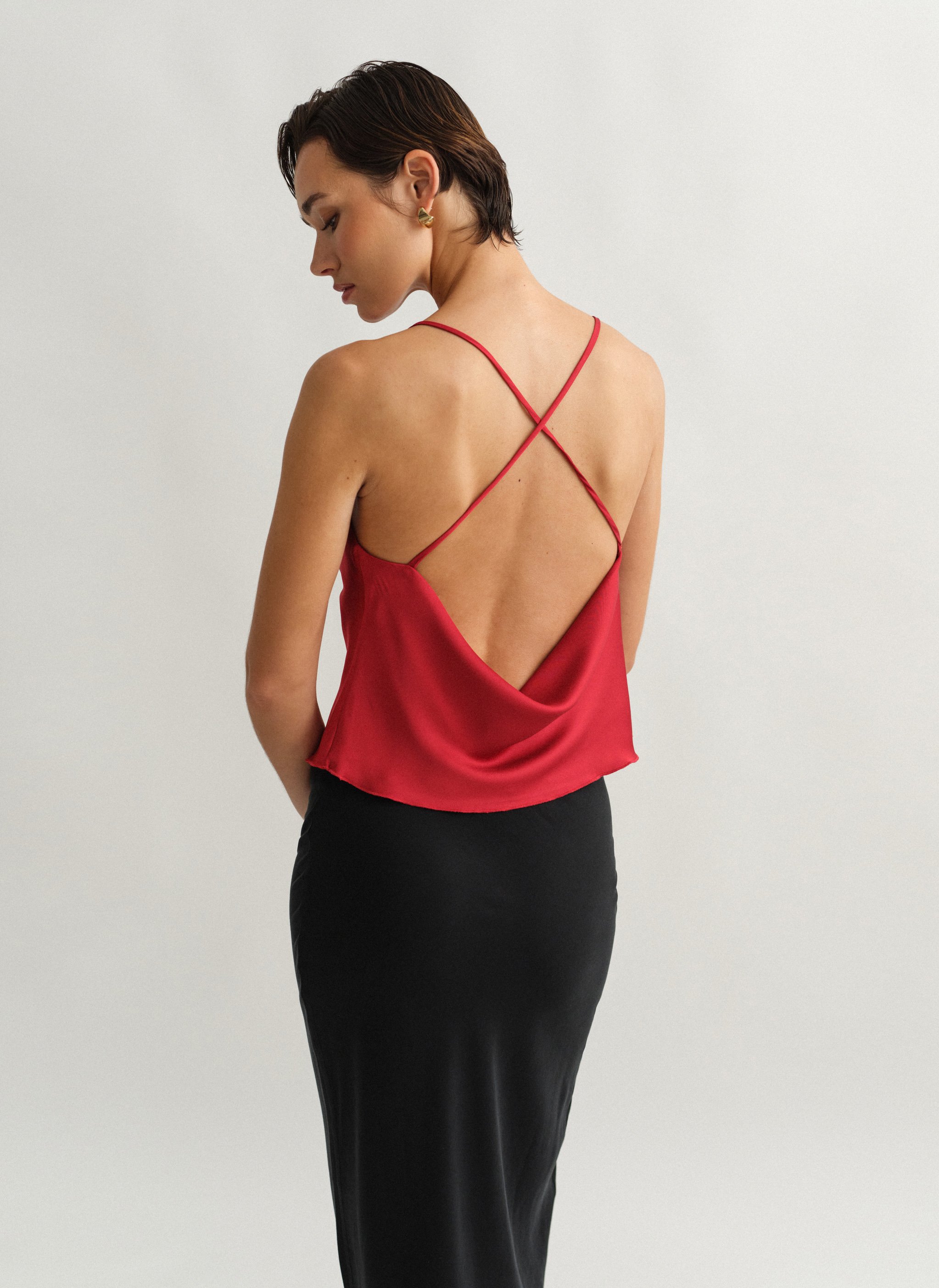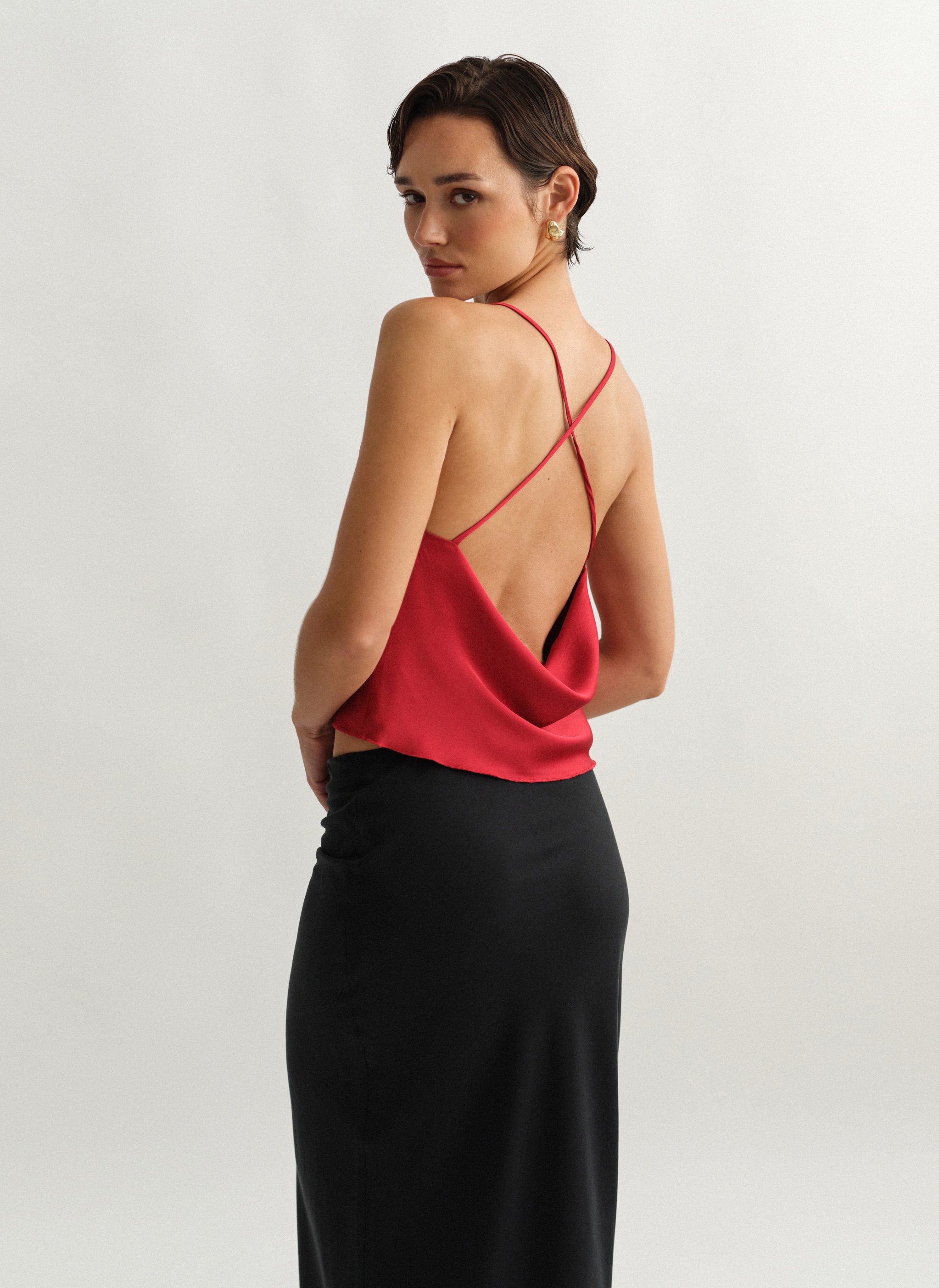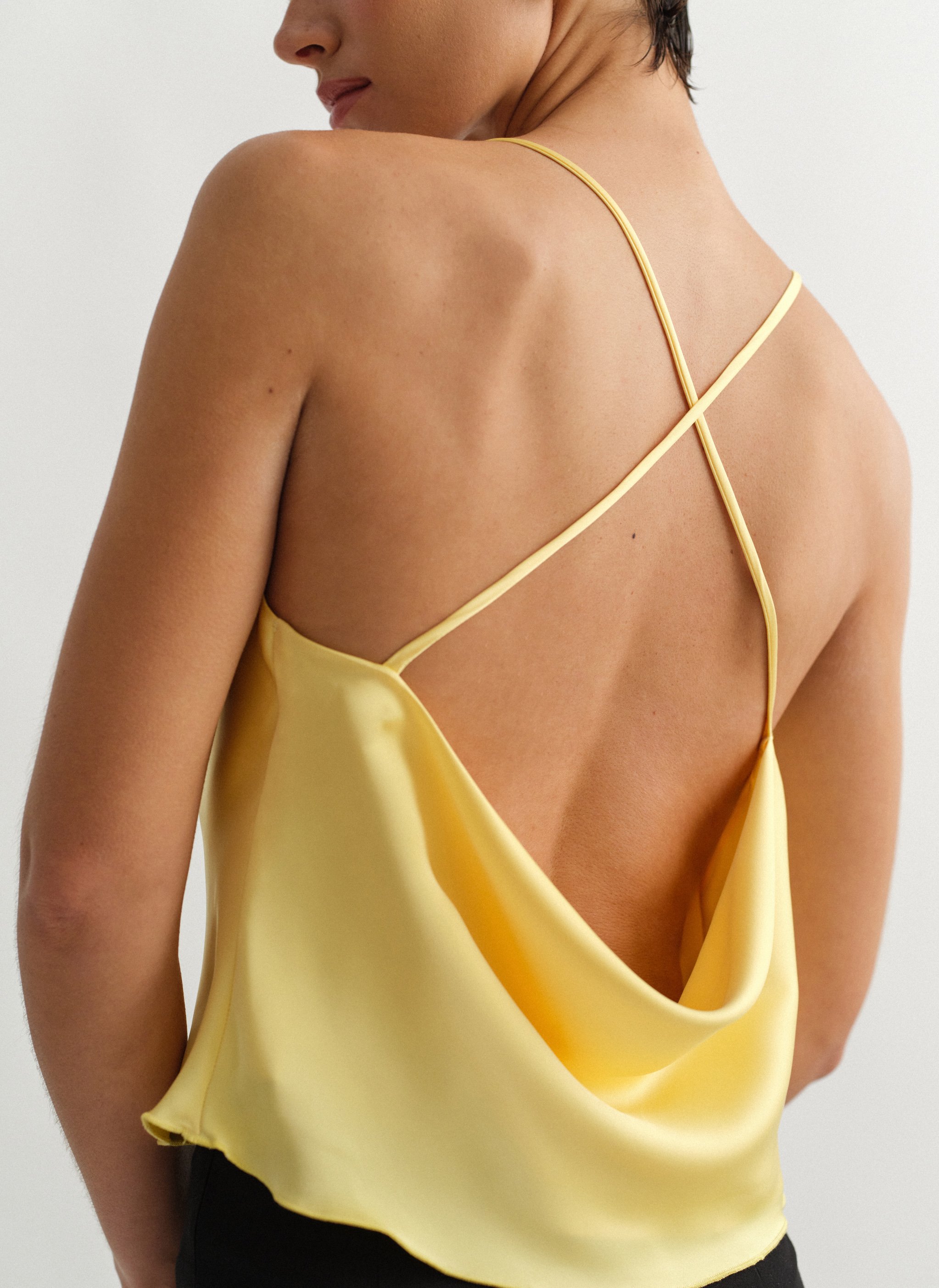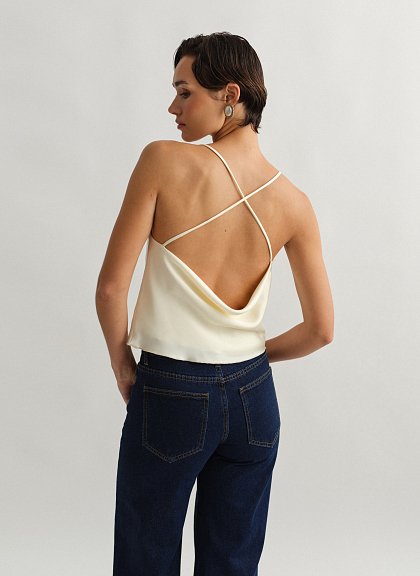 Σατέν τοπ ντραπέ με χιαστί πλάτη.