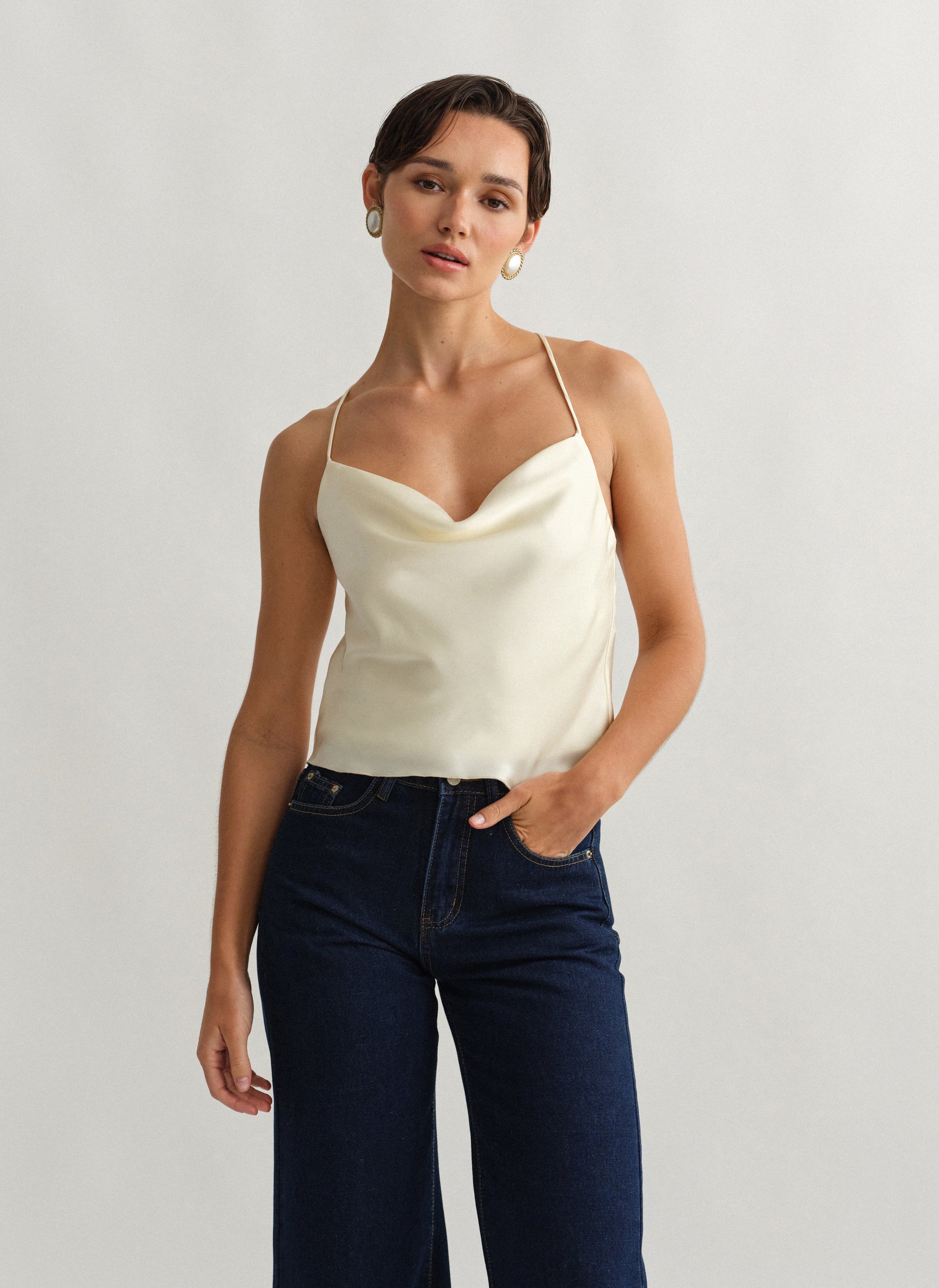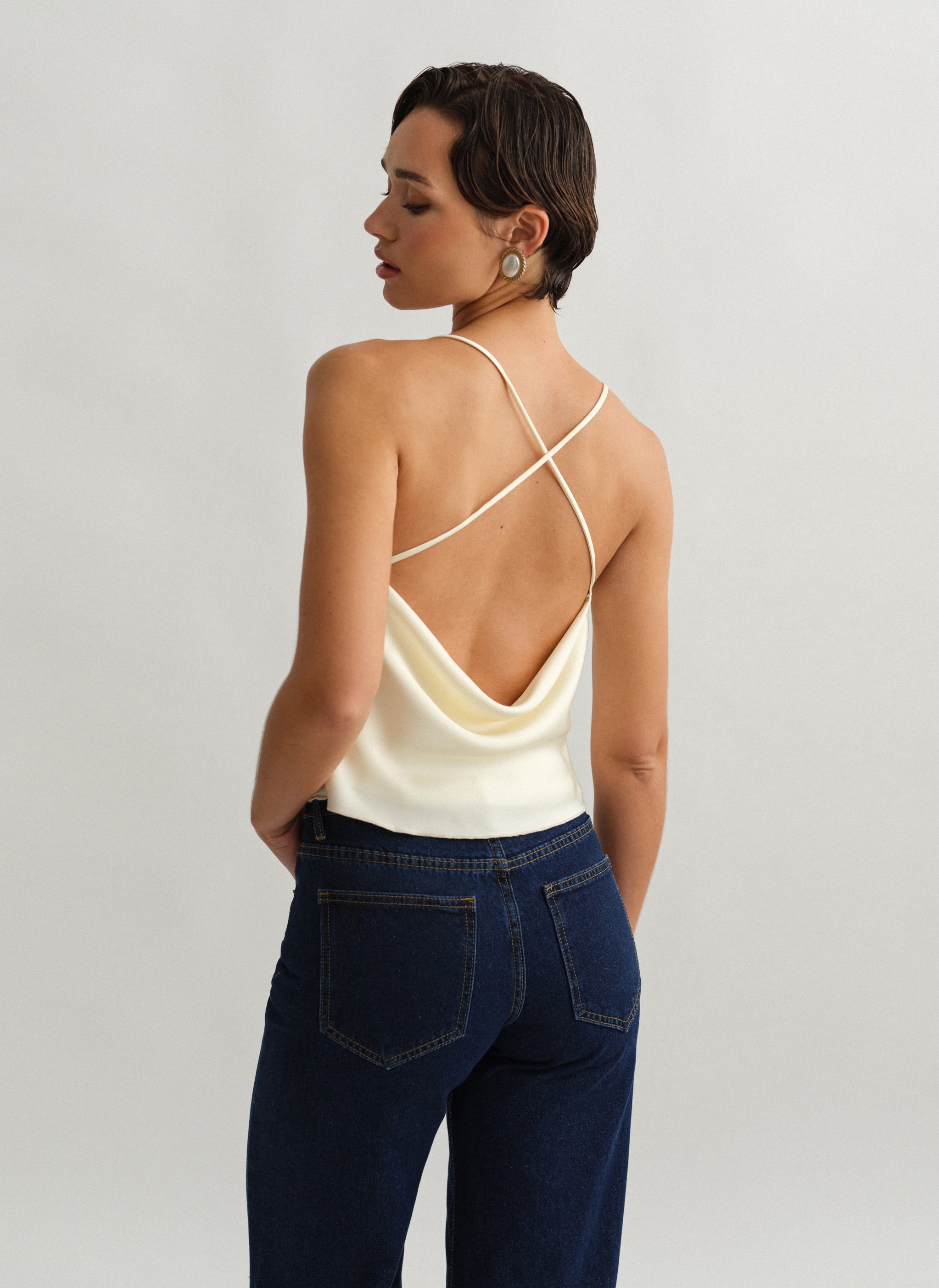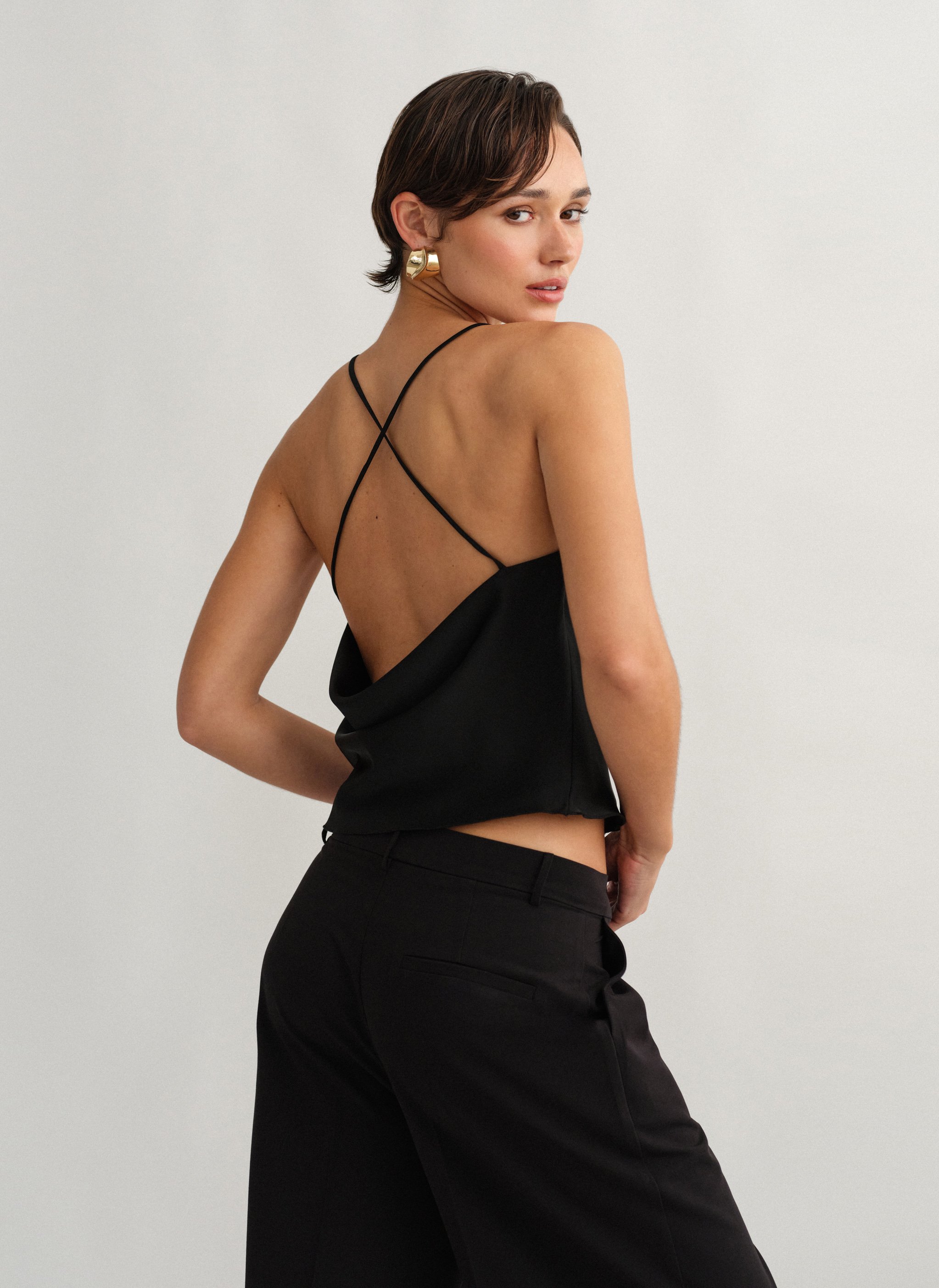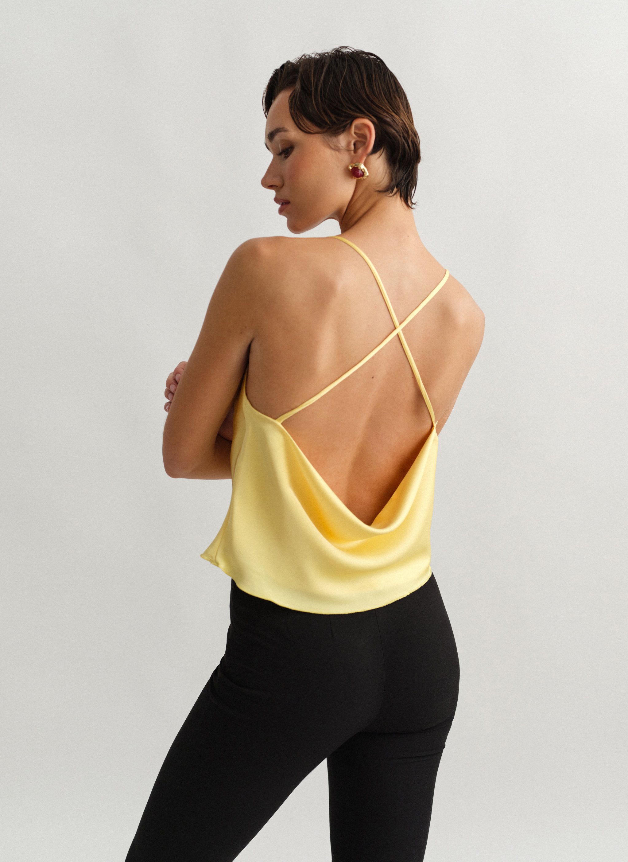 Σατέν τοπ ντραπέ με χιαστί πλάτη.