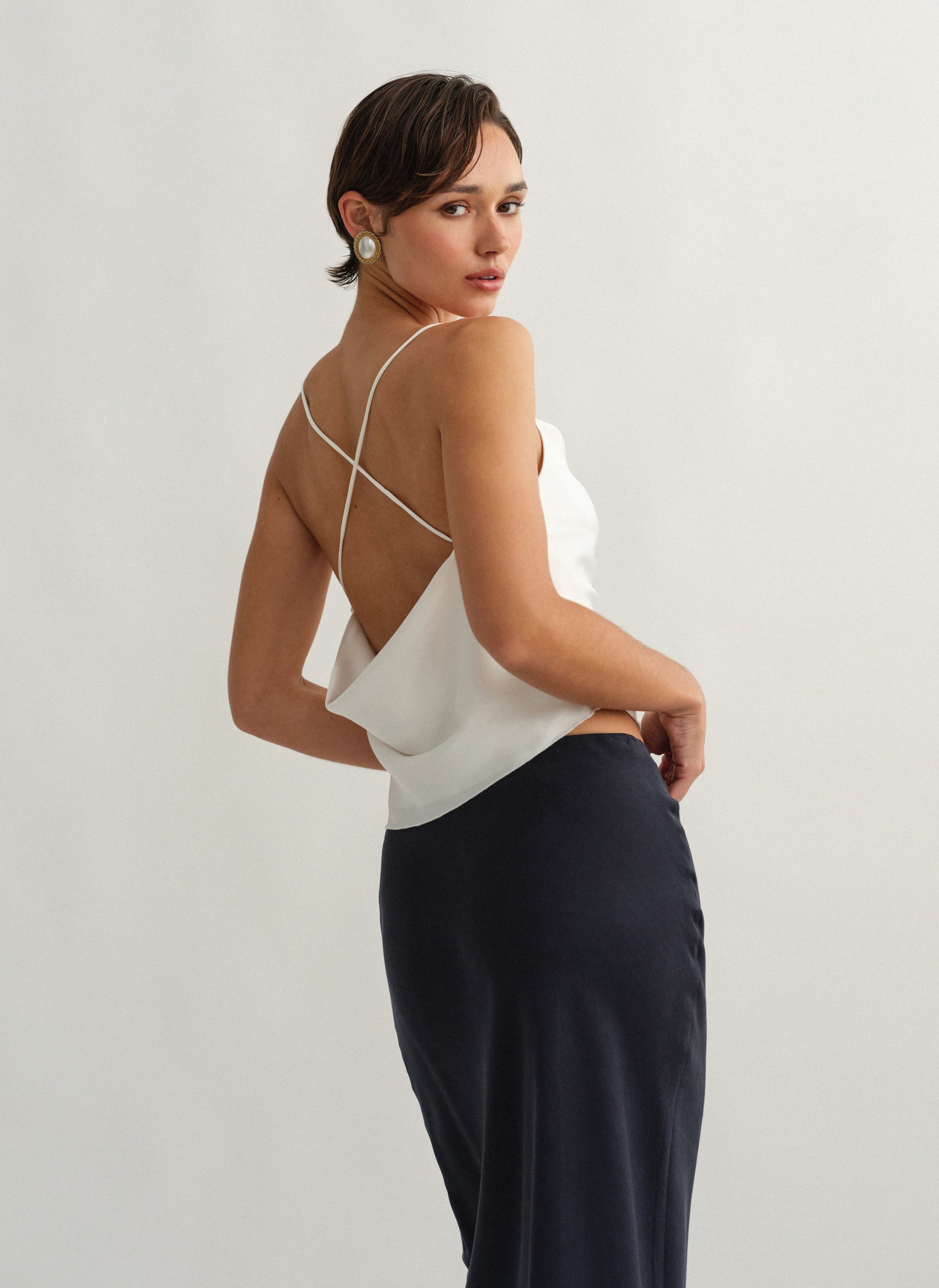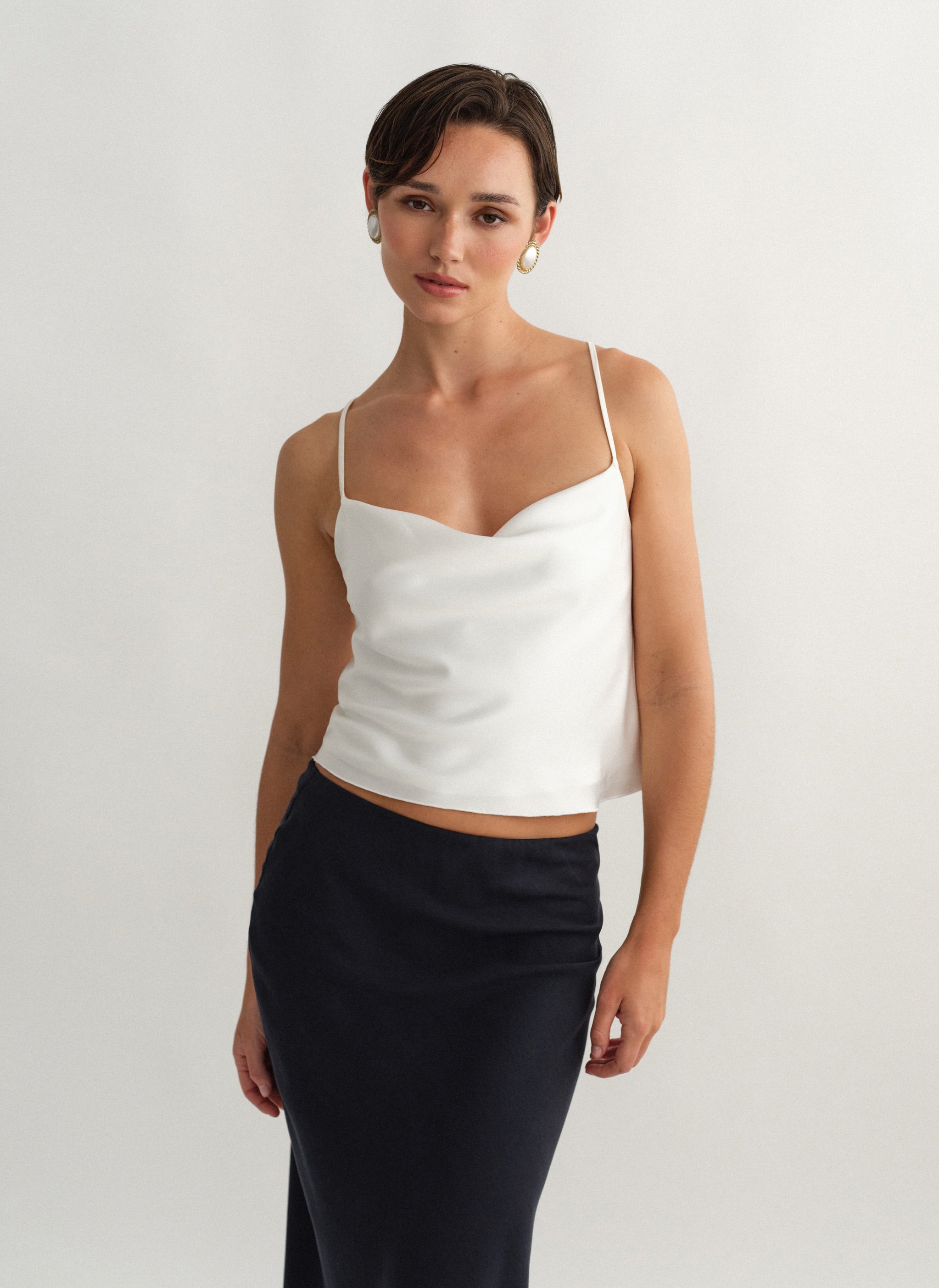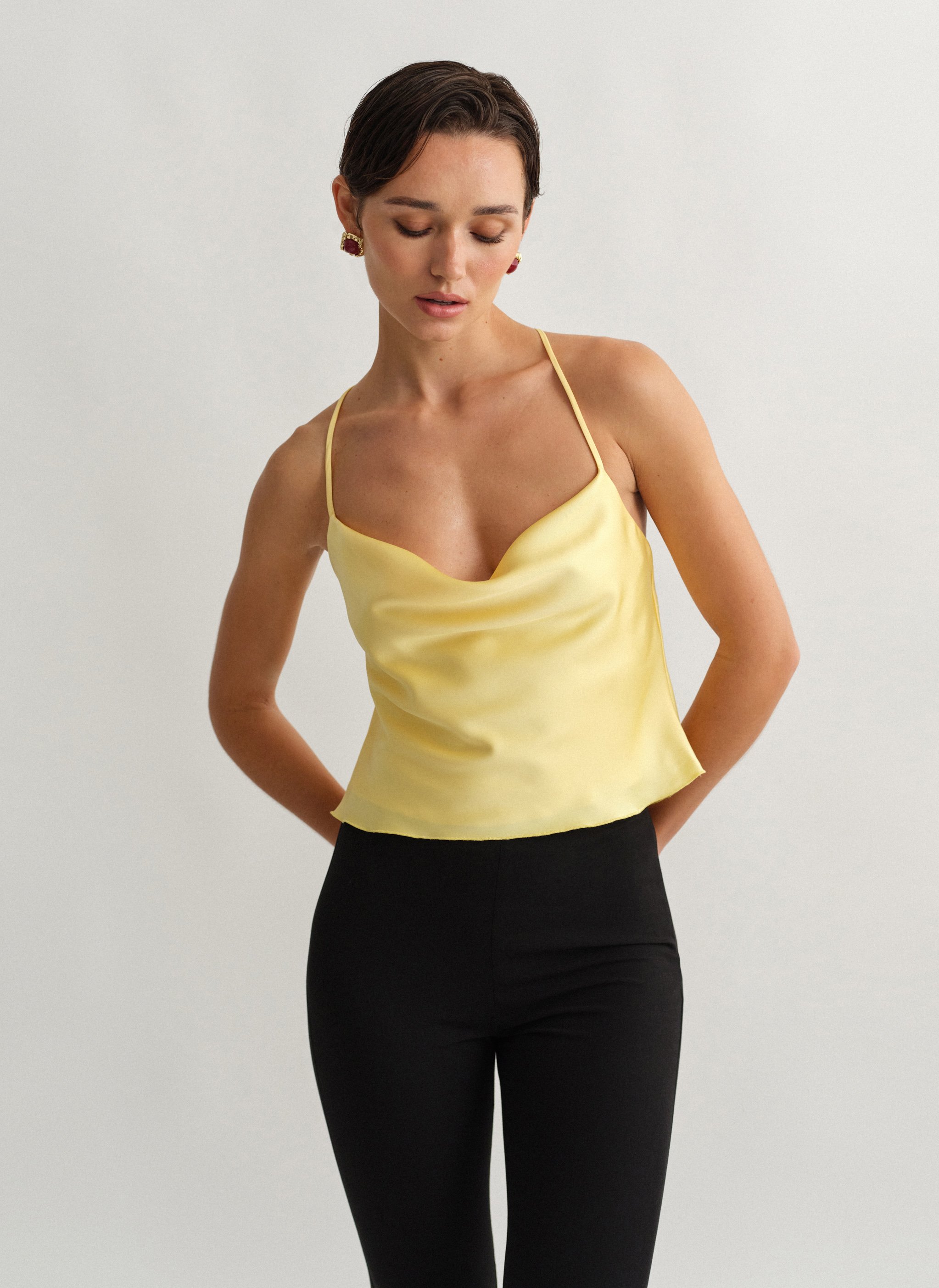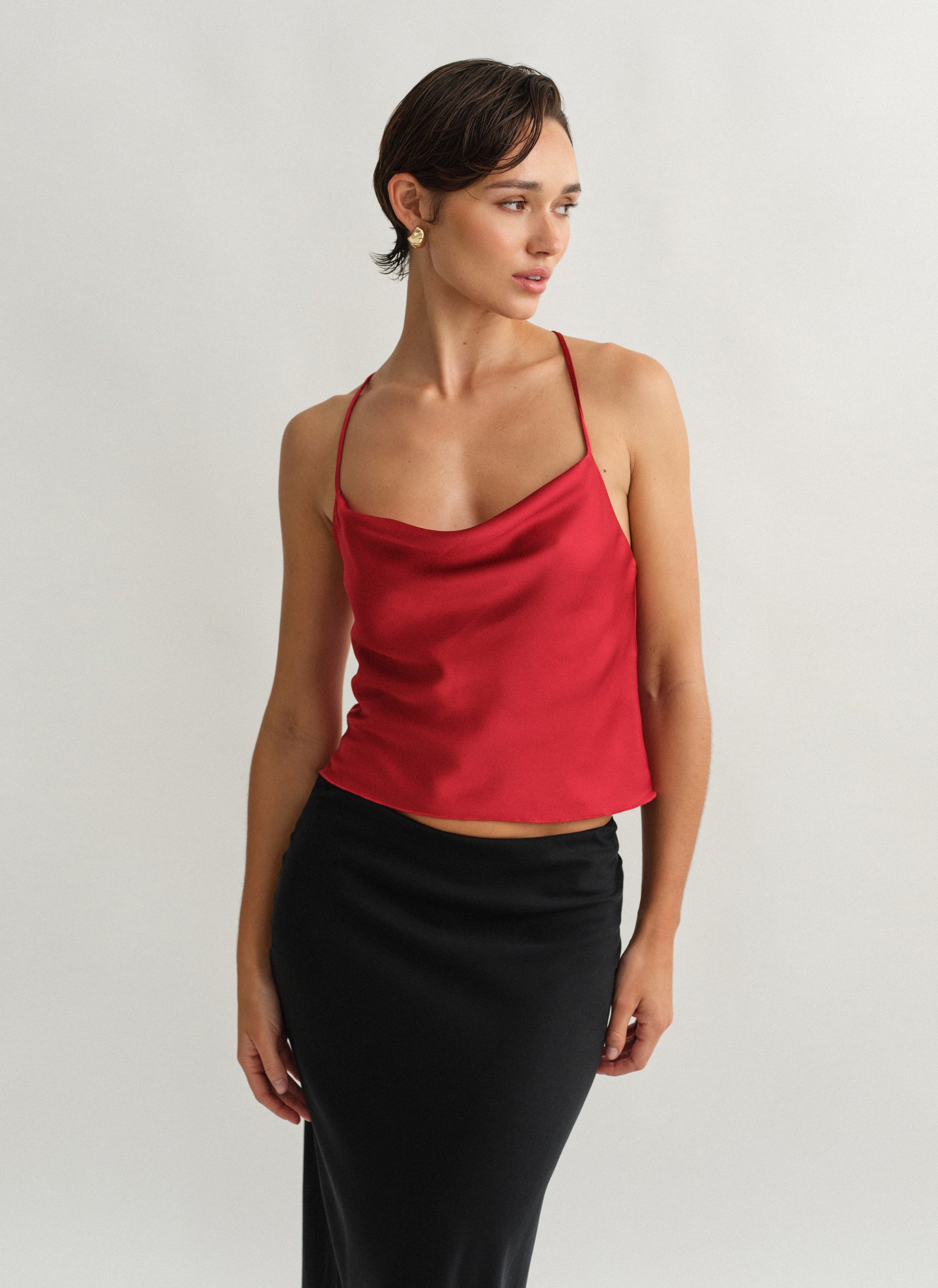 Σατέν τοπ ντραπέ με χιαστί πλάτη.