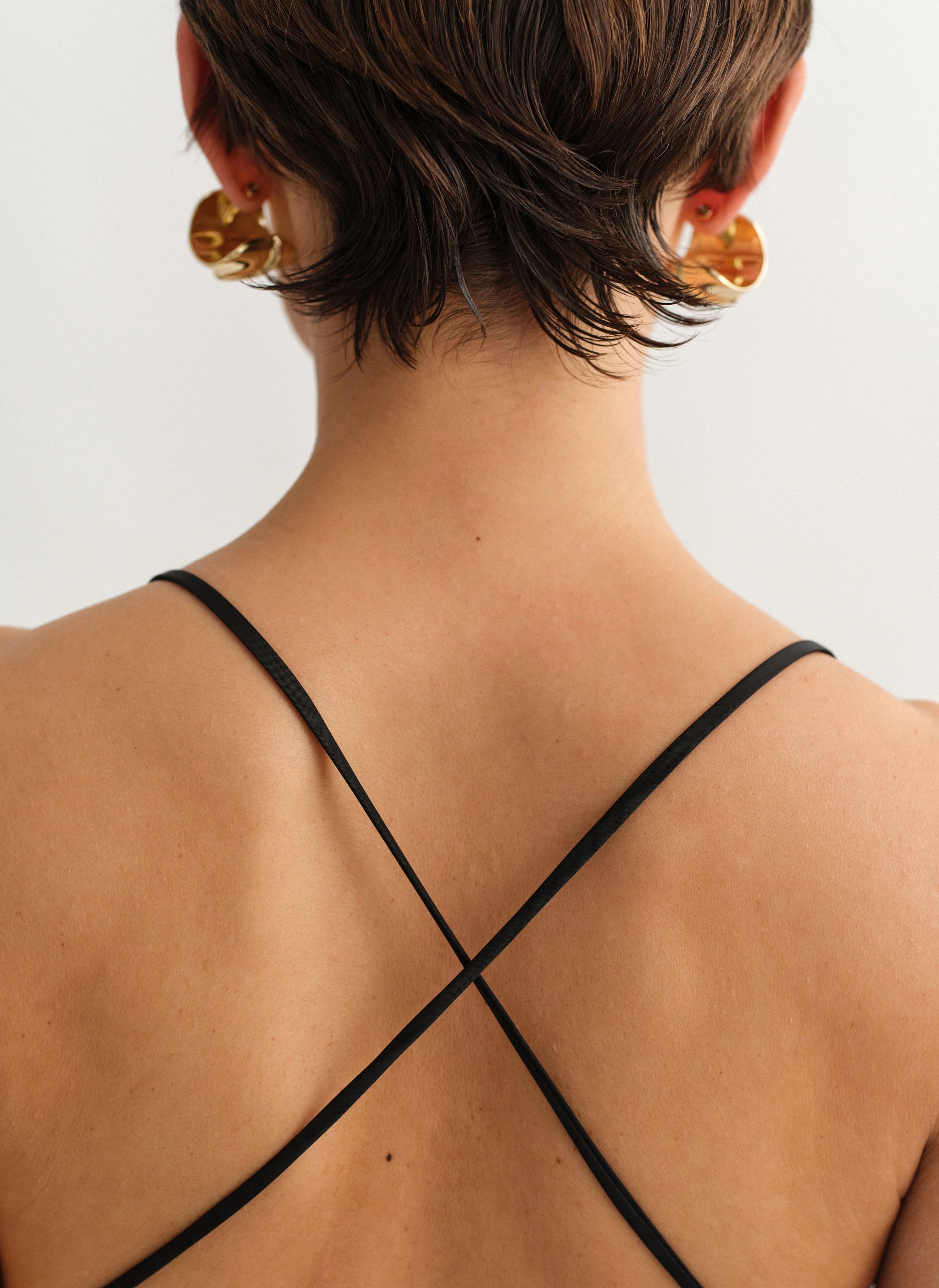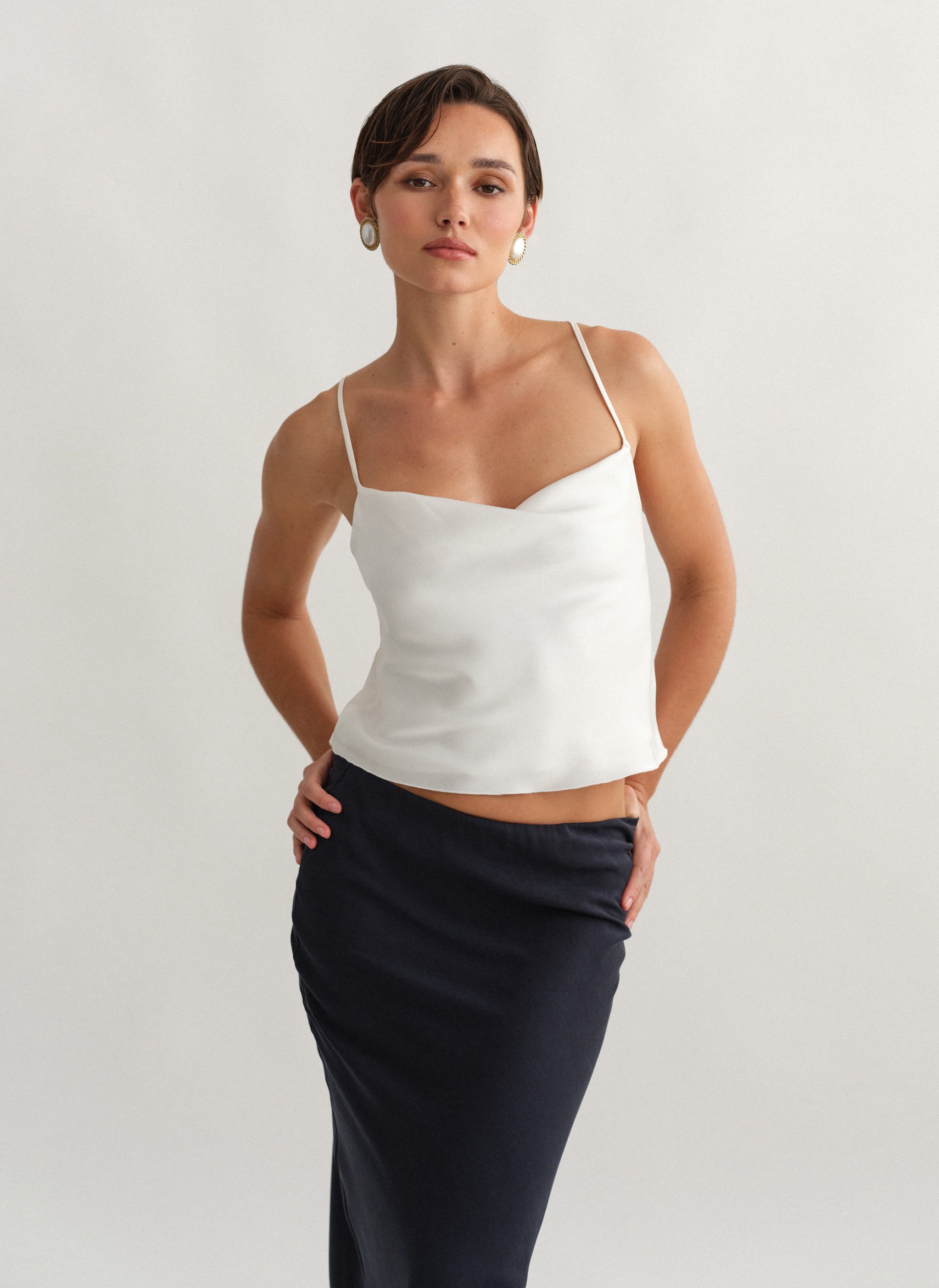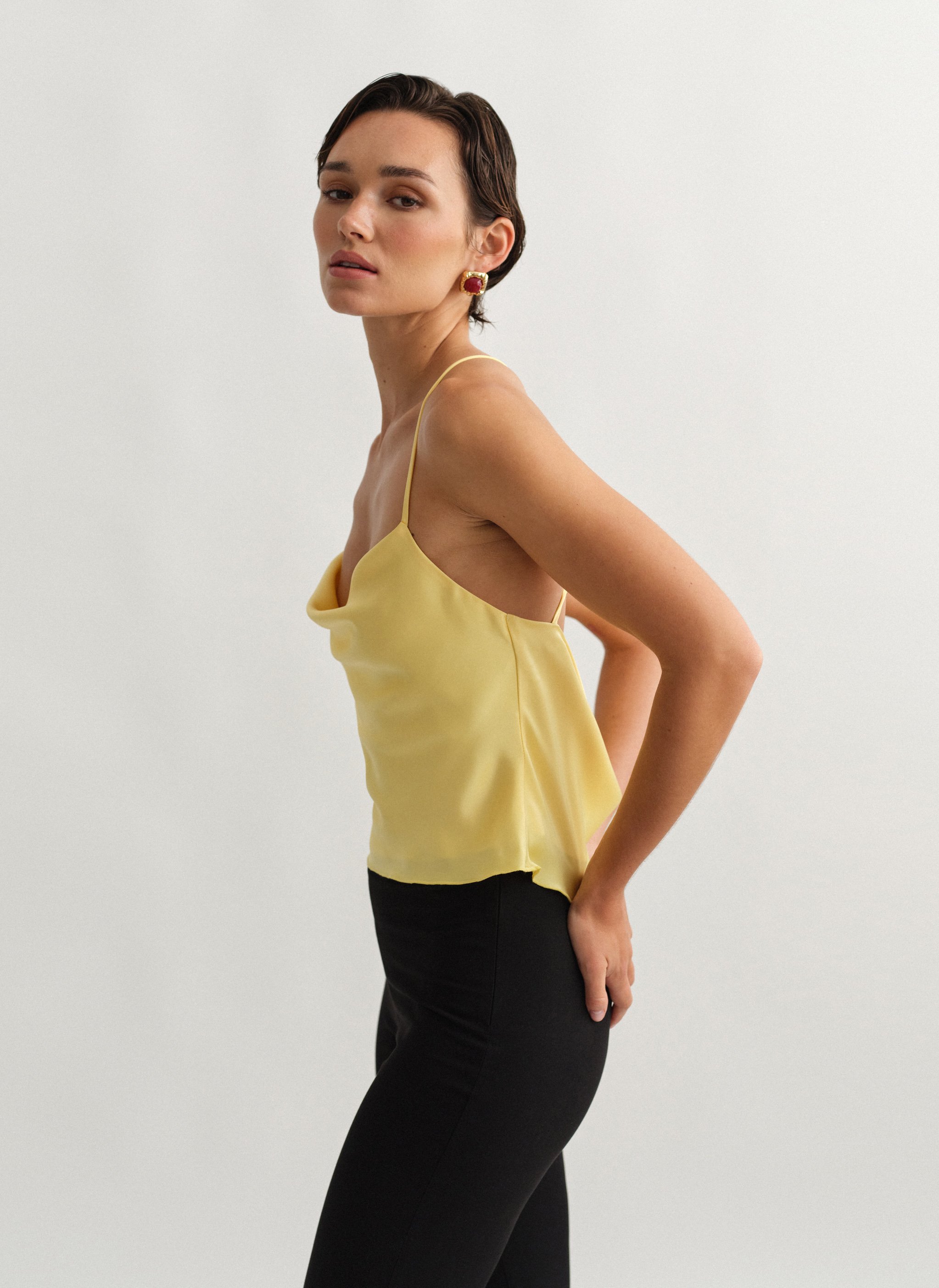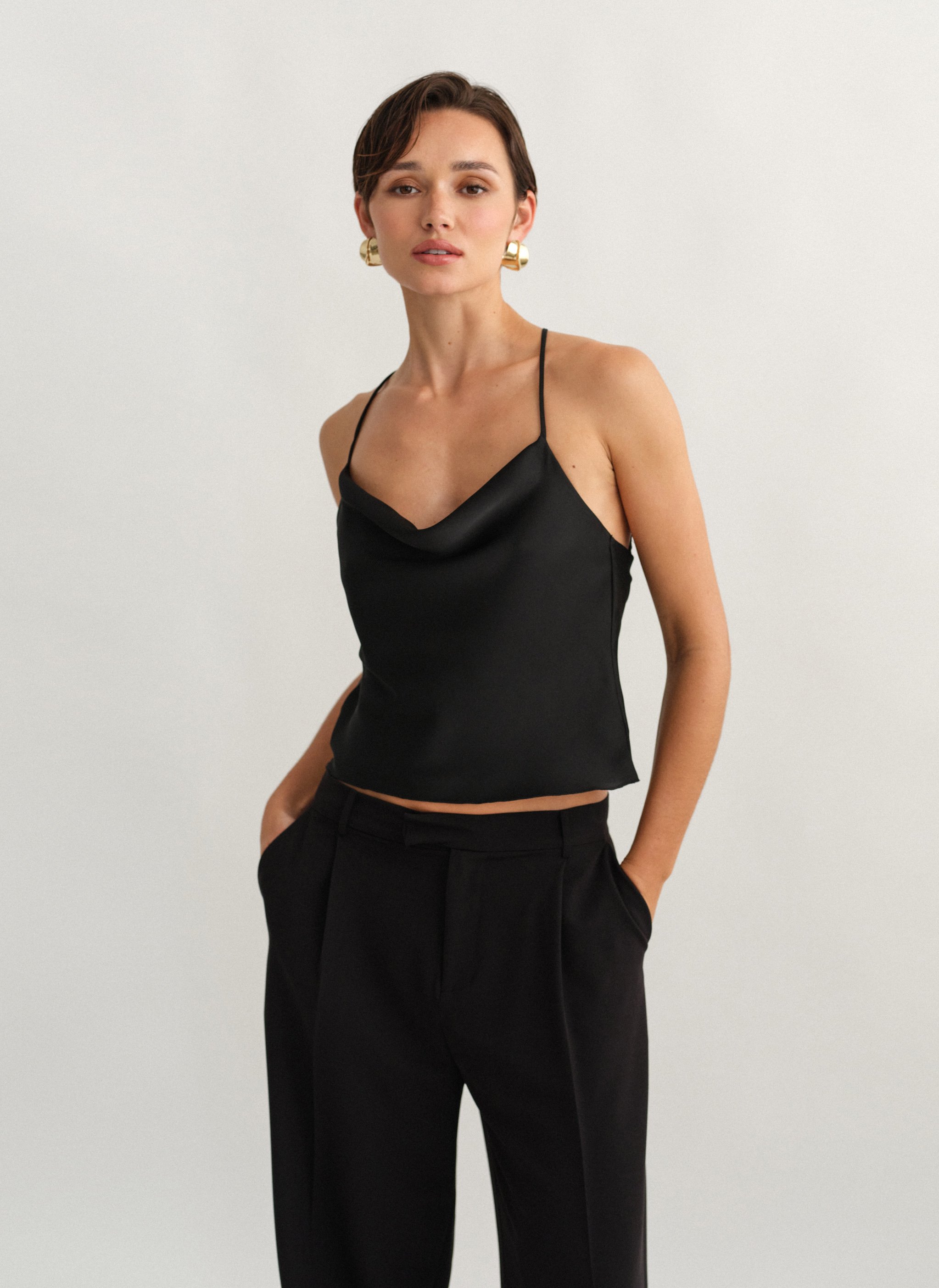 Σατέν τοπ ντραπέ με χιαστί πλάτη.